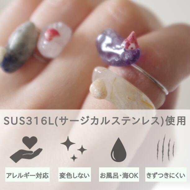 水濡れOKのサージカルステンレス(SUS316)使用です。K14、ニッケルフリーなど金属アレルギー対応金属をお探しの方にもおすすめします。ただし全ての方にアレルギー対応を保証するものではありません。