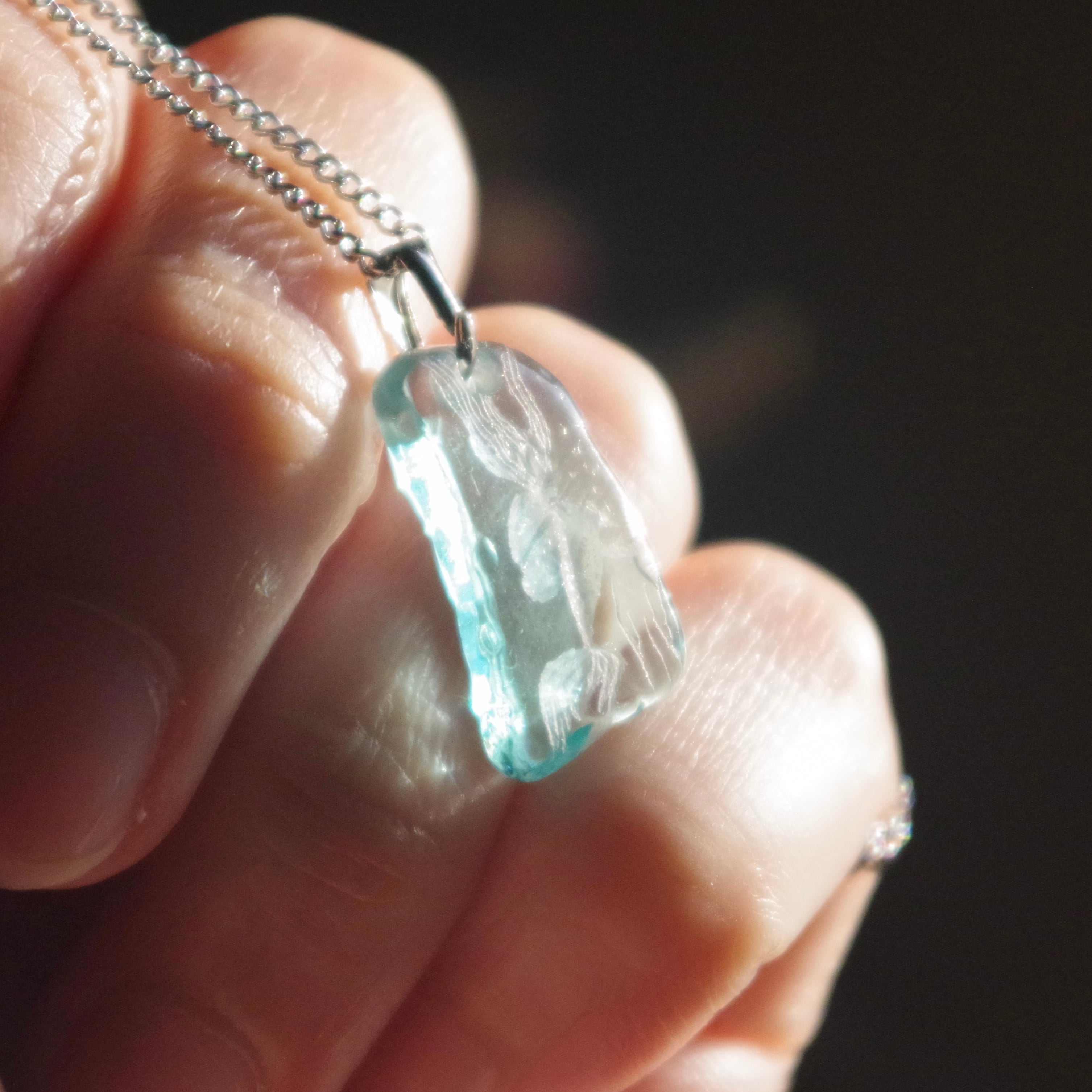 すべて作家一人でシーグラスに彫刻を施しています。海底に沈む人魚を彫りました。写真の箱に入れてお届けします。