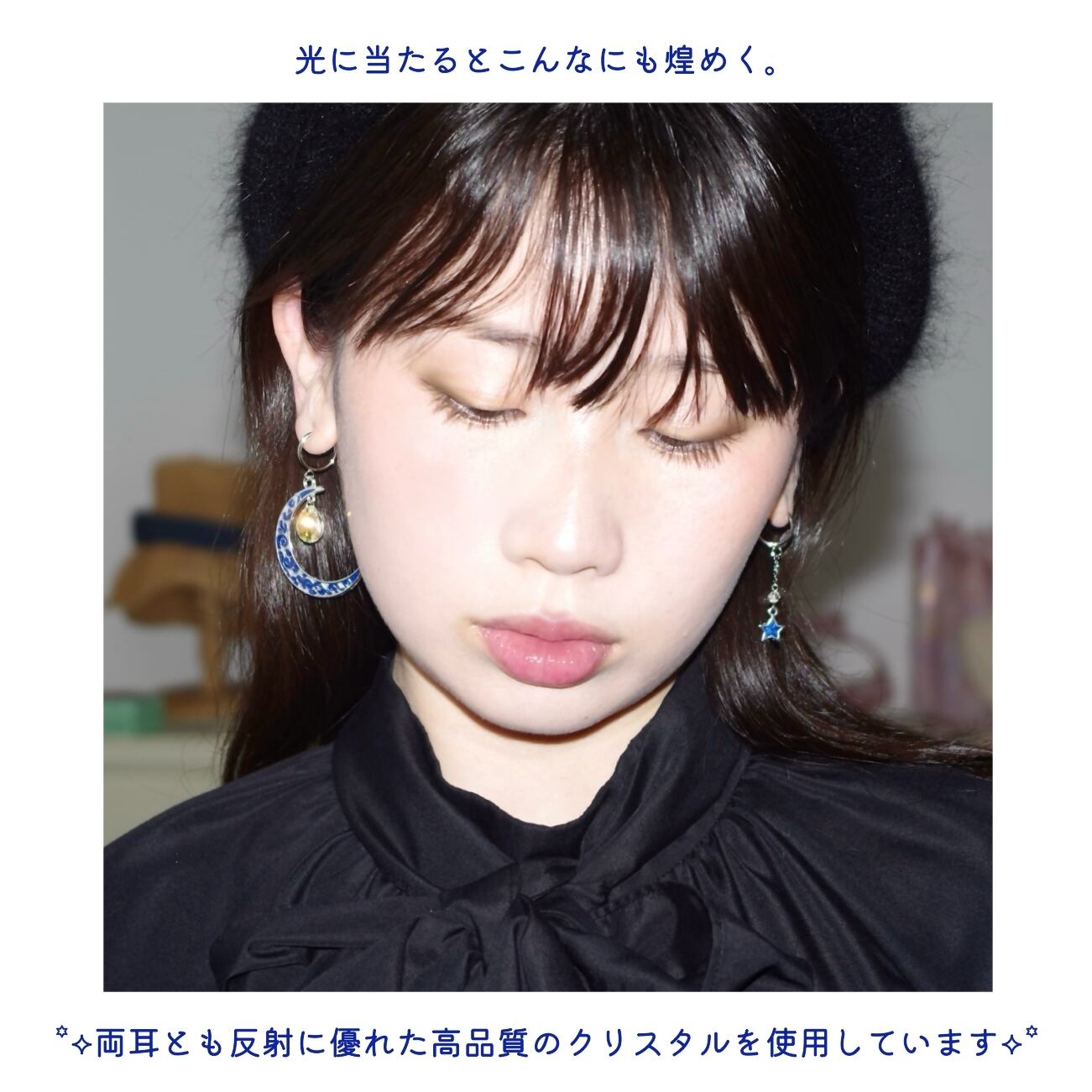 大きな月はゆったりと、クリスタルドロップはキラキラしながらぷるぷると揺れます。クリスタルは見る角度によってカラーが変化するのも魅力です。