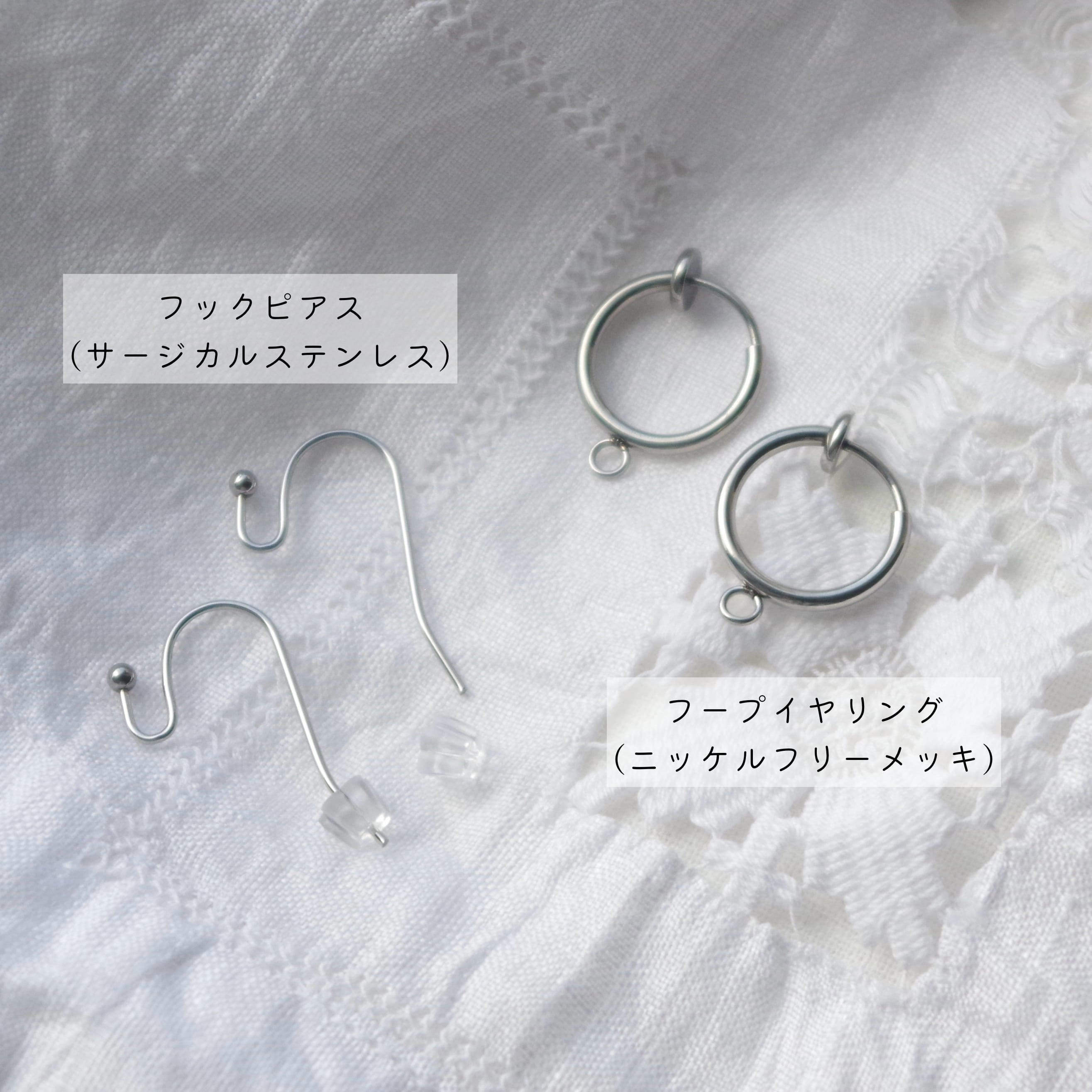 直接耳に触れる金具はニッケルフリーのメッキ素材(イヤリング)orサージカルステンレス(ピアス)です。K14など金属アレルギー対応金属をお探しの方にもおすすめしますが、全ての方にアレルギー対応を保証するものではありません。