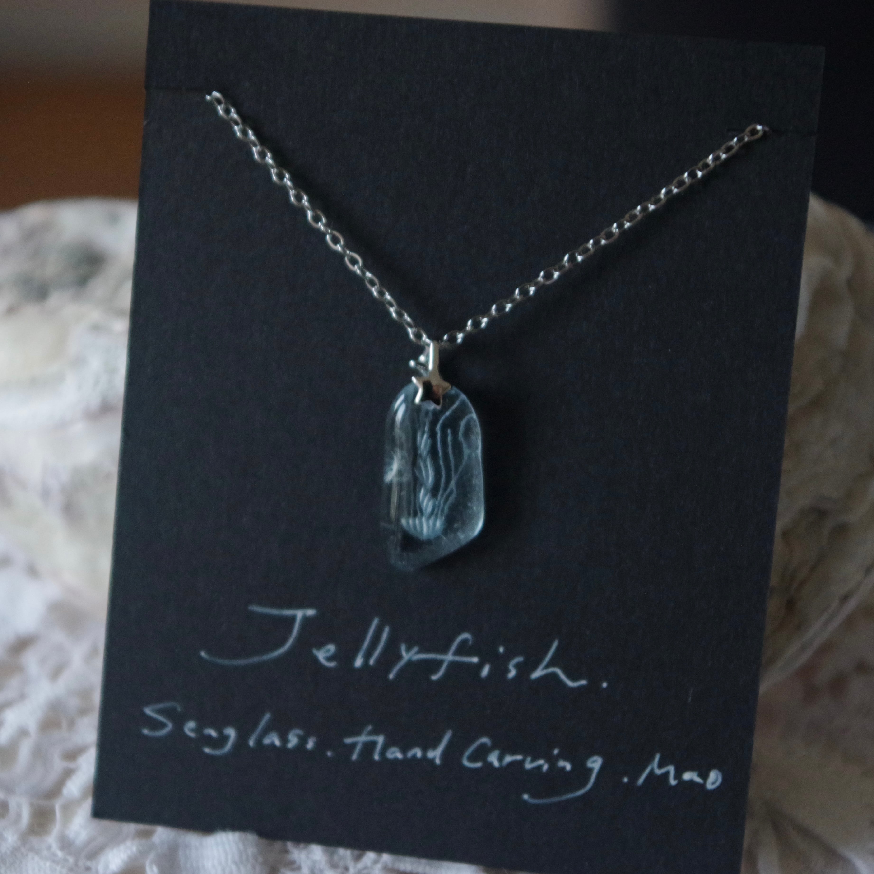 すべて作家一人でシーグラスに彫刻を施しています。細部まで美しいクラゲを彫りました。写真の箱に入れてお届けします。