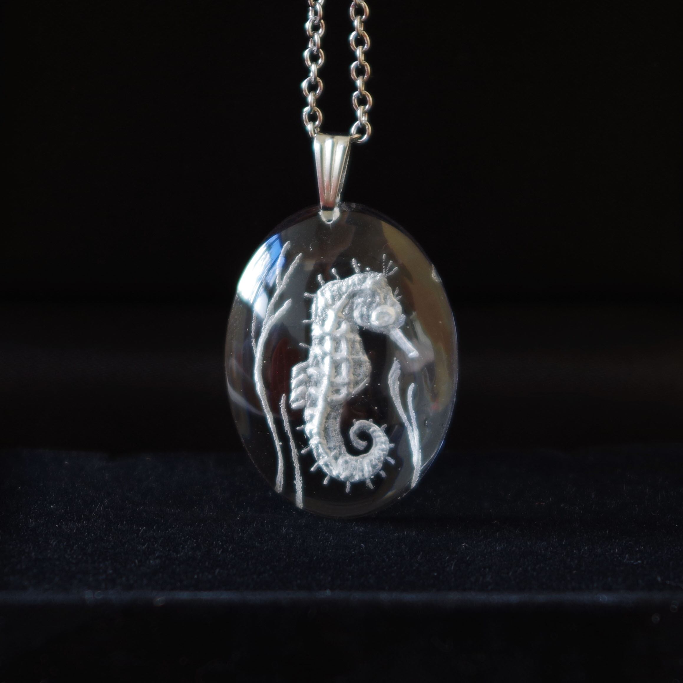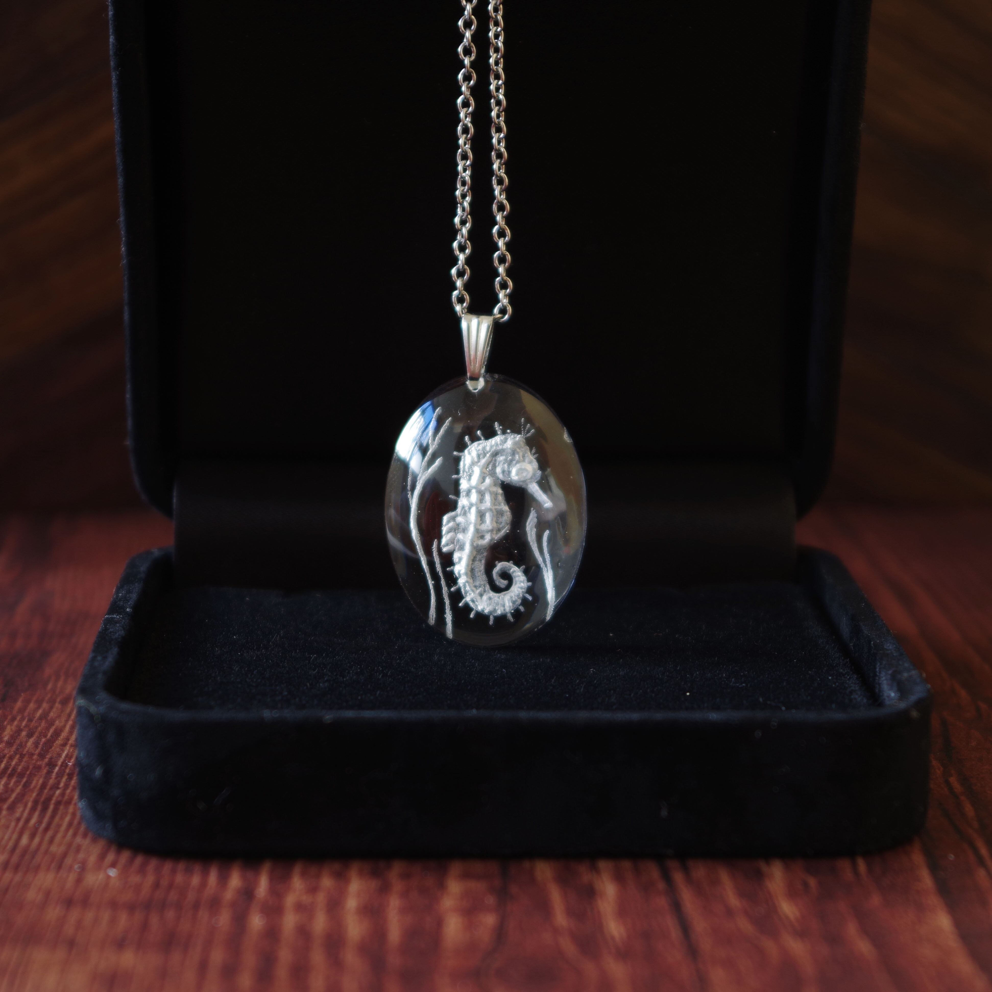 タツノオトシゴ 海 生き物 生物 動物 ネックレス 透明 透明感 ペンダント 白 カメオ インタリオ シルバー ステンレス 手彫り 彫刻 沈み彫り ヴィンテージ アンティーク