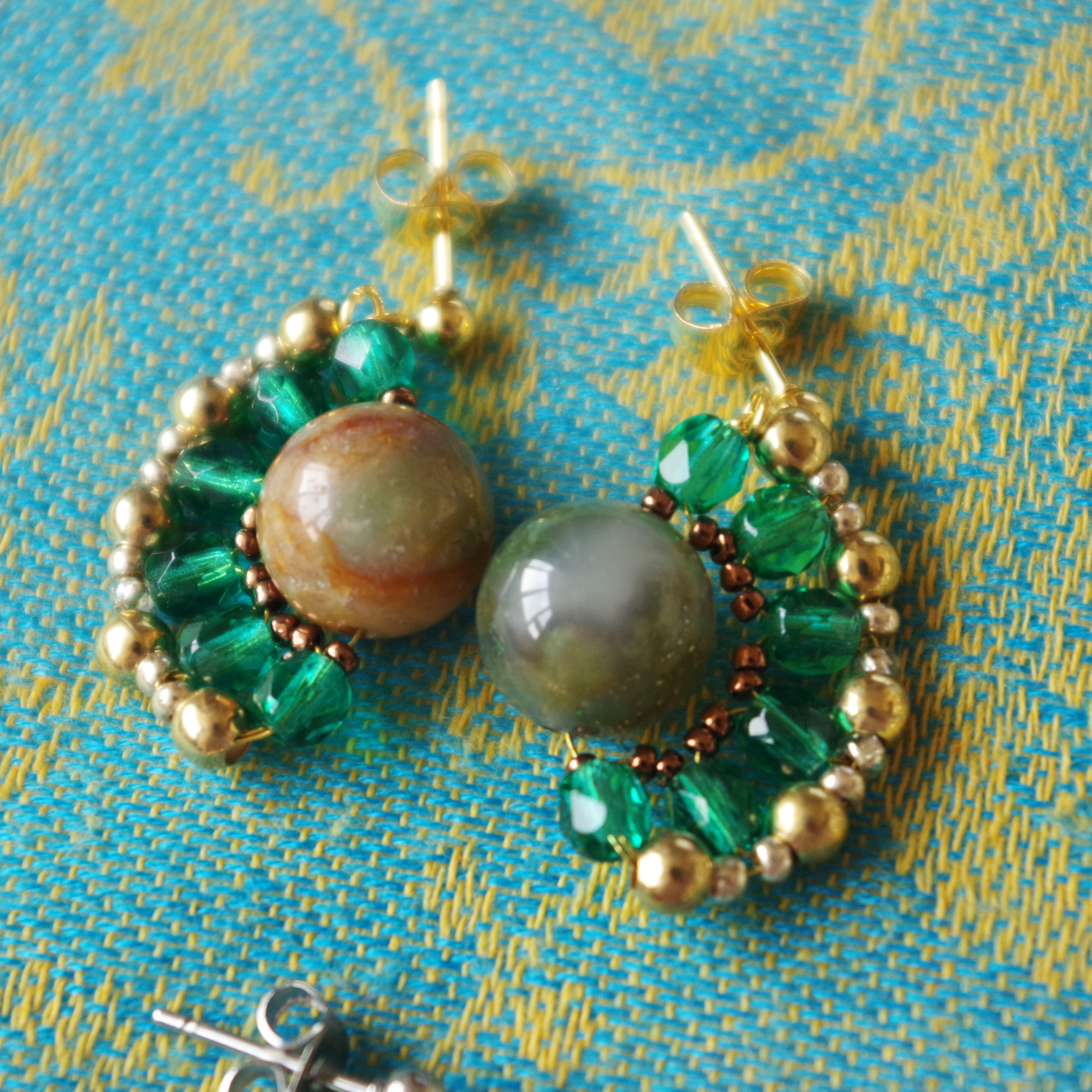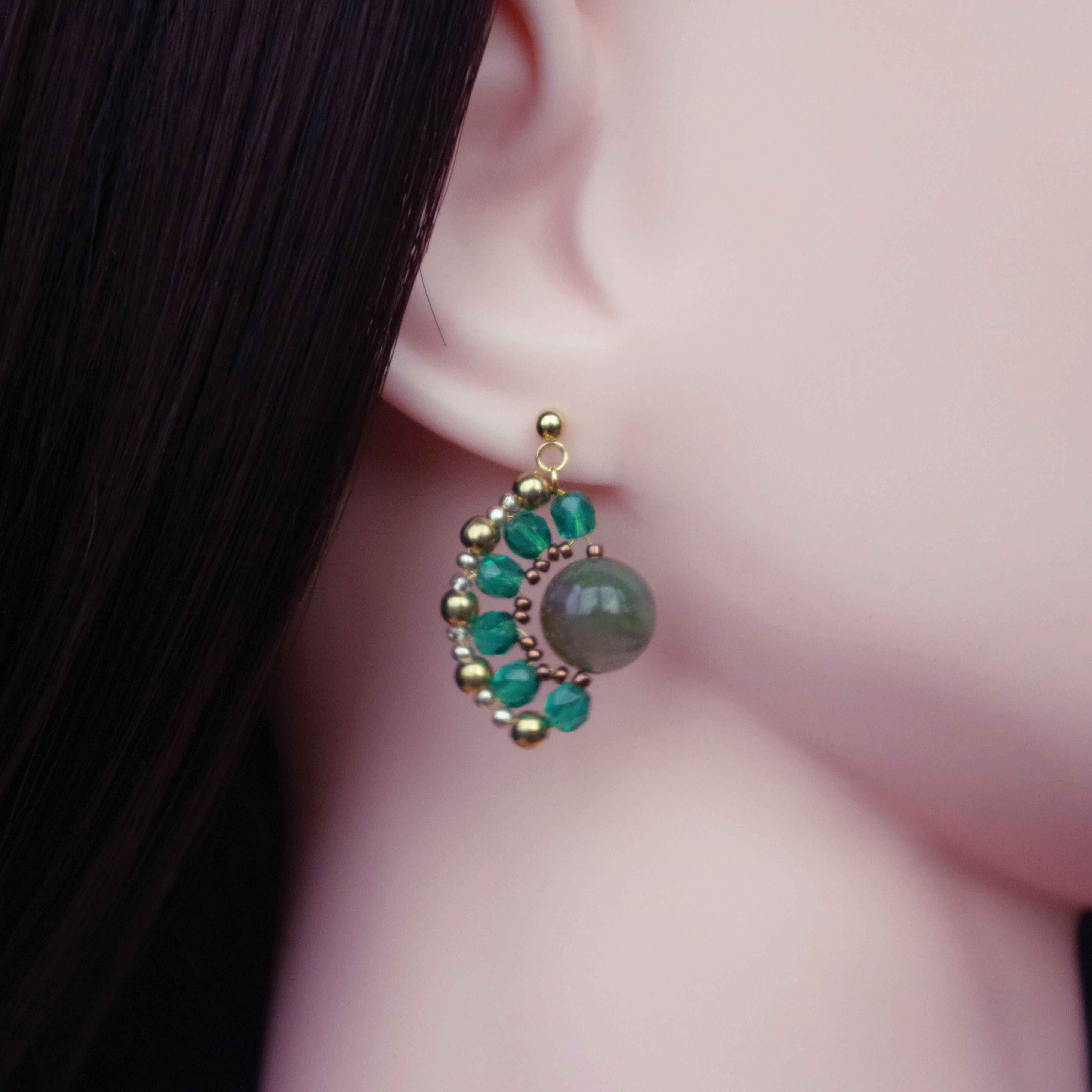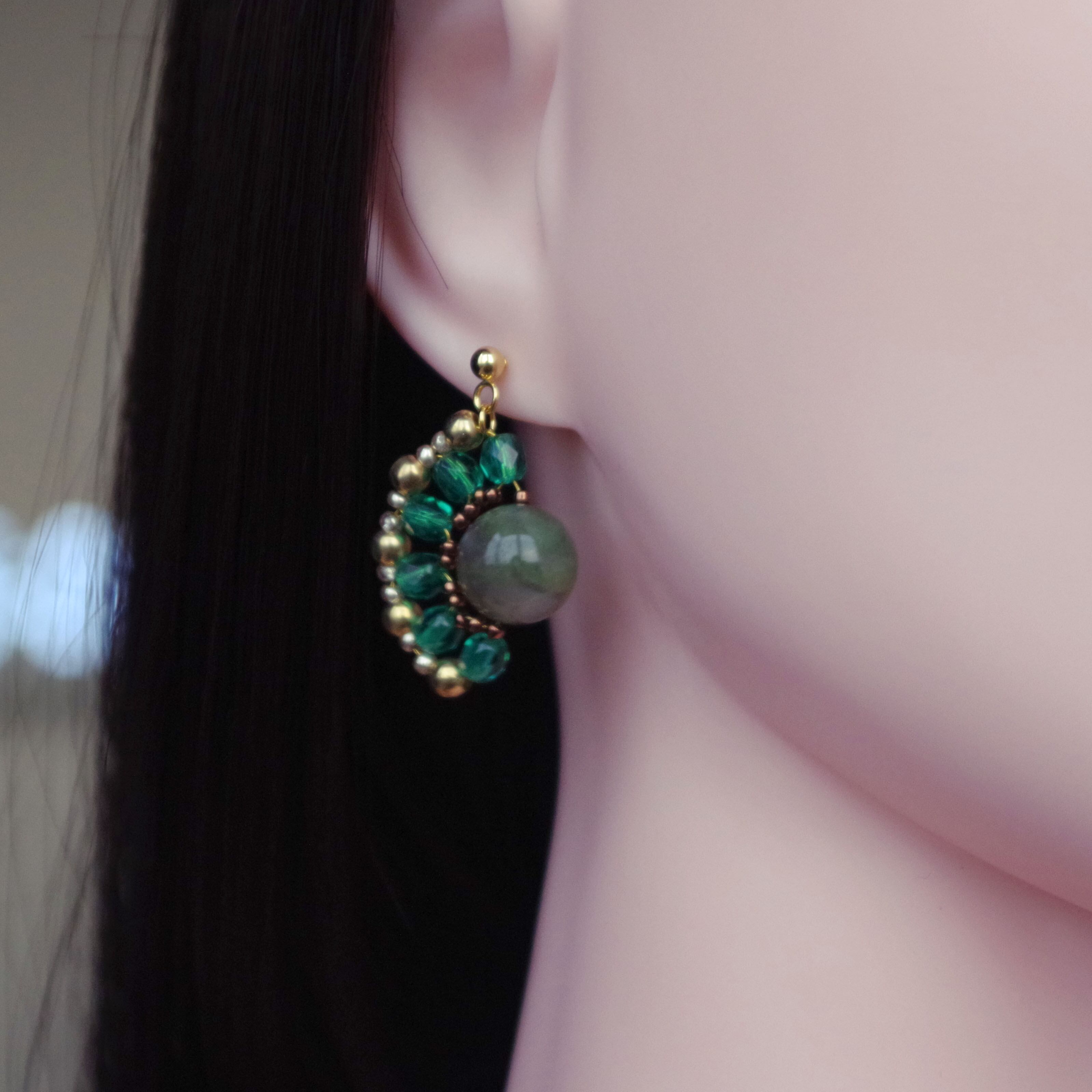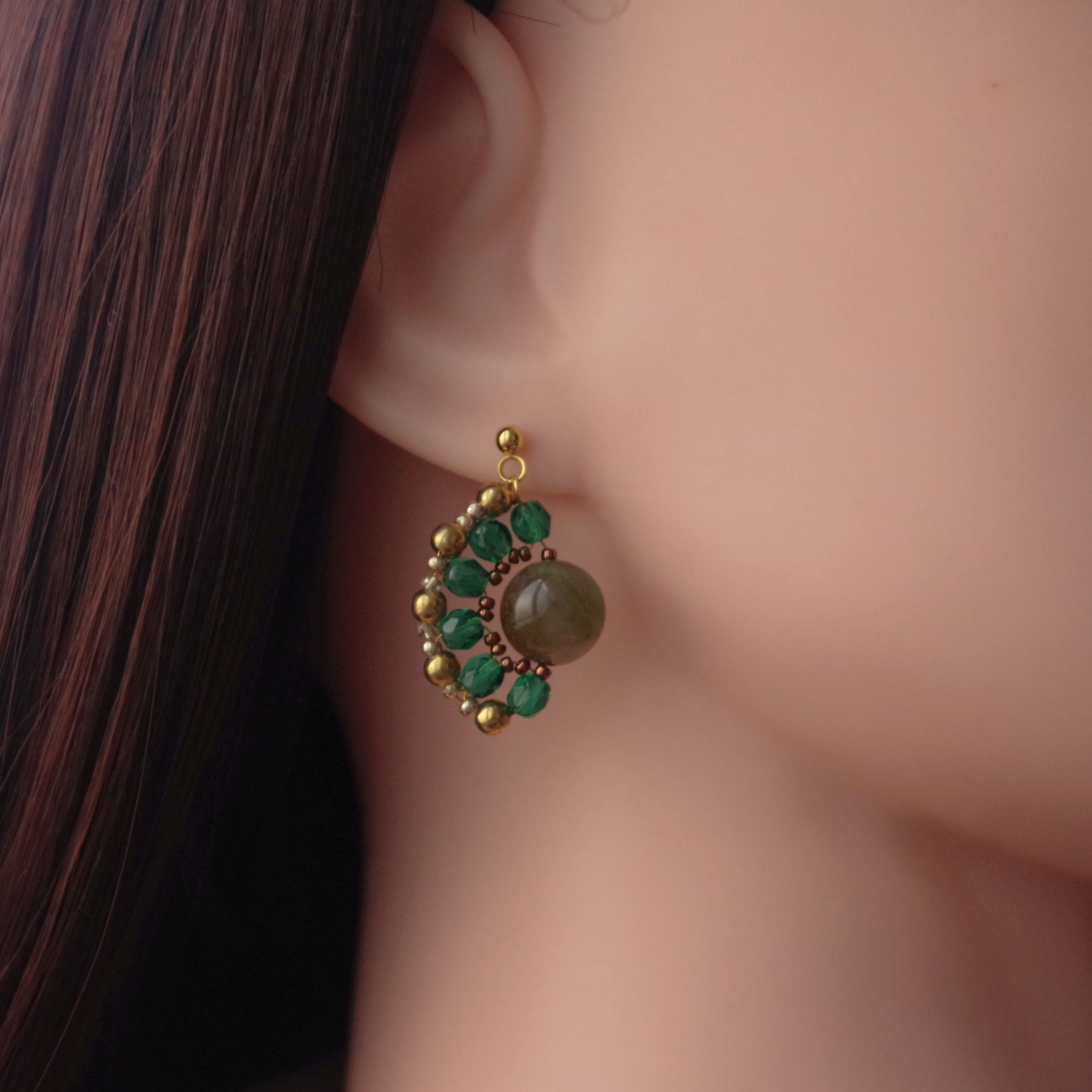 ※この作品は耳に直接触れない部分(金色のビーズ)が真鍮製ですので金属アレルギーの方はご注意ください。