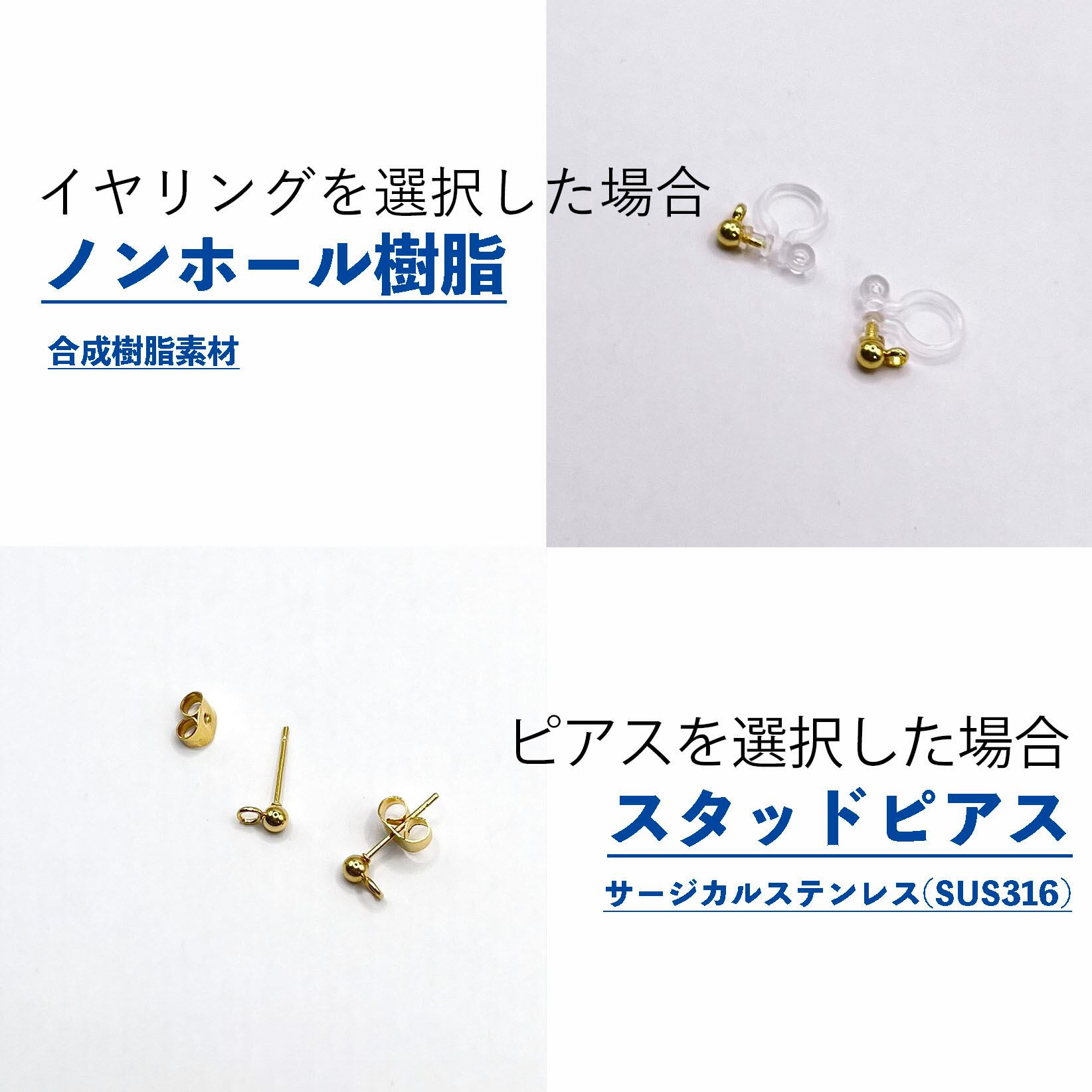 こちらでイヤリングを選んだ場合、ノンホール樹脂ピアスでお届けします。樹脂でできているので金属アレルギーの方にも安心です。