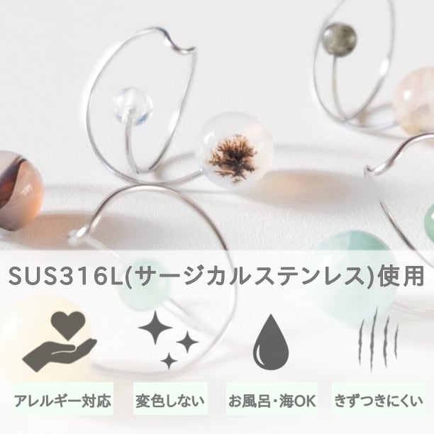 ワイヤーは医療用メスの材料であるサージカルステンレス(SUS316L)を使用しています。汗・皮脂・水分に大変強いので海・お風呂OKです。