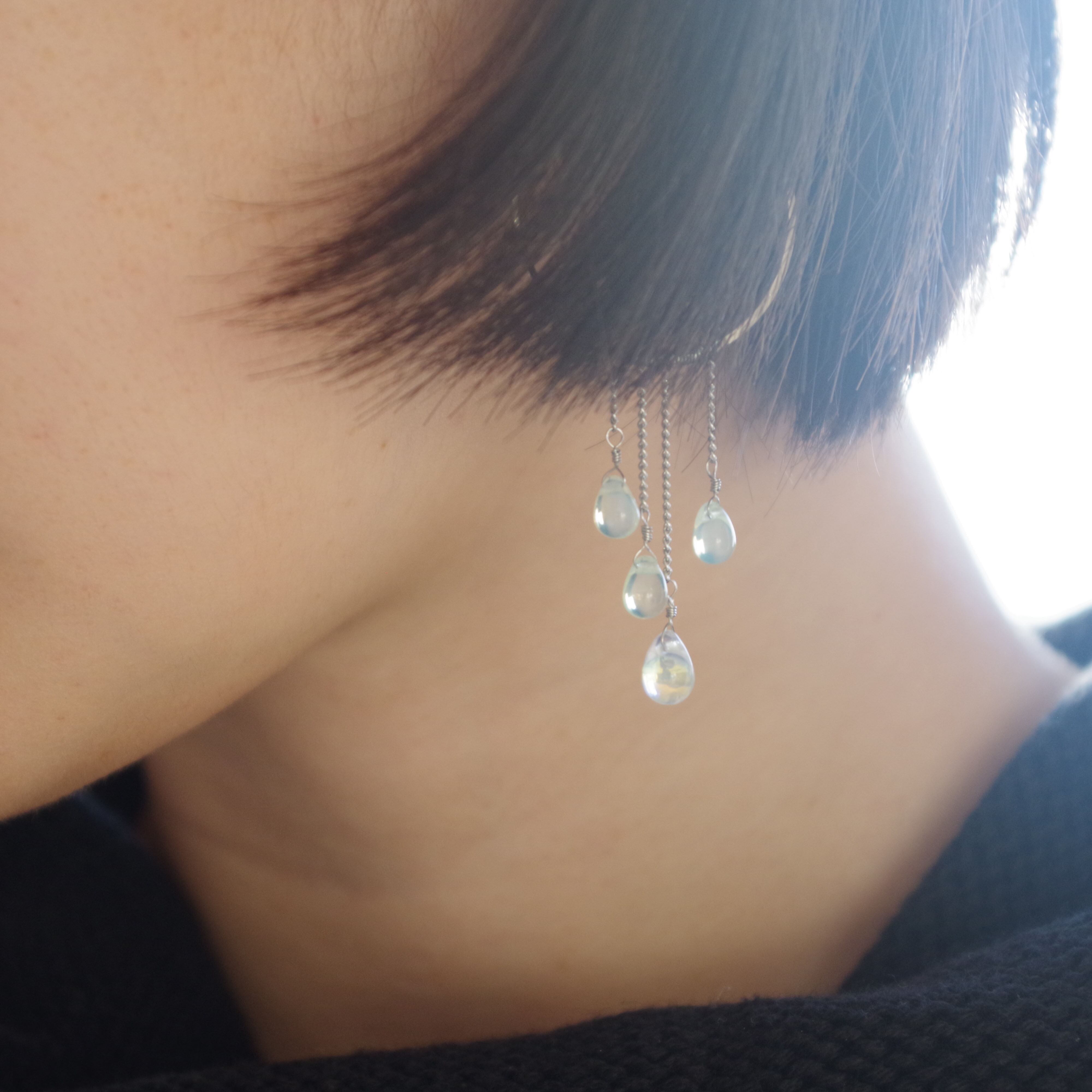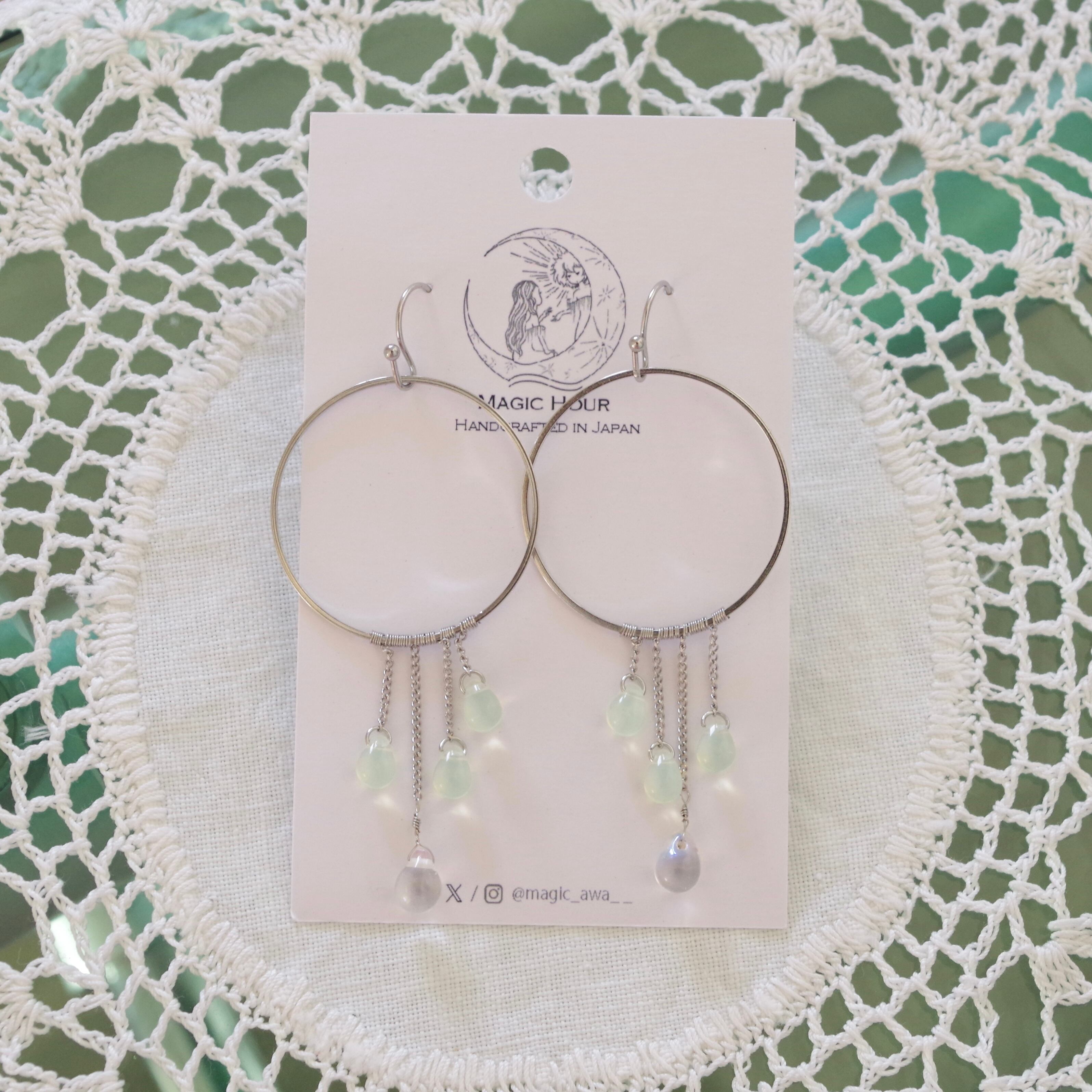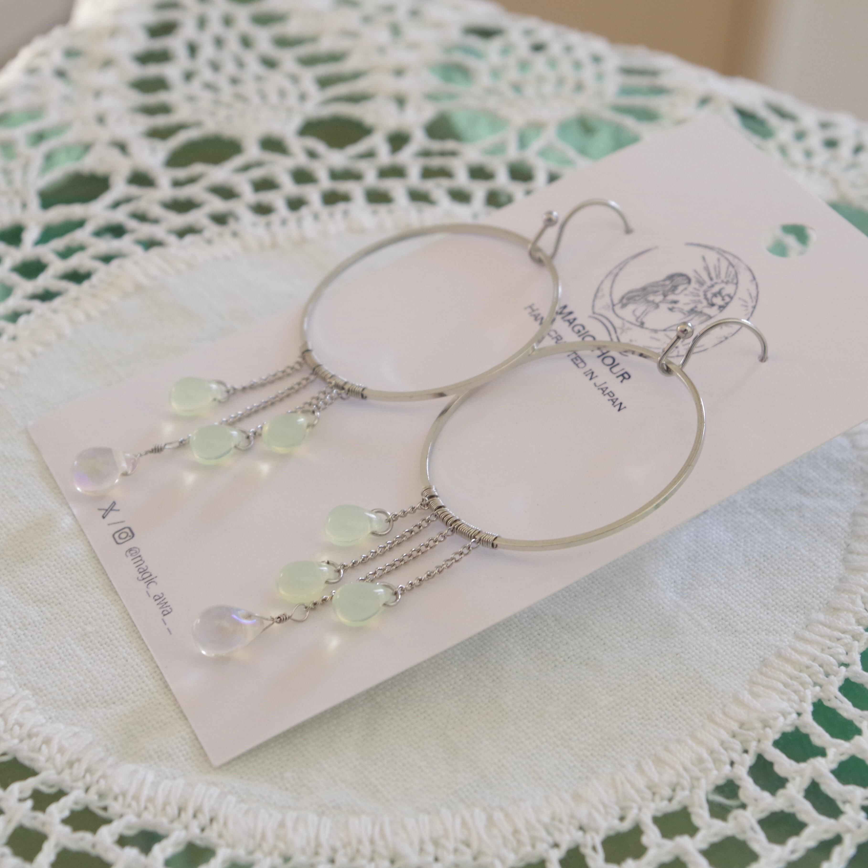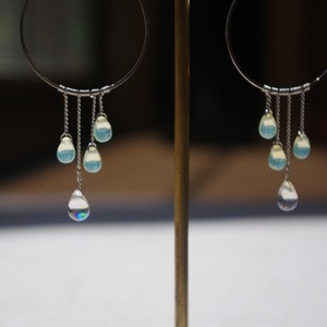 1mm幅の極細チェーンにドロップを垂らし、透明感と華奢なフォルムが愛らしいです。柔らかい光線が交差し合うようにチェコドロップビーズがシャラシャラと揺れます。