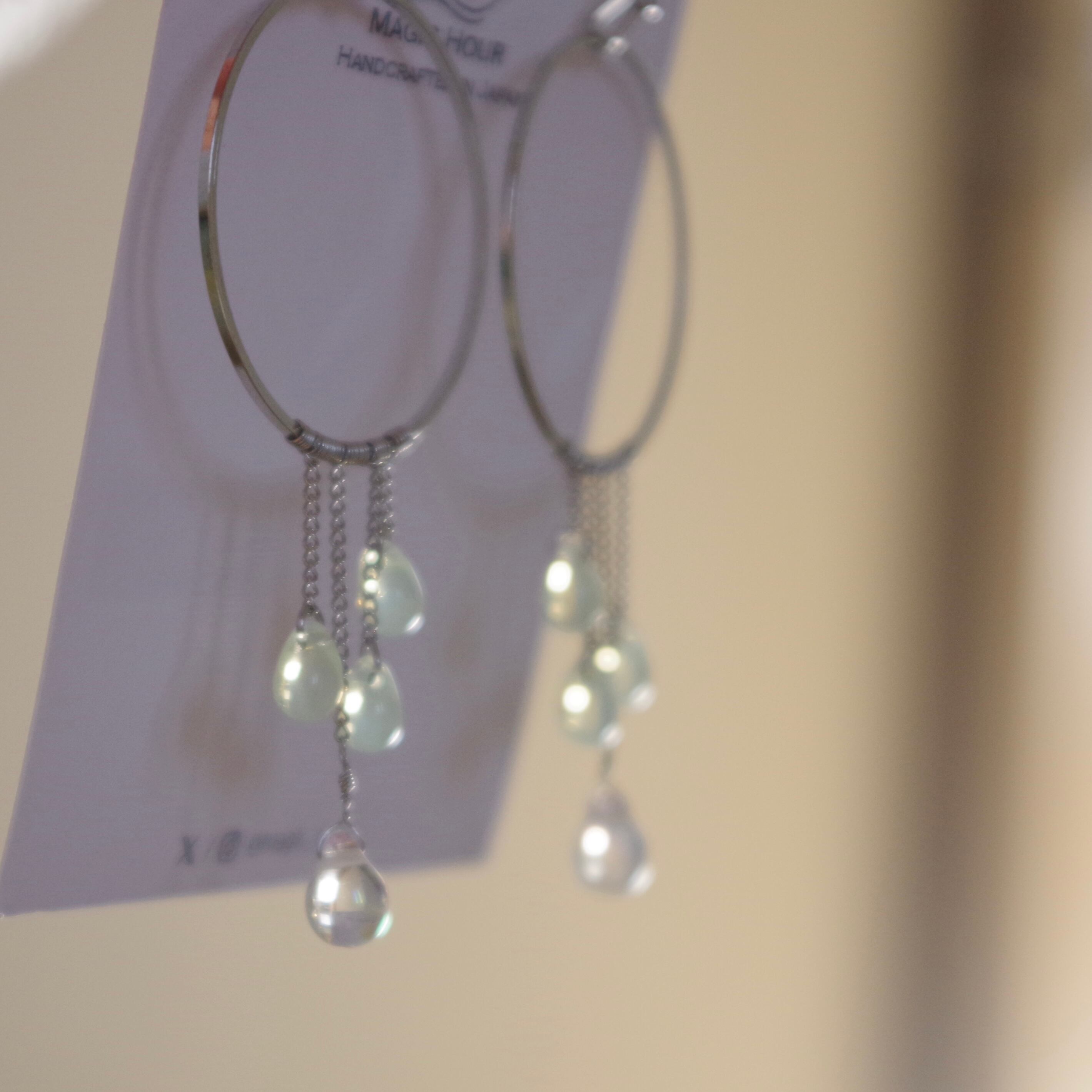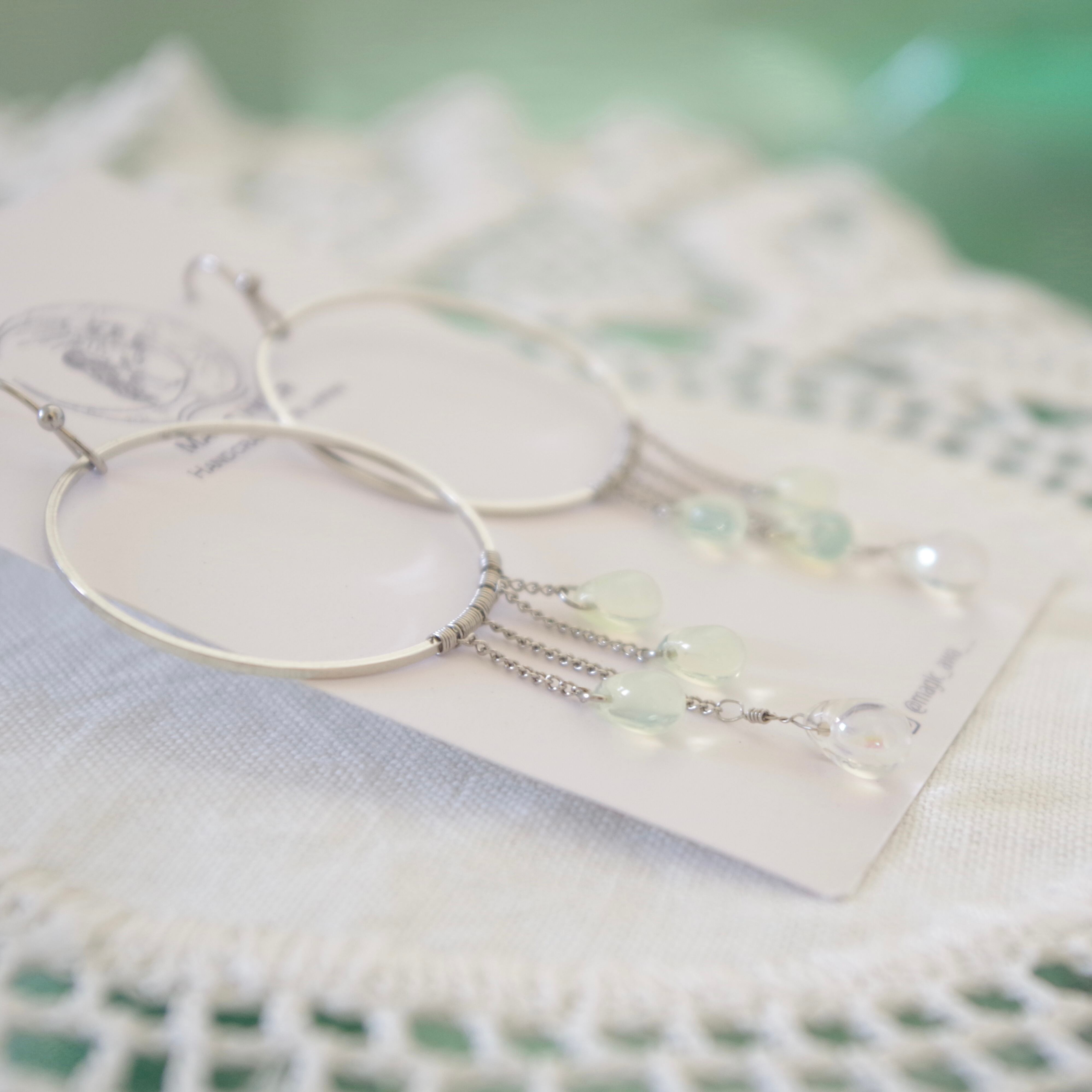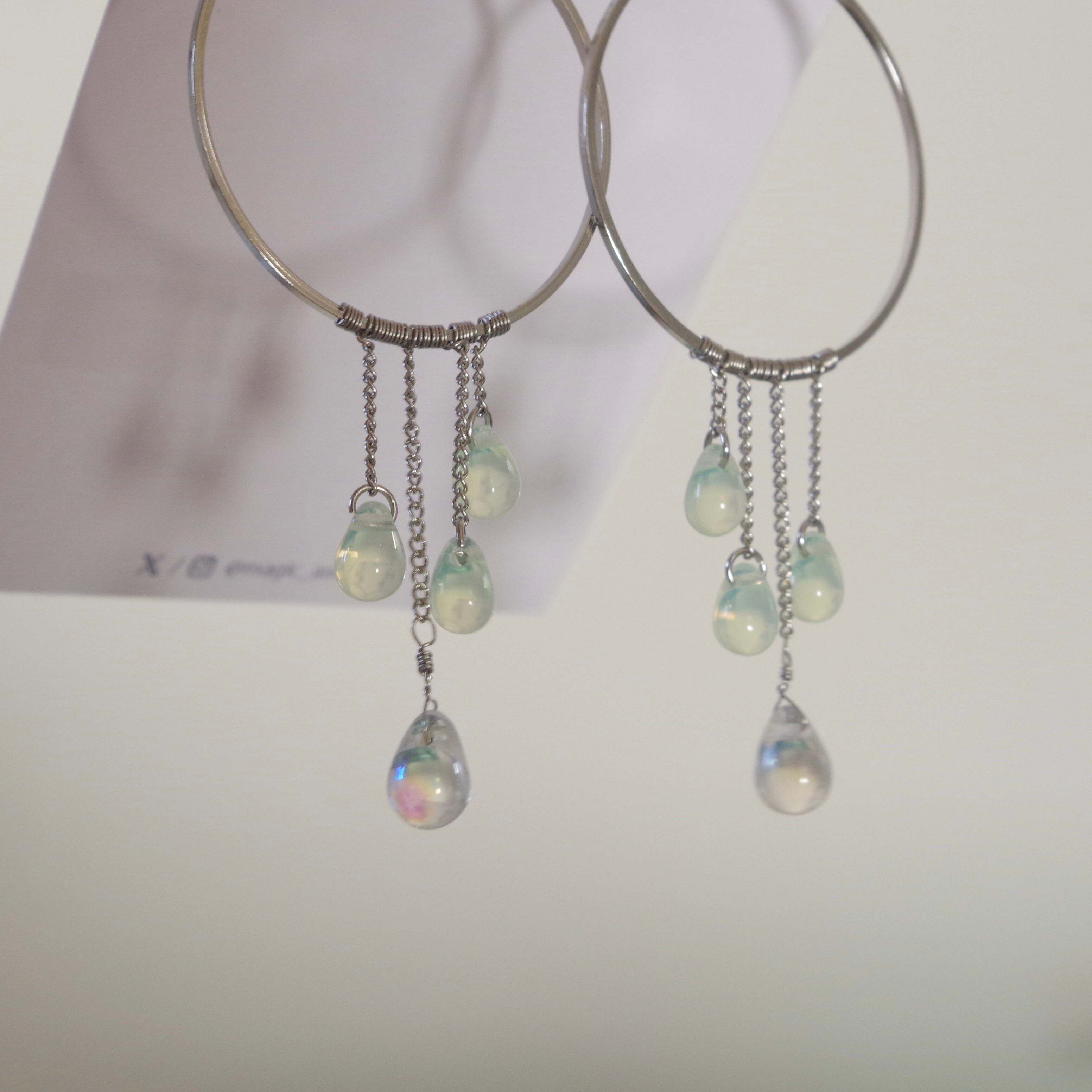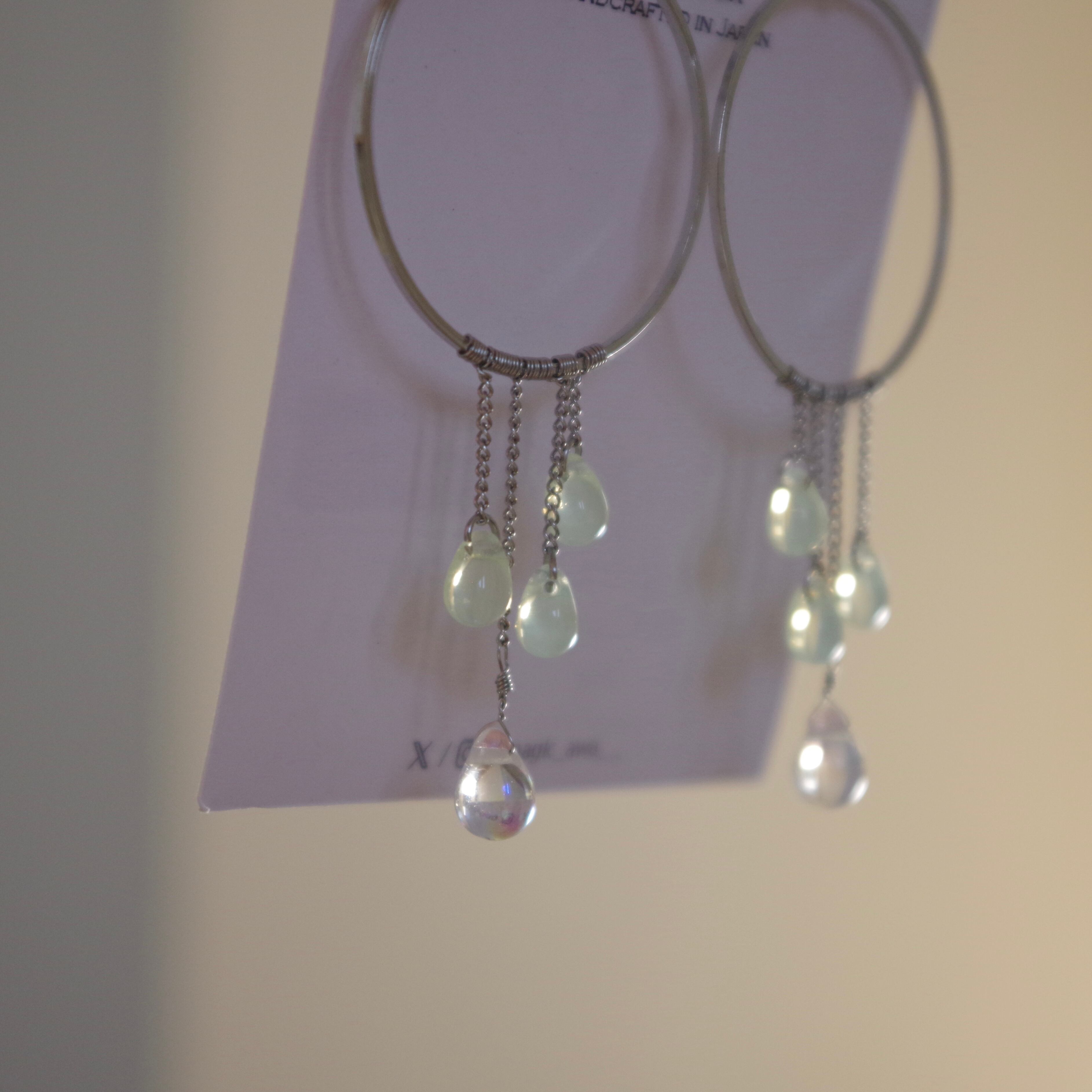 1mm幅の極細チェーンにドロップを垂らし、透明感と華奢なフォルムが愛らしいです。柔らかい光線が交差し合うようにチェコドロップビーズがシャラシャラと揺れます。