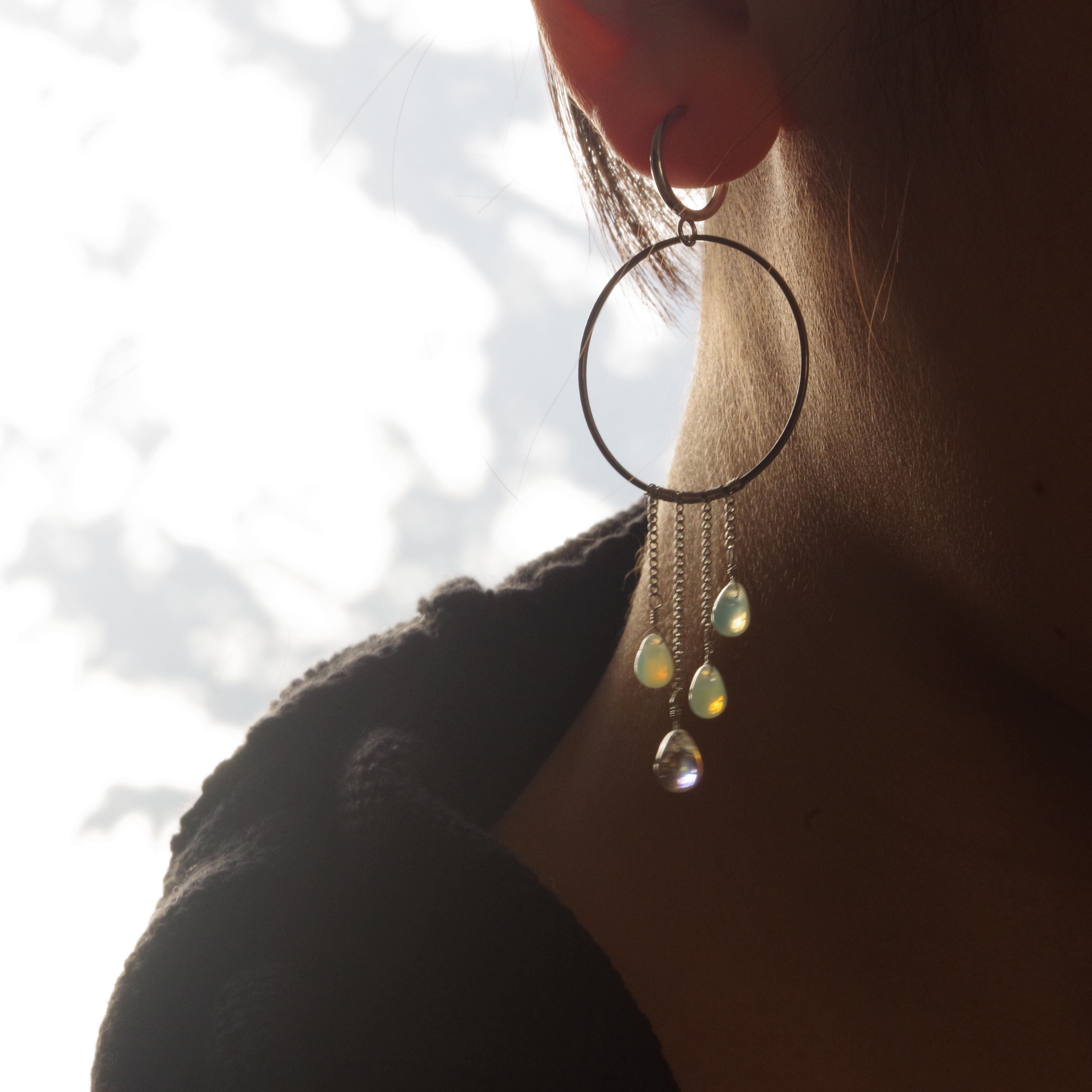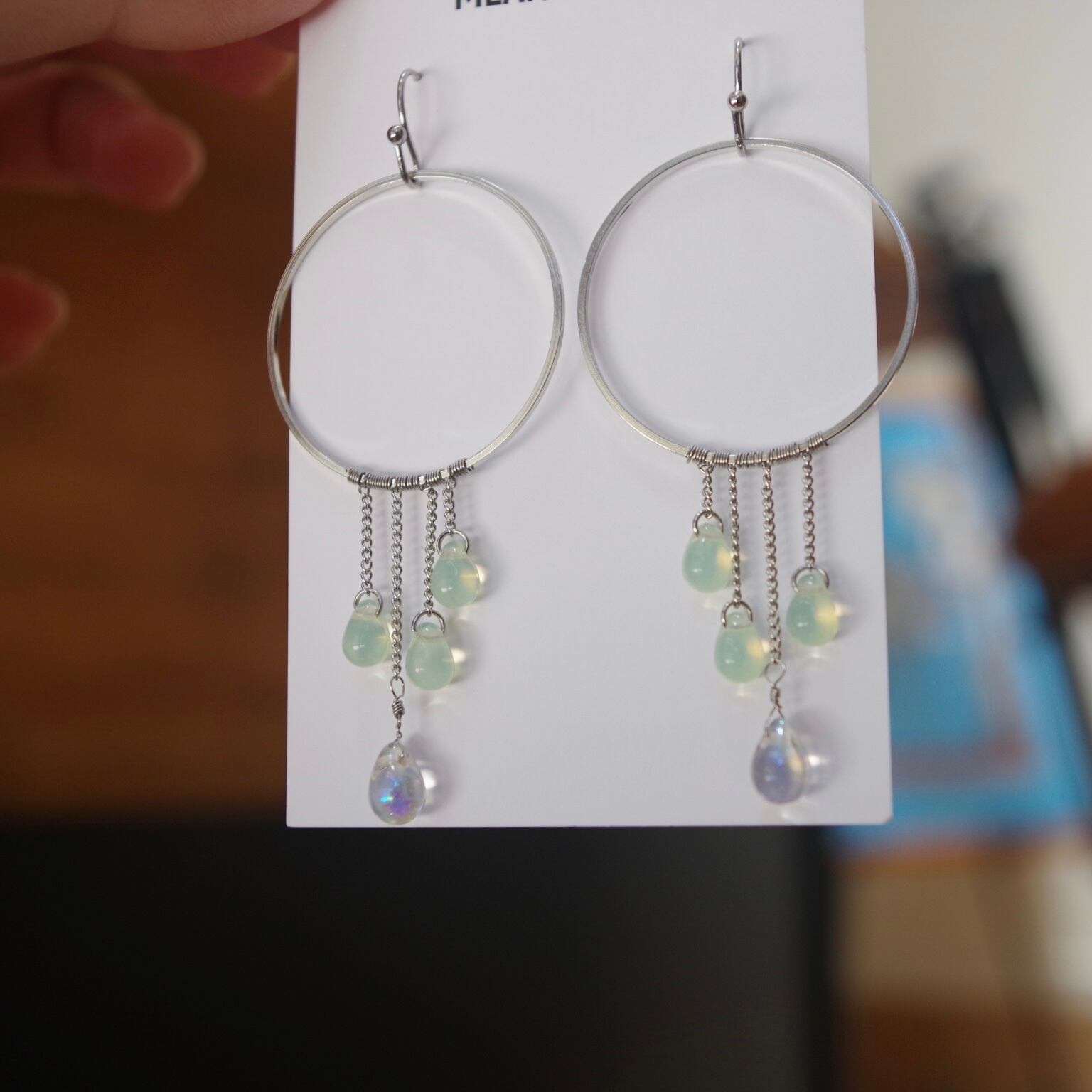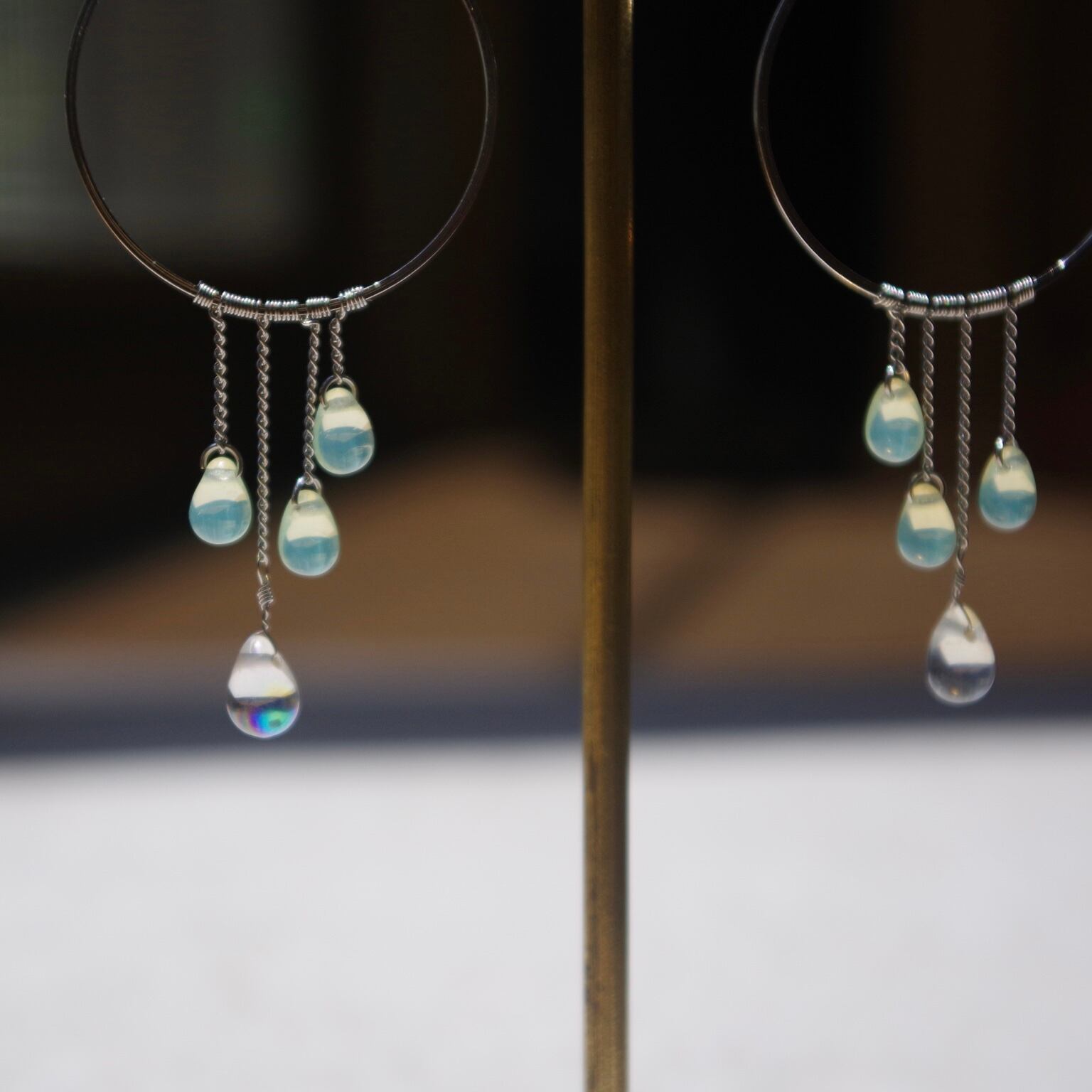 ドロップはオパールを模したチェコガラスビーズで、光の加減によってブルーグリーン〜オレンジに色味が変わります。光の当て方で色味や雰囲気がコロコロ変わる姿は魅力的です。
