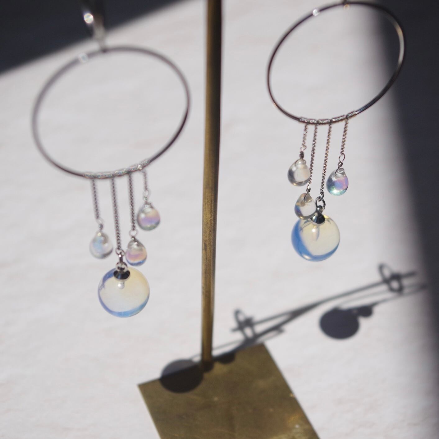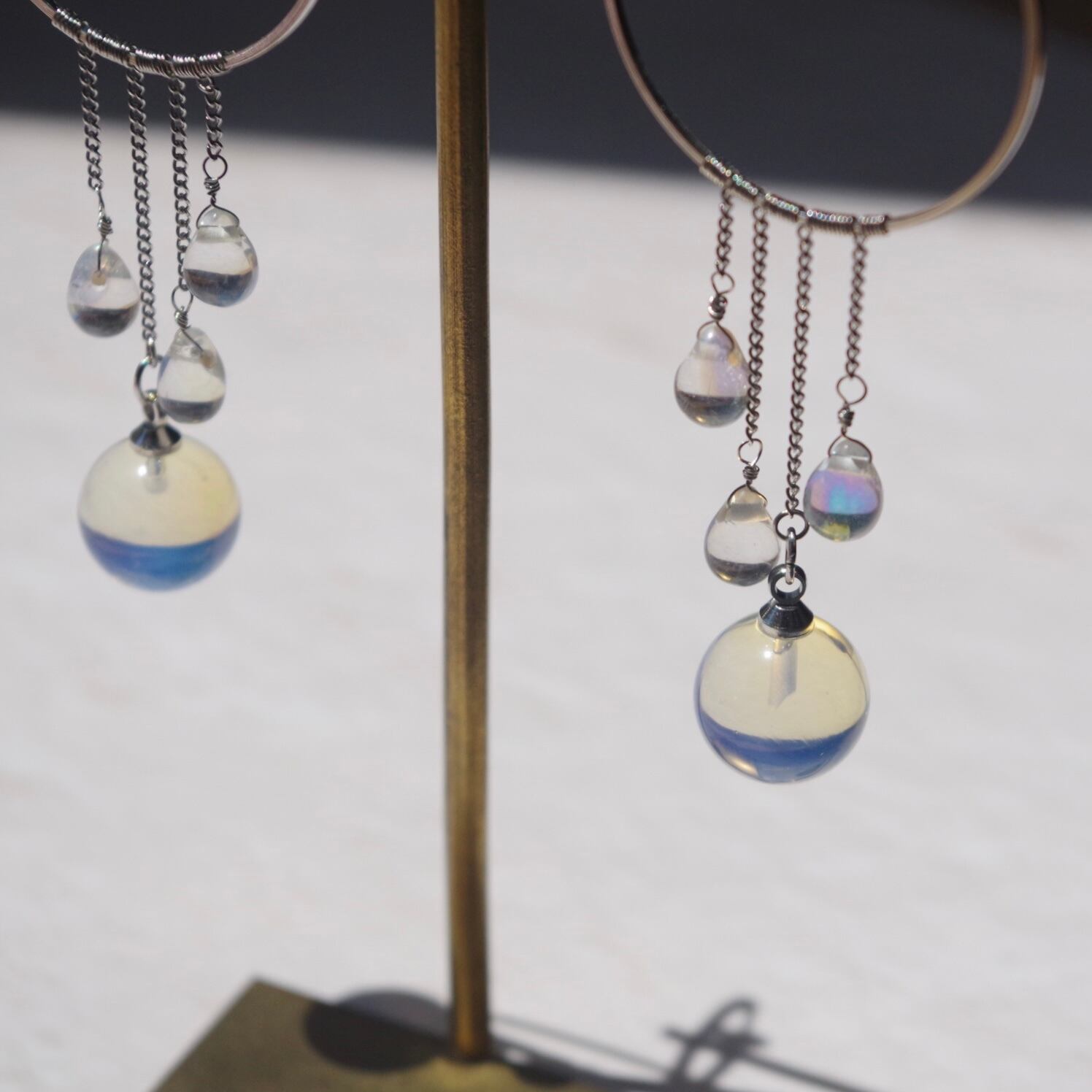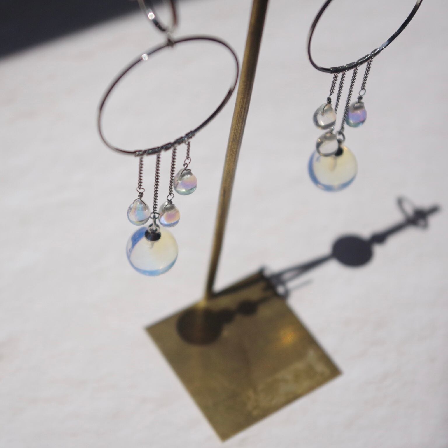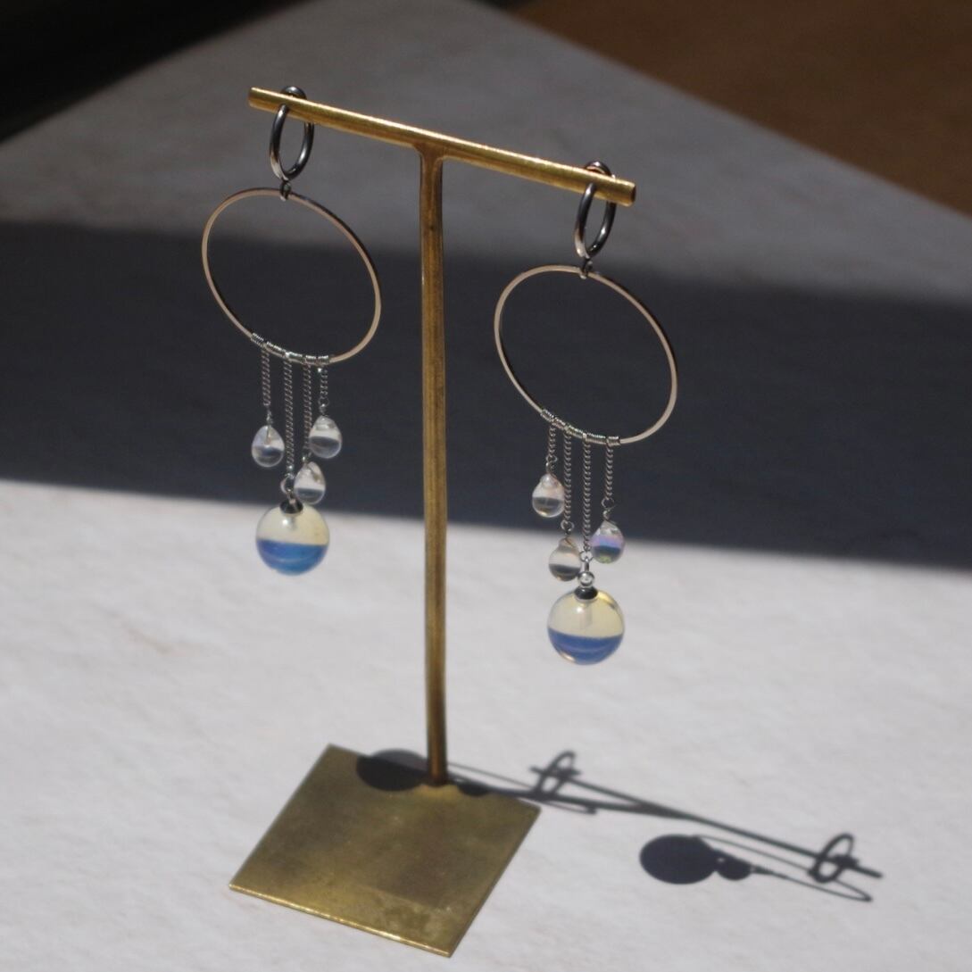 ドロップはオパールを模したチェコガラスビーズで、光の加減によってブルーグリーン〜オレンジに色味が変わります。光の当て方で色味や雰囲気がコロコロ変わる姿は魅力的です。