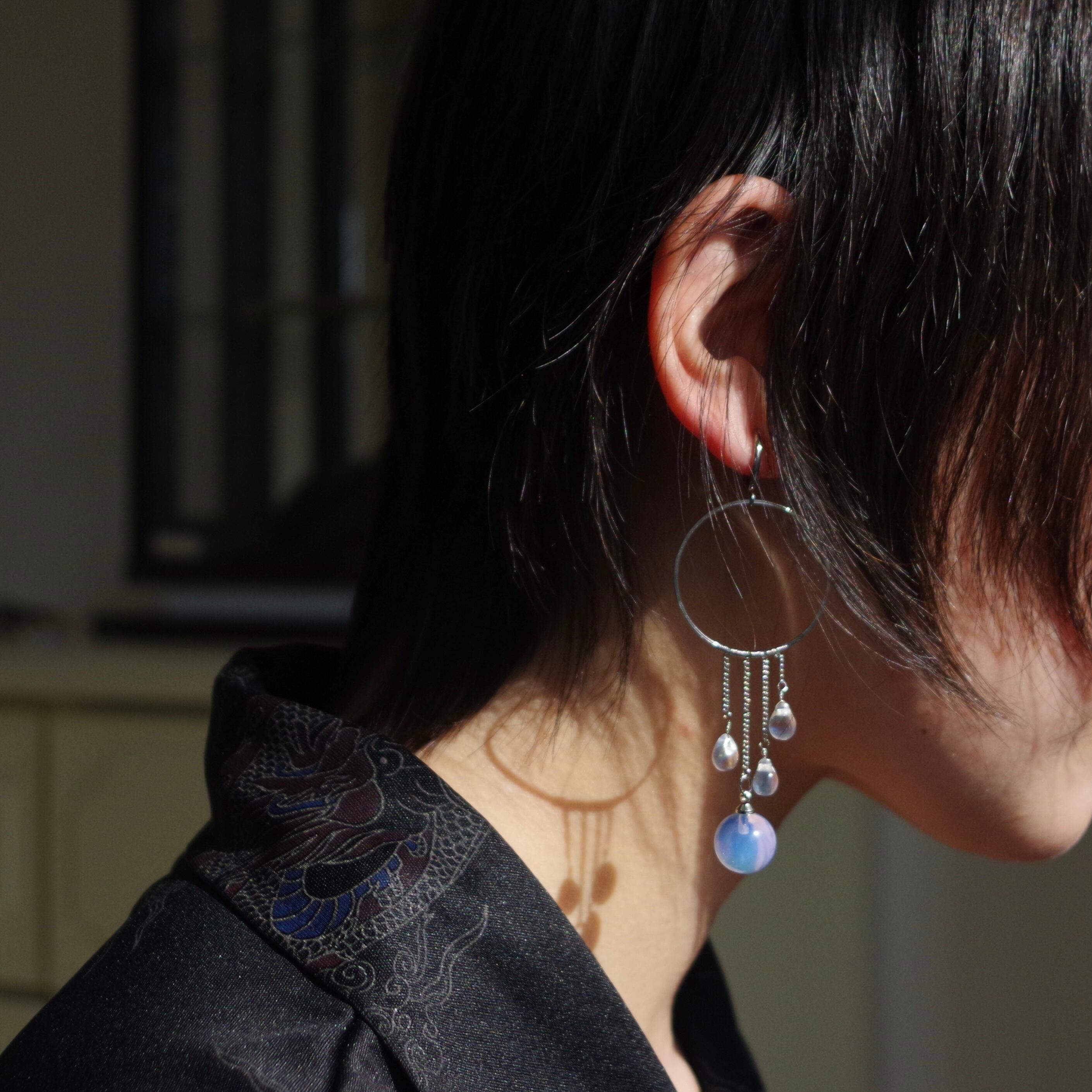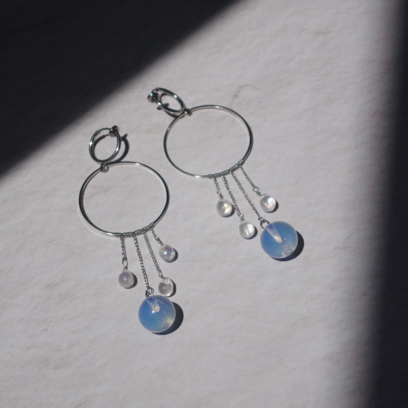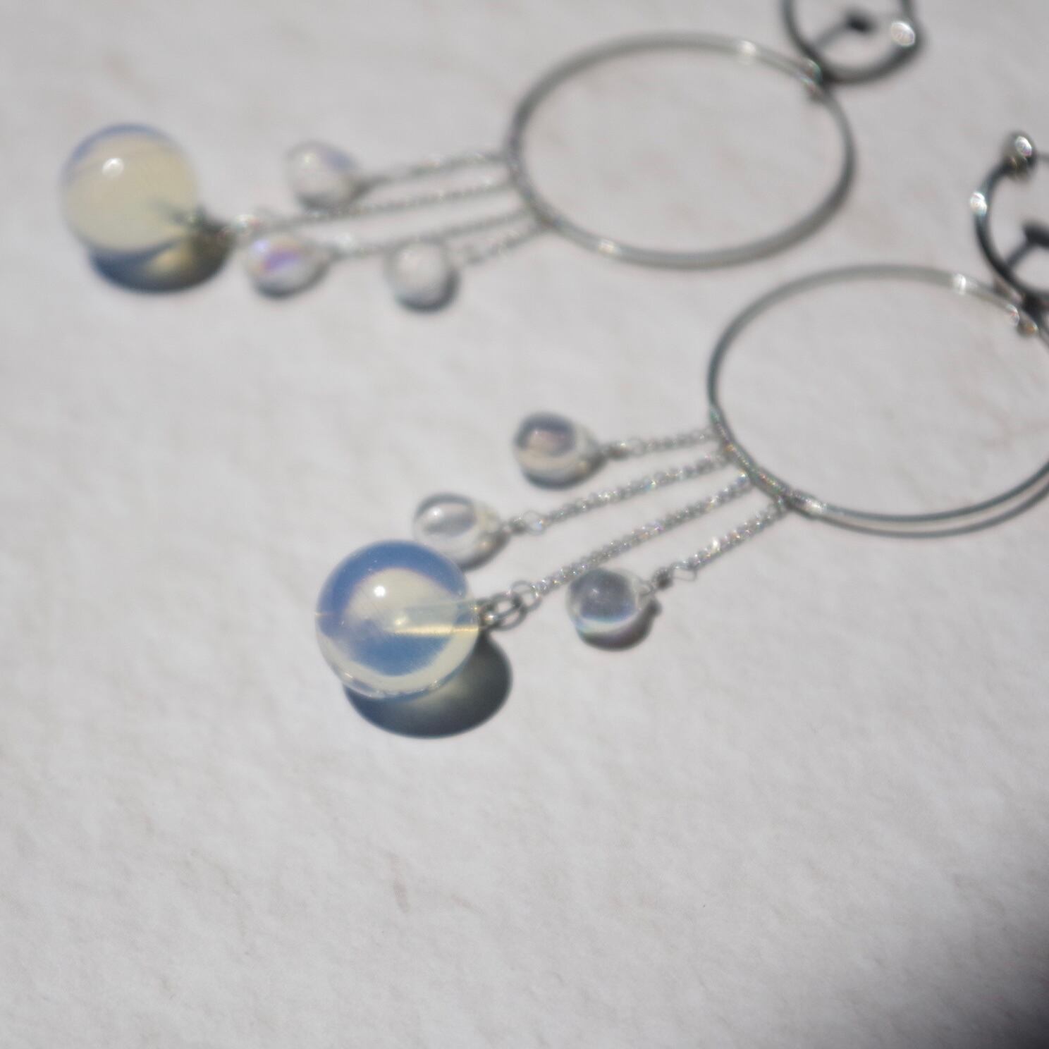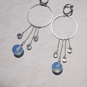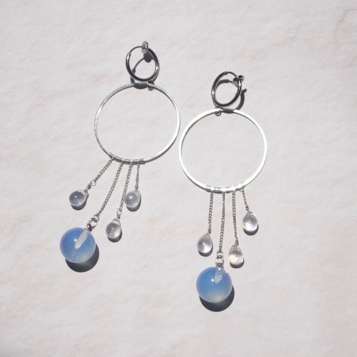 大ぶり ピアス イヤリング ドロップ シルバー 透明感 つやつや 個性派 揺れる チェコビーズ 青 きれいめ 淡い オパール 金属アレルギー 夏 涼感 涼しげ うるうる ツヤ