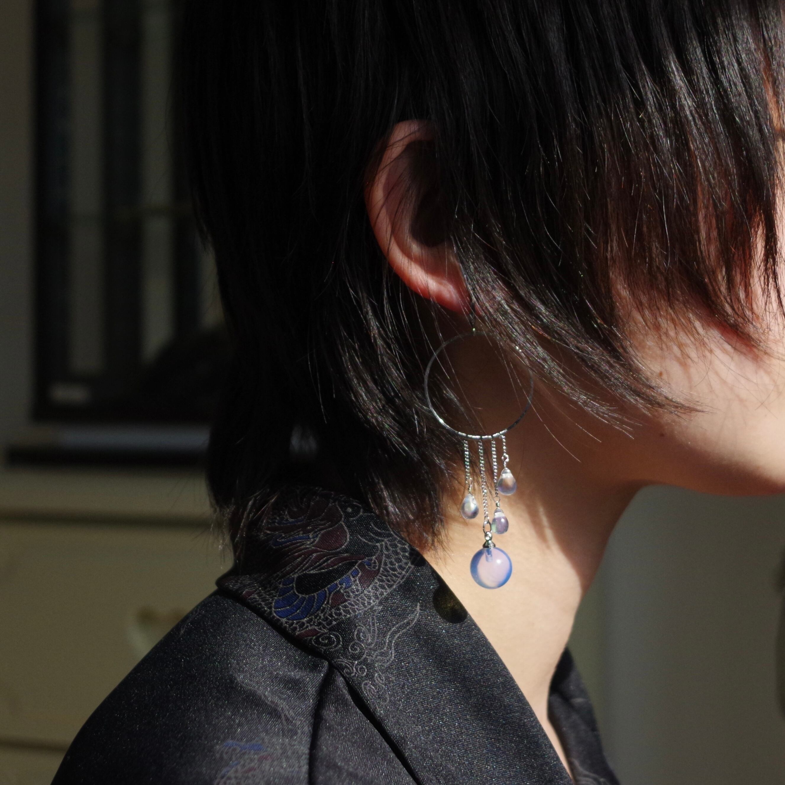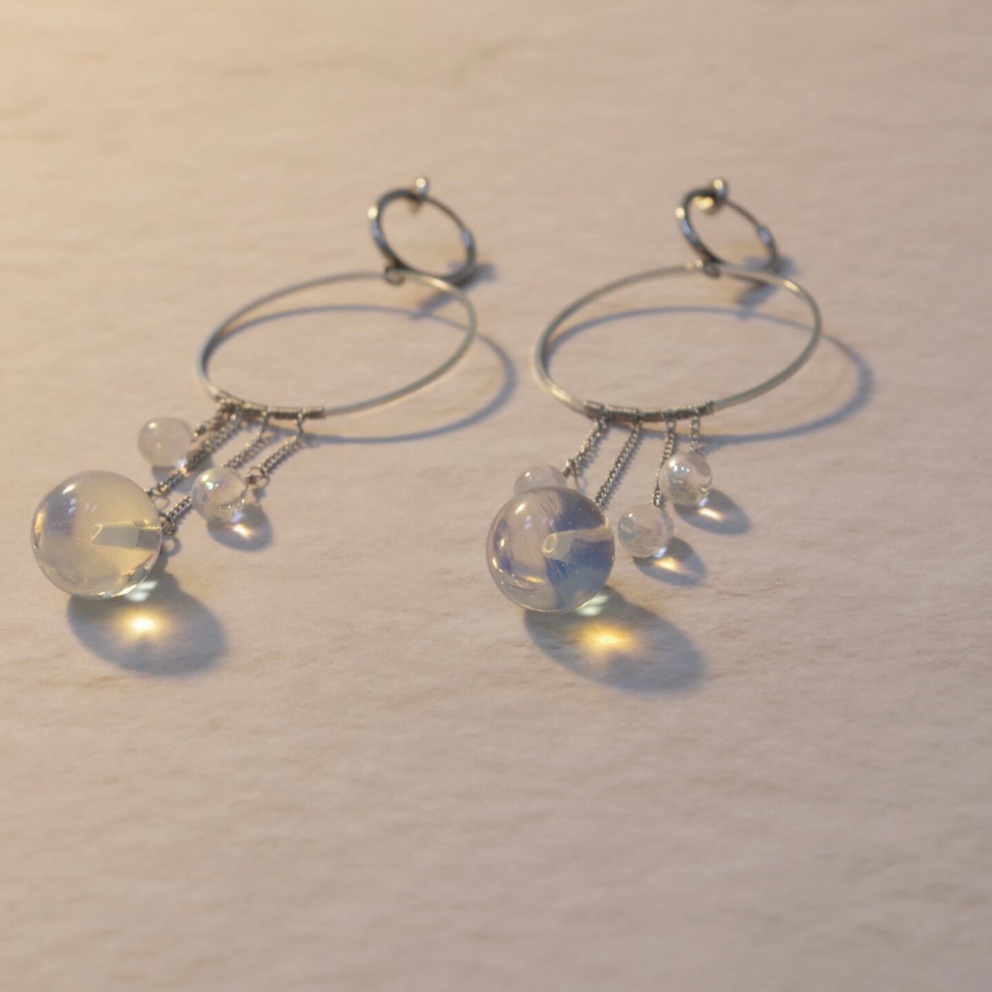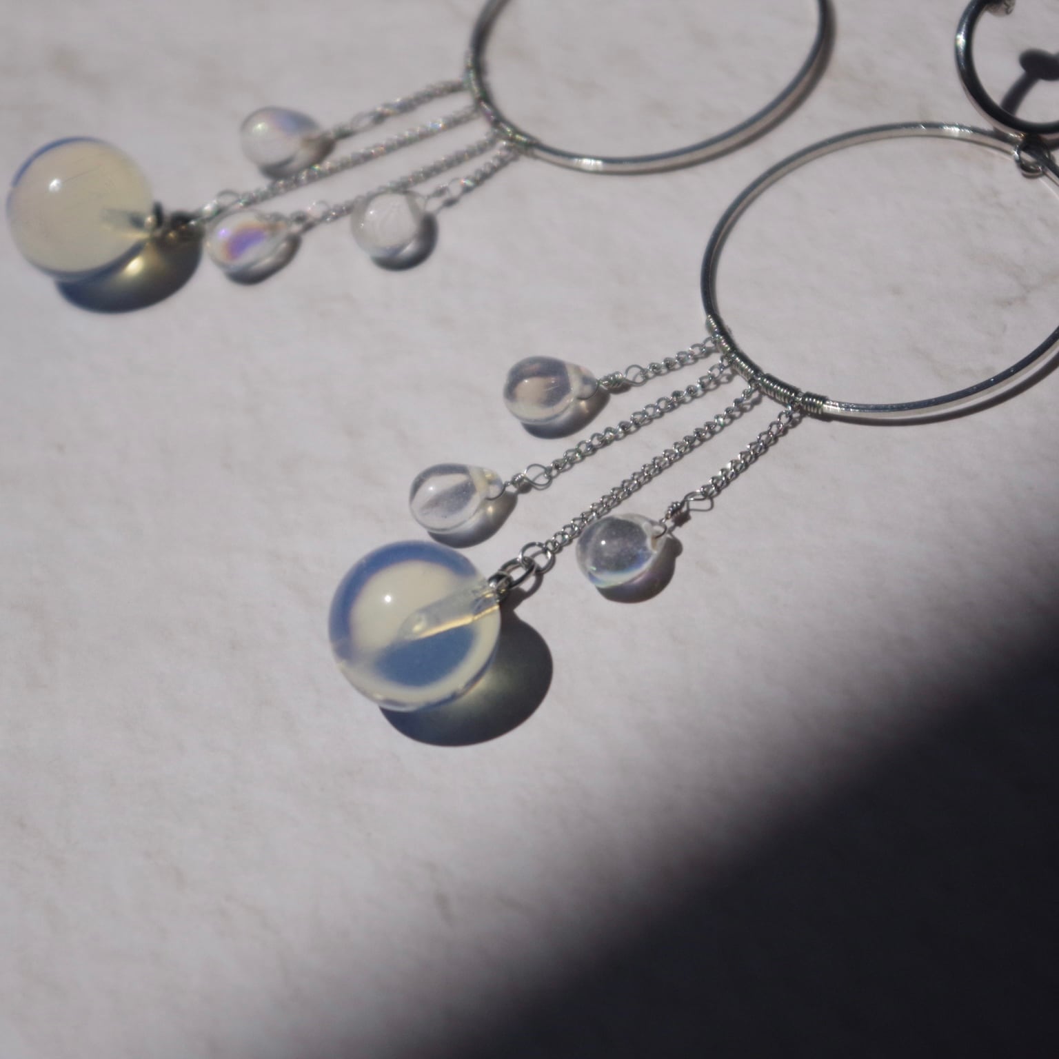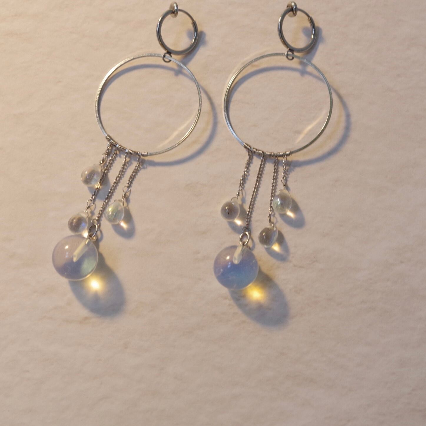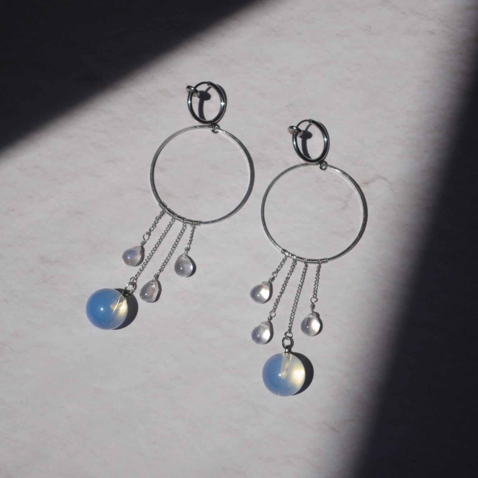 大ぶり ピアス イヤリング ドロップ シルバー 透明感 つやつや 個性派 揺れる チェコビーズ 青 きれいめ 淡い オパール 金属アレルギー 夏 涼感 涼しげ うるうる ツヤ