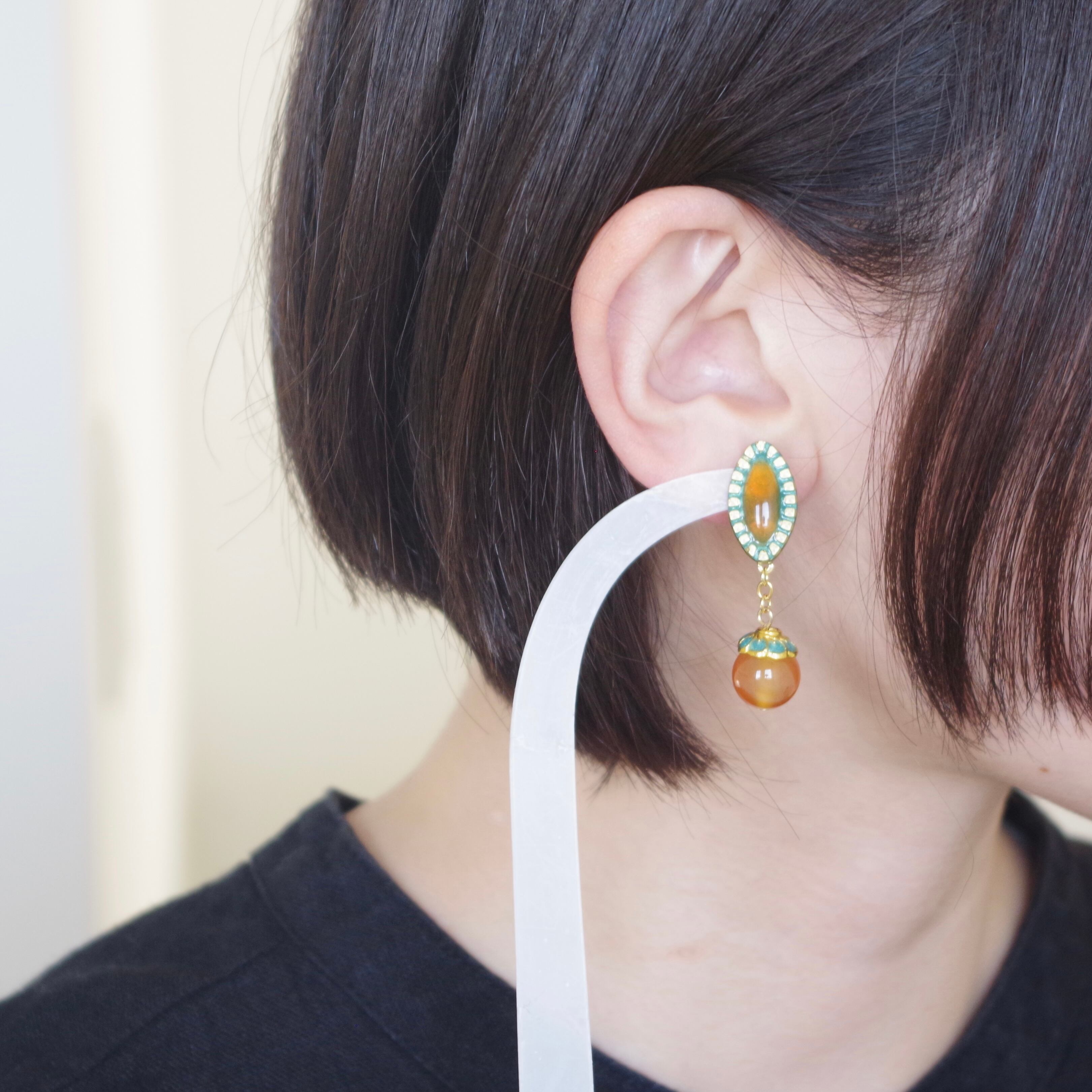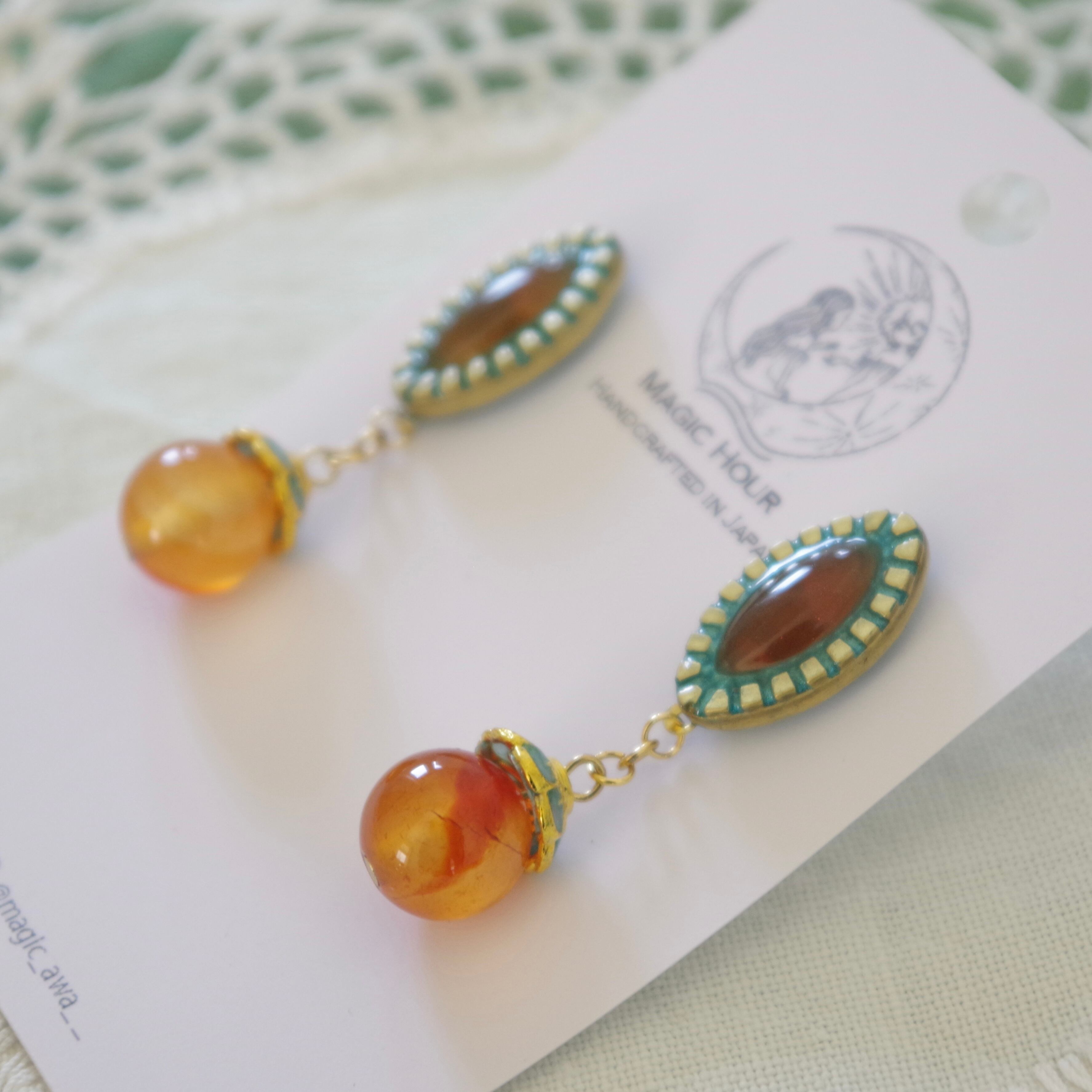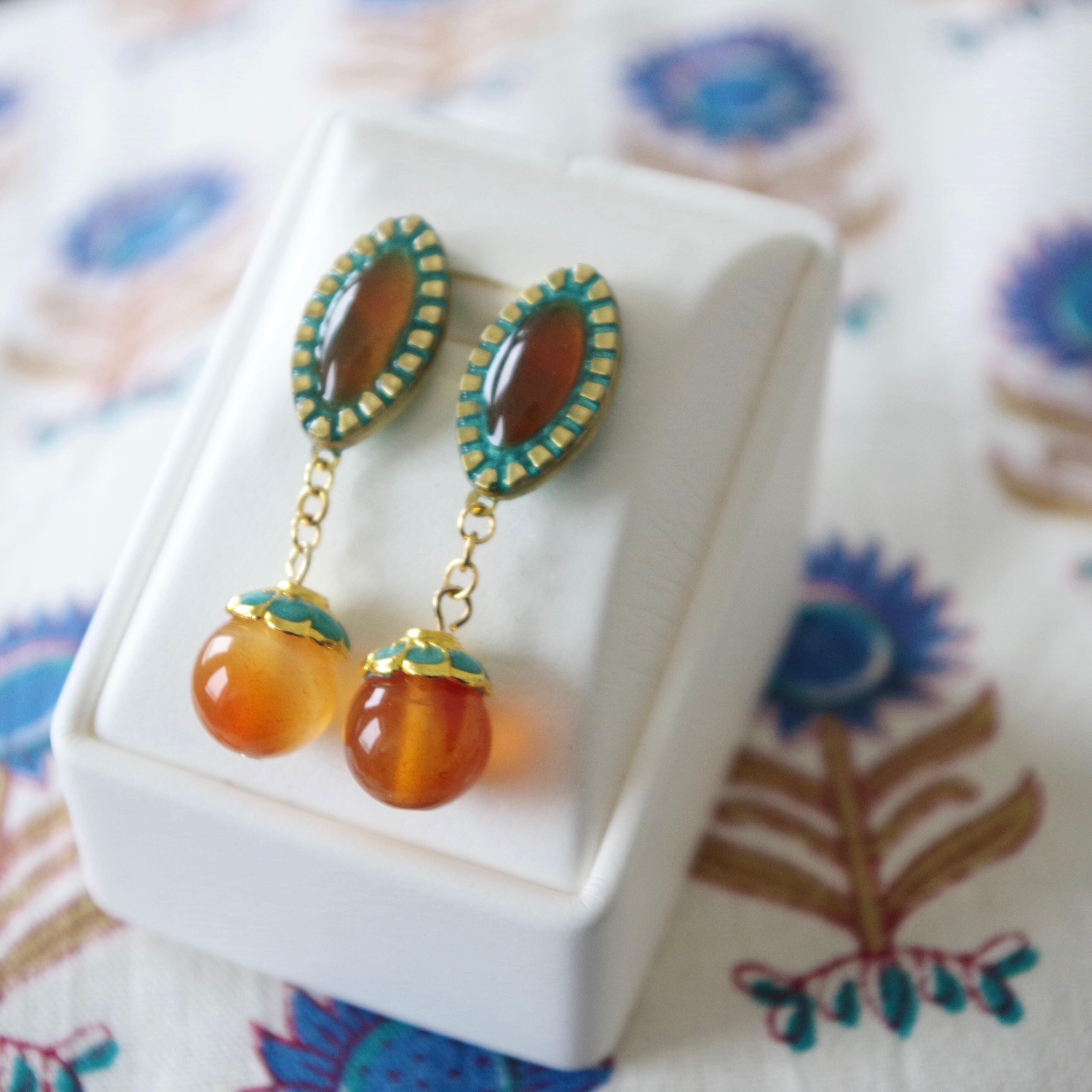 トマトオレンジとアクアグリーンのカボションが海辺の日差しを思わせ、その下でカーネリアンが揺れるさまは心地よい海風に吹かれている様です。鮮やかな色合いと繊細なデザインが、日常にリゾート気分をプラスしてくれることでしょう。