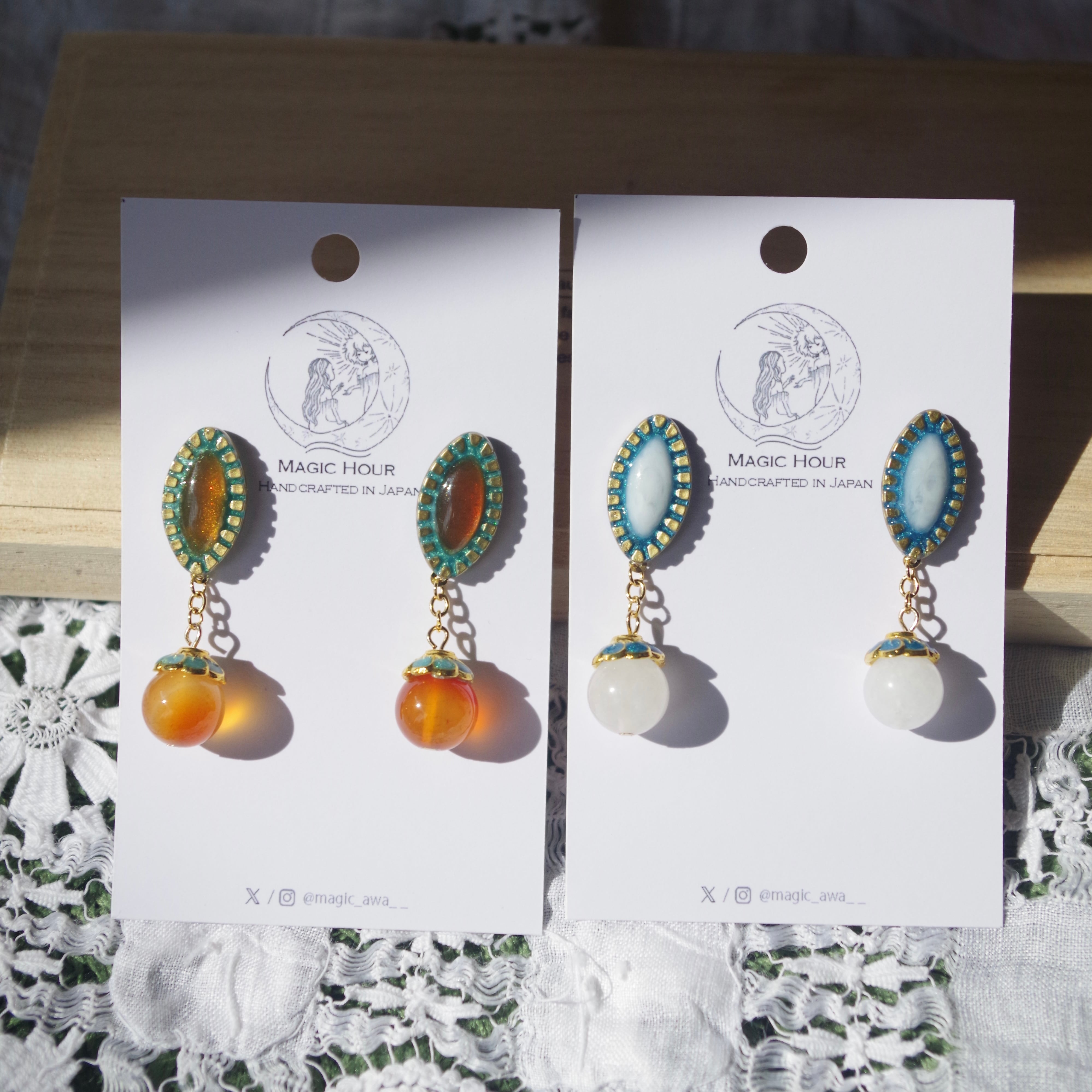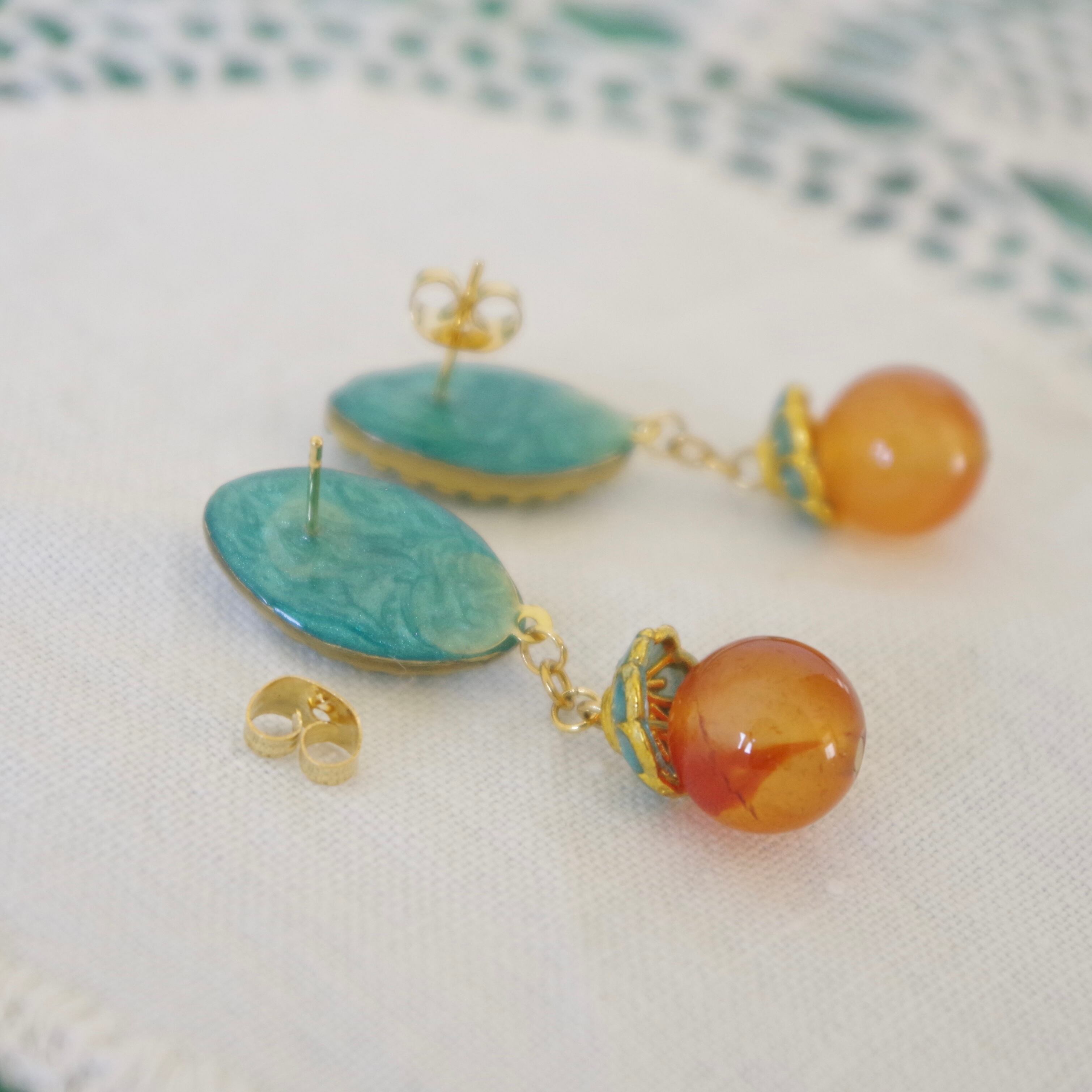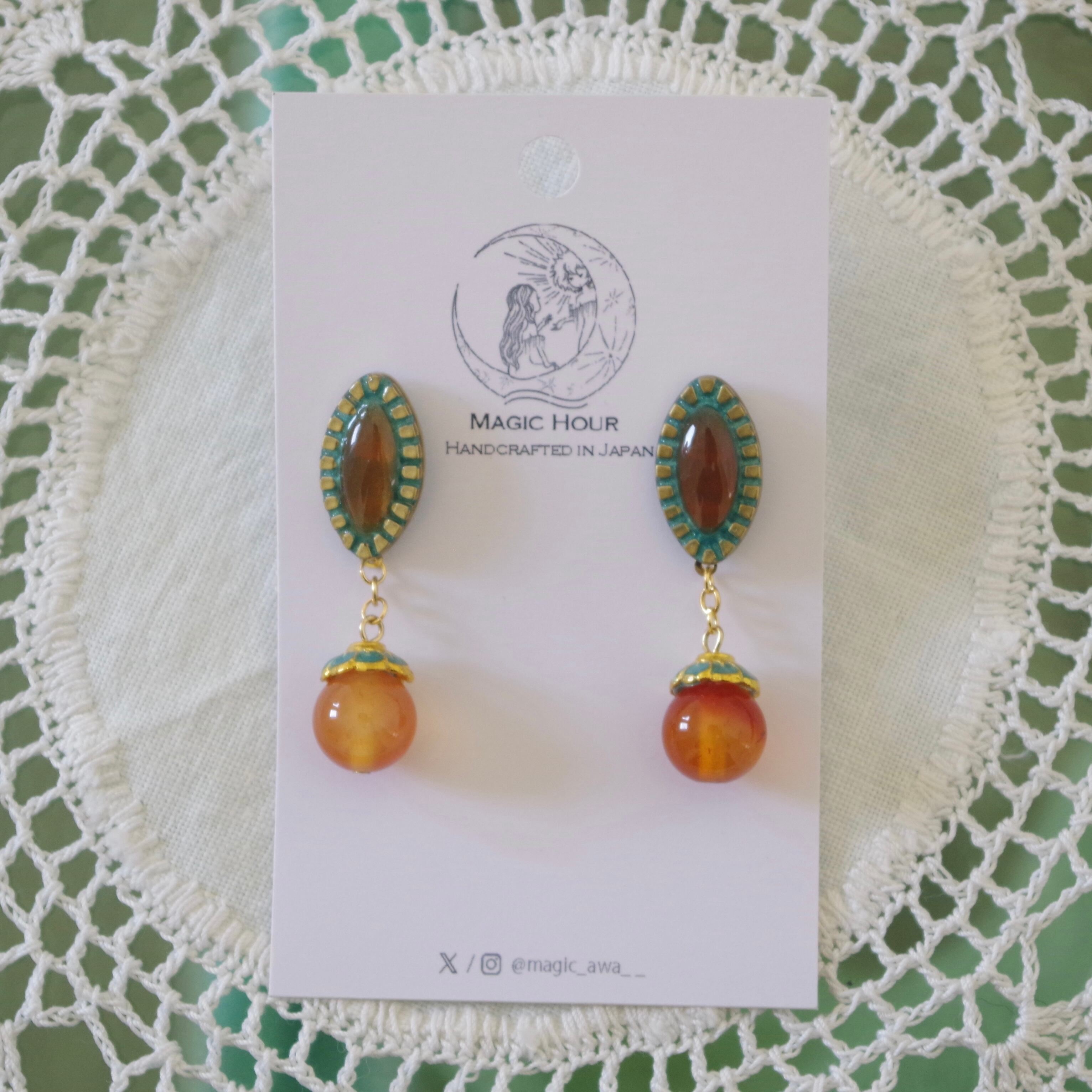 トマトオレンジとアクアグリーンのカボションが海辺の日差しを思わせ、その下でカーネリアンが揺れるさまは心地よい海風に吹かれている様です。鮮やかな色合いと繊細なデザインが、日常にリゾート気分をプラスしてくれることでしょう。