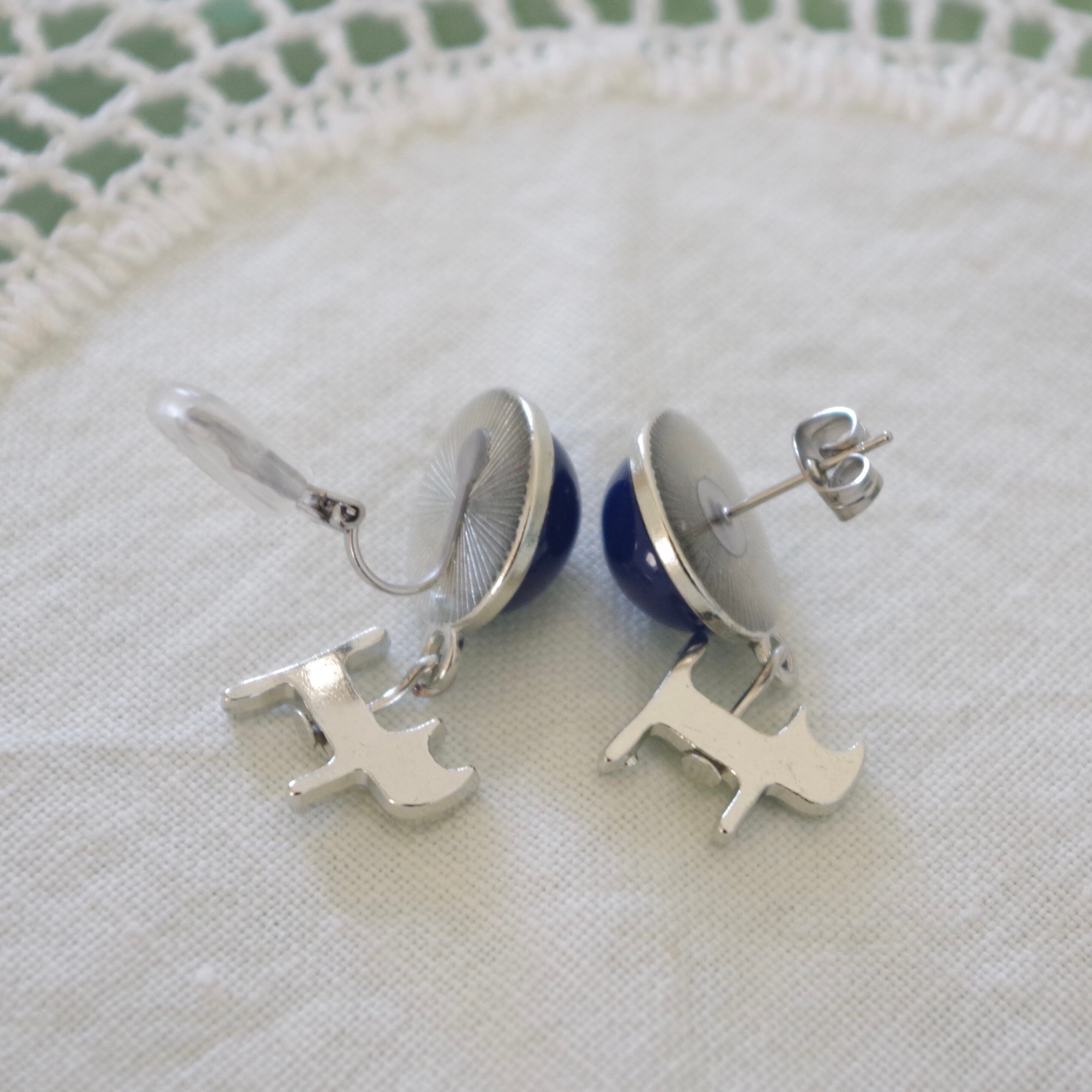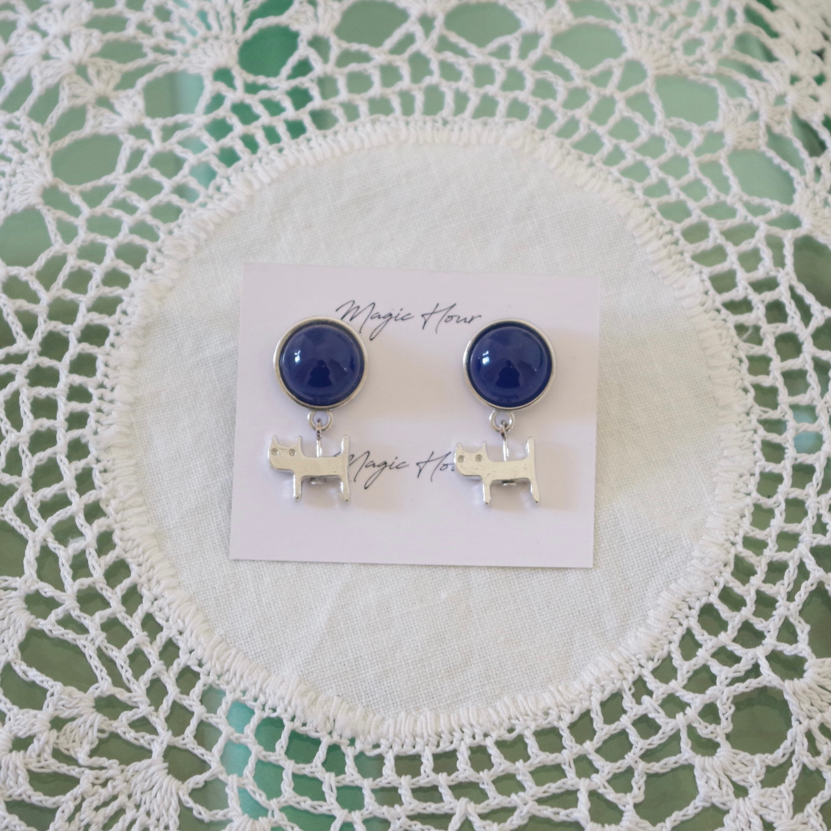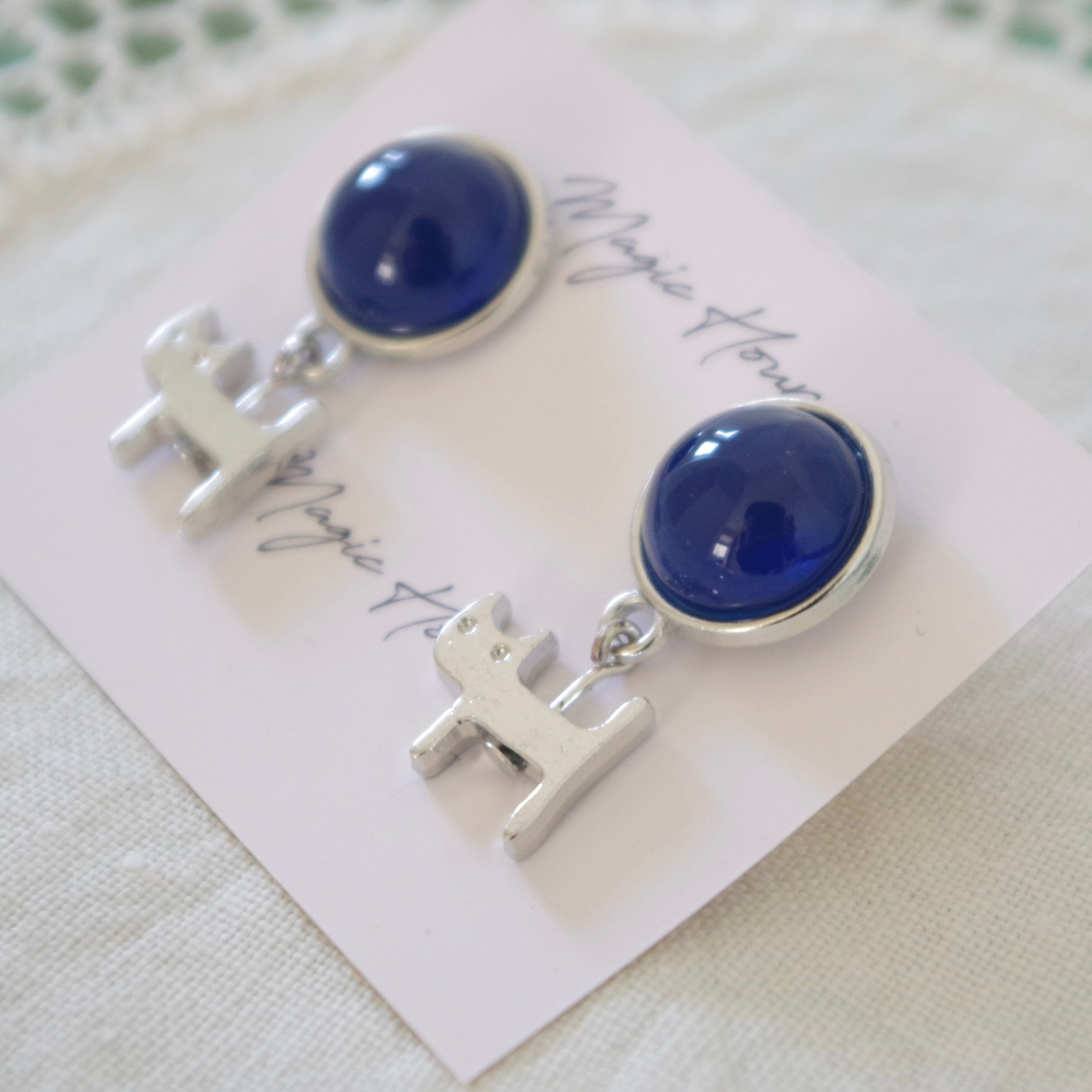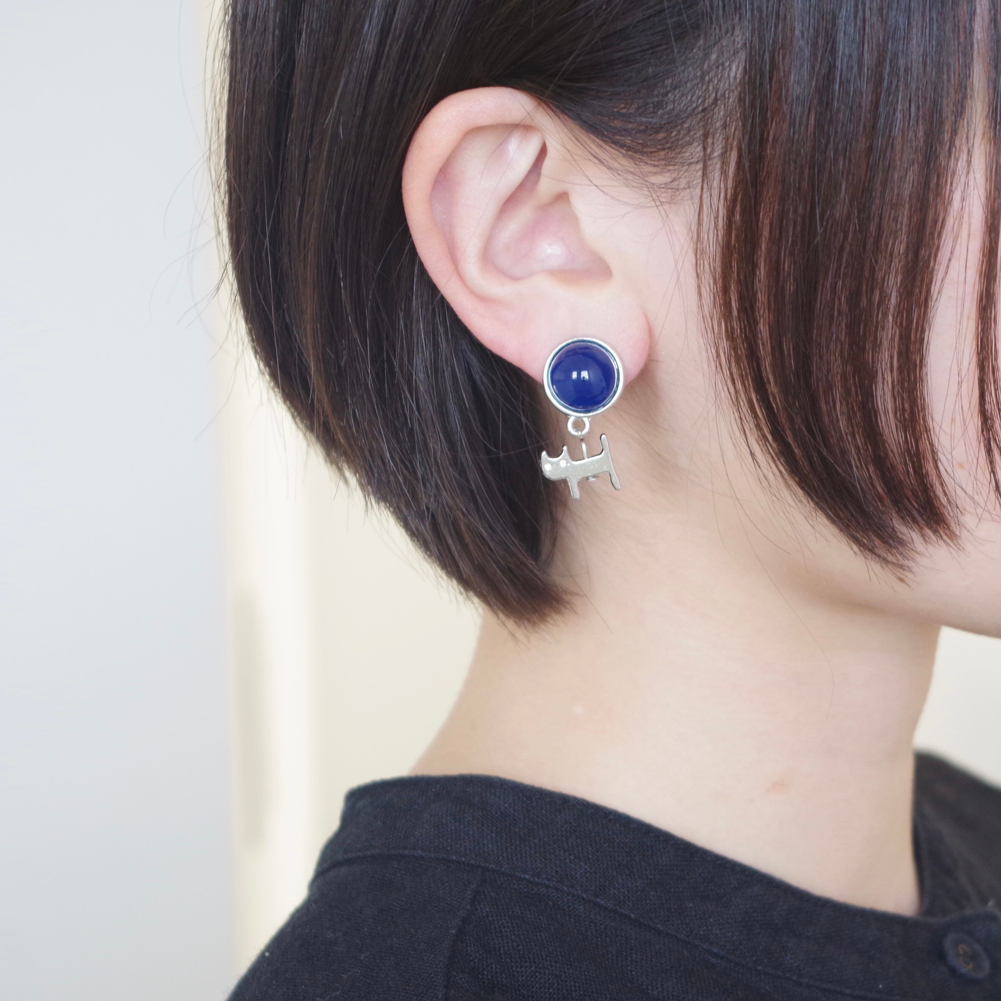 ロイヤルブルーのカボションの下に揺れる、なんとも憎めない猫のチャームがお洒落なアクセントになっています。 ひとつひとつ手作りされているため、他の人とは差のつく特別なアイテムです。