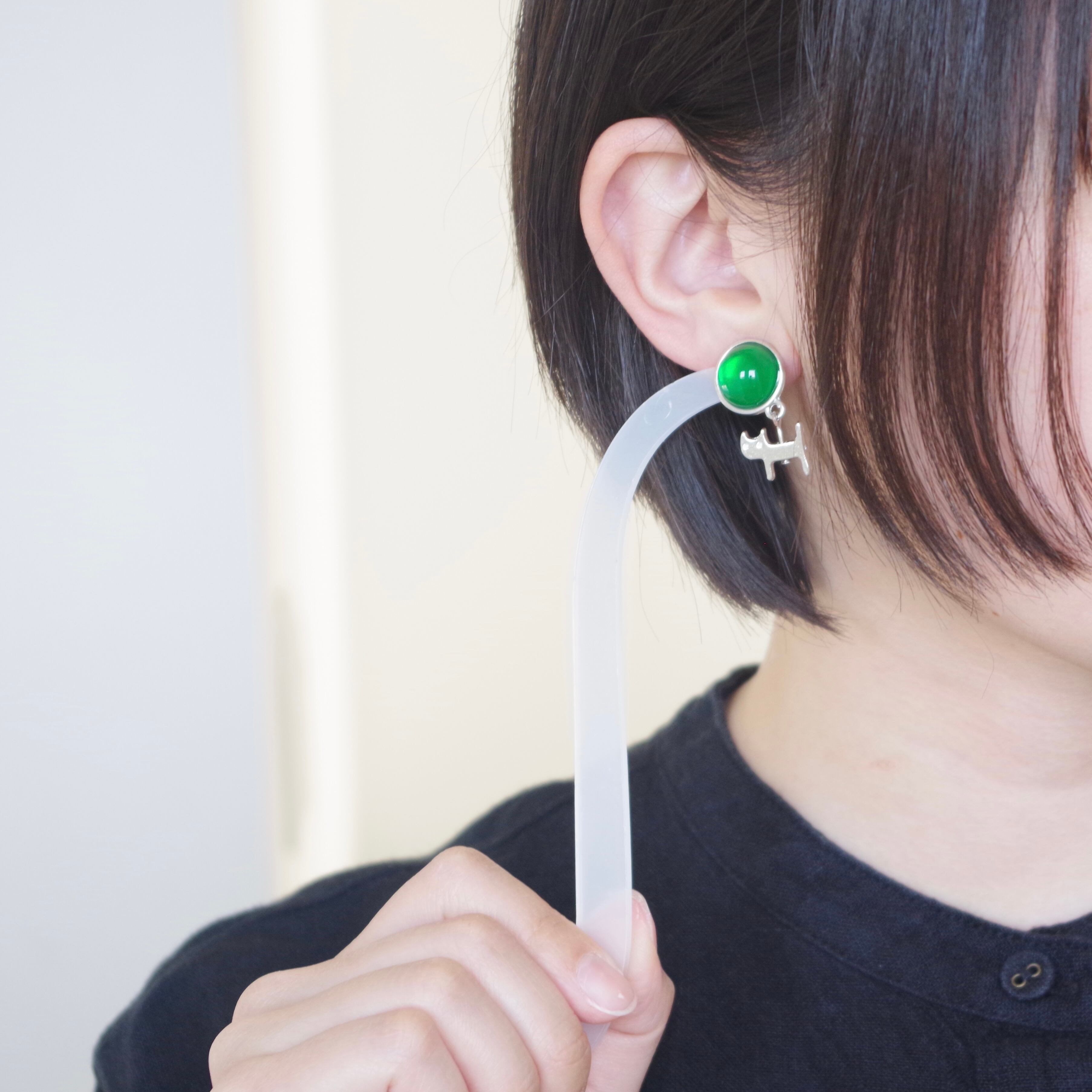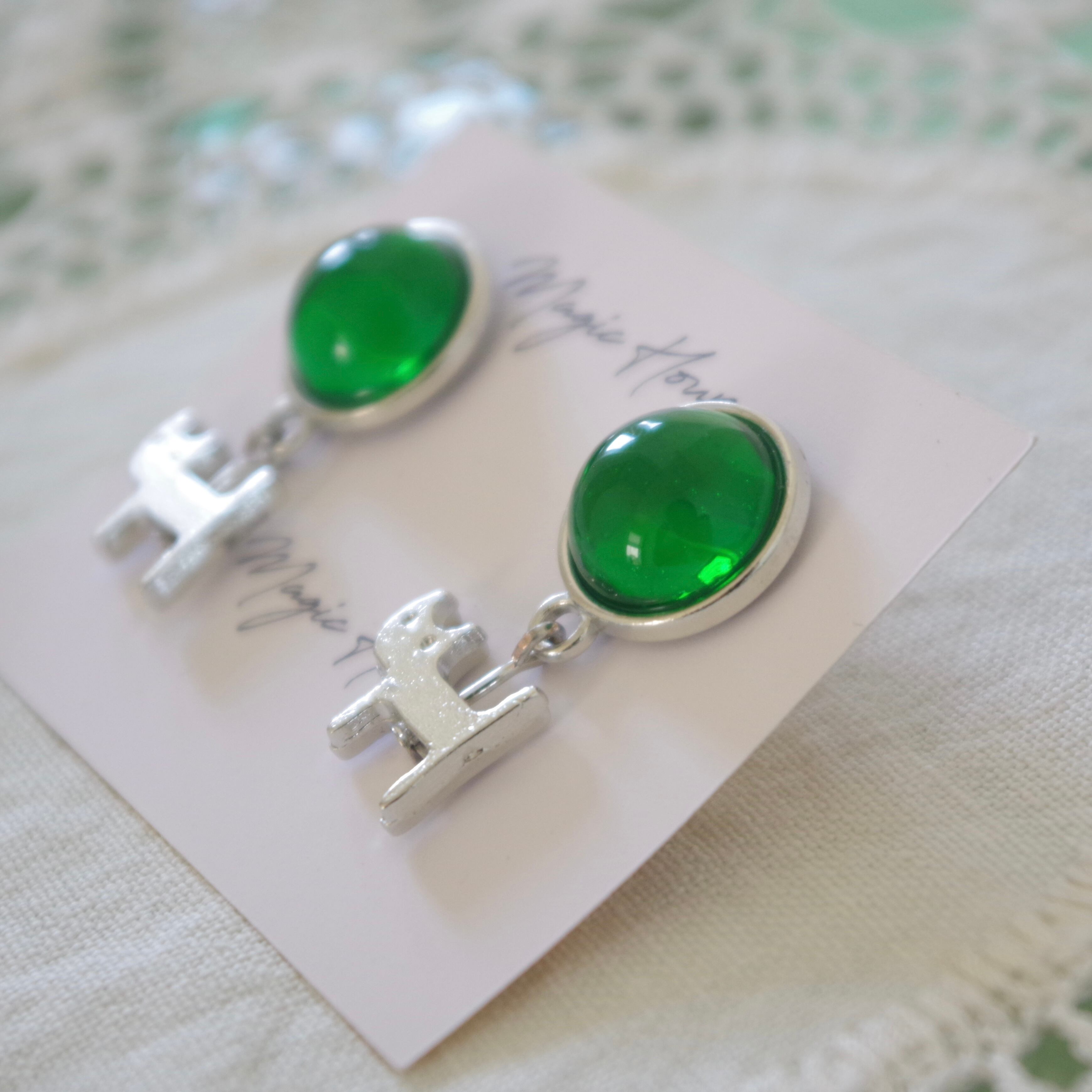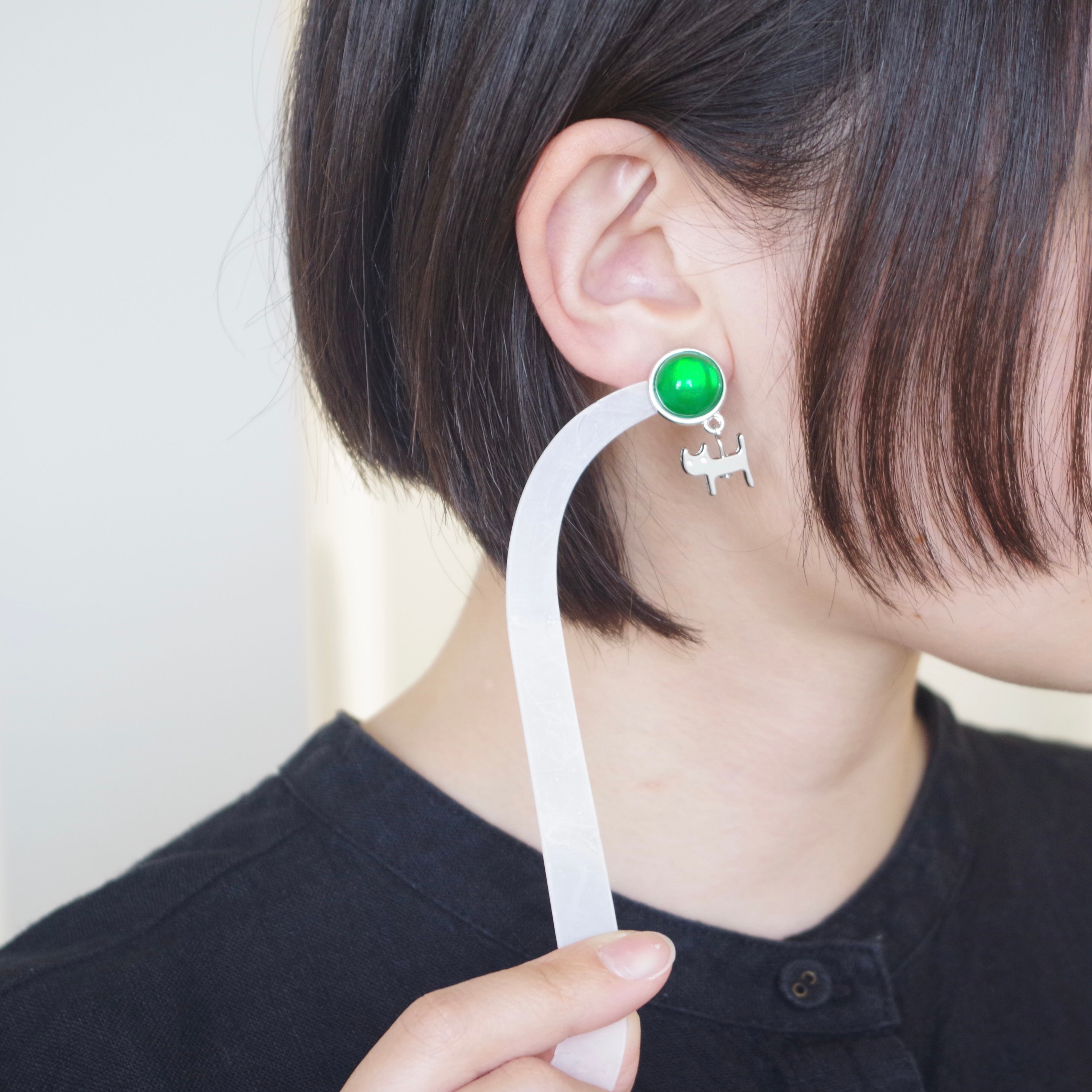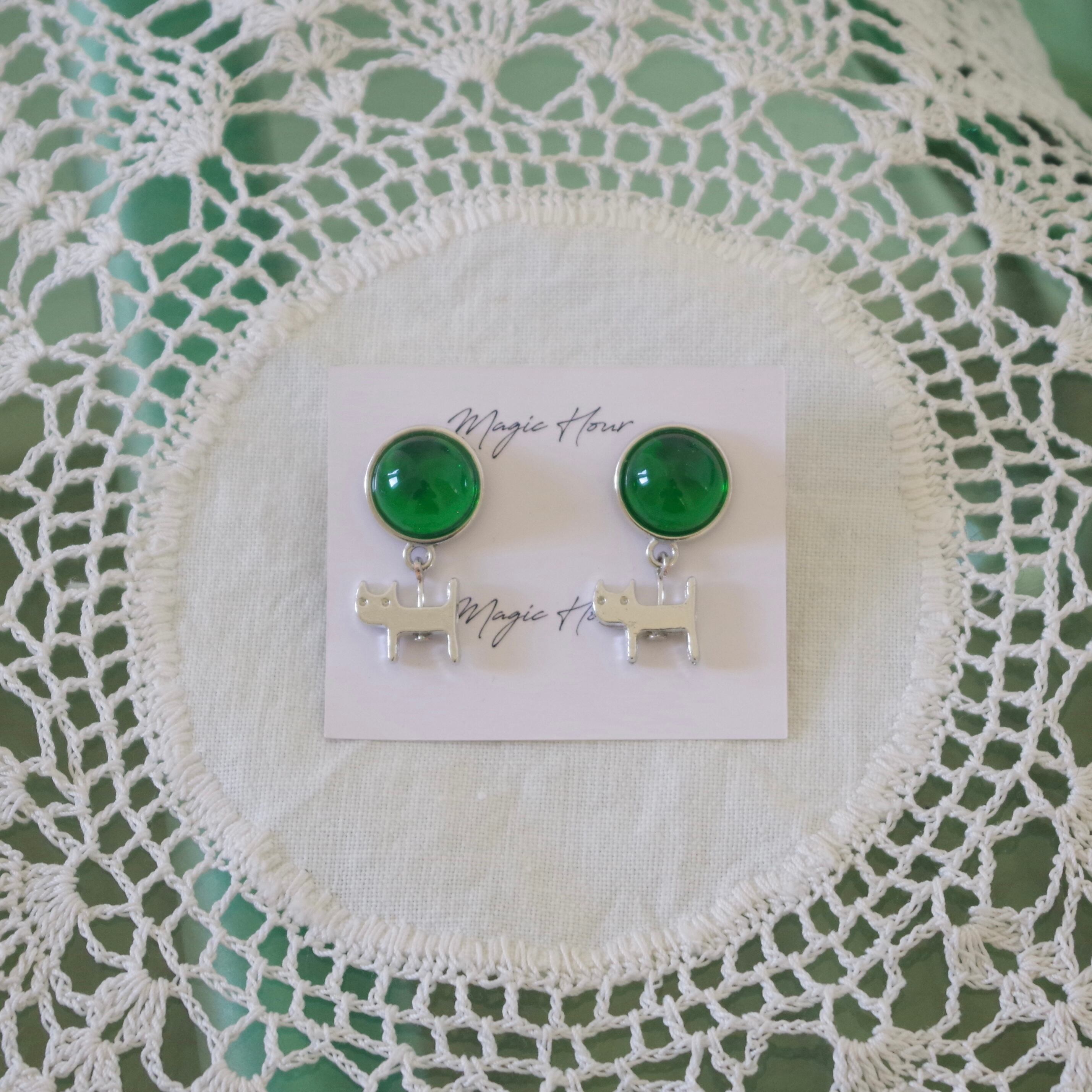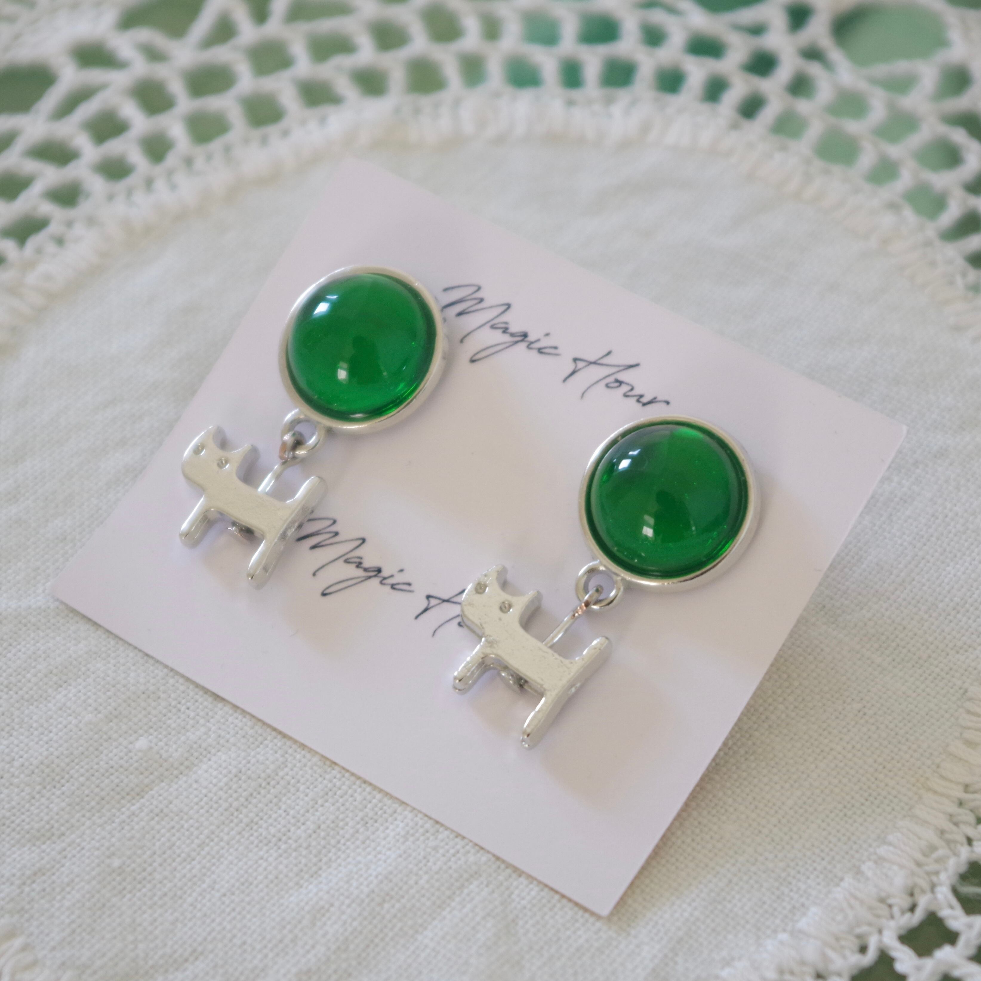エメラルドグリーンのカボションの下に揺れる、なんとも憎めない猫のチャームがお洒落なアクセントになっています。 ひとつひとつ手作りされているため、他の人とは差のつく特別なアイテムです。