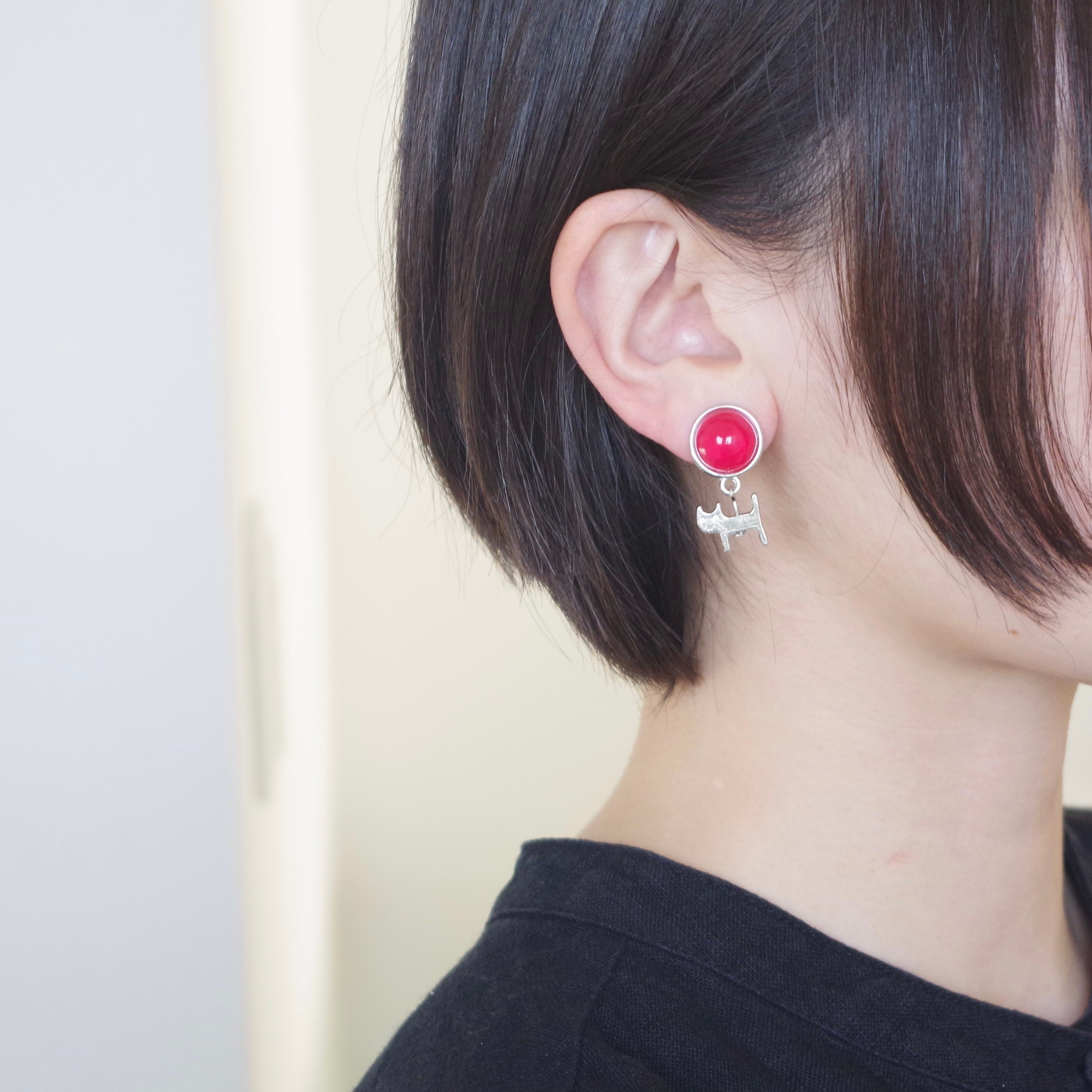 ホットピンクのカボションの下に揺れる、なんとも憎めない猫のチャームがお洒落なアクセントになっています。 ひとつひとつ手作りされているため、他の人とは差のつく特別なアイテムです。