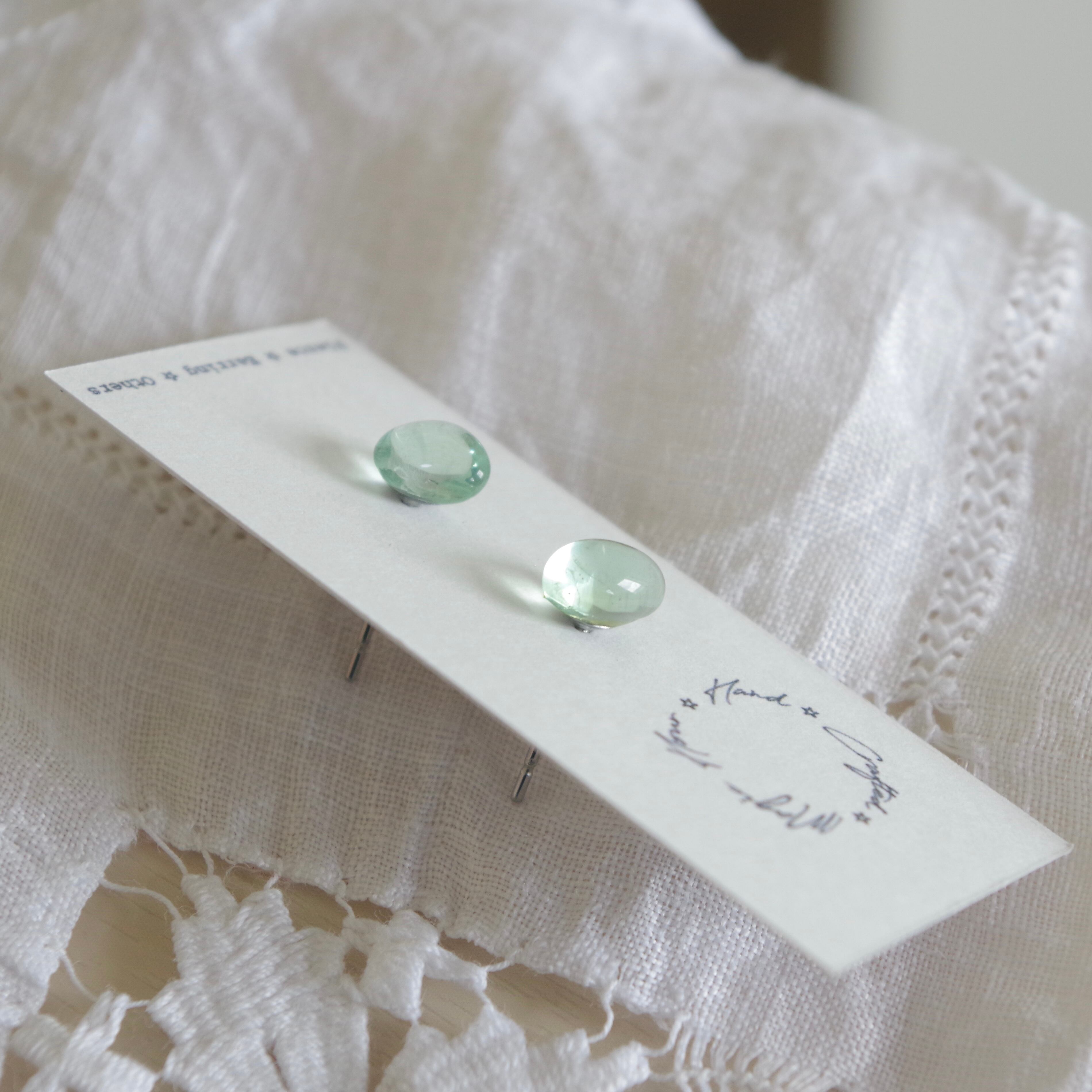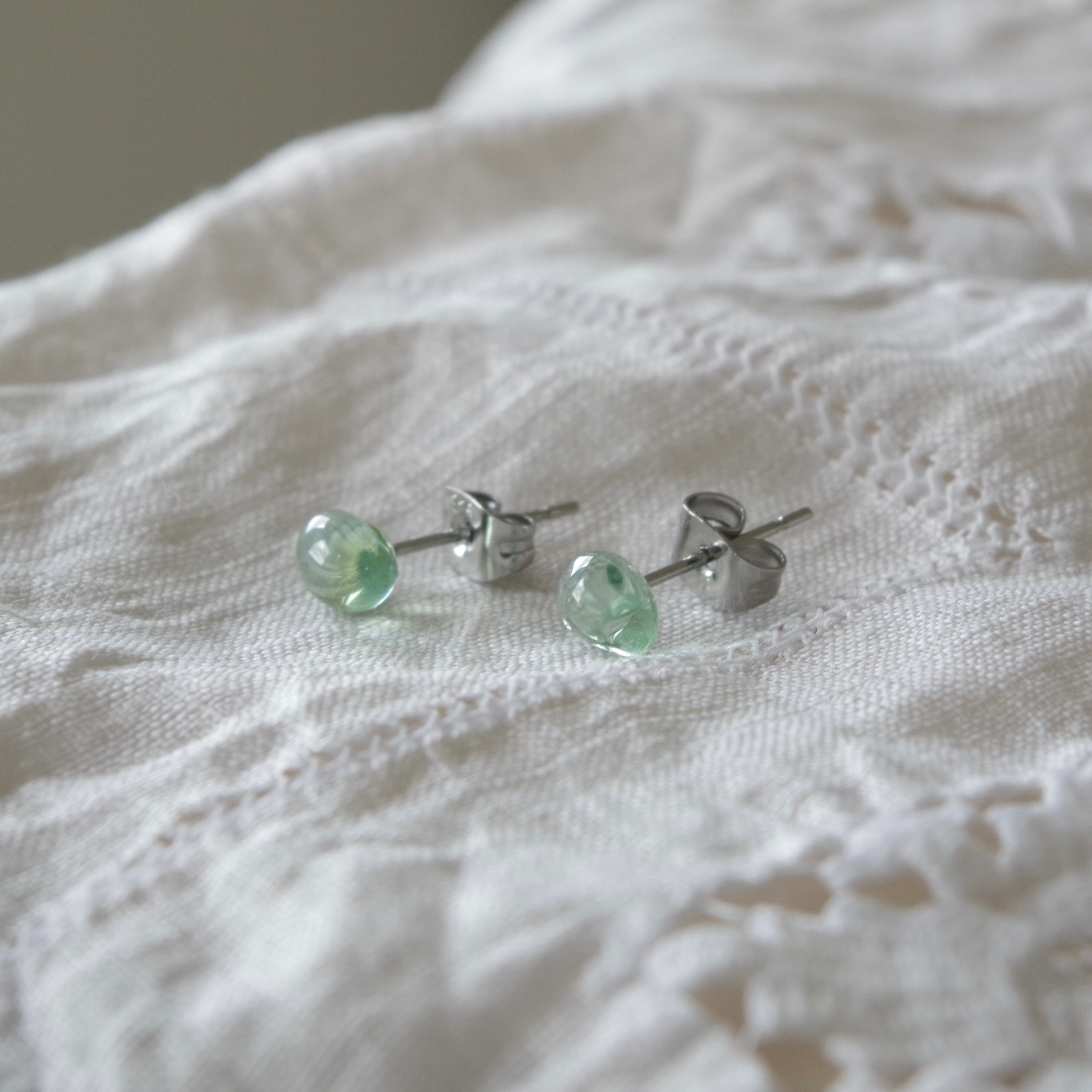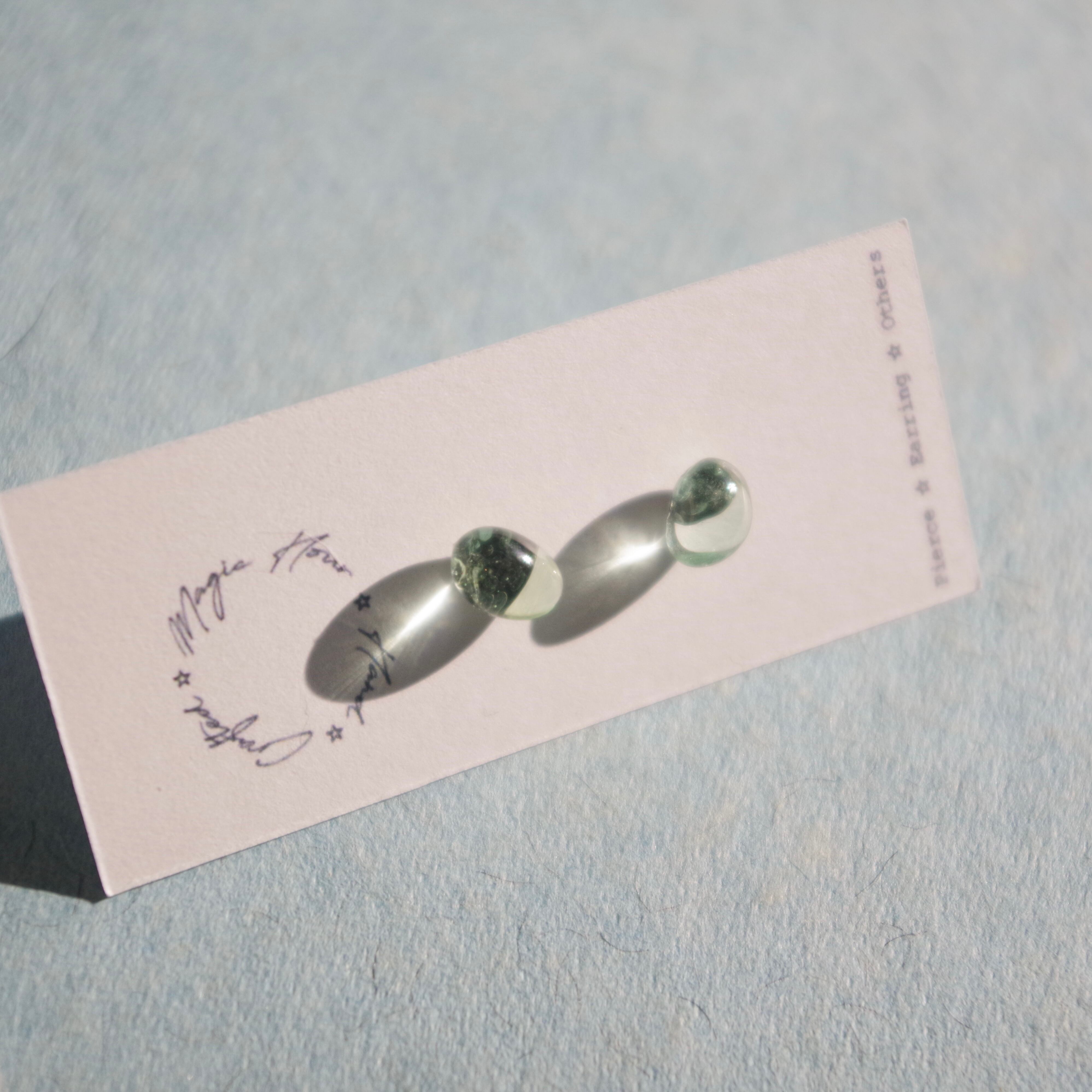 海辺で拾ったシーグラスを、水滴の様なうるツヤピアスにアップサイクルしました。