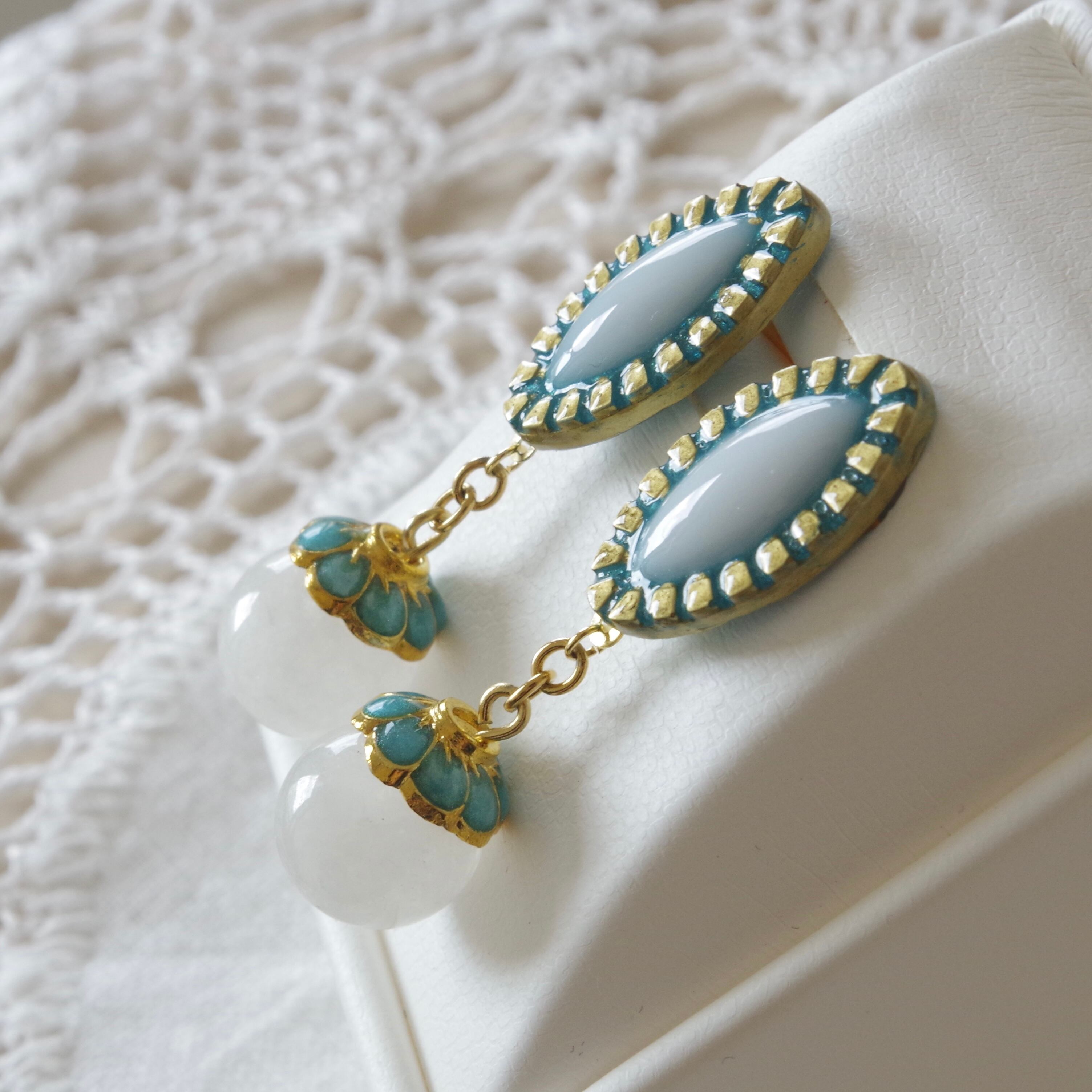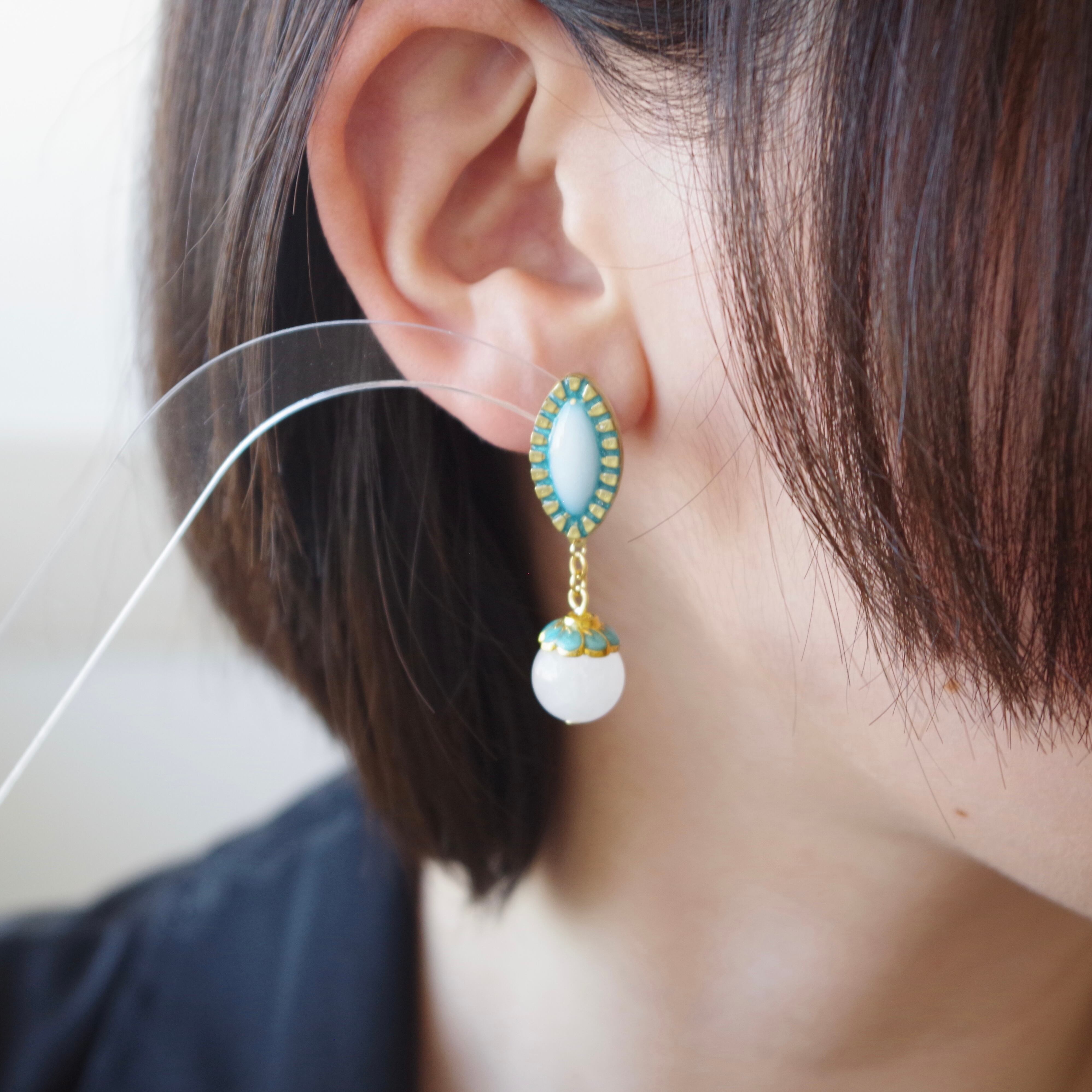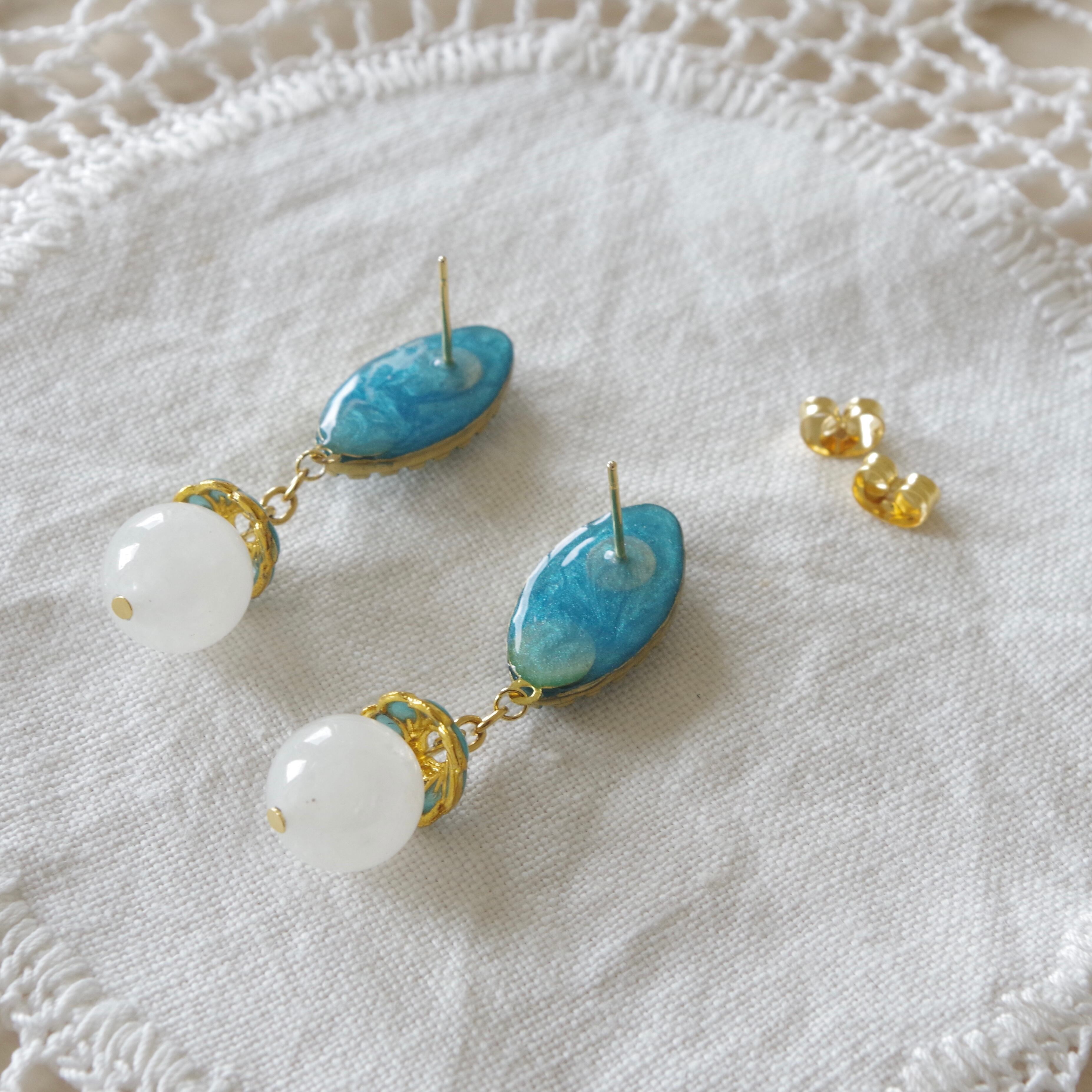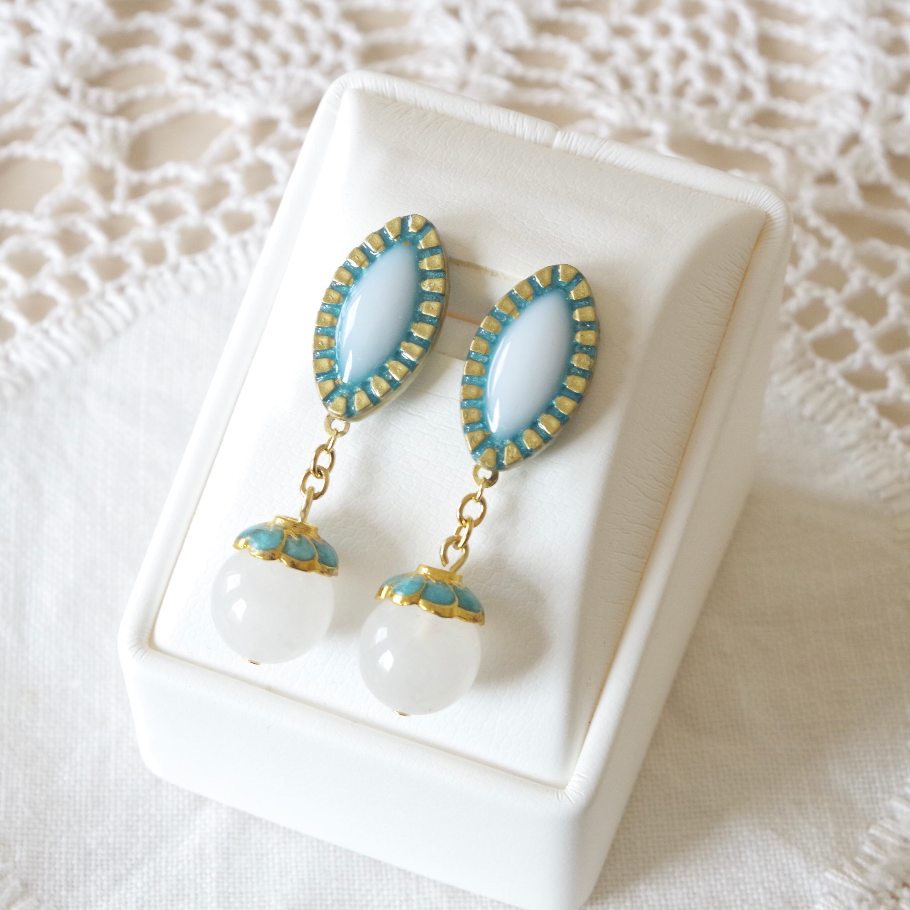 爽やかな水色とホワイトのカボションが青空と白い雲を思わせ、その下でホワイトジェイドが揺れるさまは心地よい海風に吹かれている様です。鮮やかな色合いと繊細なデザインが、日常にリゾート気分をプラスしてくれることでしょう。