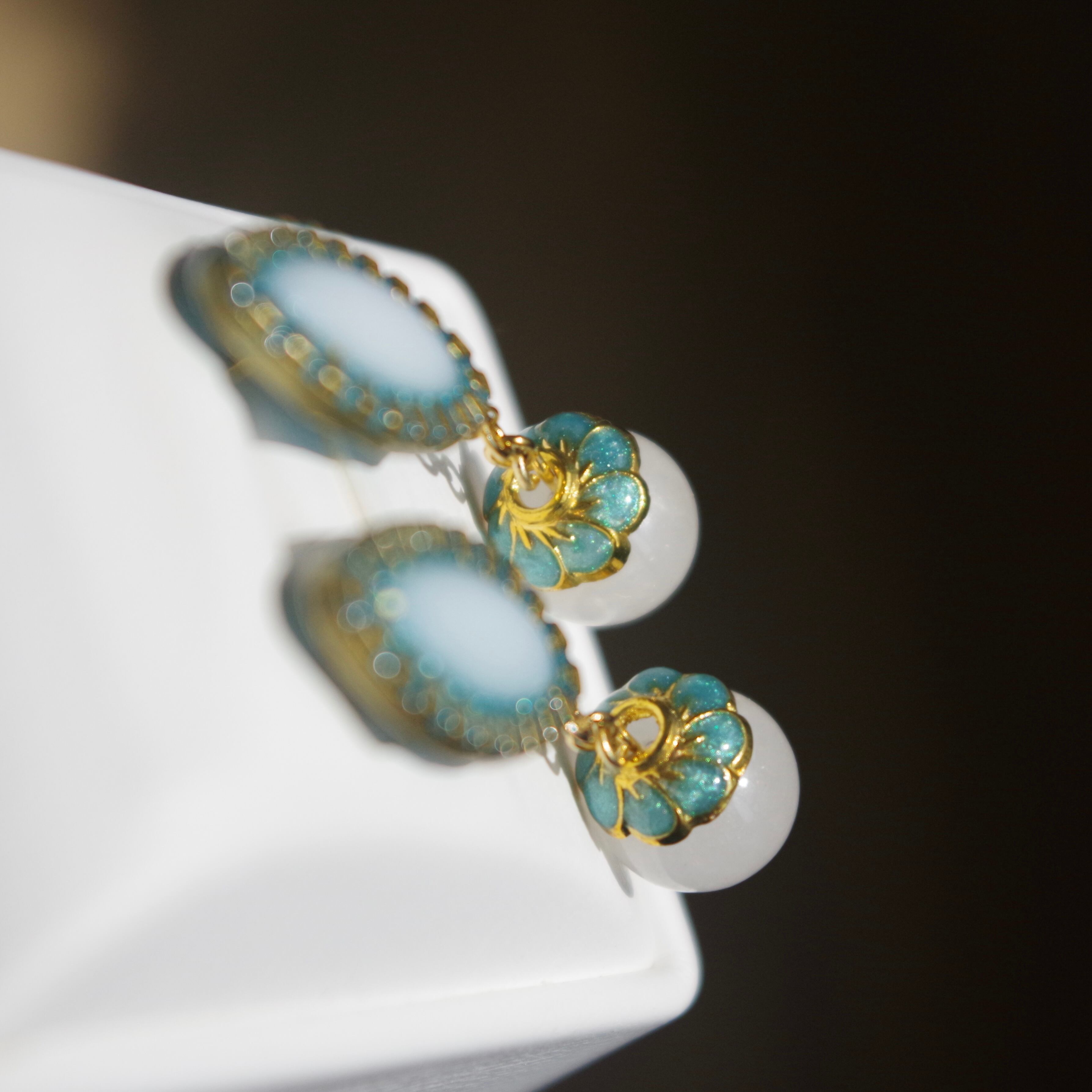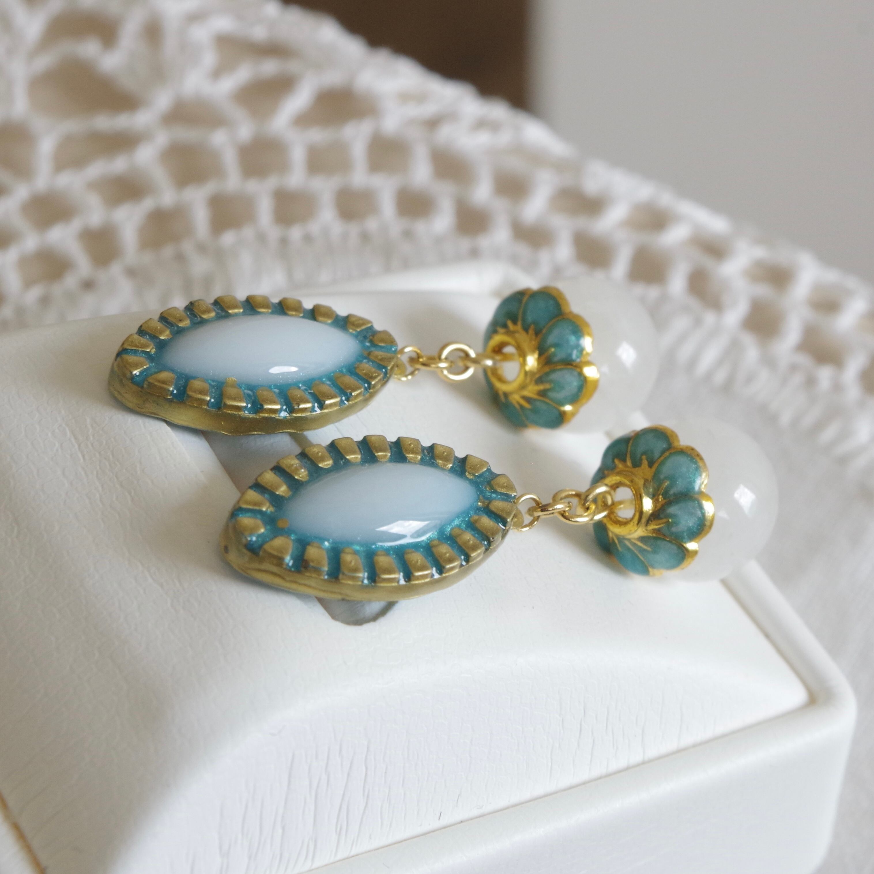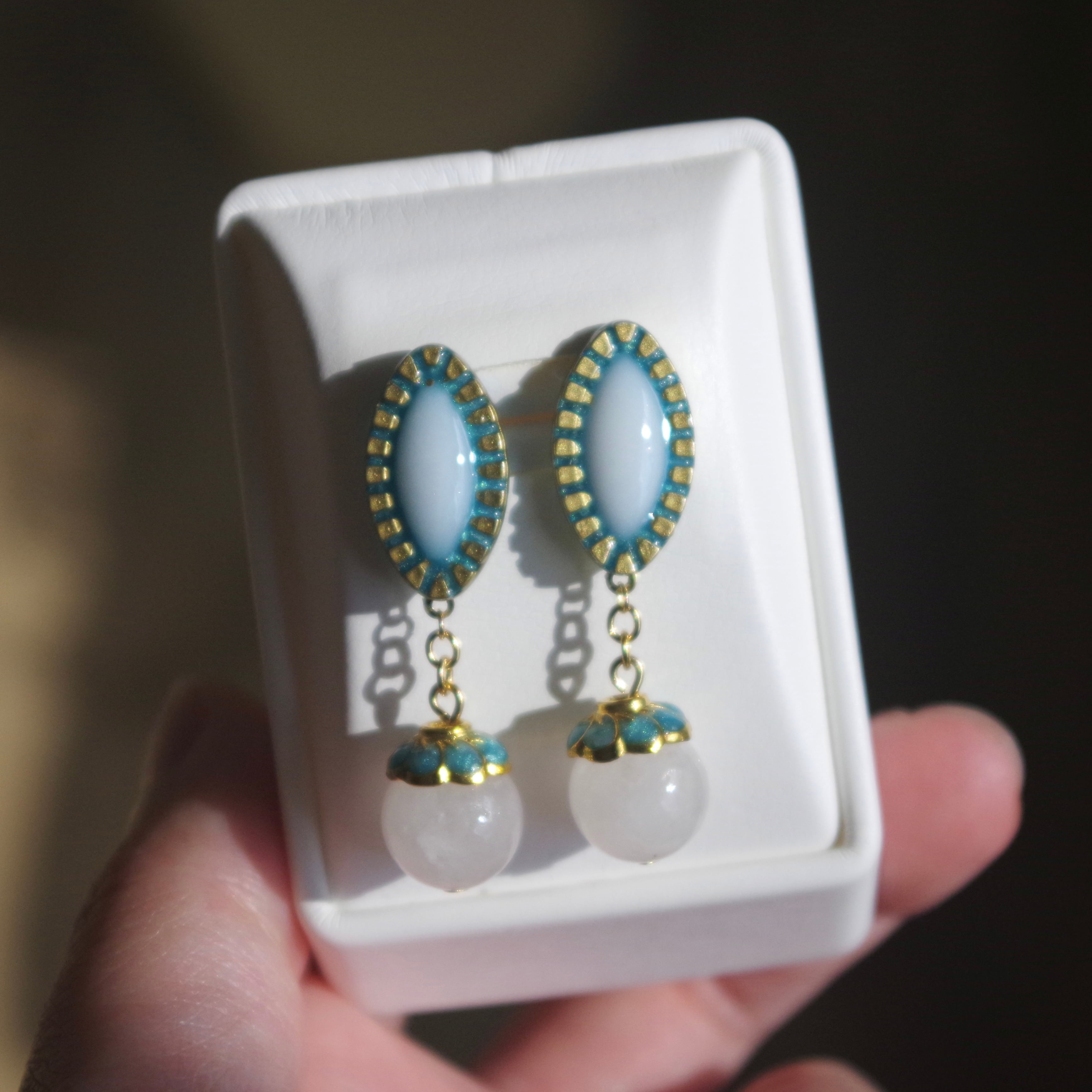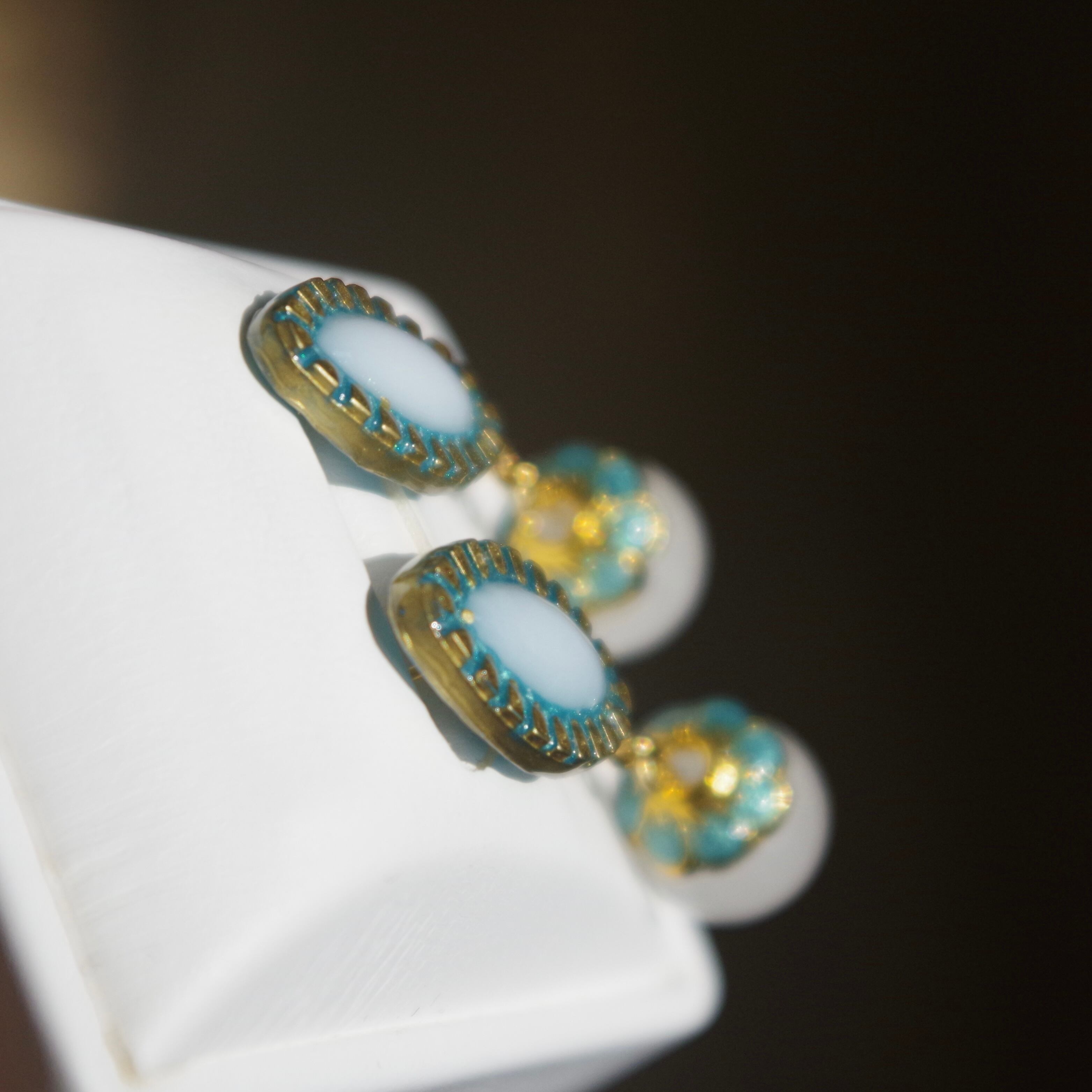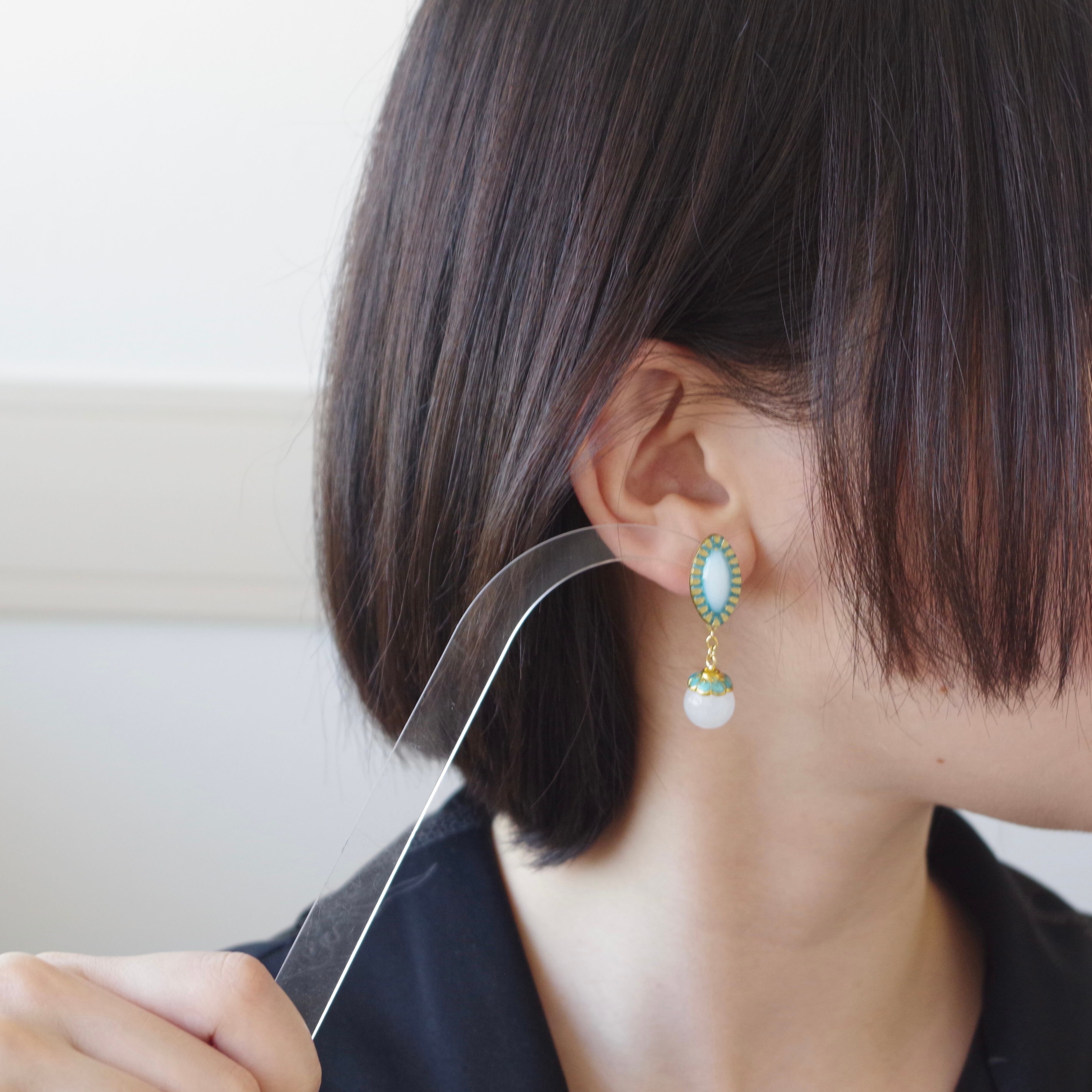 爽やかな水色とホワイトのカボションが青空と白い雲を思わせ、その下でホワイトジェイドが揺れるさまは心地よい海風に吹かれている様です。鮮やかな色合いと繊細なデザインが、日常にリゾート気分をプラスしてくれることでしょう。