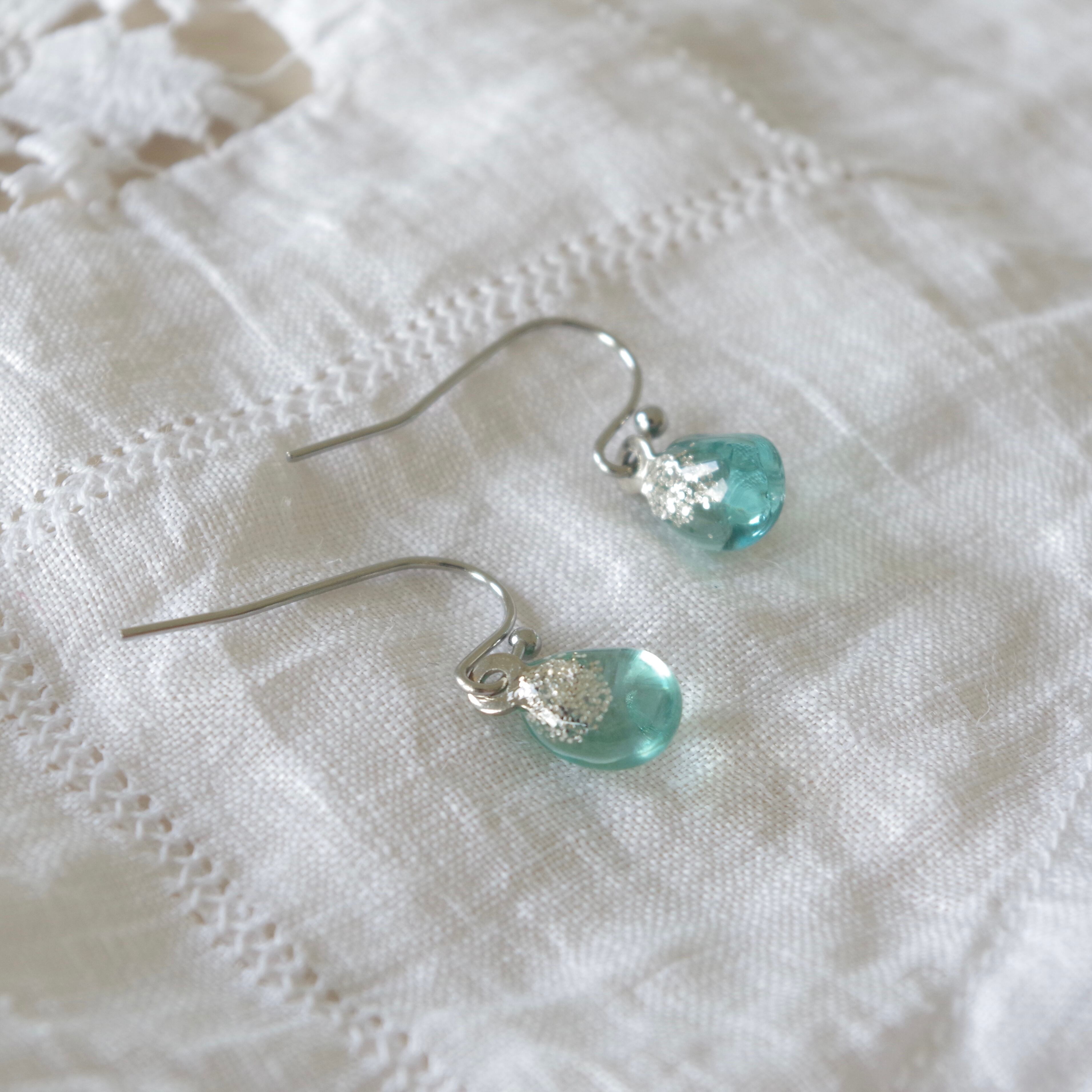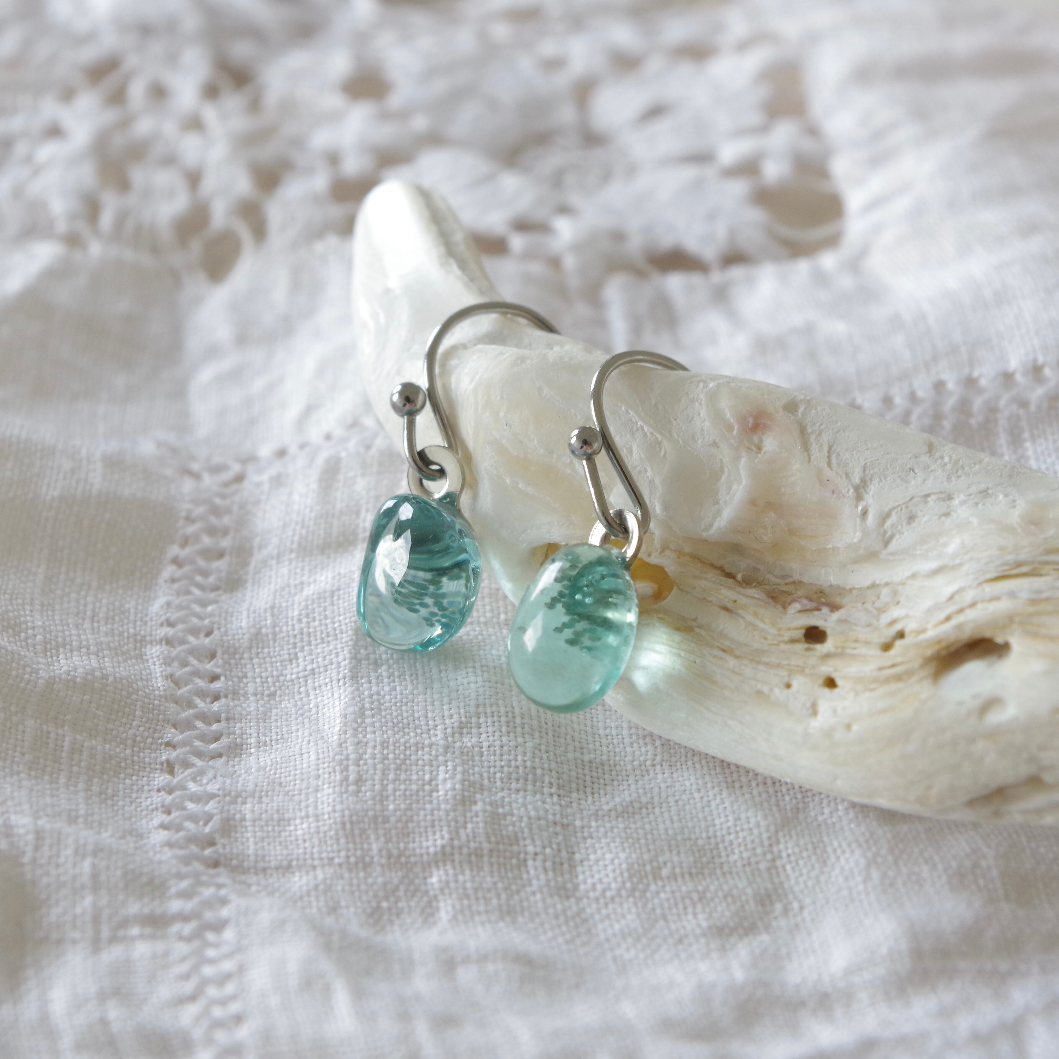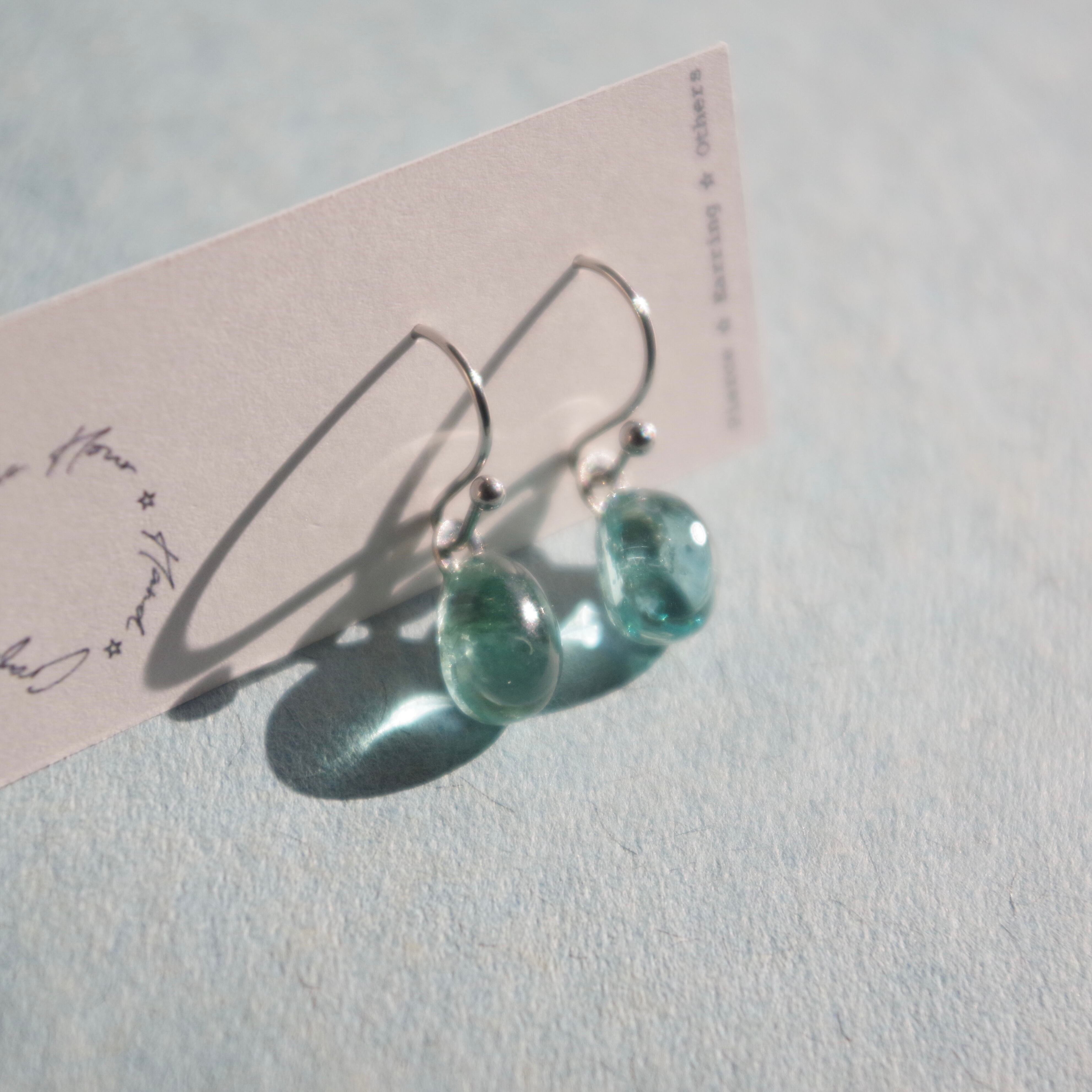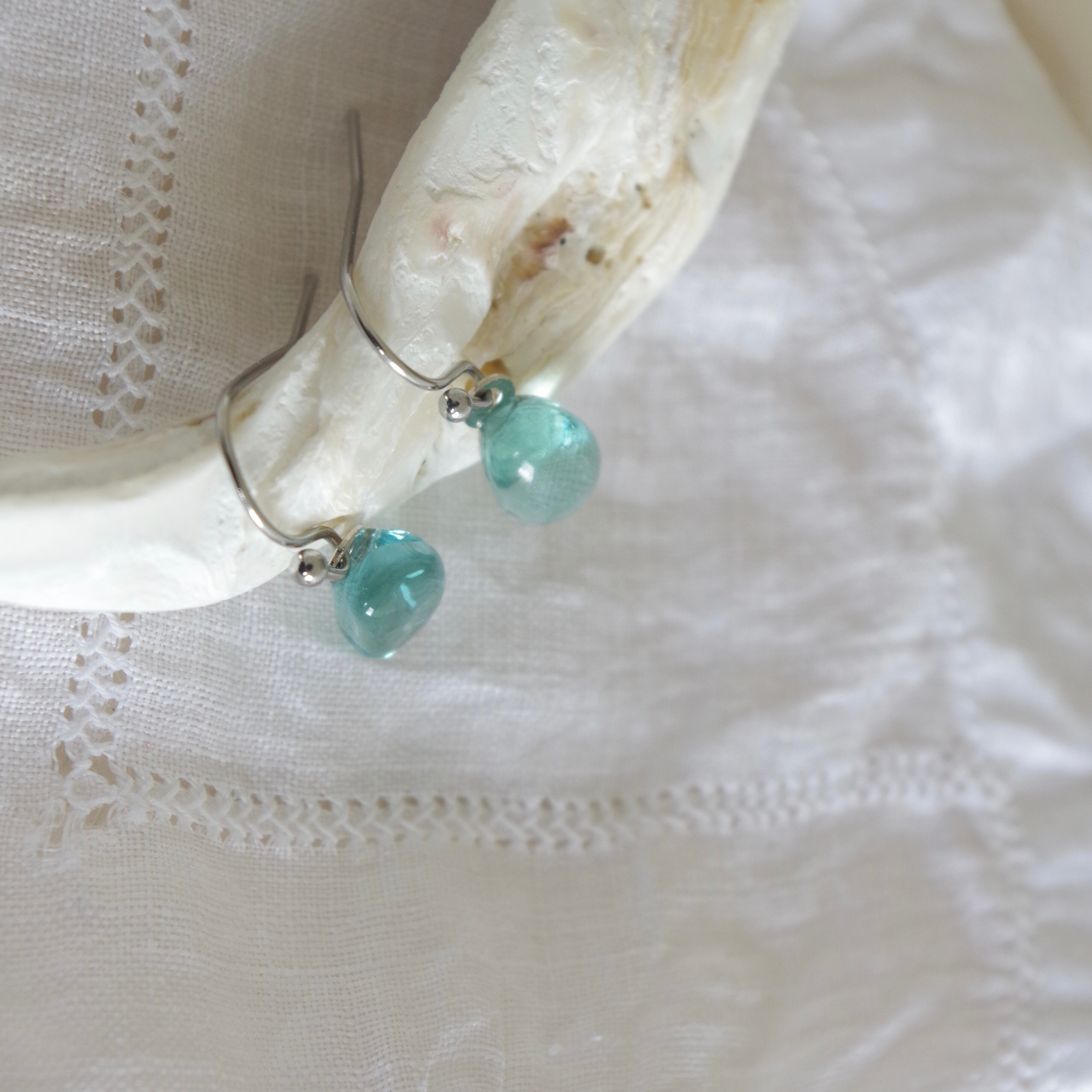 海辺で拾ったシーグラスを、水滴の様なうるツヤピアスにアップサイクルしました。