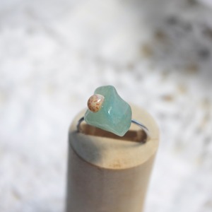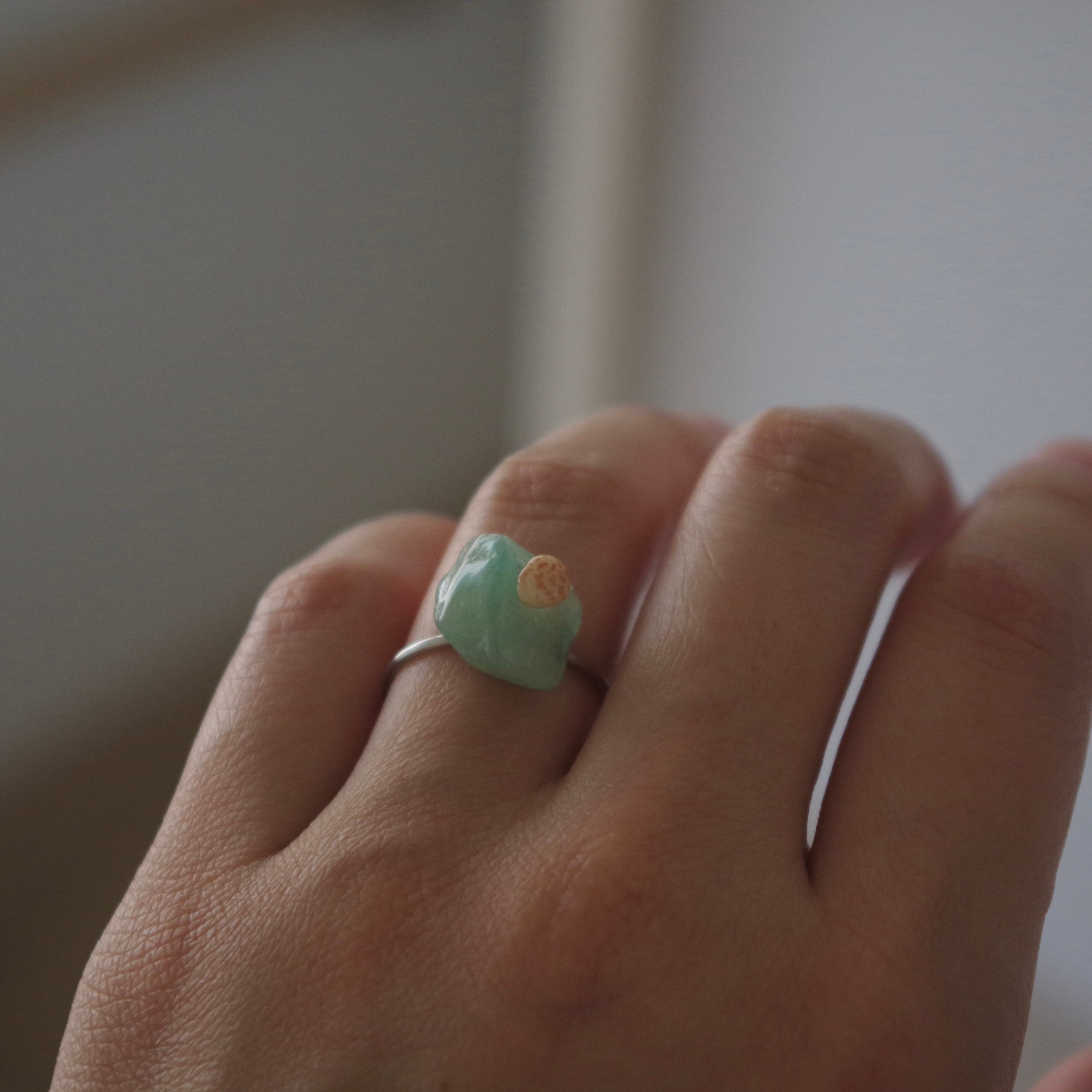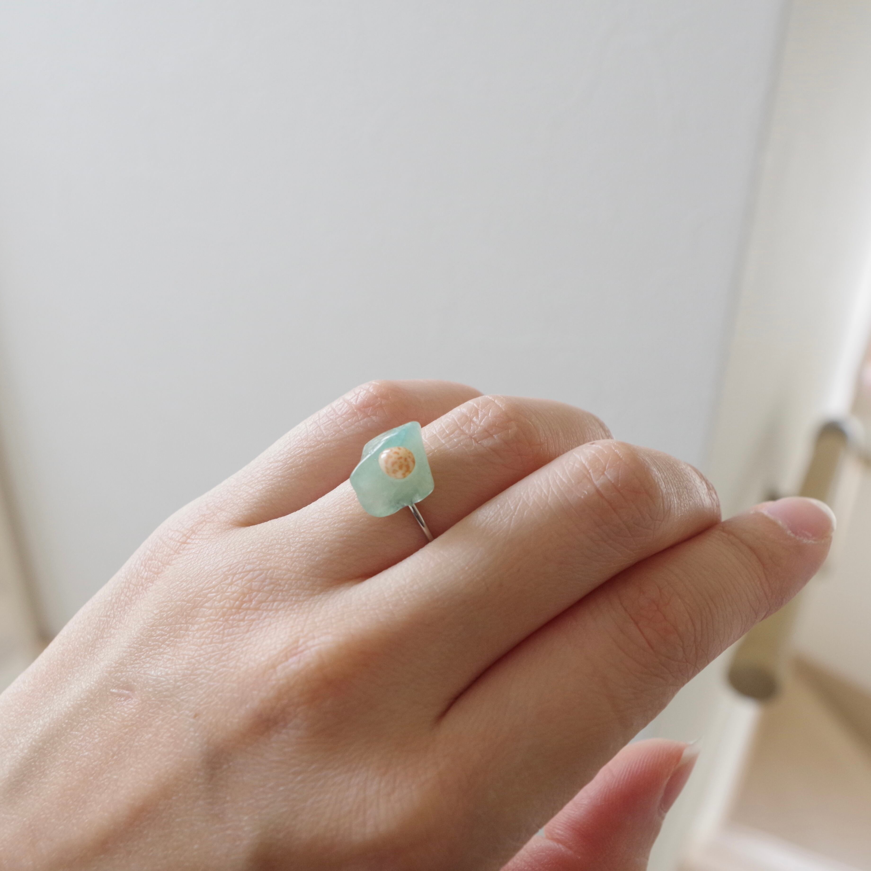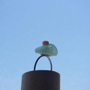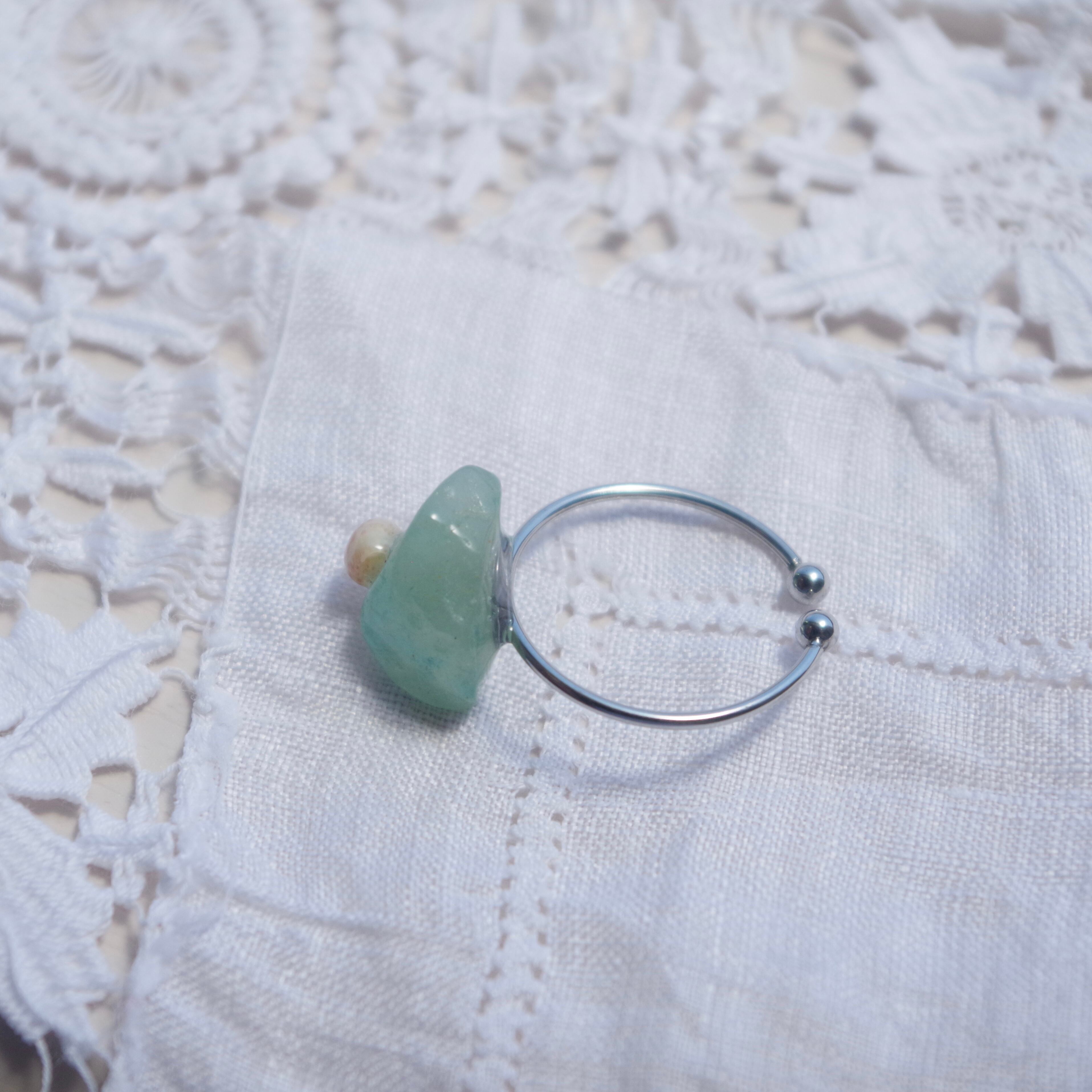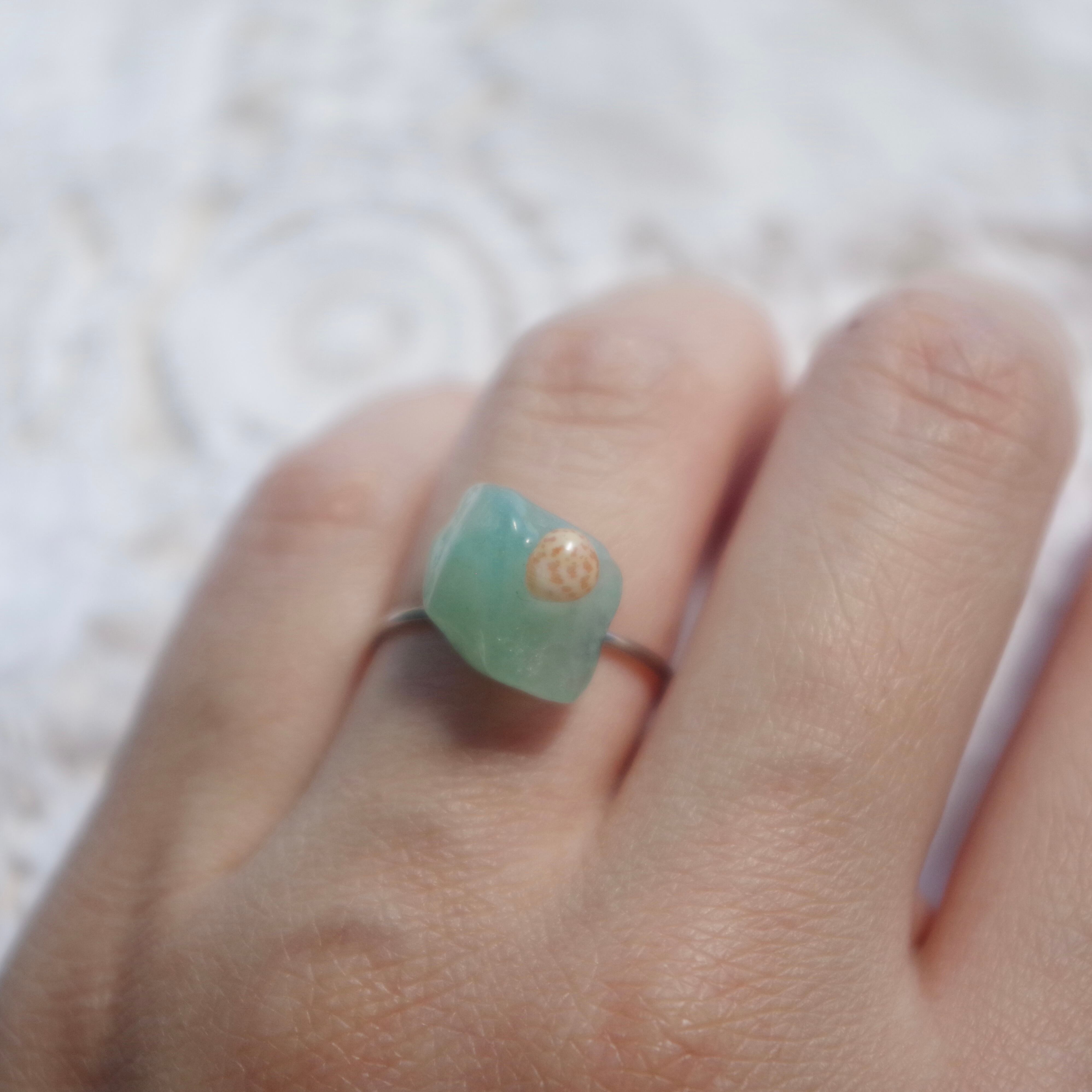 グリーンクォーツァイトに沖縄から仕入れた貝殻をあしらった海OKリングです。海辺を思わせるデザインが、日常にちょっぴり旅情をプラスします。