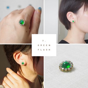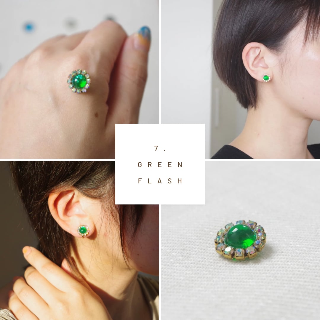 真っ赤な日出・日没時に一瞬だけ太陽が緑に見える珍しい現象。オーロラクリスタルが力強く輝き華やかです。ゴールド金具。