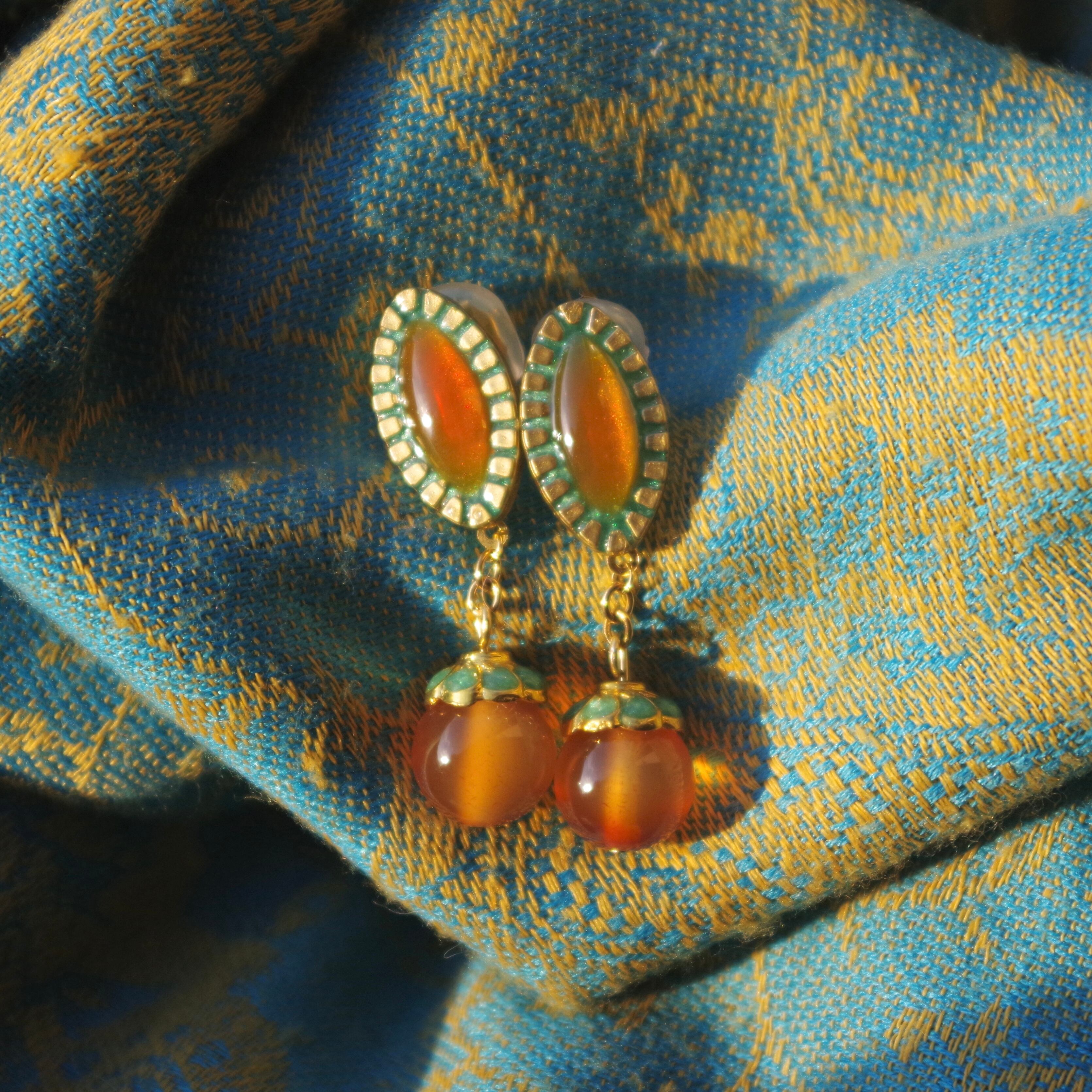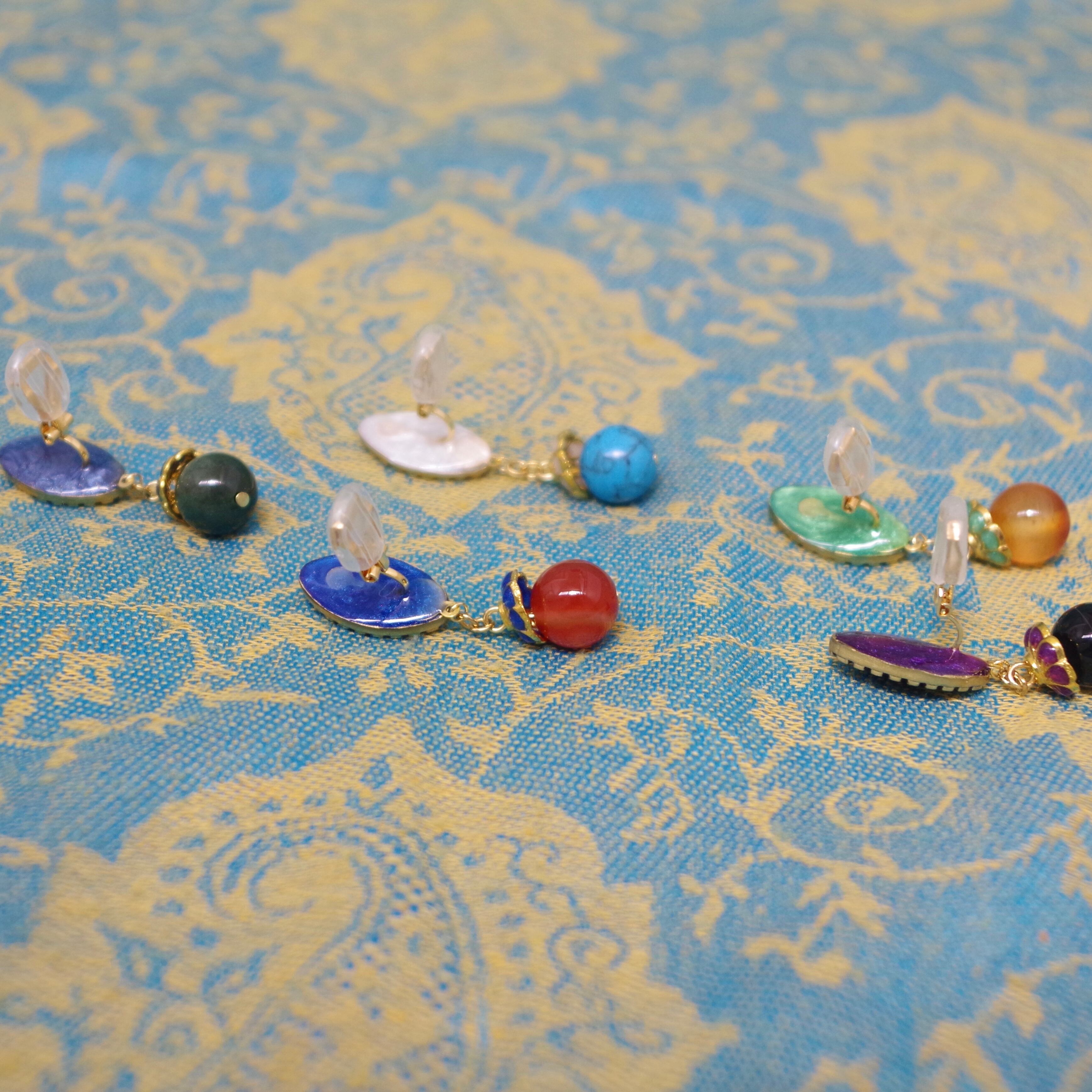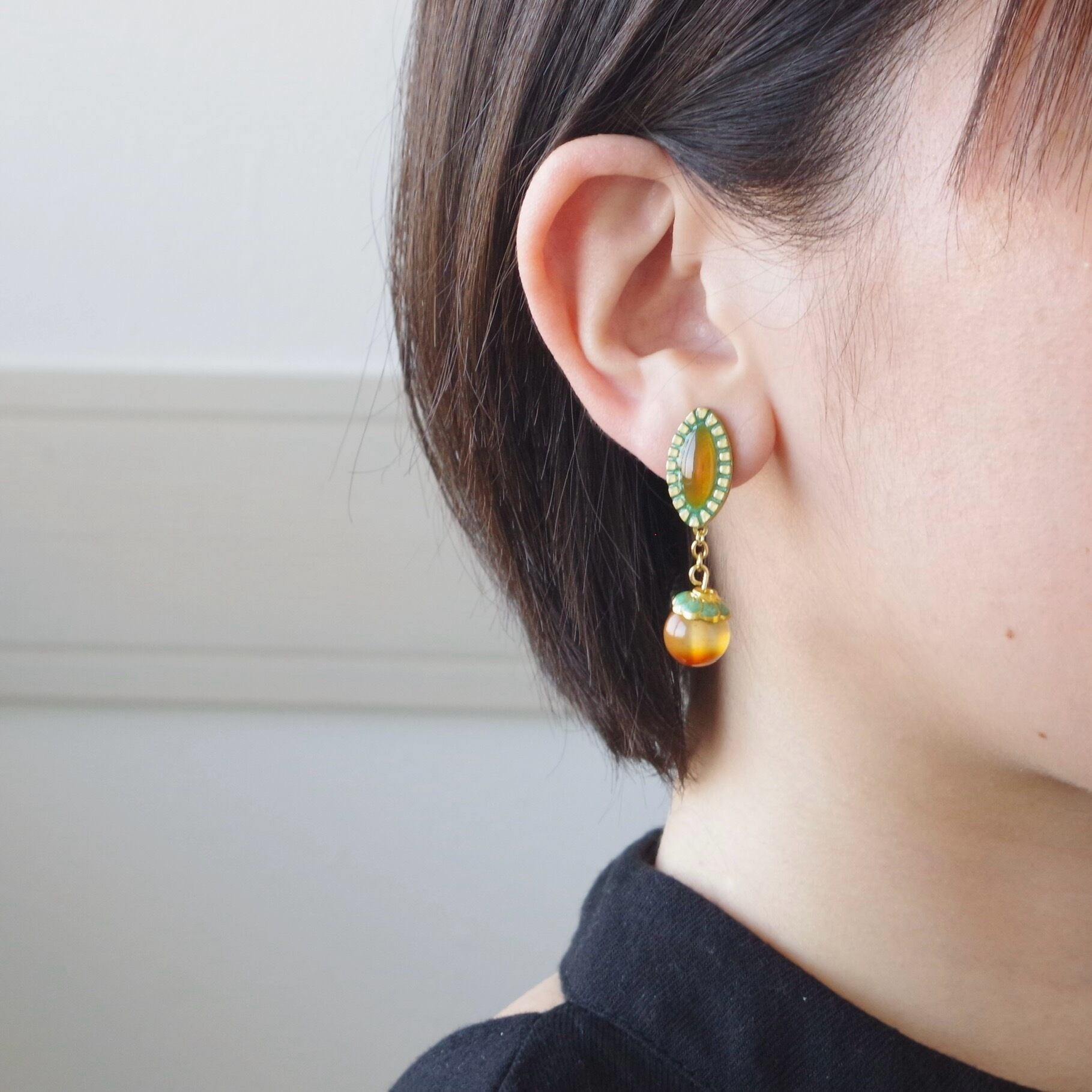 蕩ける様なオレンジはまるで夕陽の様で、爽やかなアクアグリーンは夕陽を浴びて輝く波の様です。その下に揺れるのは7月の誕生石カーネリアン。鮮やかな色合いと繊細なデザインが、日常にリゾート気分をプラスしてくれることでしょう。