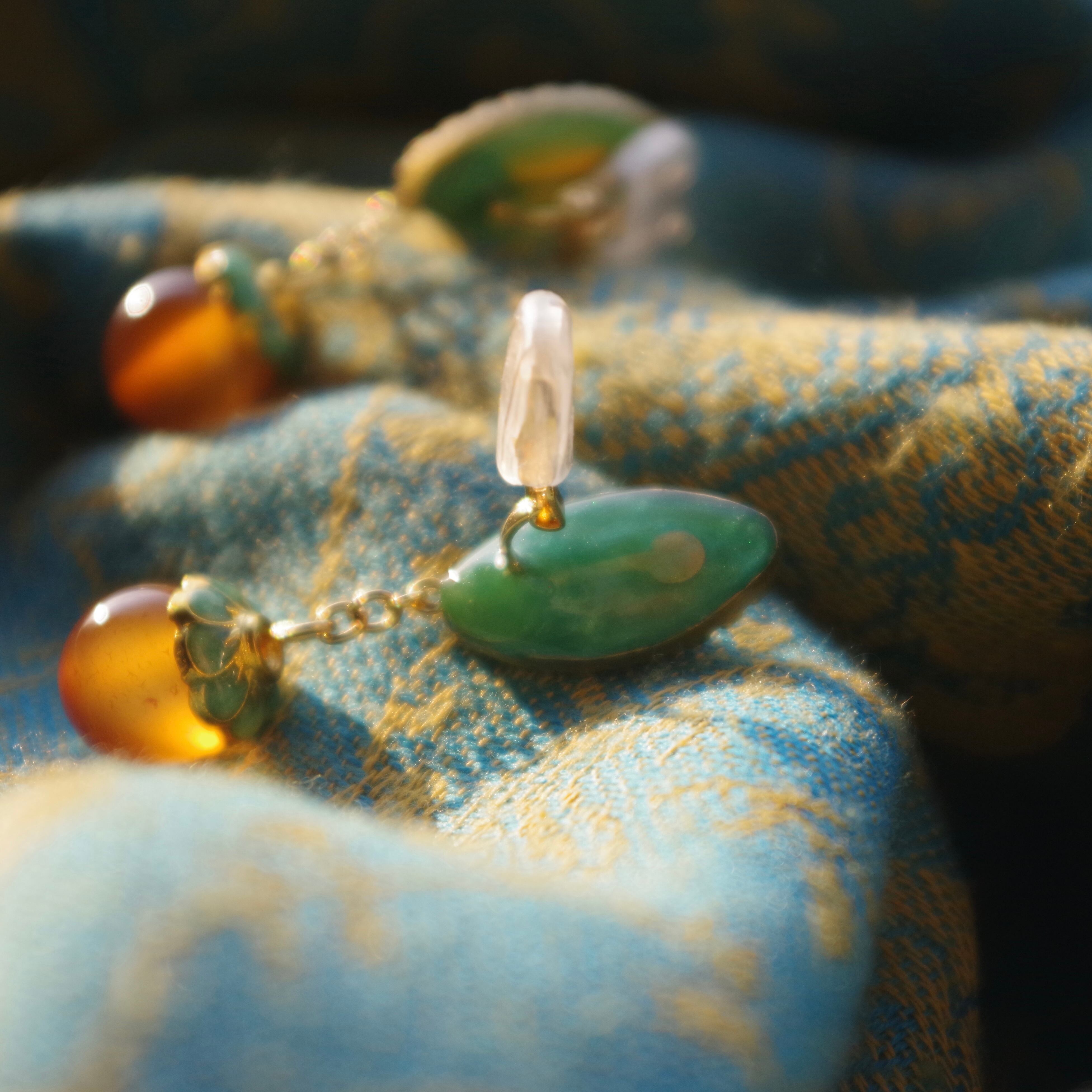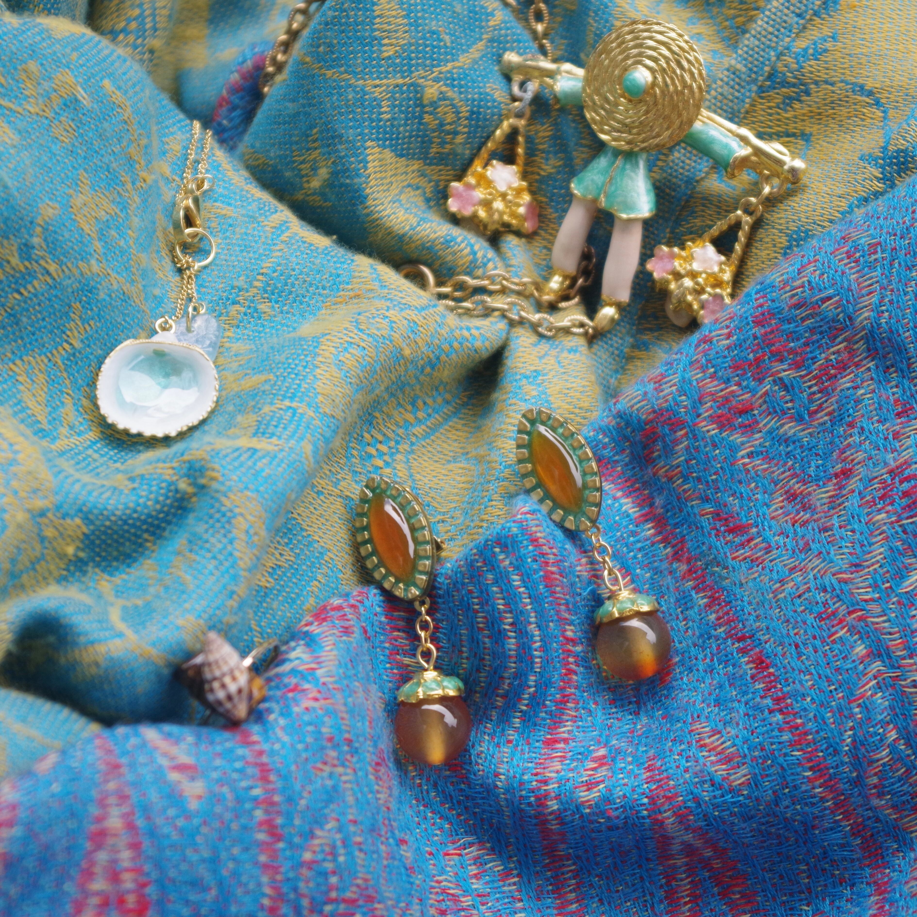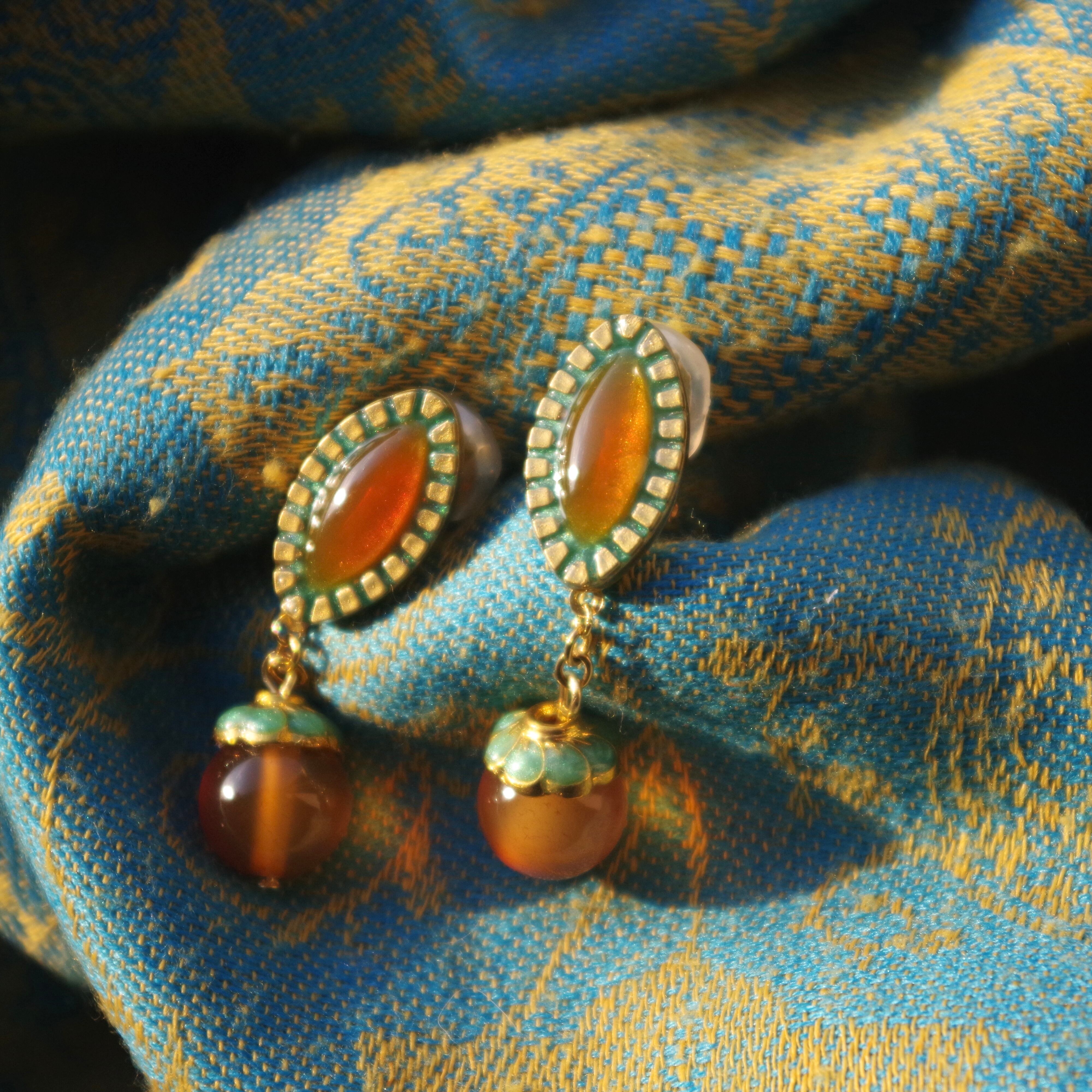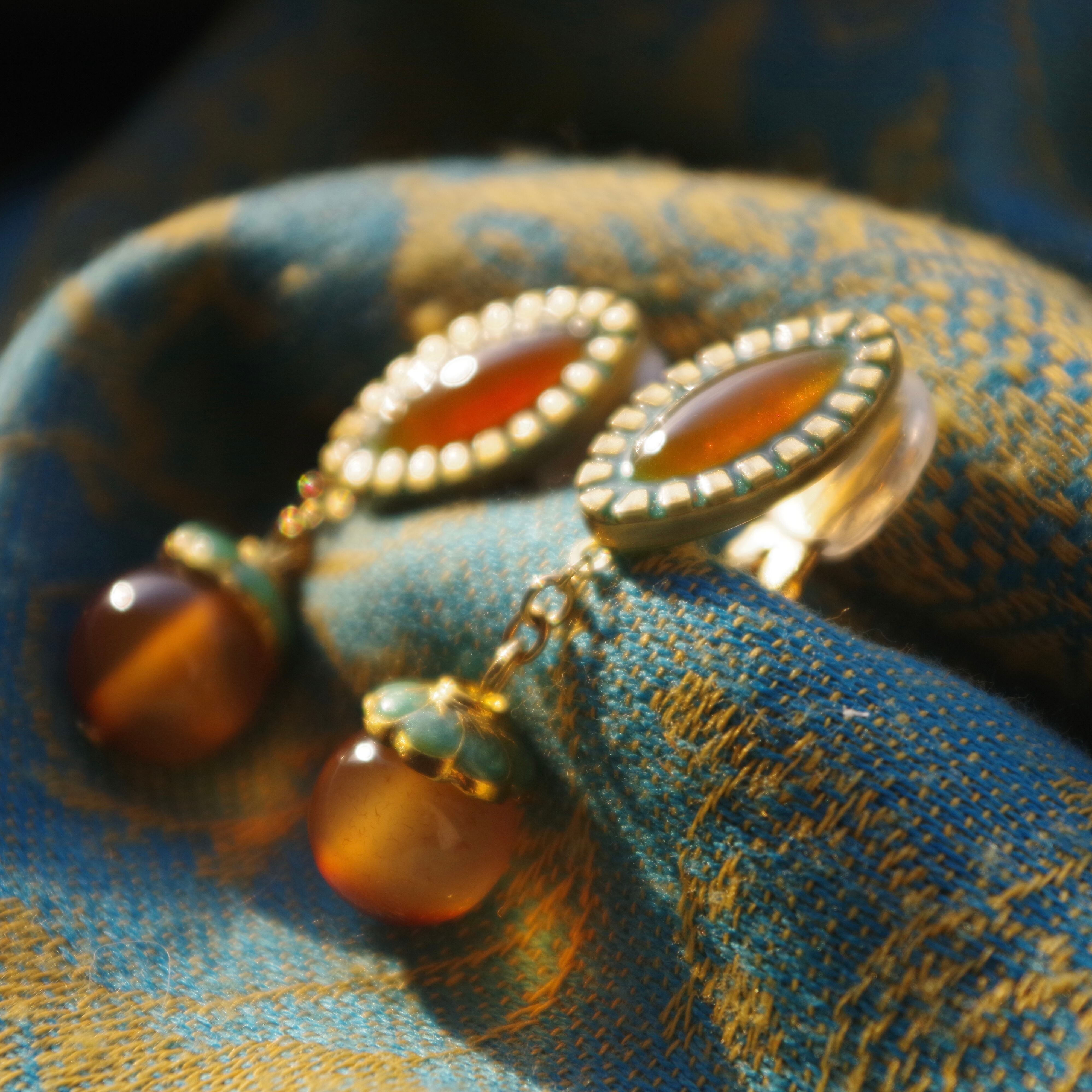 蕩ける様なオレンジはまるで夕陽の様で、爽やかなアクアグリーンは夕陽を浴びて輝く波の様です。その下に揺れるのは7月の誕生石カーネリアン。鮮やかな色合いと繊細なデザインが、日常にリゾート気分をプラスしてくれることでしょう。