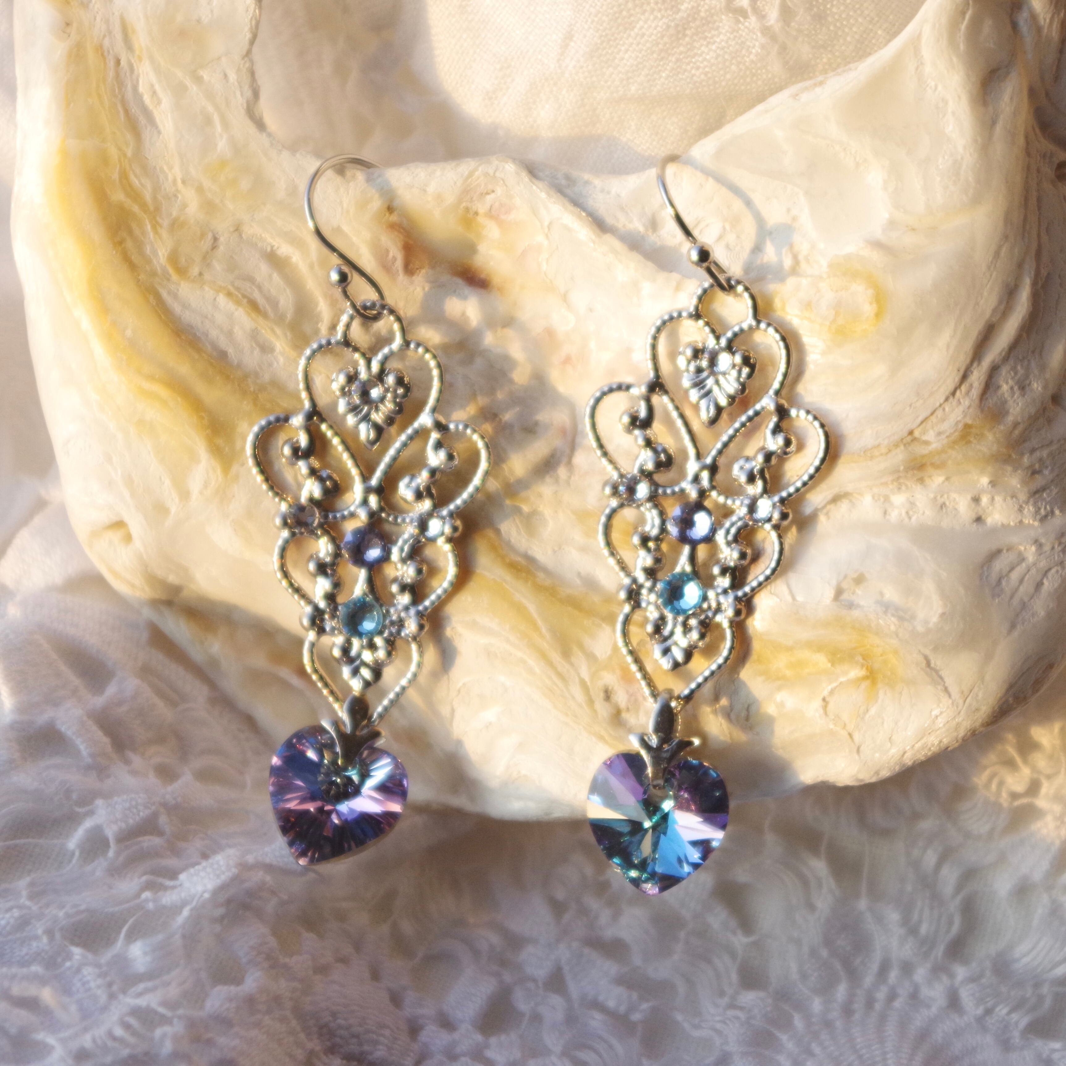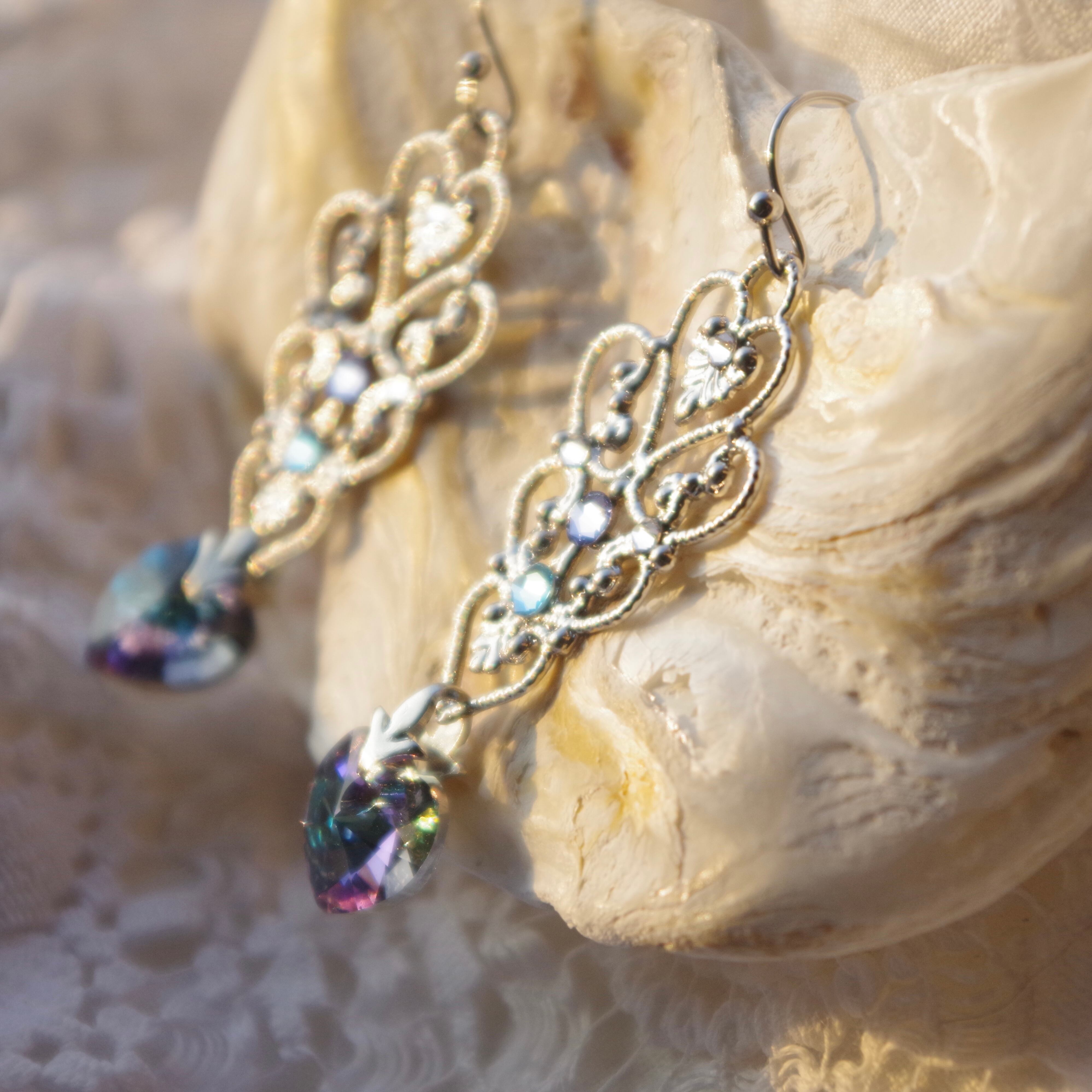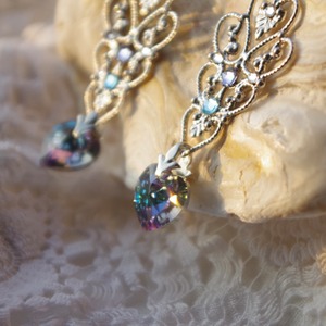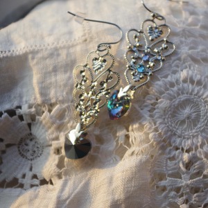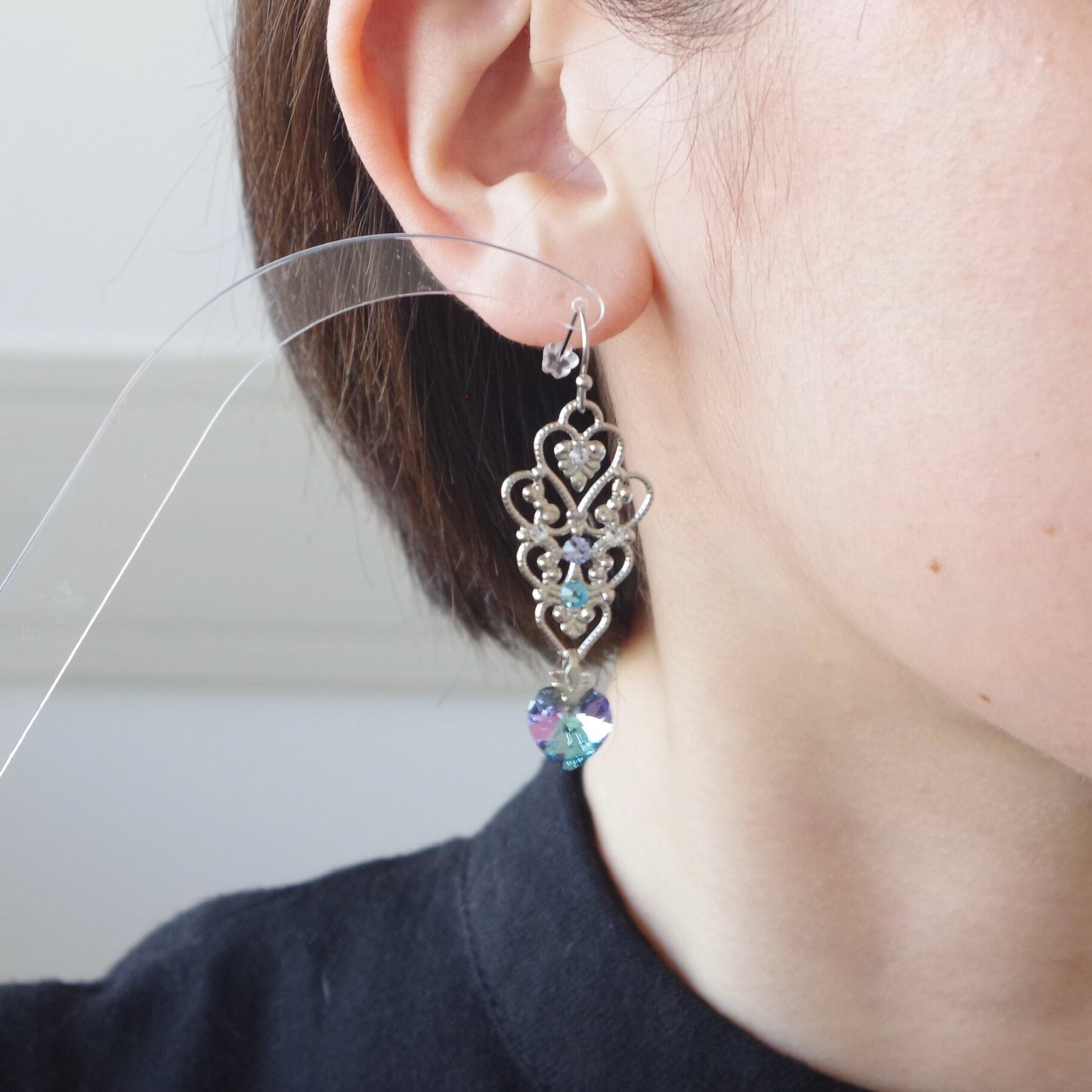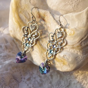 ハートのクリスタルは耳元で揺れる度にきらきら輝き存在感を醸しつつ、デコラティブなバチカンとフィリグリーの装飾が上品さを演出してくれるので、大人の女性のための甘過ぎないハートイヤリングとなっています。
