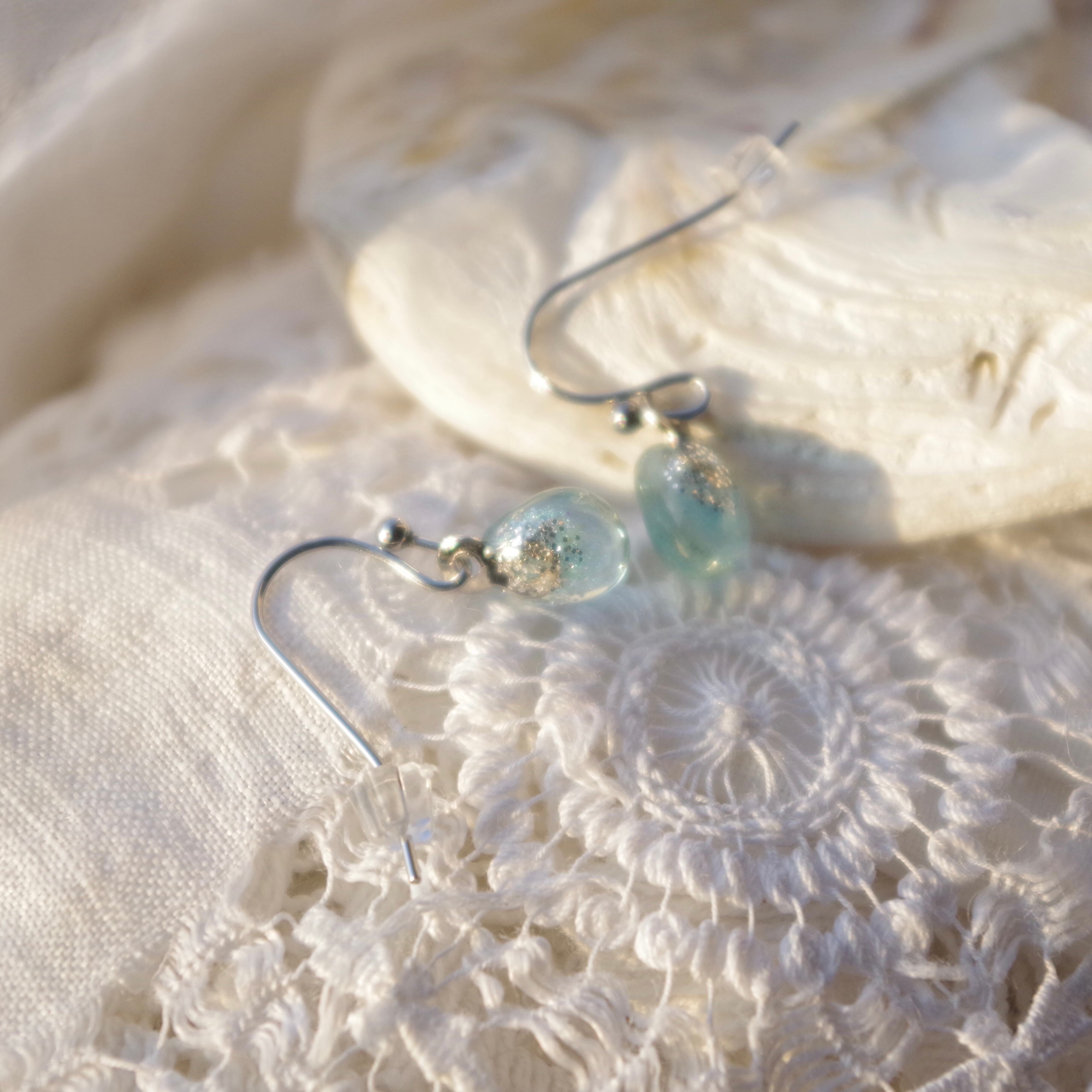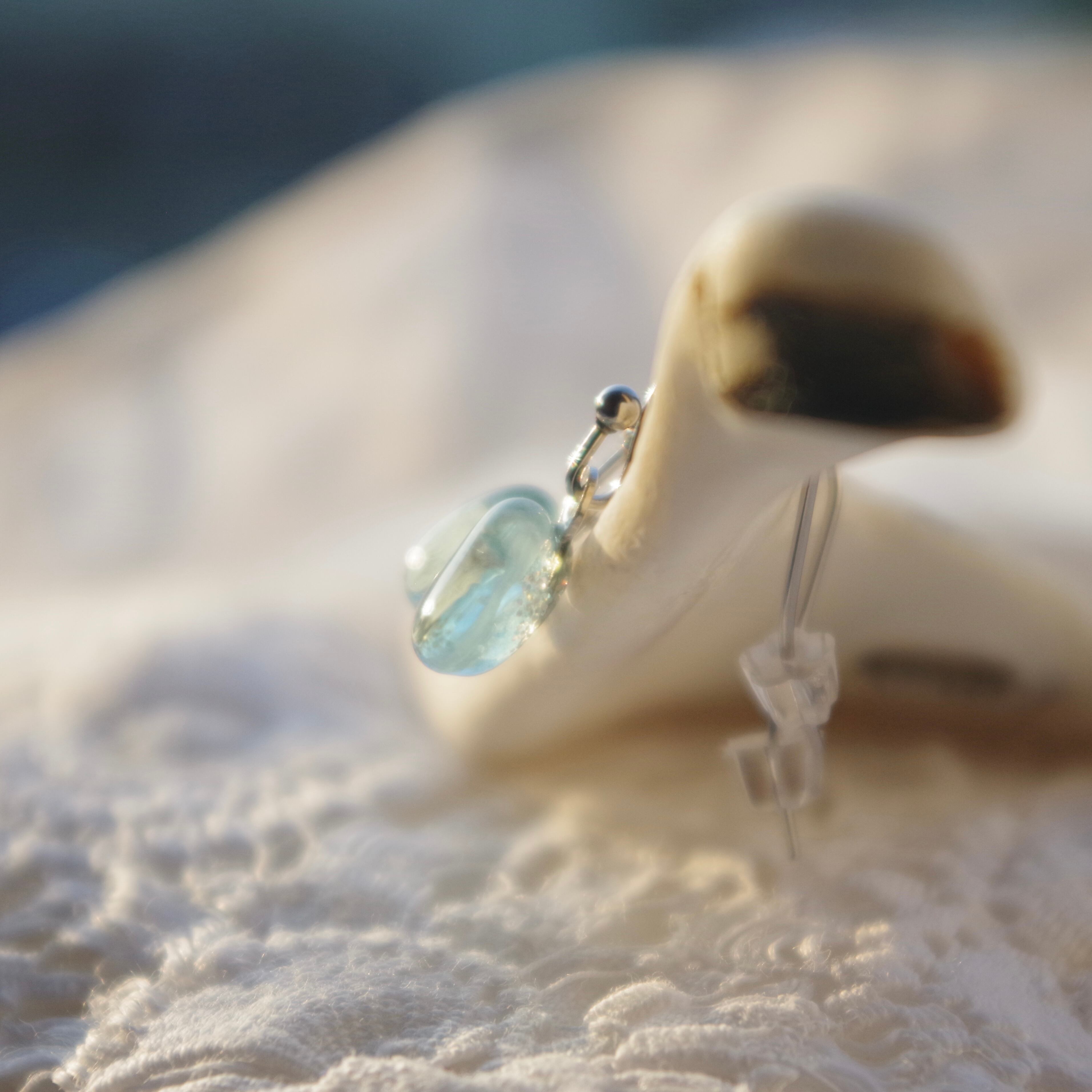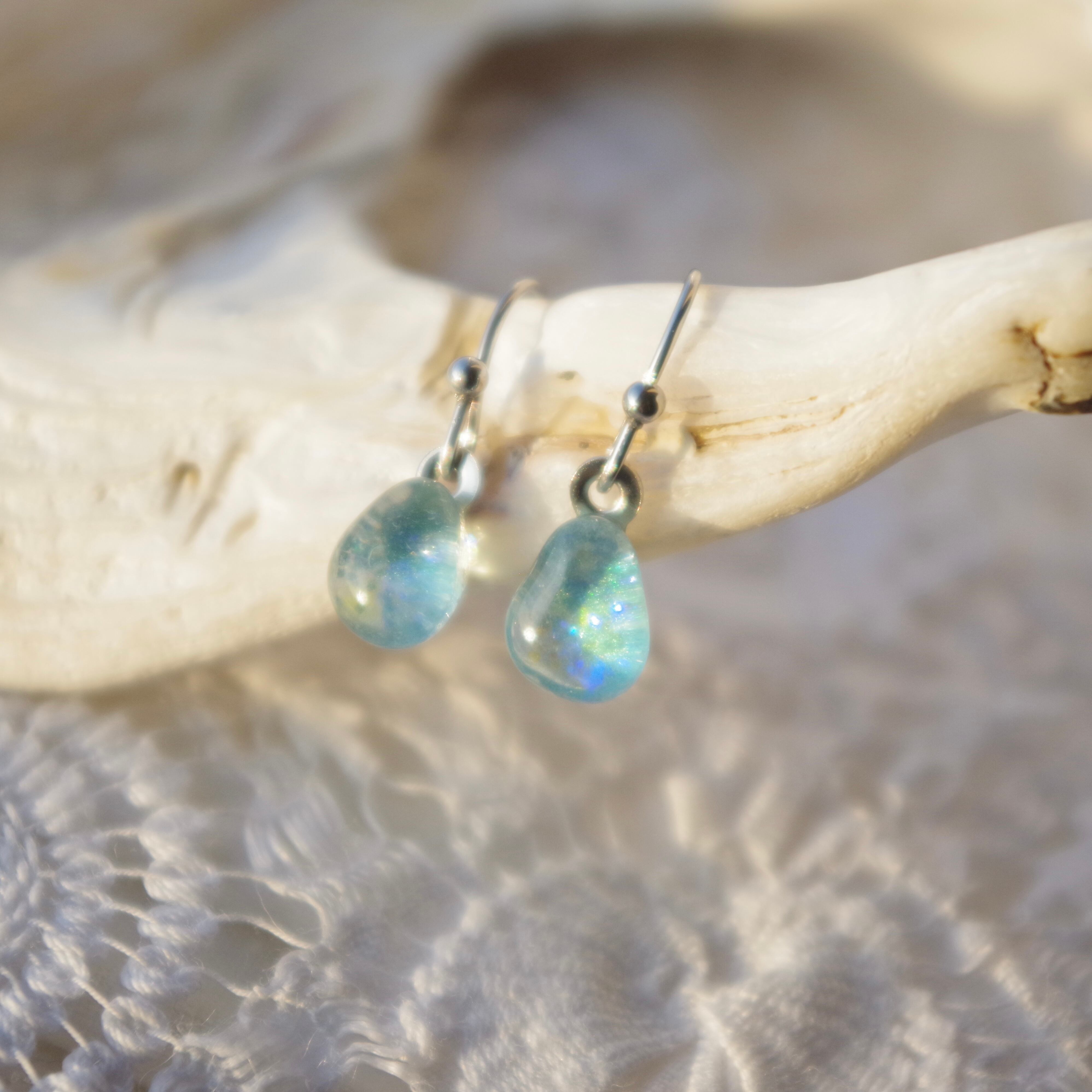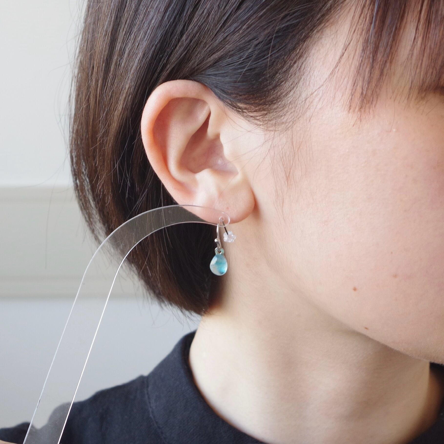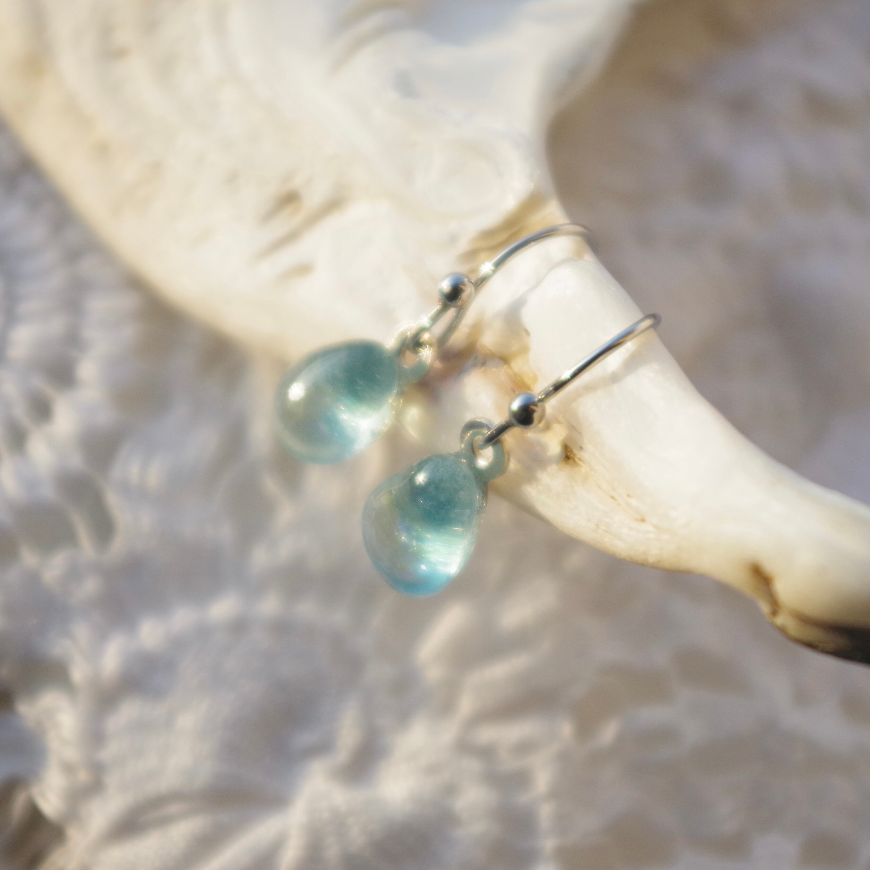 海辺で拾ったシーグラスを、水滴の様なうるツヤピアスにアップサイクルしました。