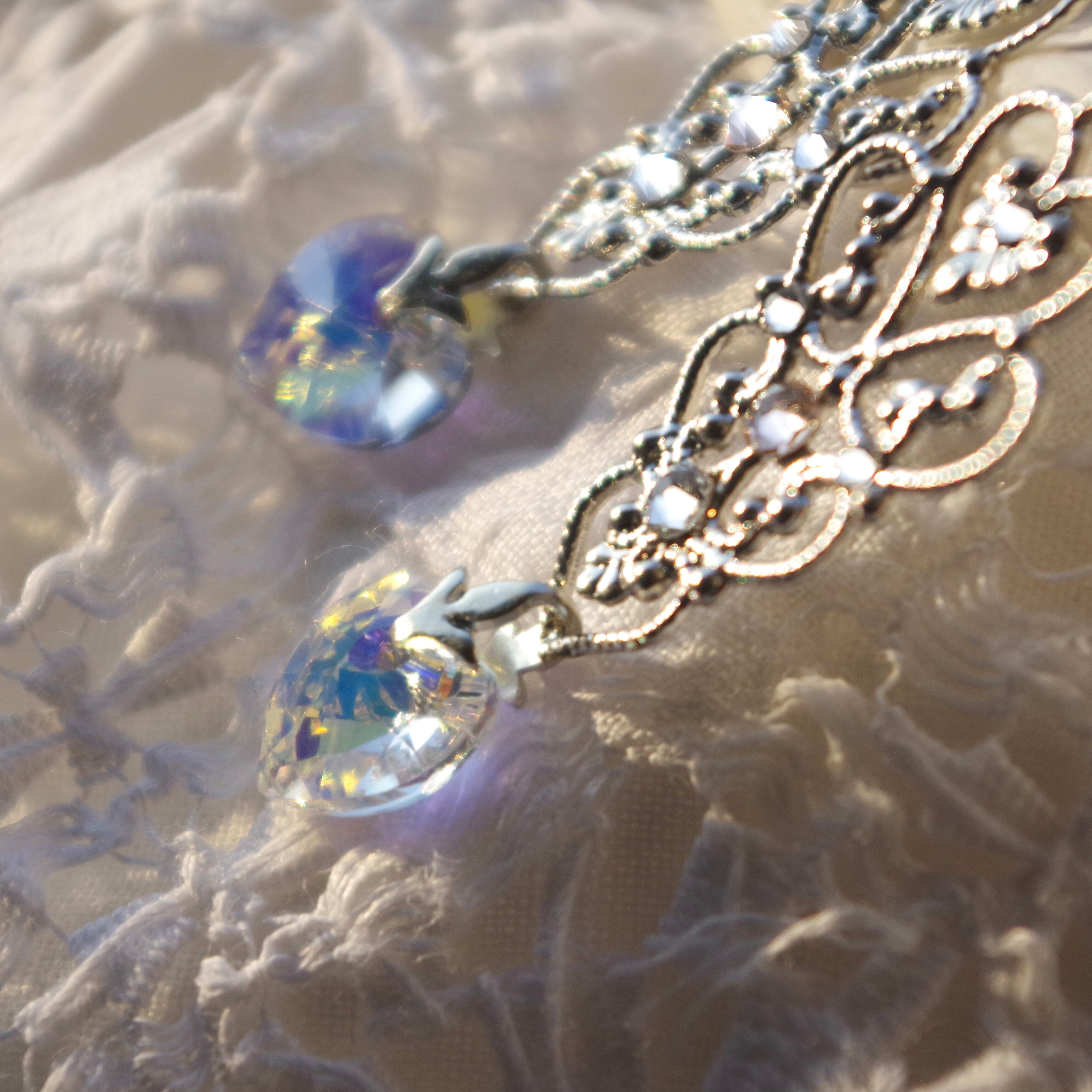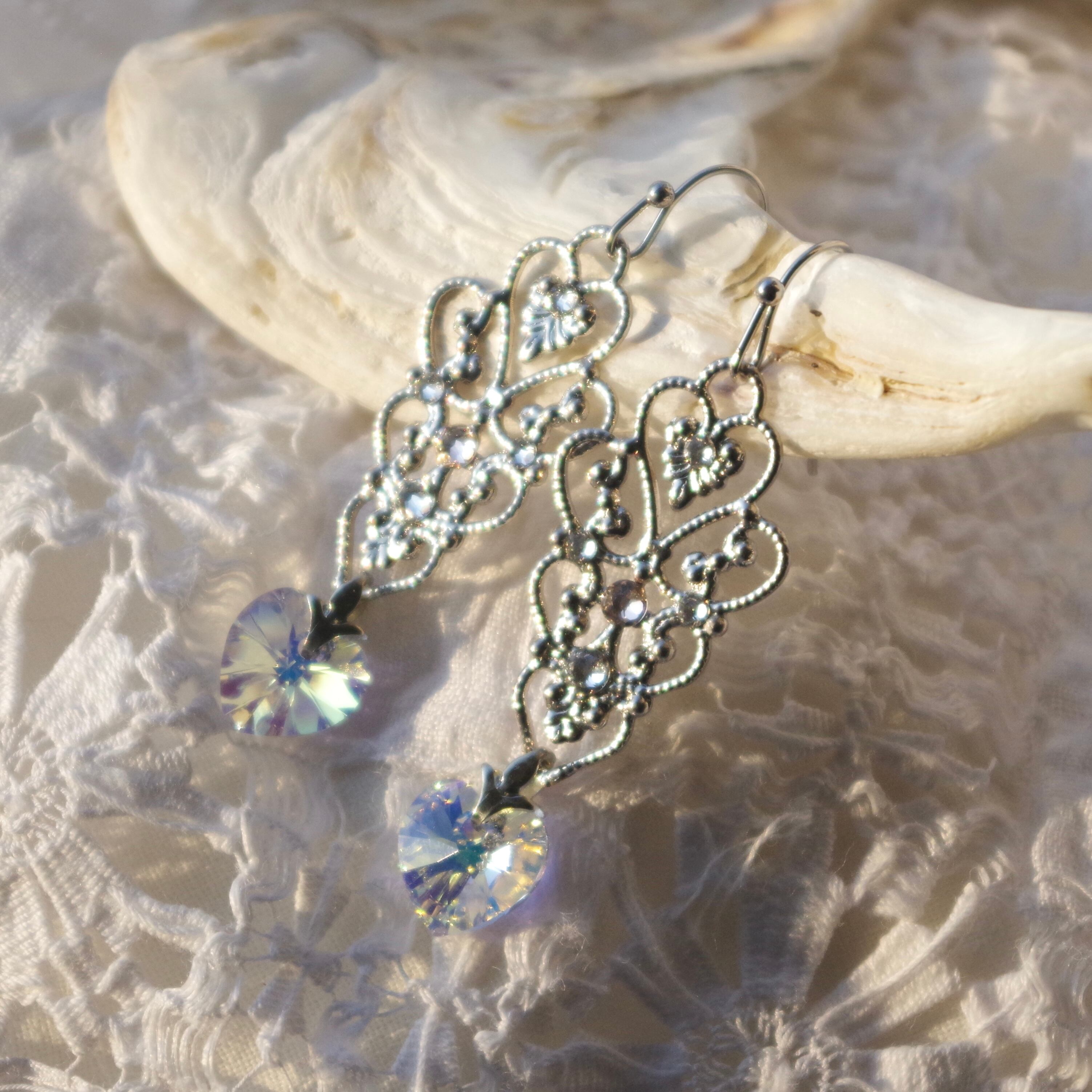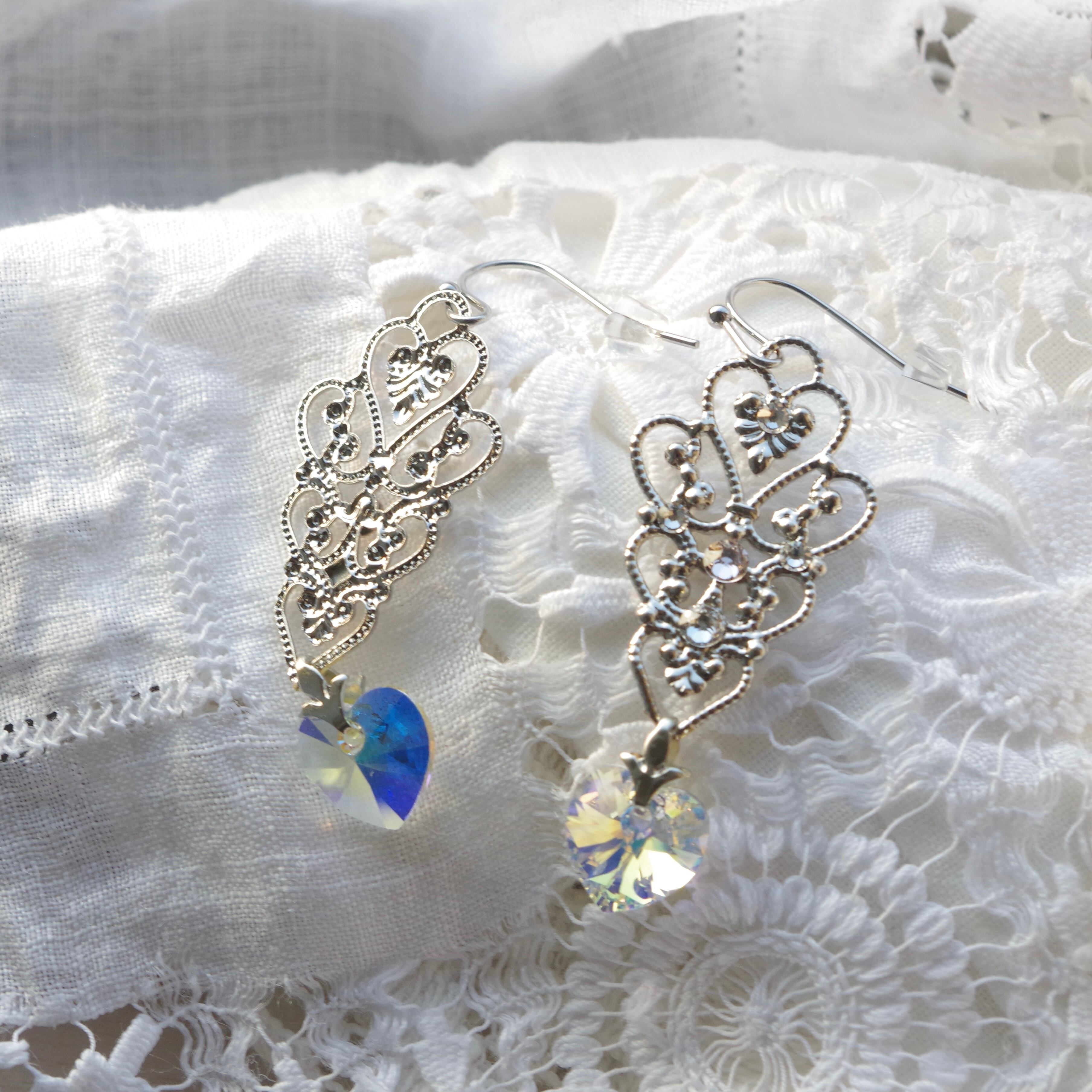 ハートのクリスタルは耳元で揺れる度にきらきら輝き存在感を醸しつつ、デコラティブなバチカンとフィリグリーの装飾が上品さを演出してくれるので、大人の女性のための甘過ぎないハートイヤリングとなっています。