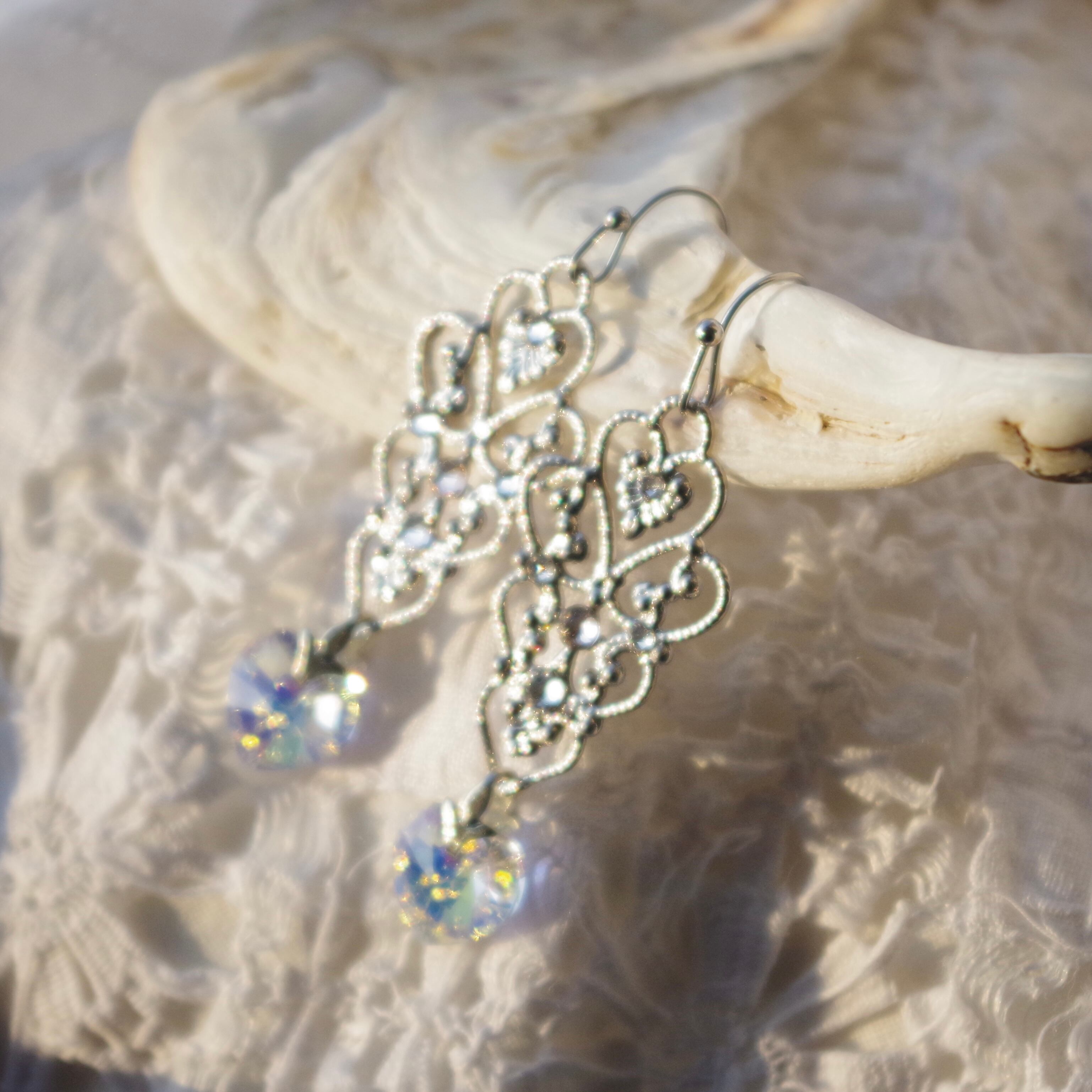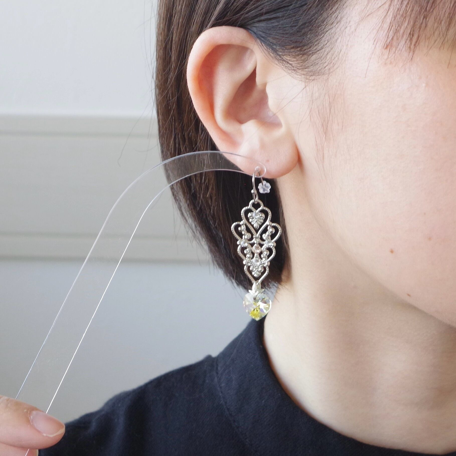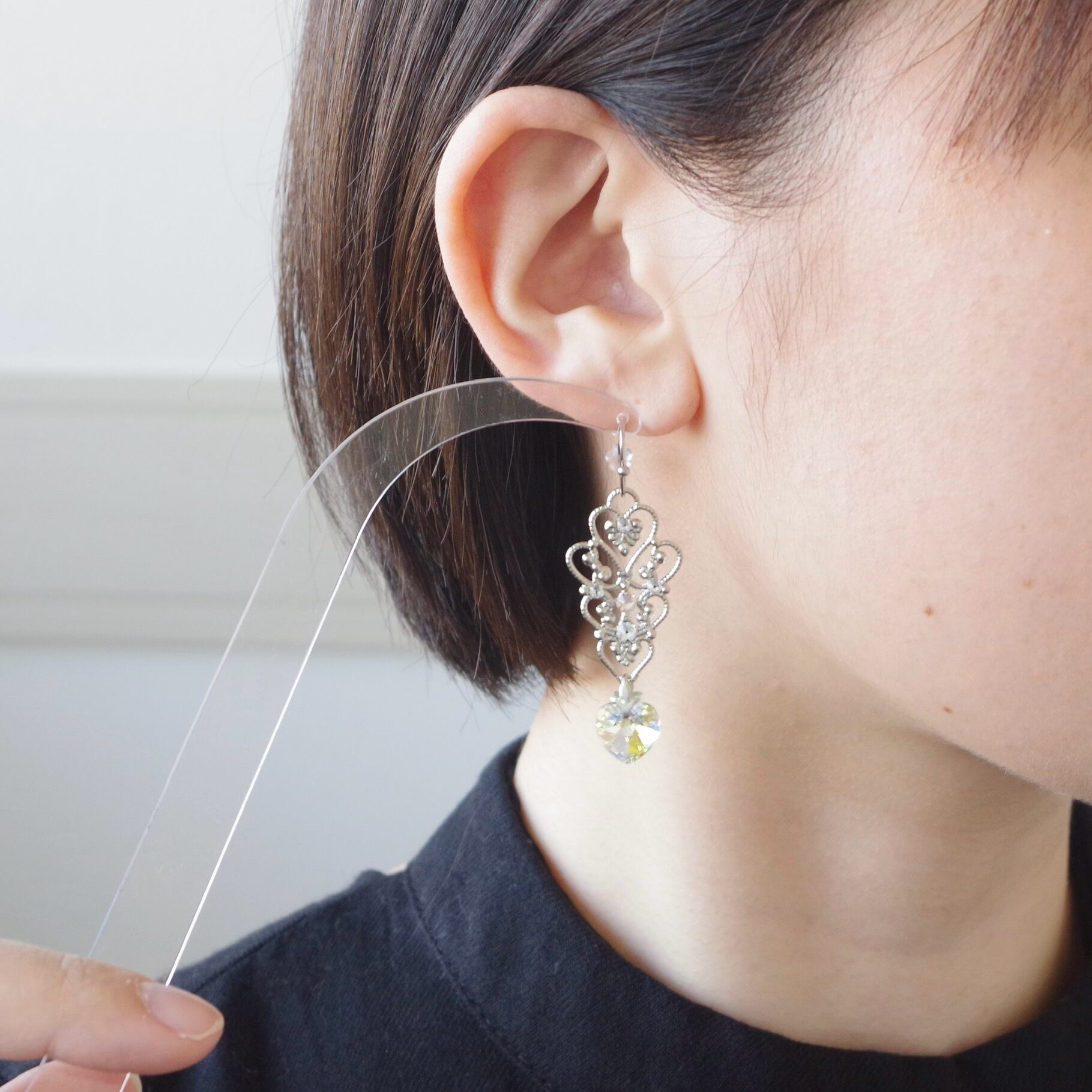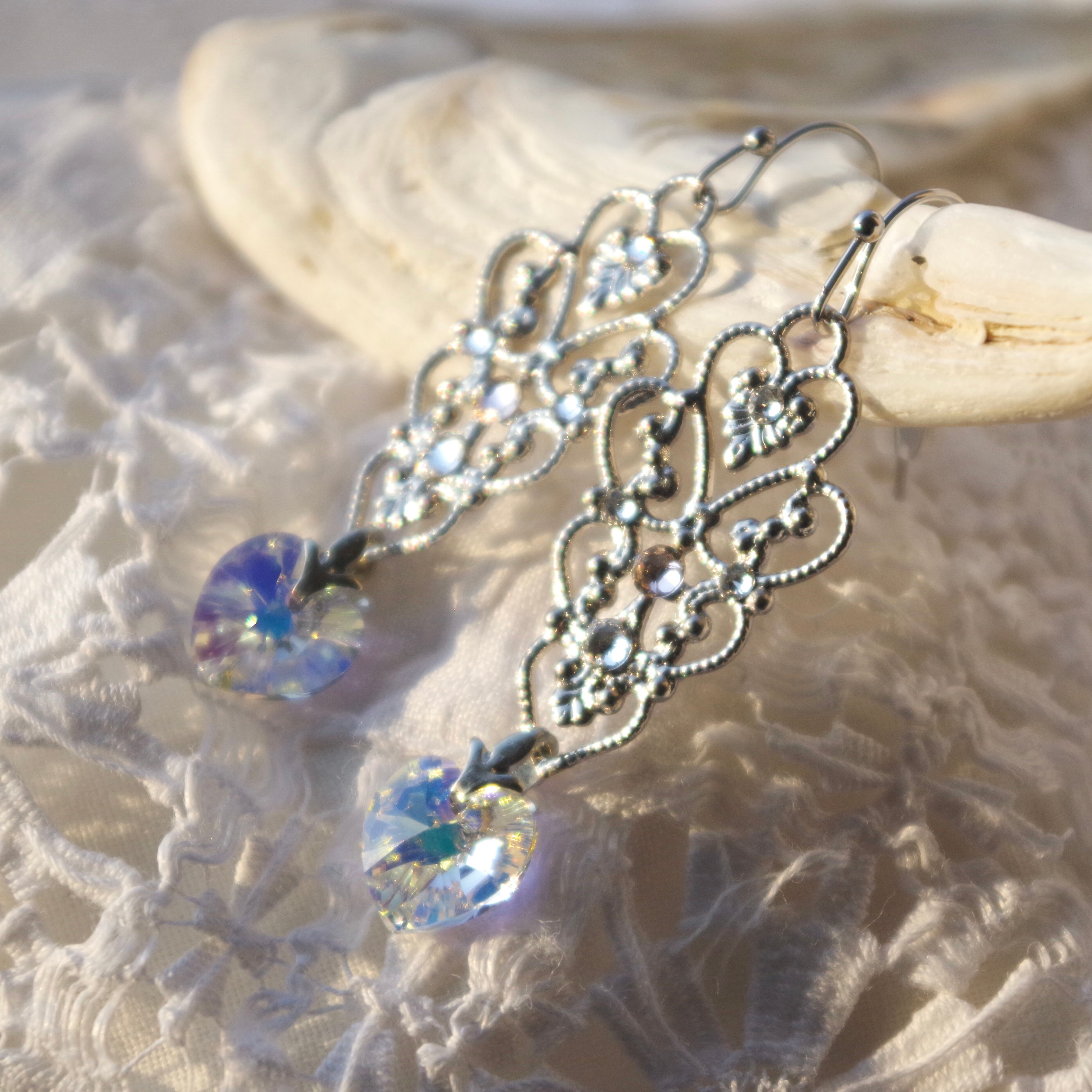 ハートのクリスタルは耳元で揺れる度にきらきら輝き存在感を醸しつつ、デコラティブなバチカンとフィリグリーの装飾が上品さを演出してくれるので、大人の女性のための甘過ぎないハートイヤリングとなっています。