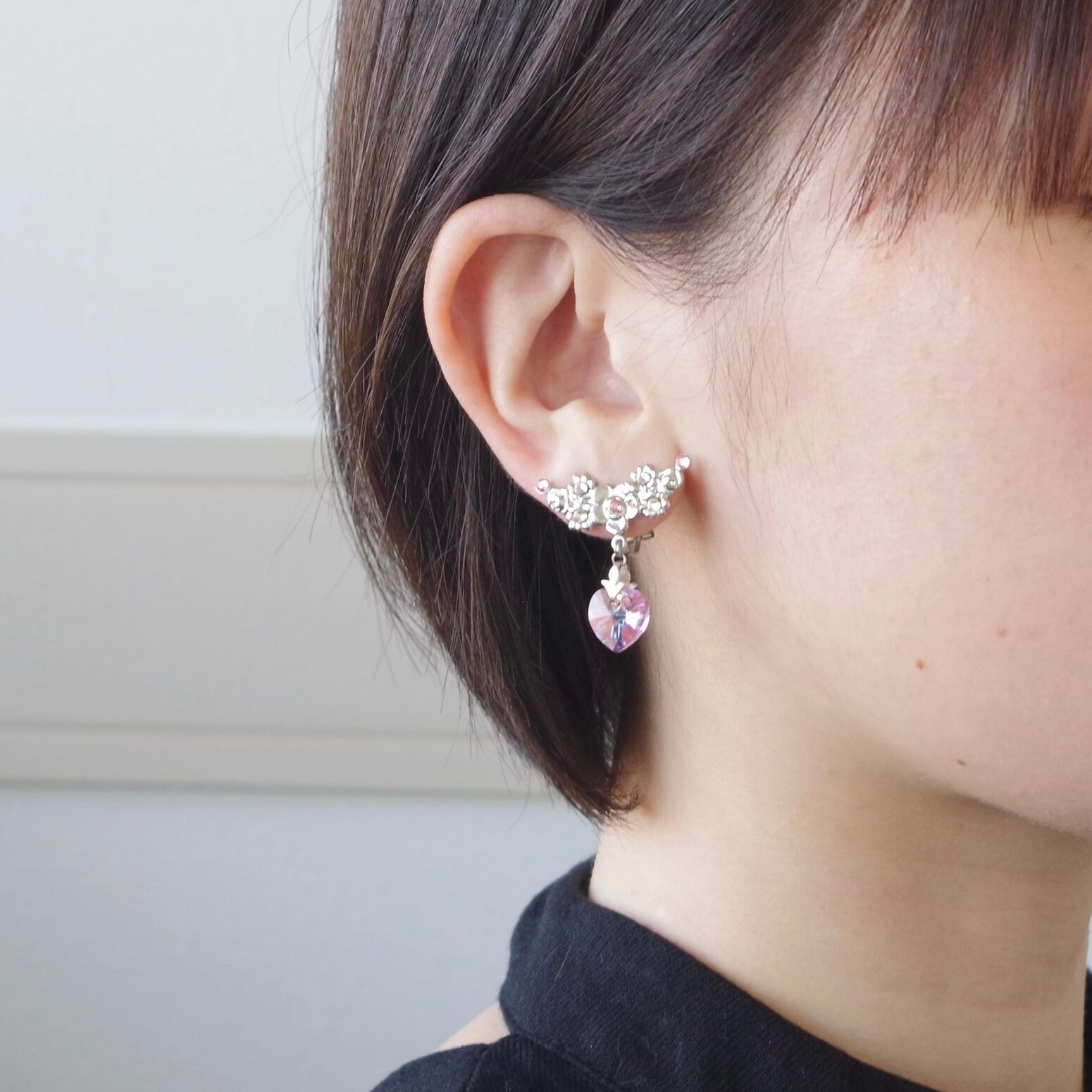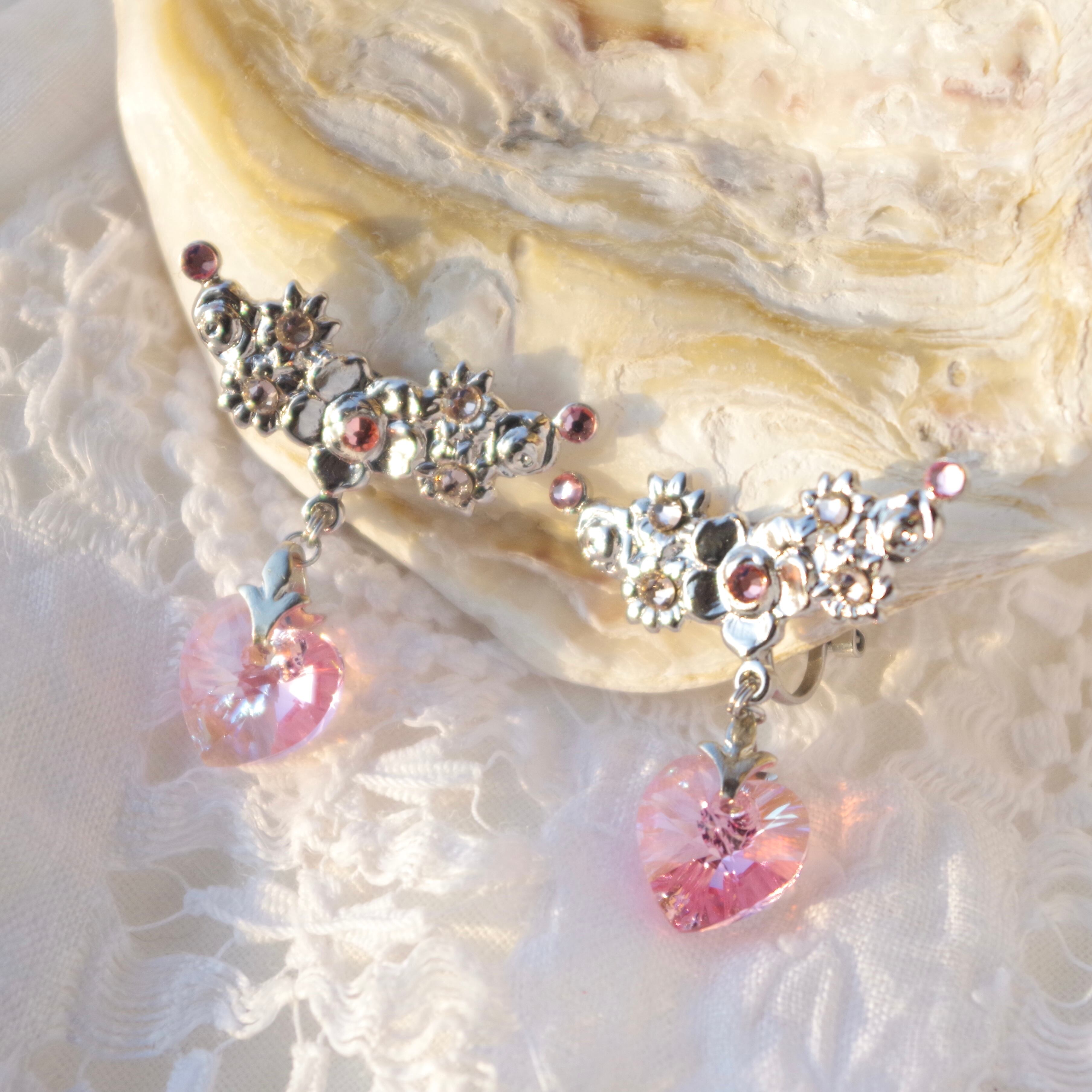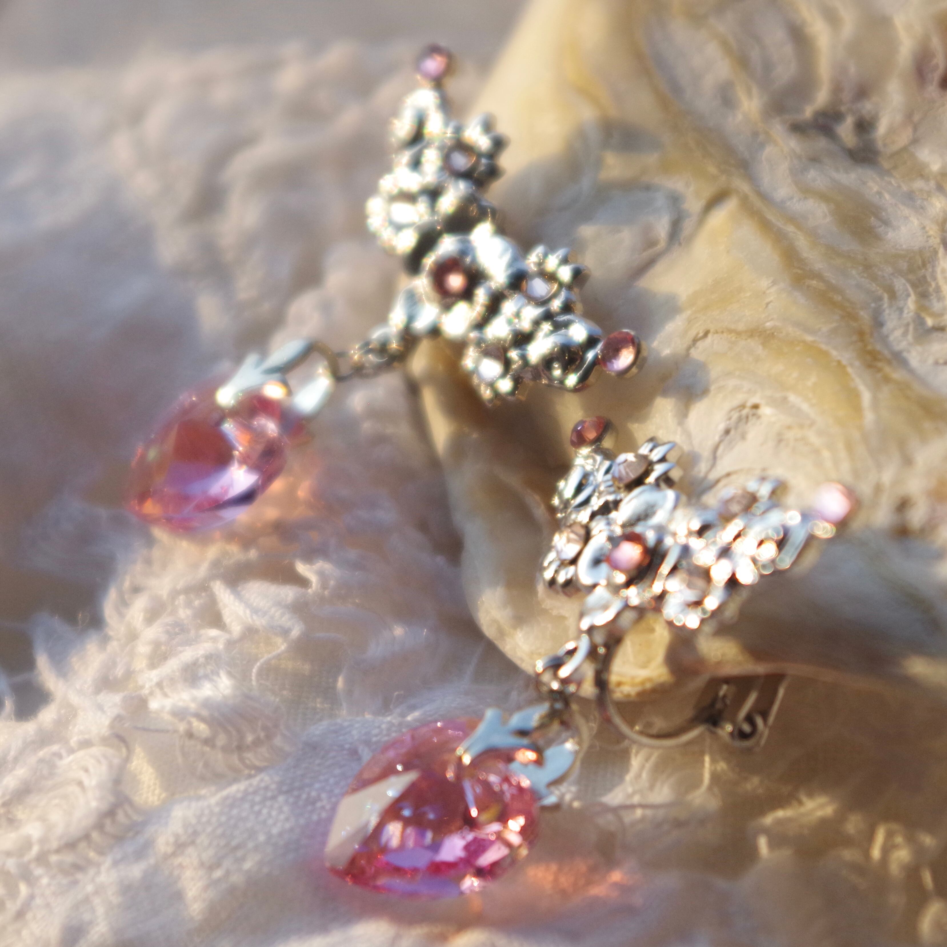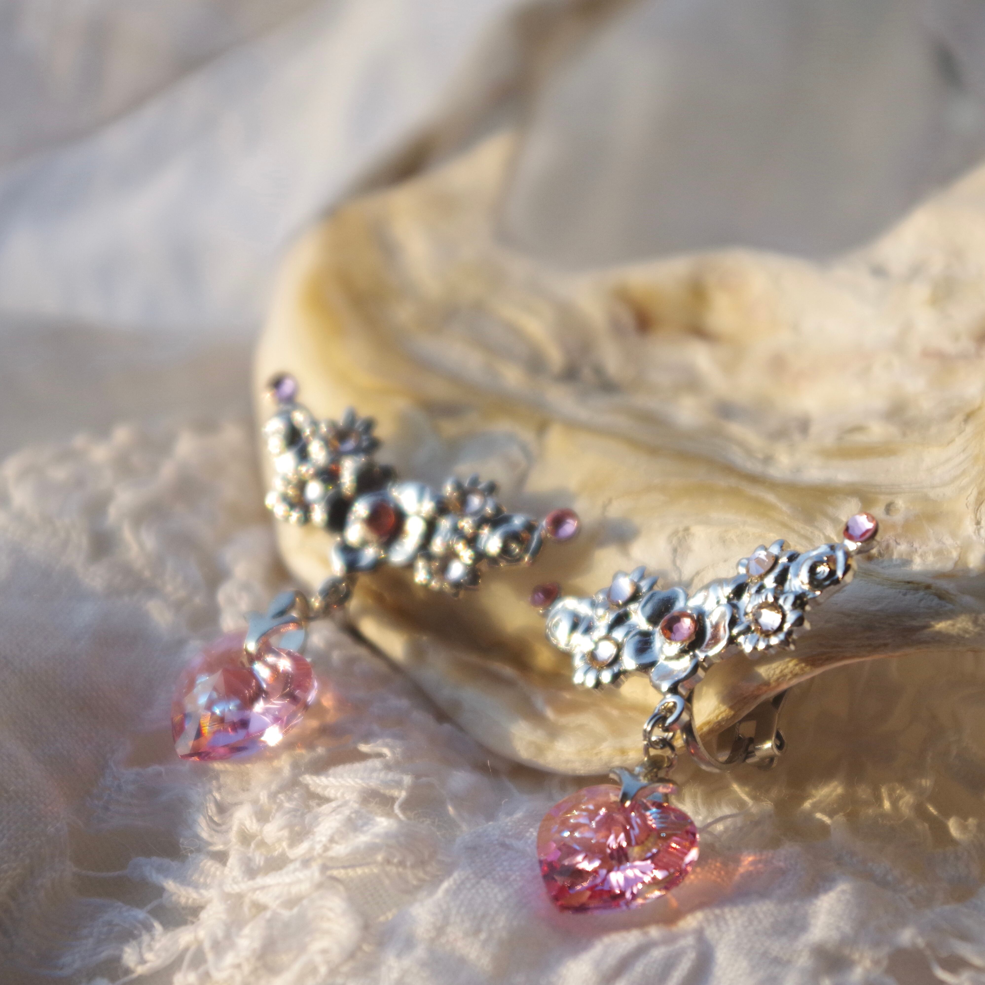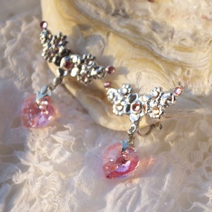 表面にオーロラフィルを纏ったハートのクリスタルは、耳元で揺れる度にきらきら輝き存在感を醸しつつ、デコラティブなバチカンと金具の装飾が上品さを演出してくれるので、大人の女性のための甘過ぎないハートイヤリングとなっています。