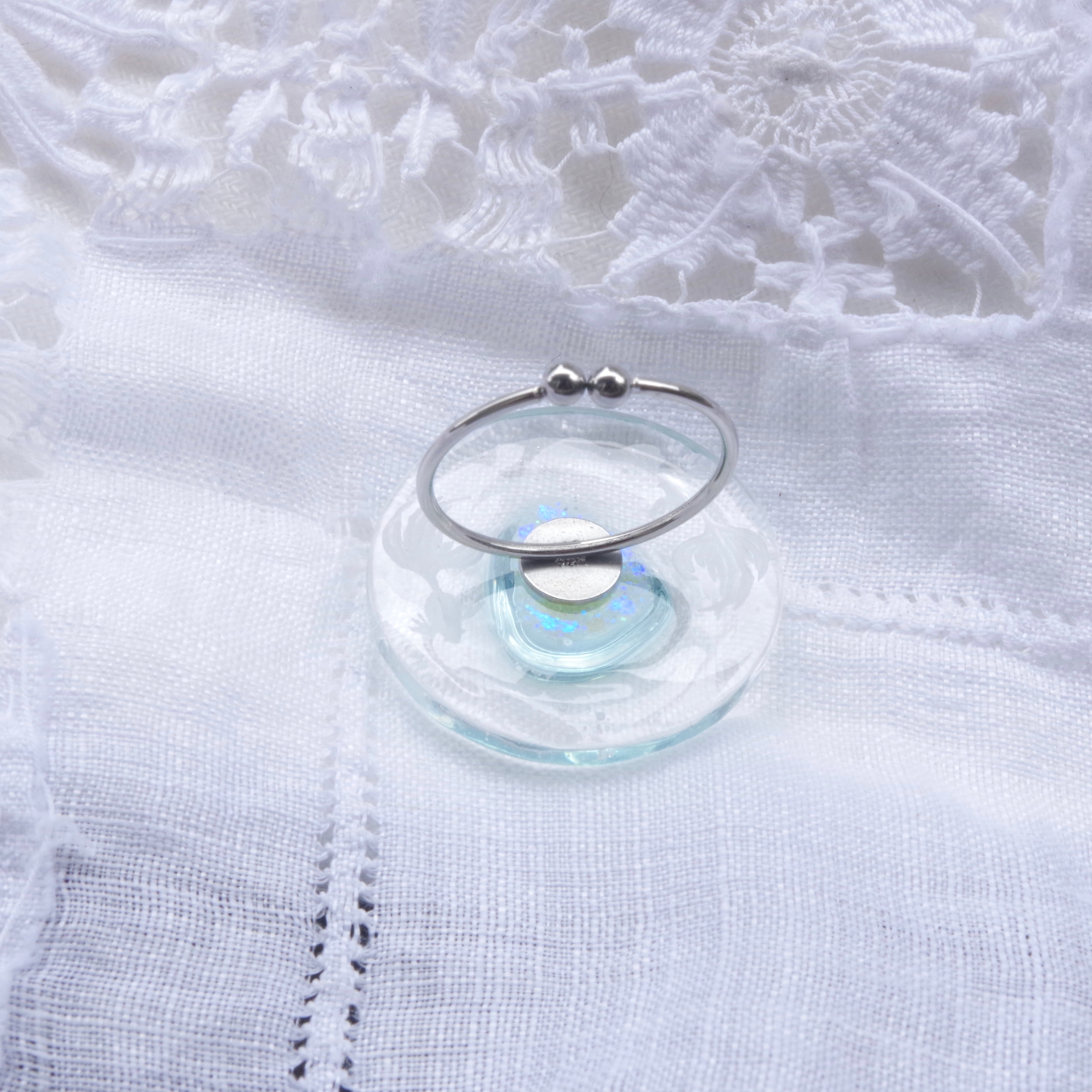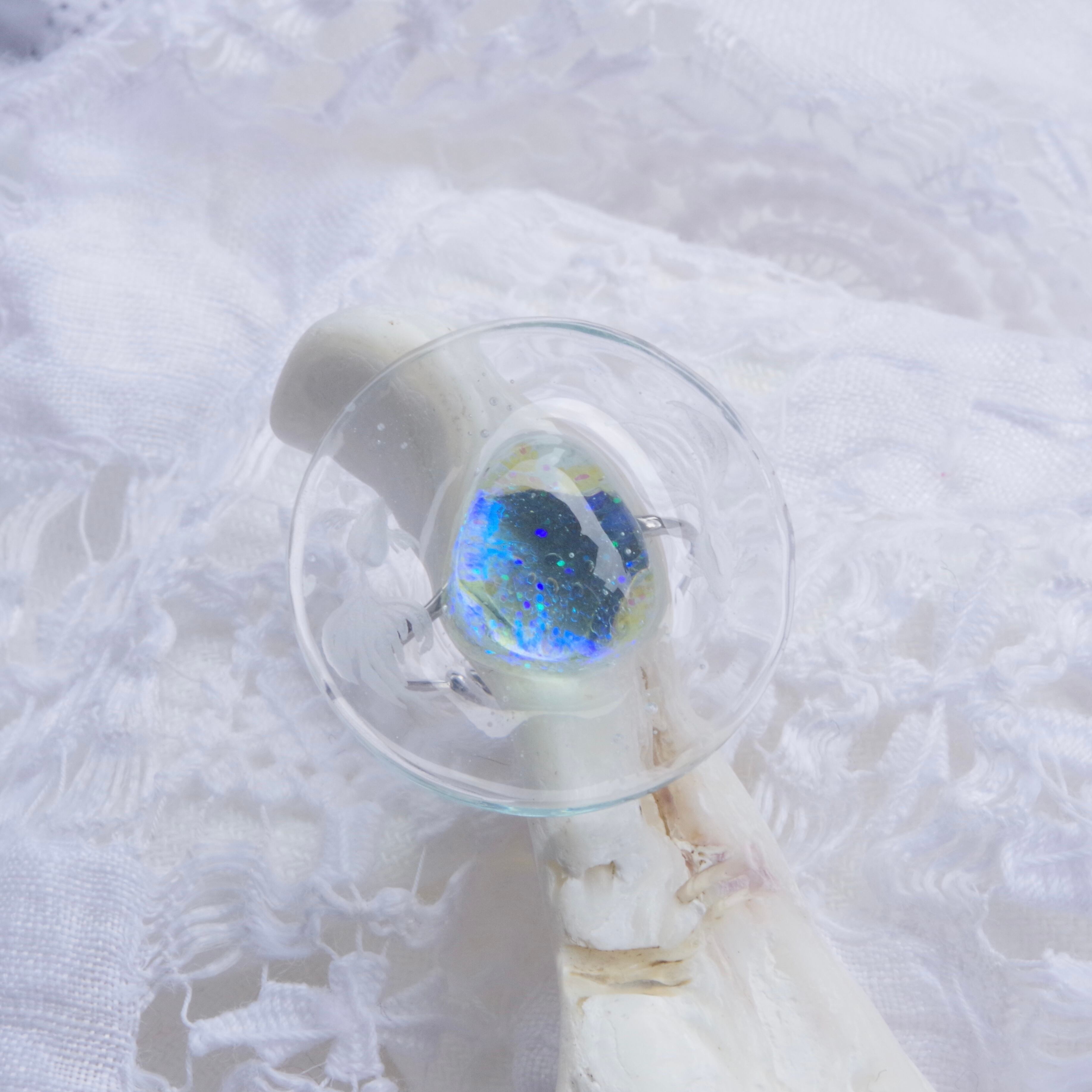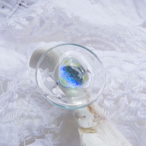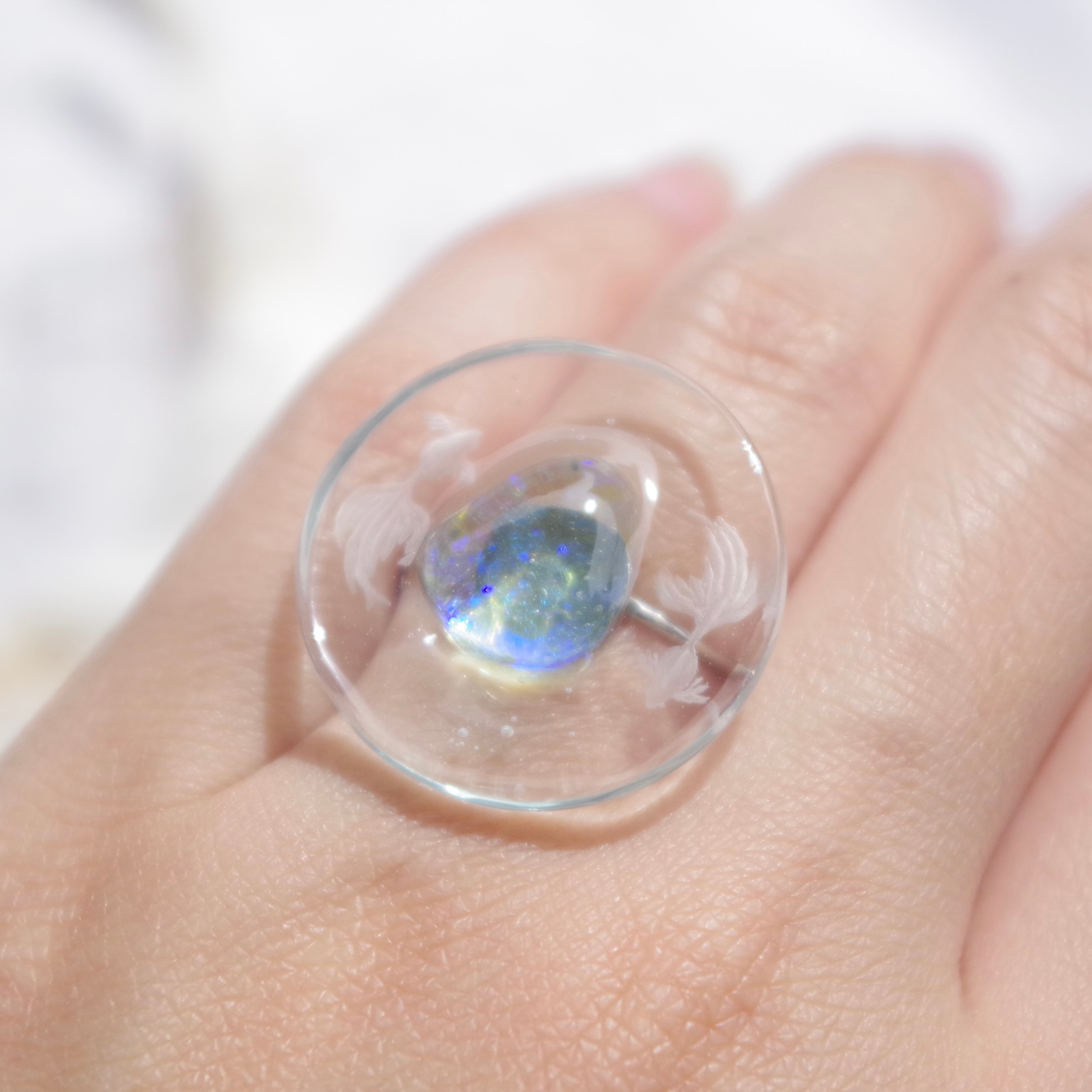 窯で焼いたシーグラスを使用し、金魚の彫刻を施したクリアリングは、まるで夢の中で海辺の潮だまりを覗いているような不思議な錯覚を与えます。