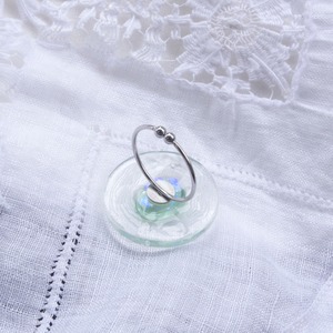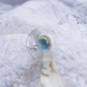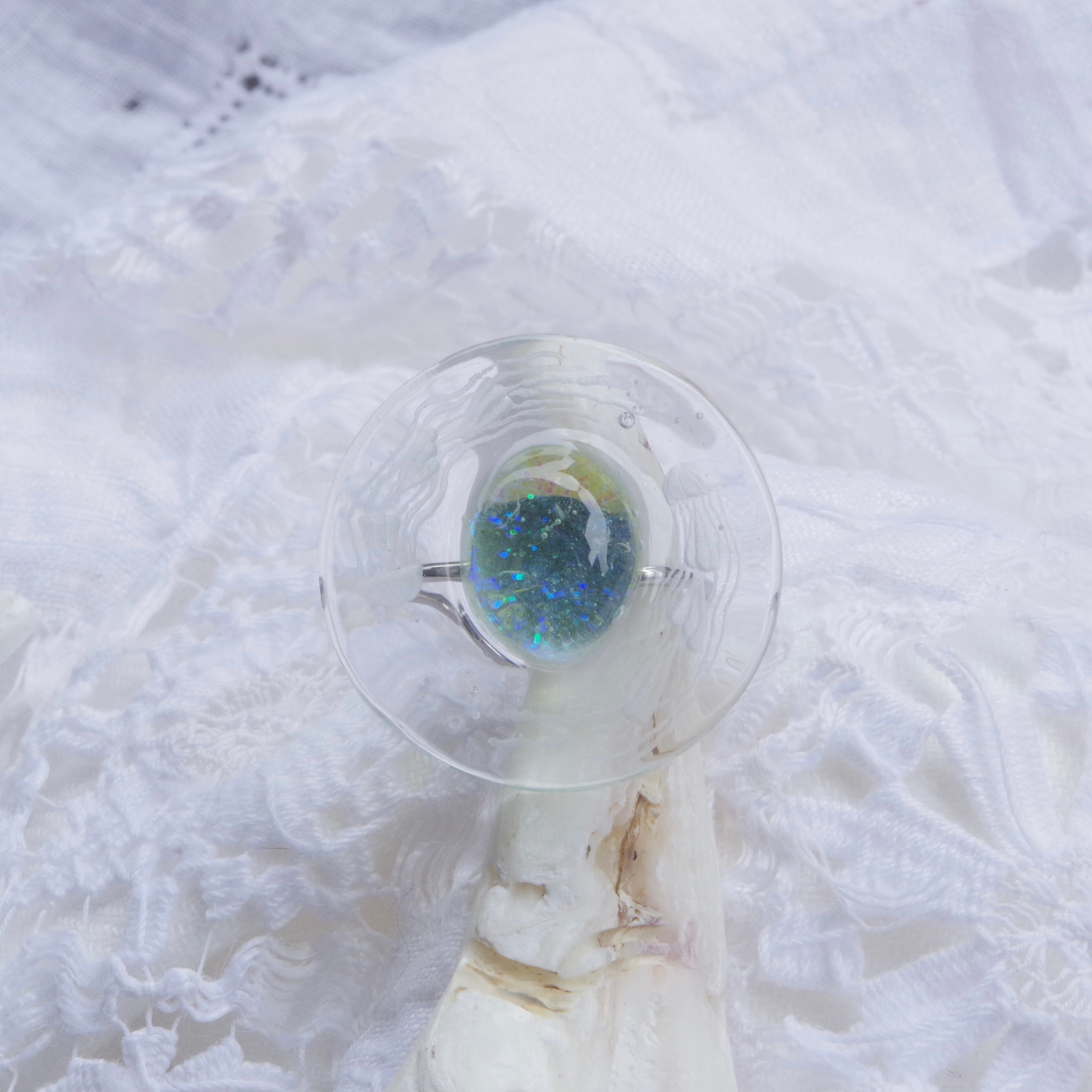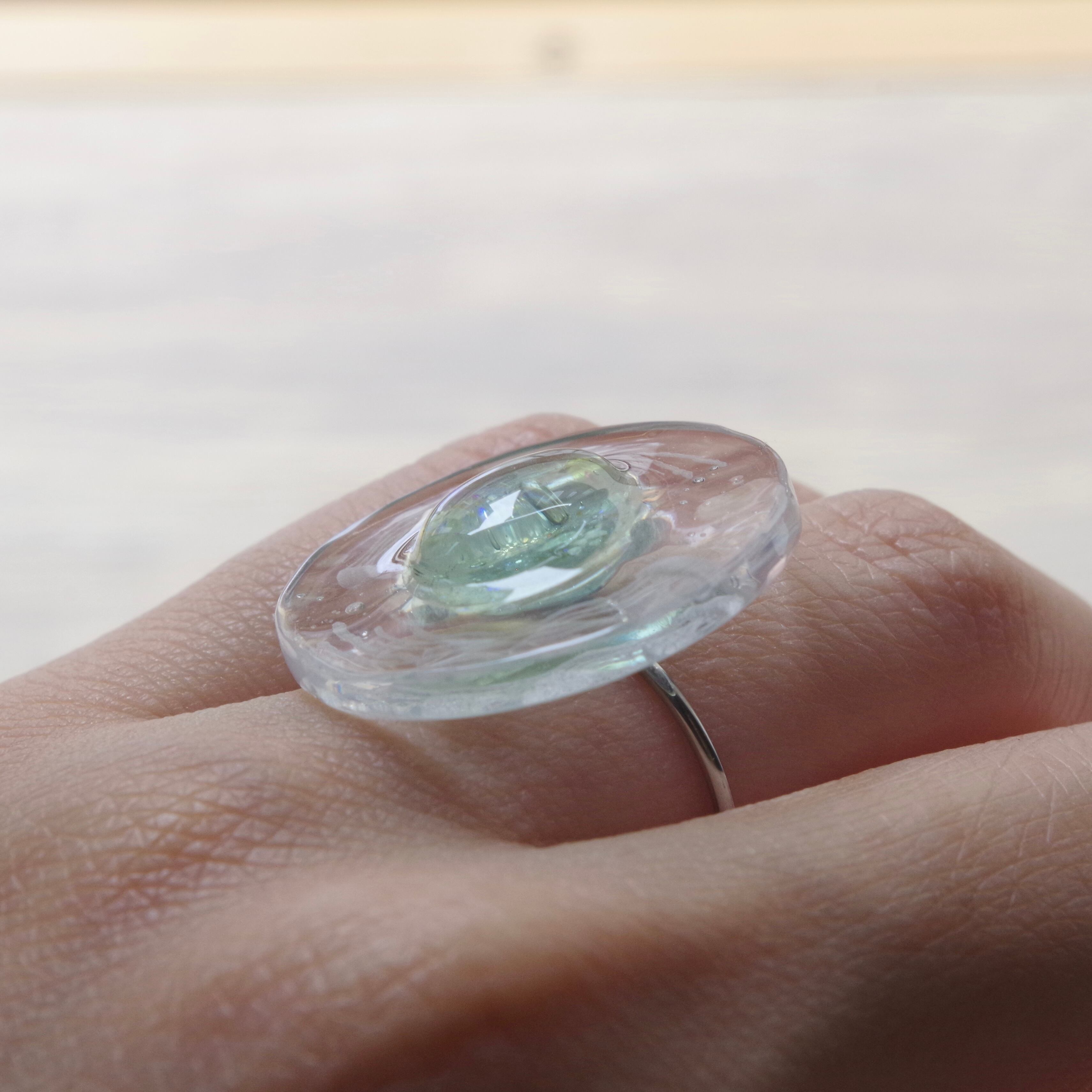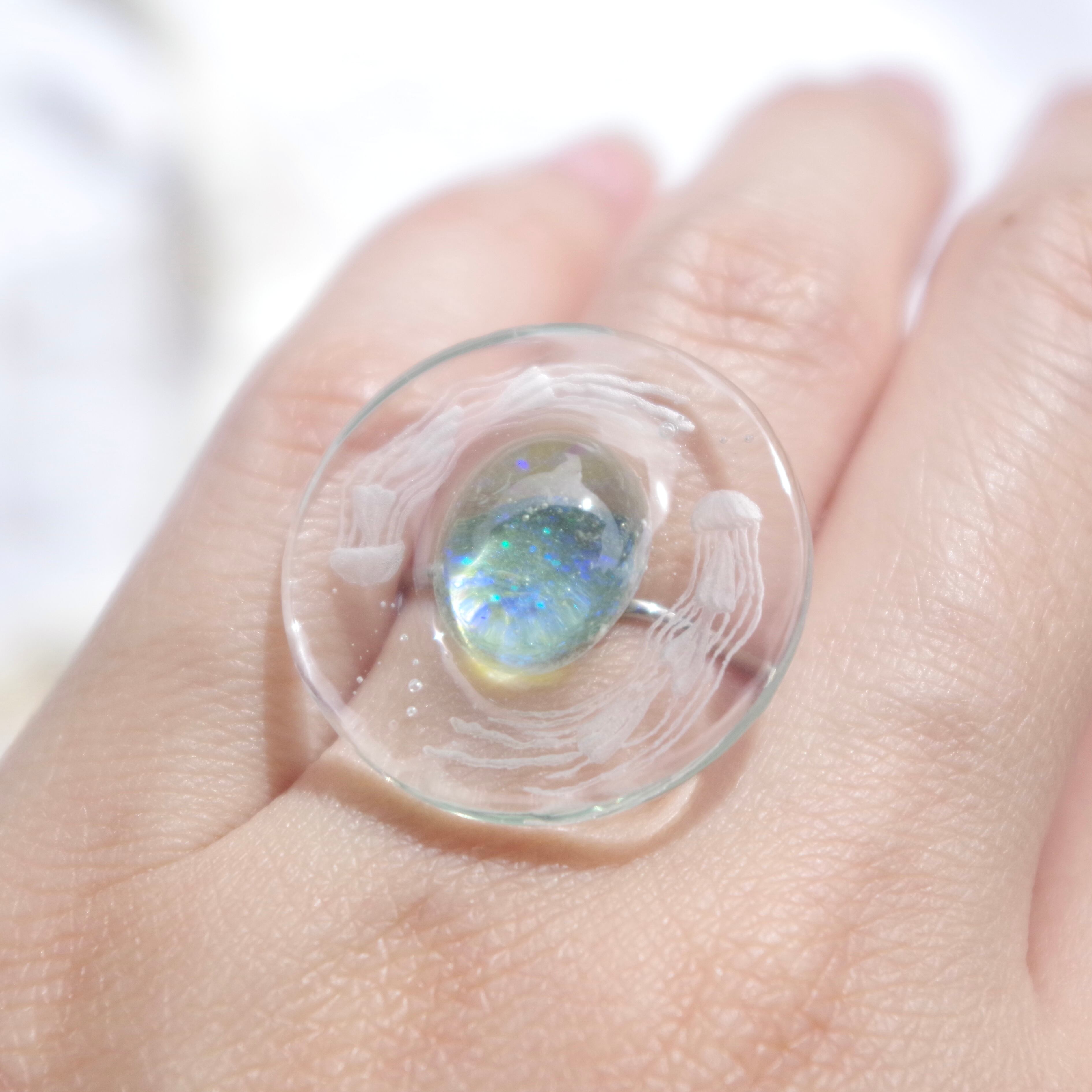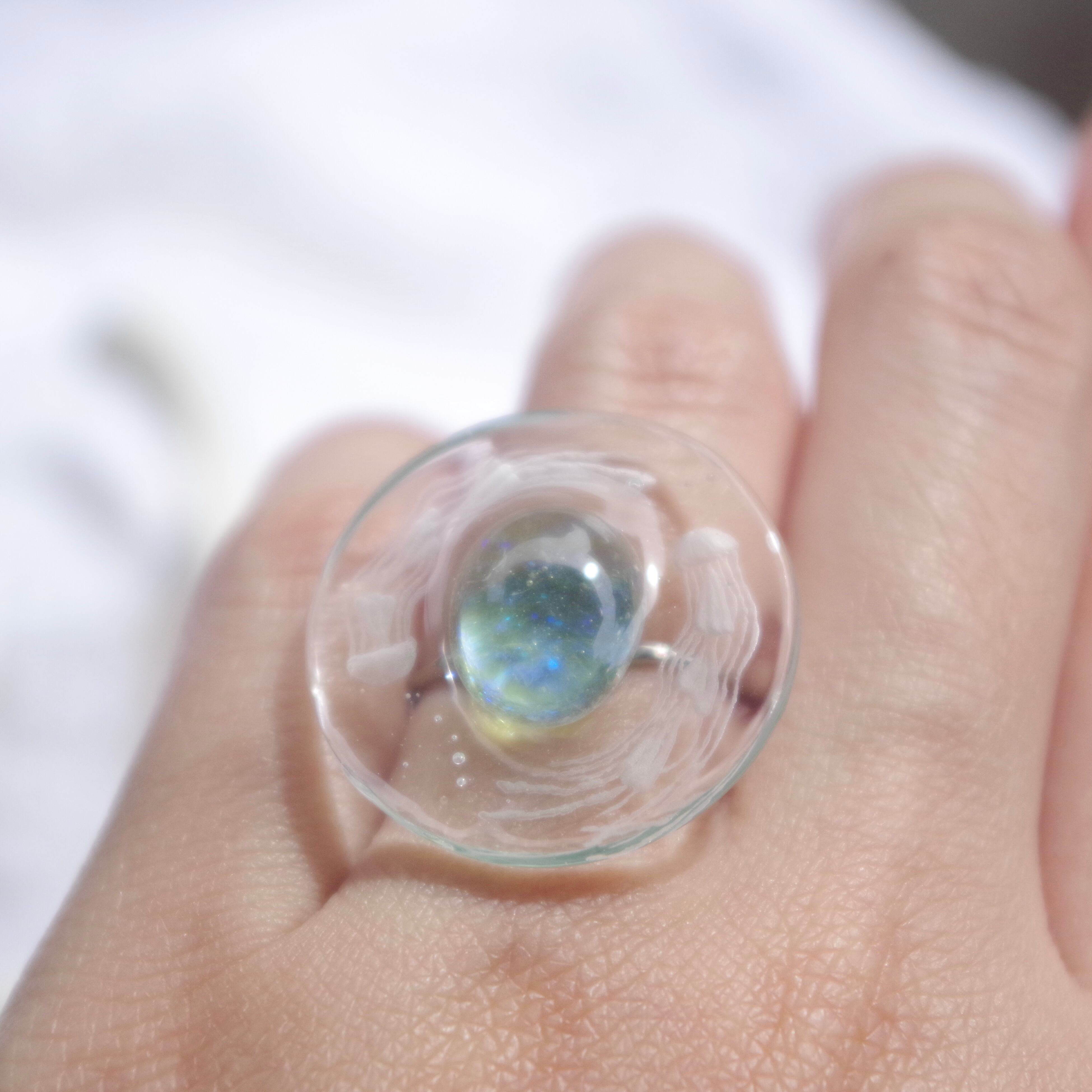 窯で焼いたシーグラスを使用し、海月の彫刻を施したクリアリングは、まるで夢の中で海辺の潮だまりを覗いているような不思議な錯覚を与えます。