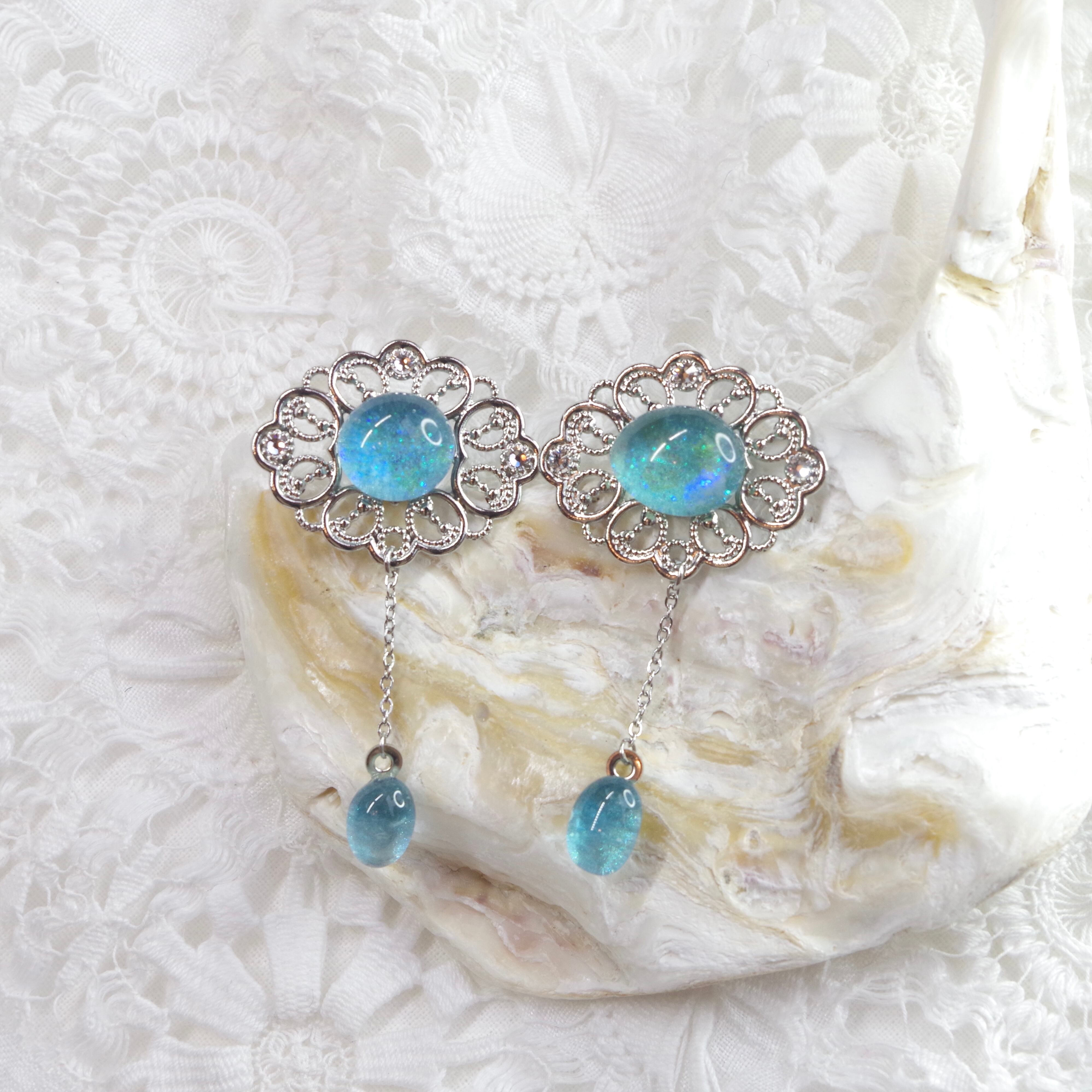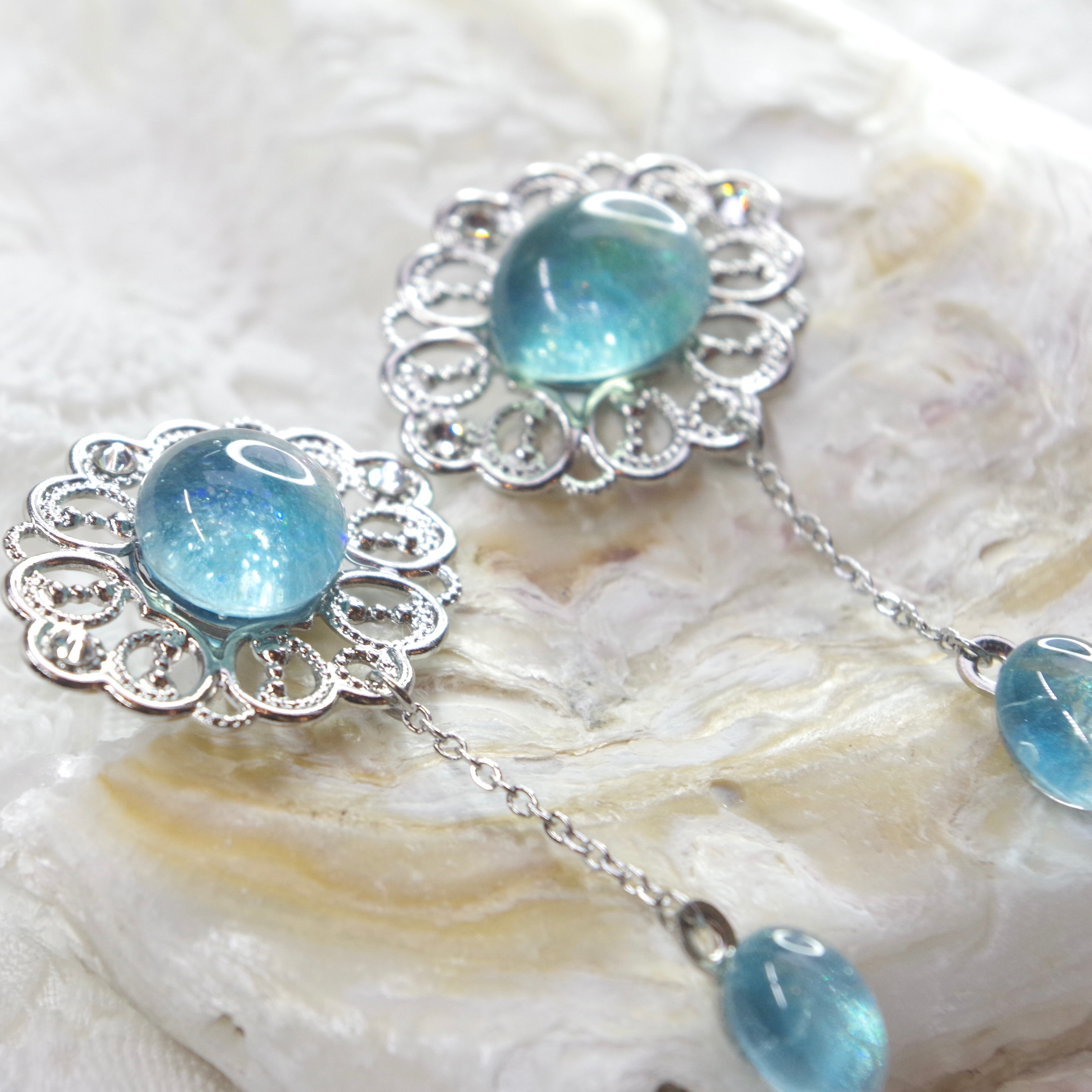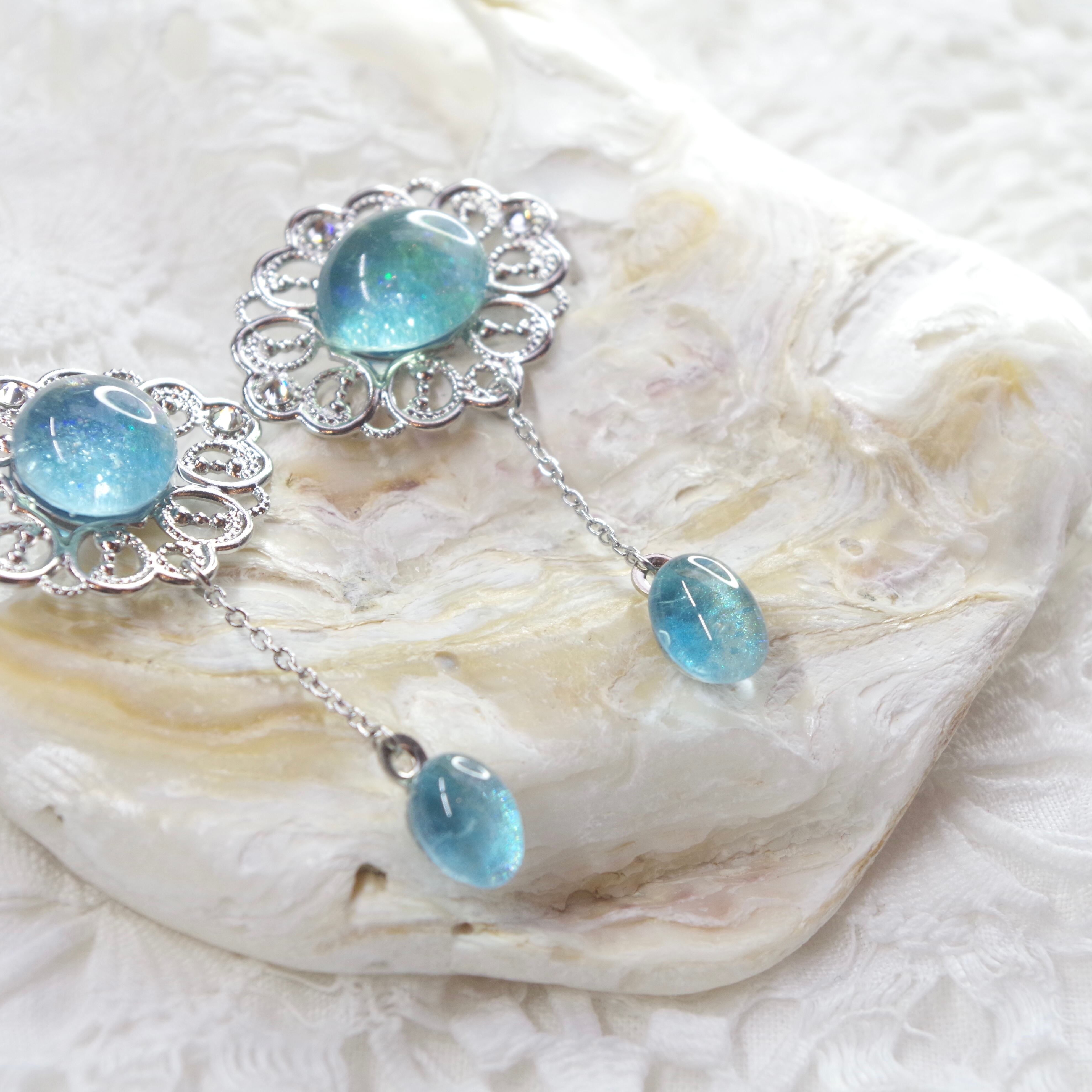 細やかな模様の金属、輝くクリスタル、青く透き通ったシーグラスが華やかさを演出します。
