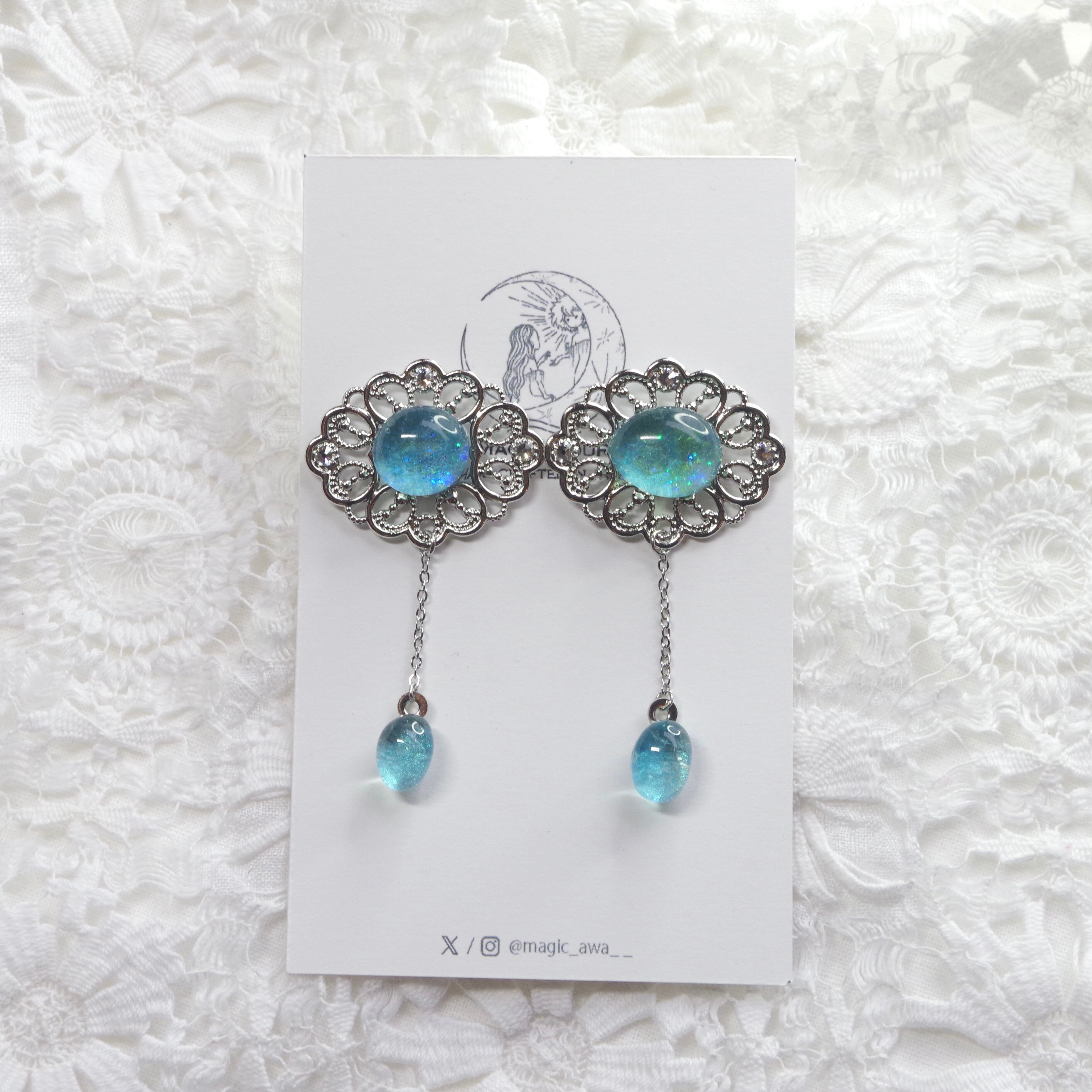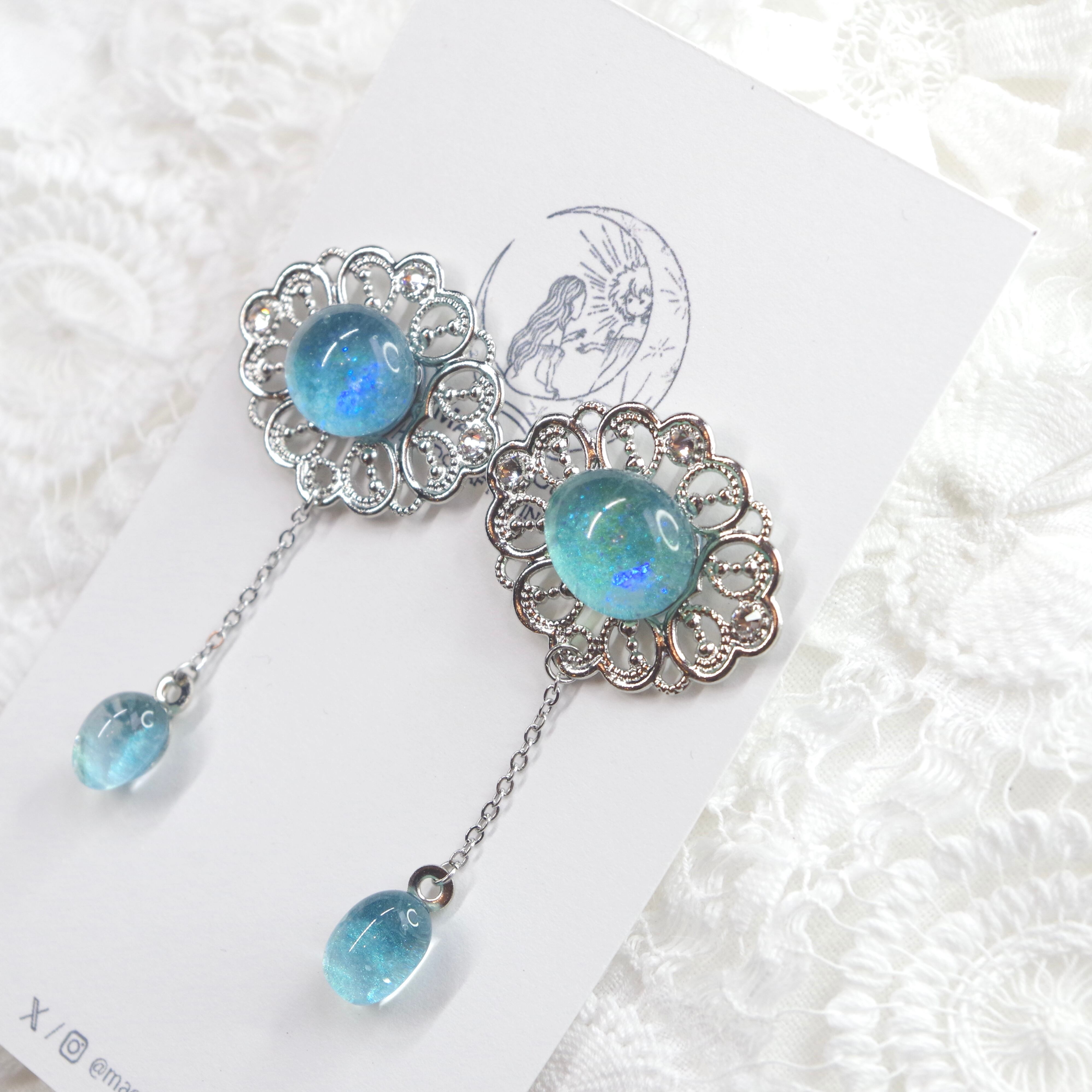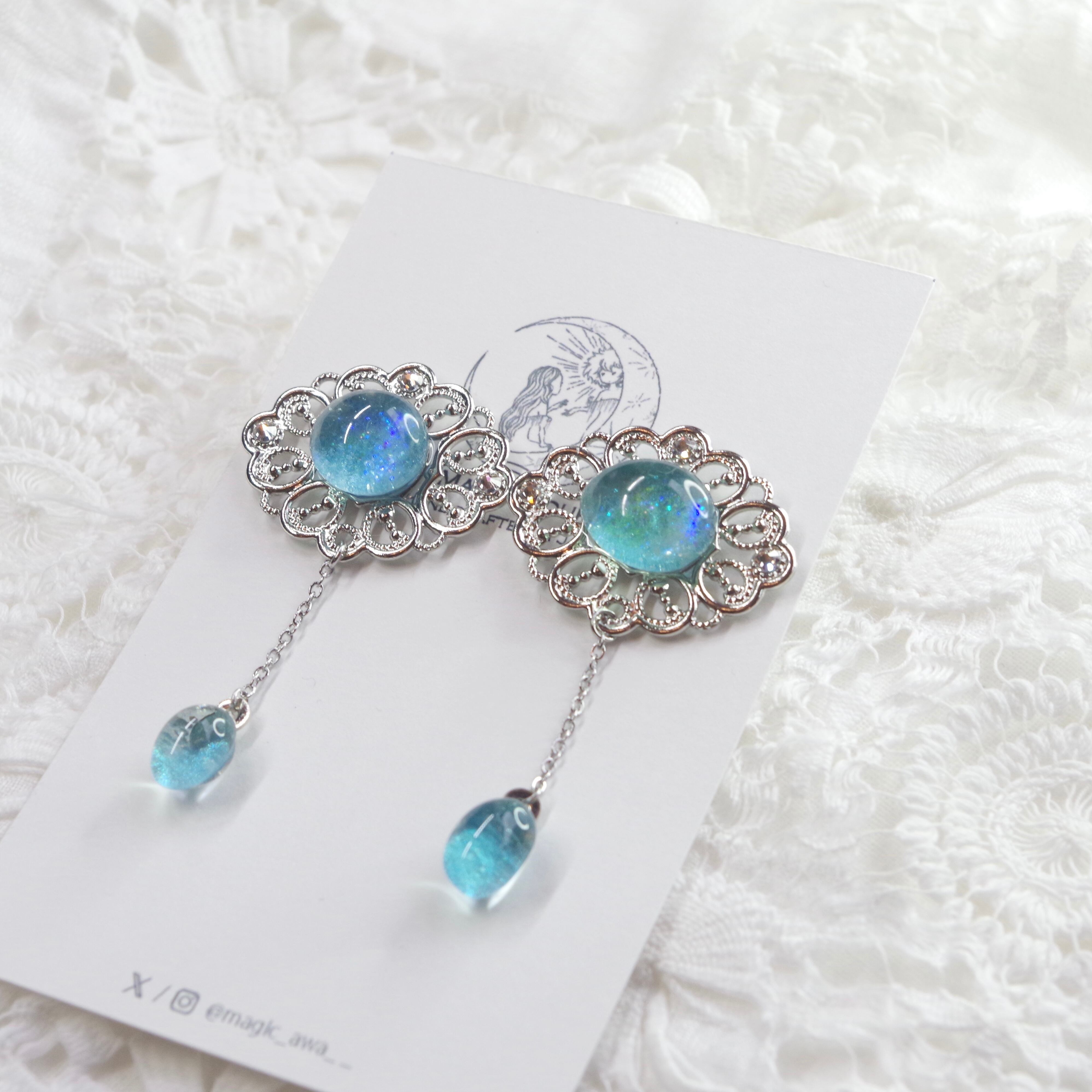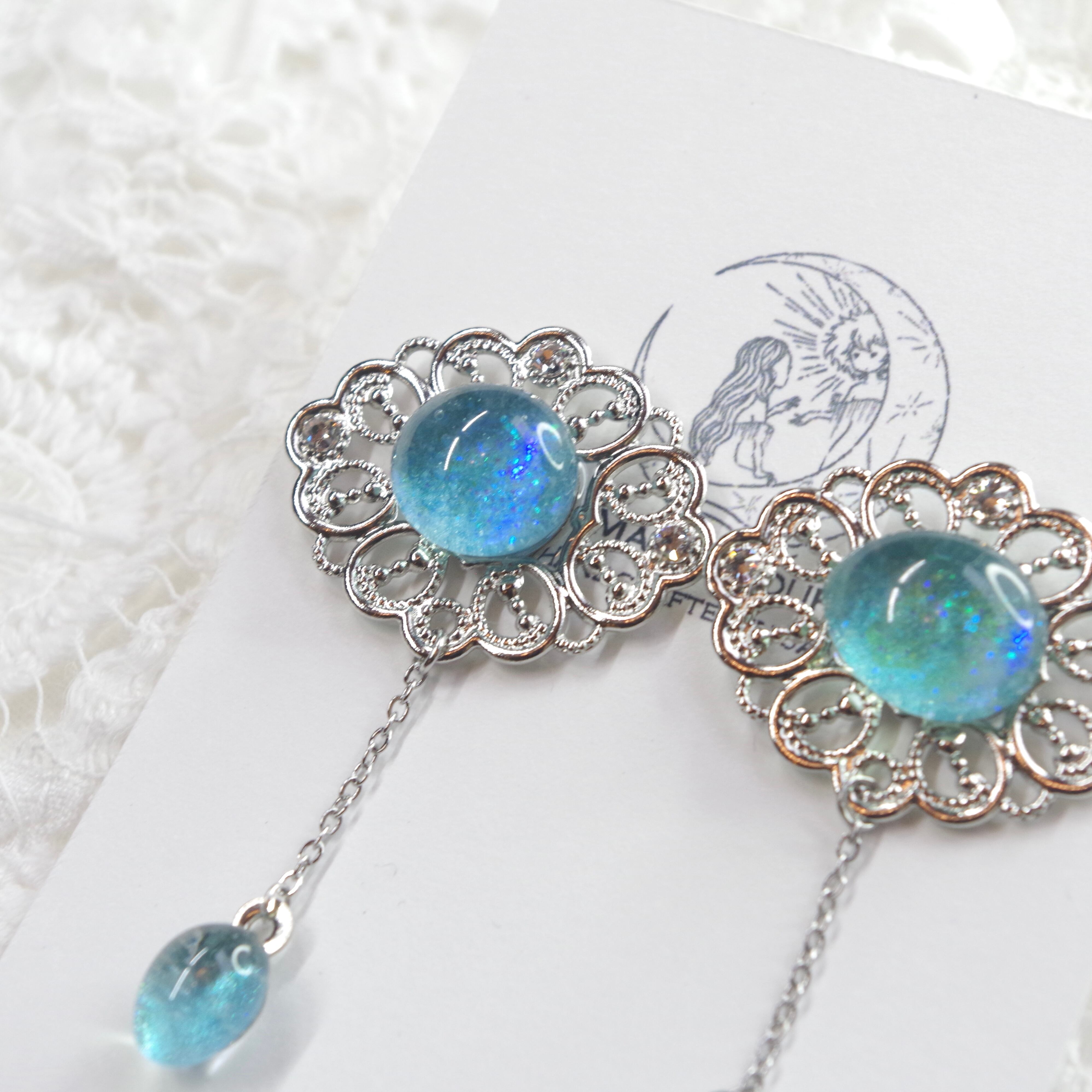 細やかな模様の金属、輝くクリスタル、青く透き通ったシーグラスが華やかさを演出します。