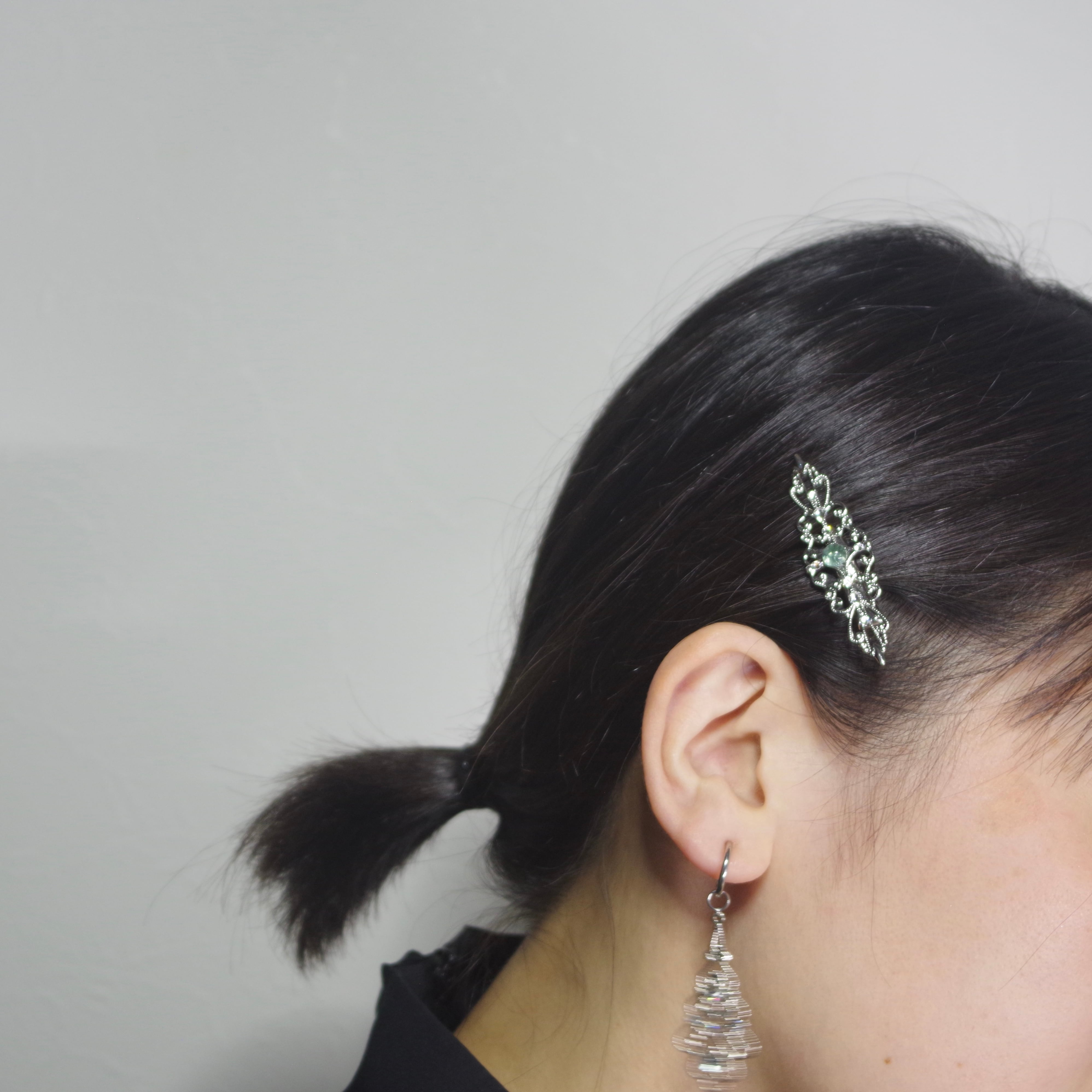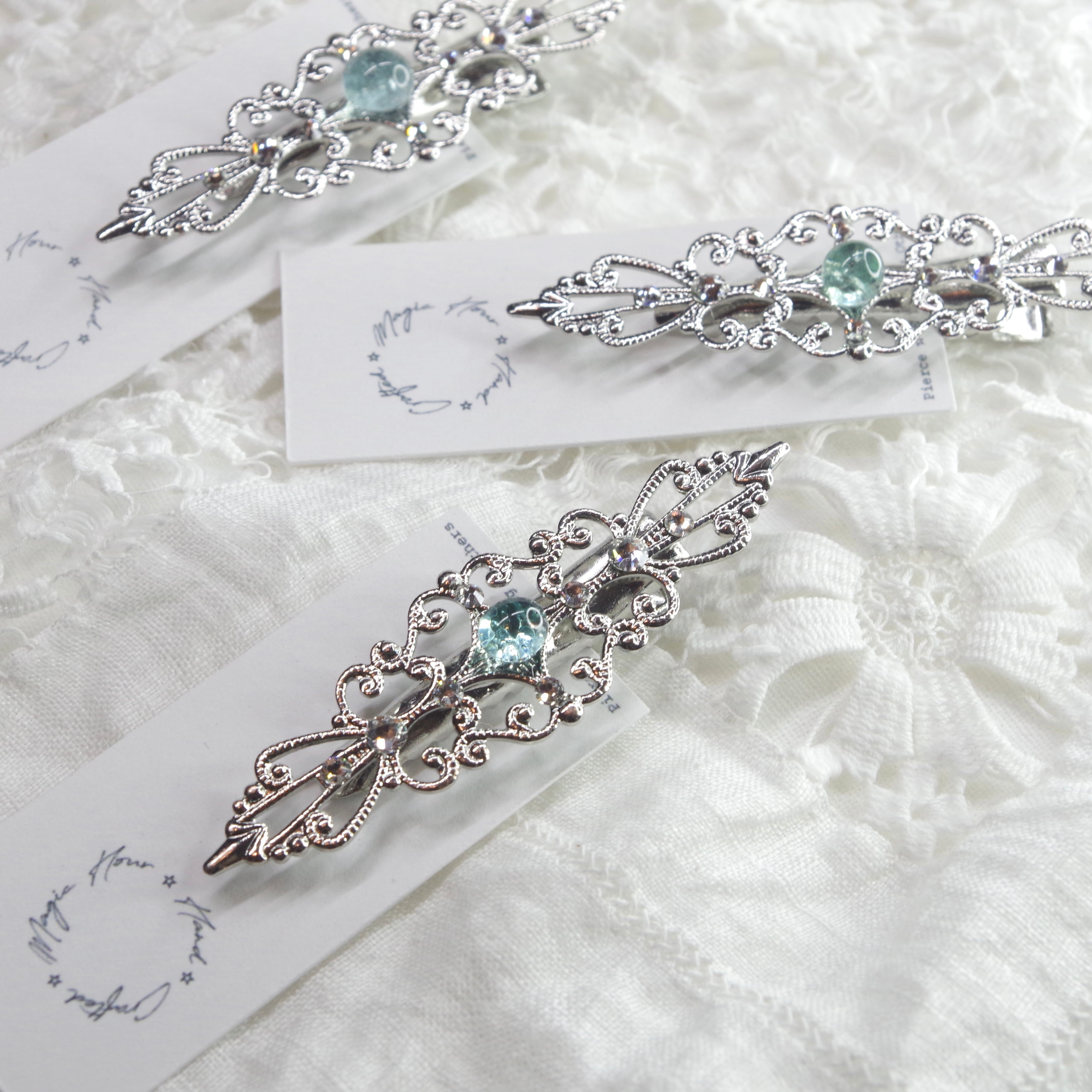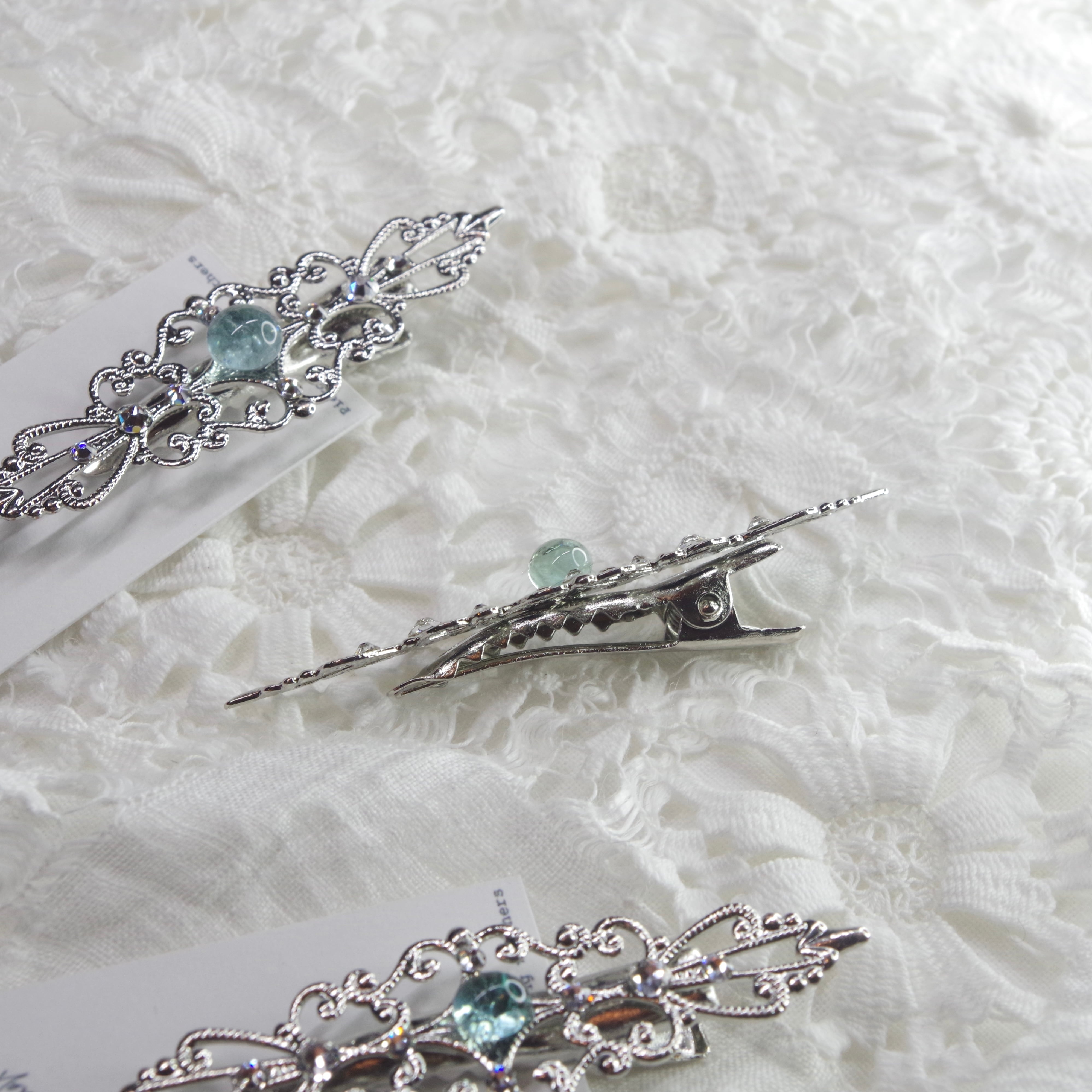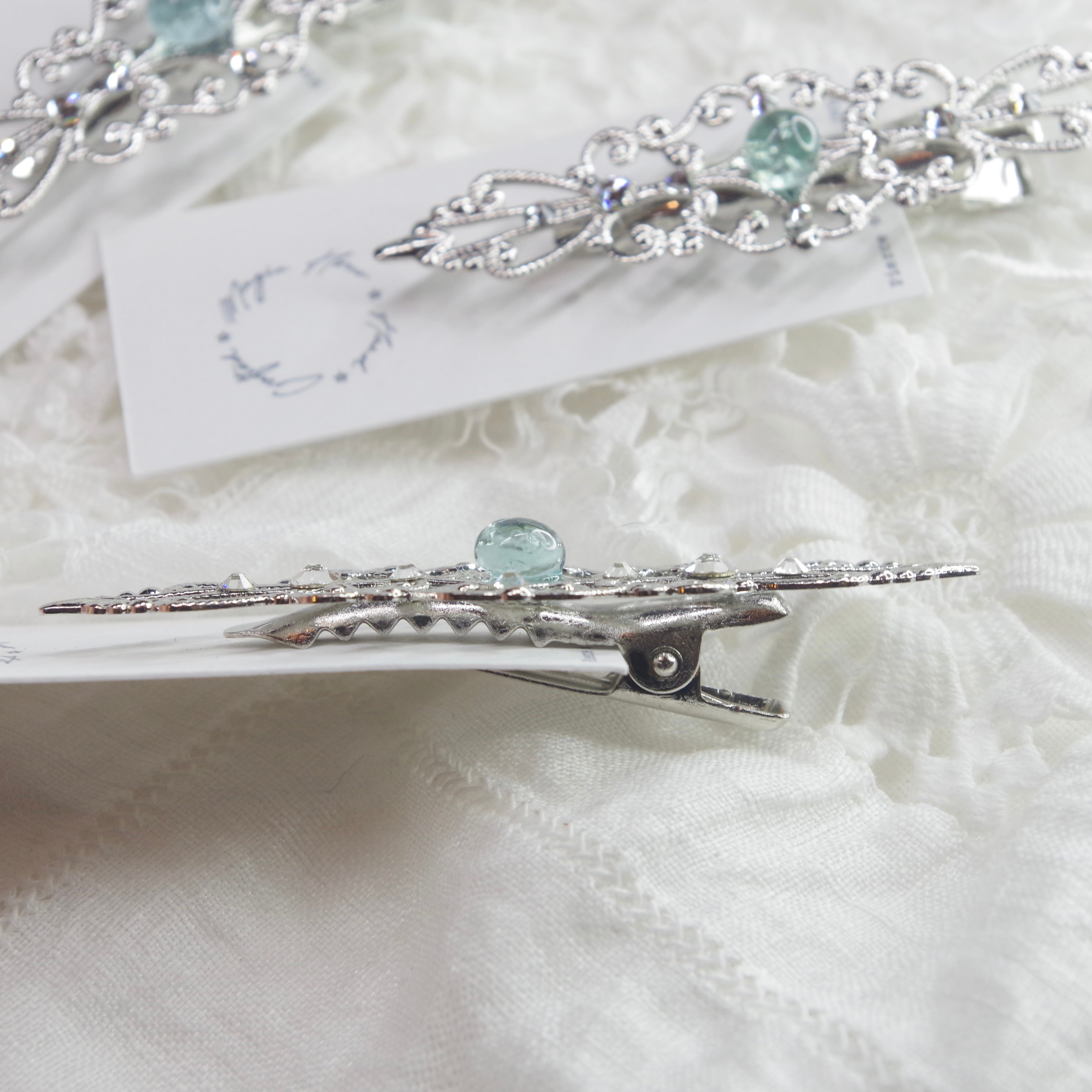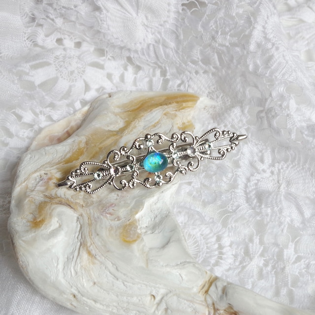 こちらは繊細なフィリグリーの中央にシーグラスが鎮座するヘアクリップです。