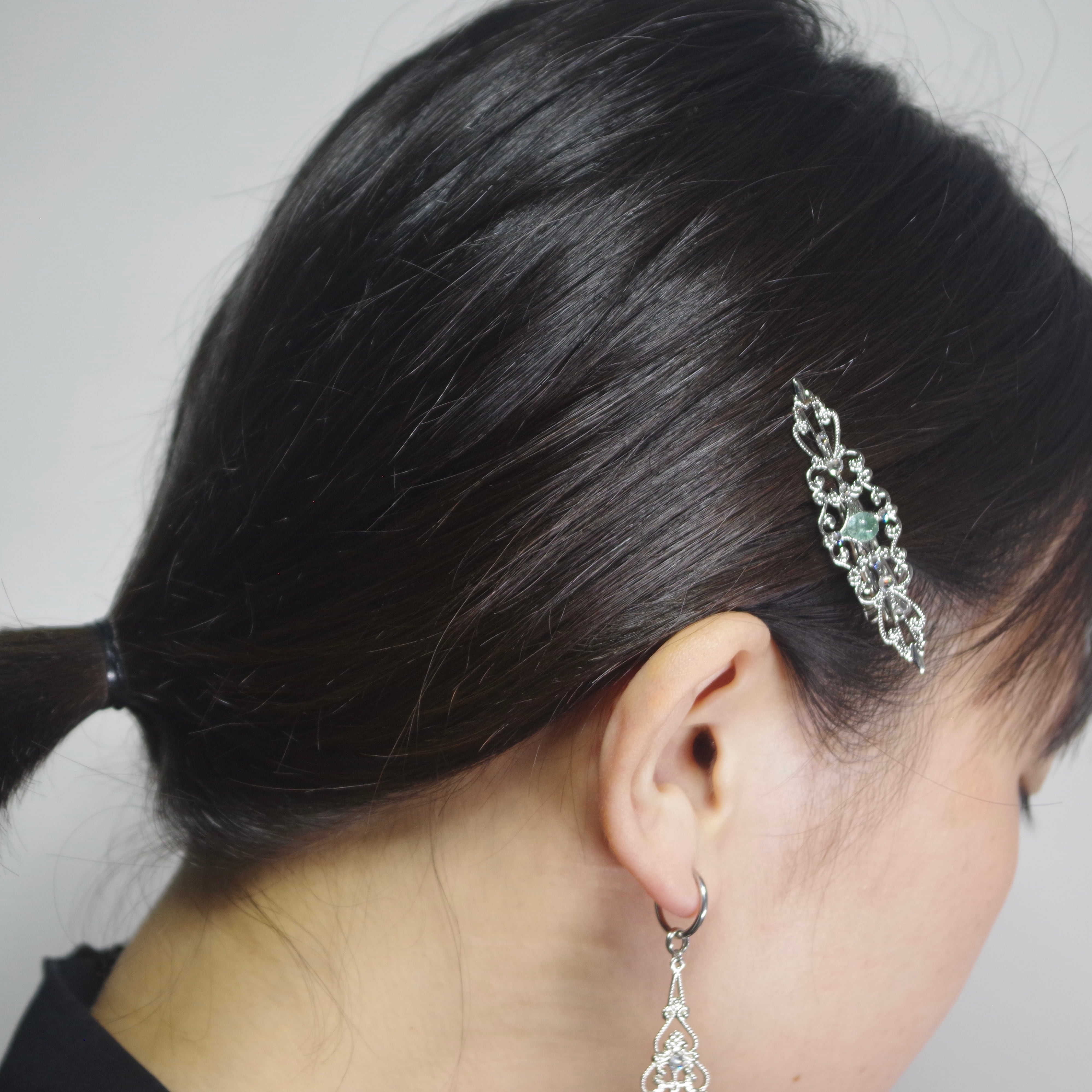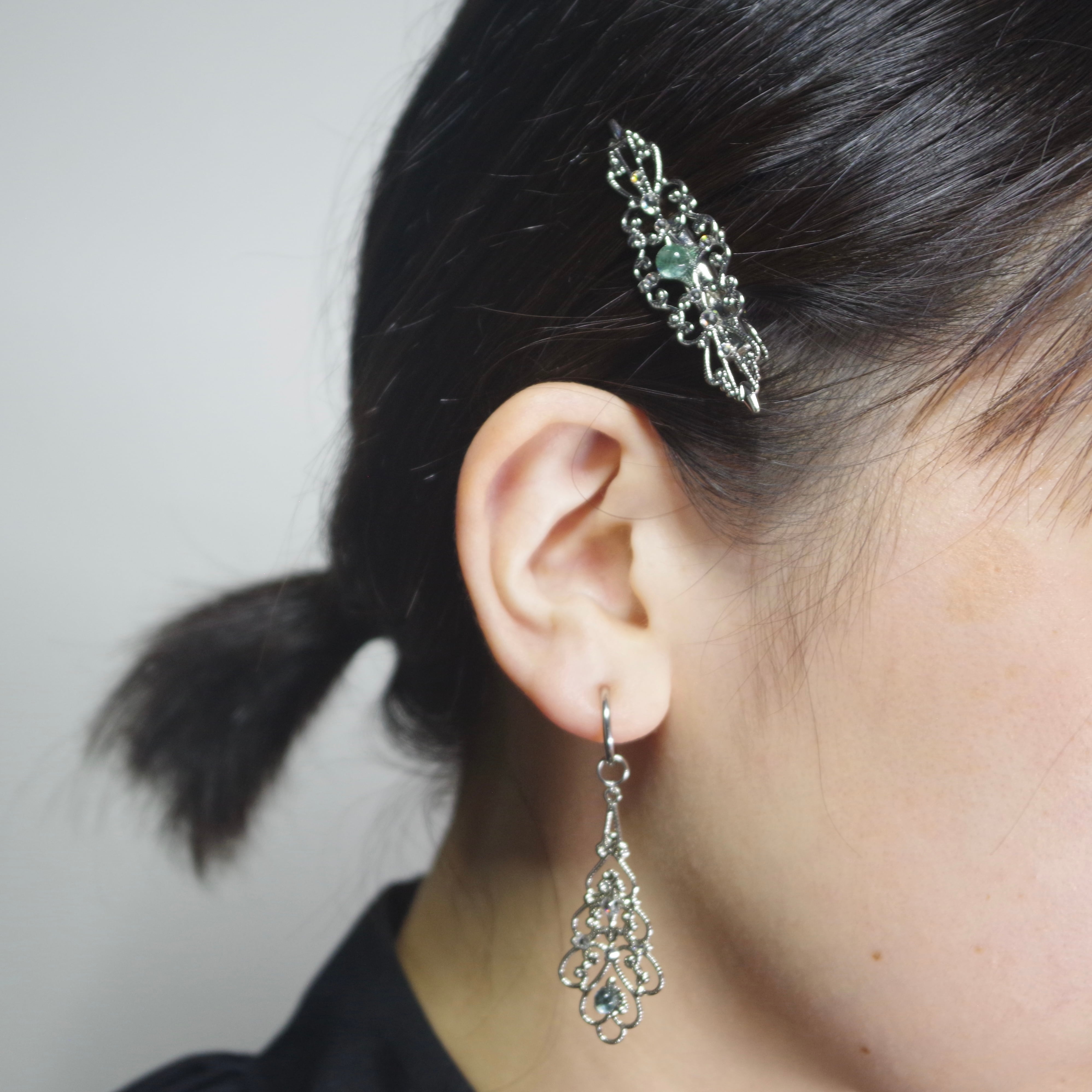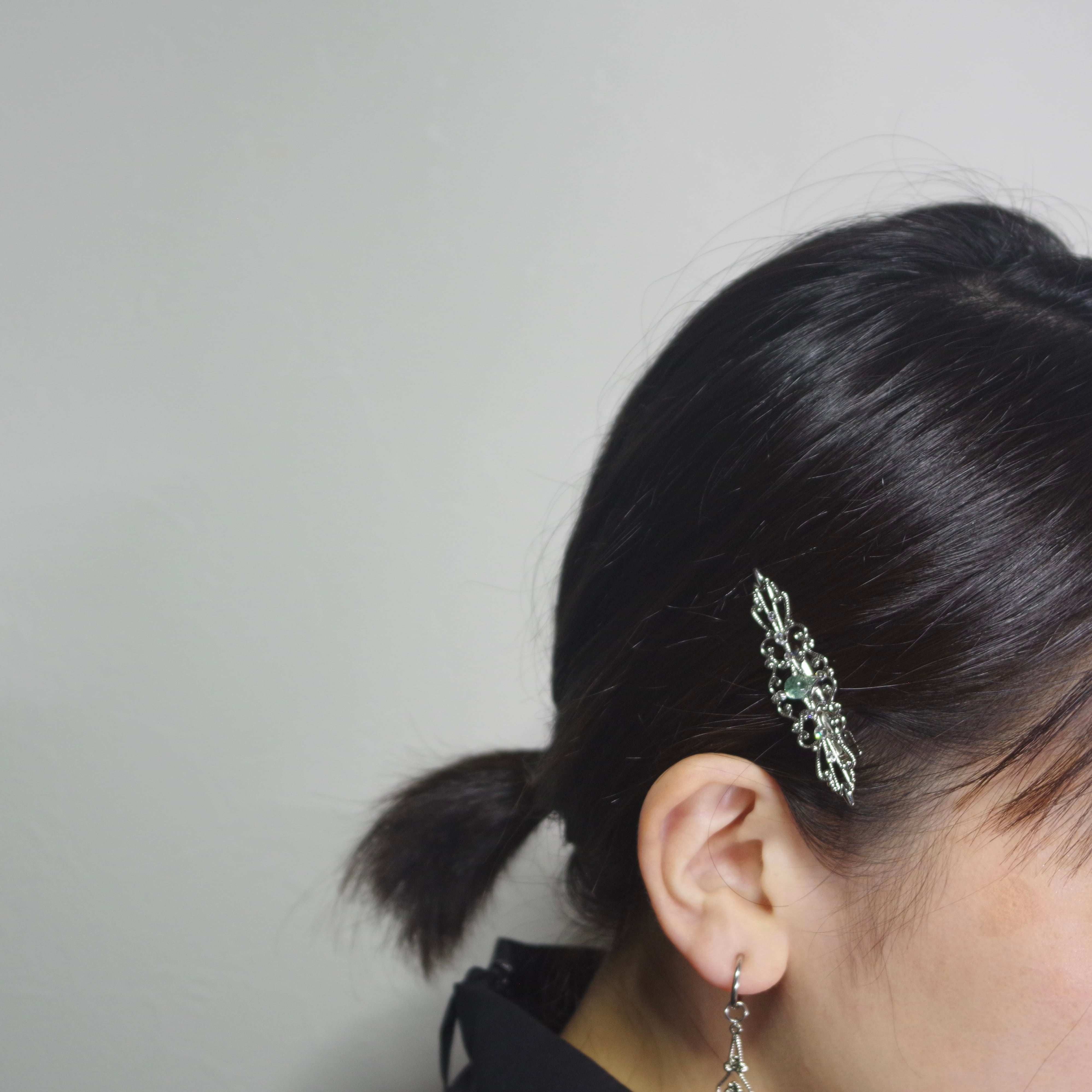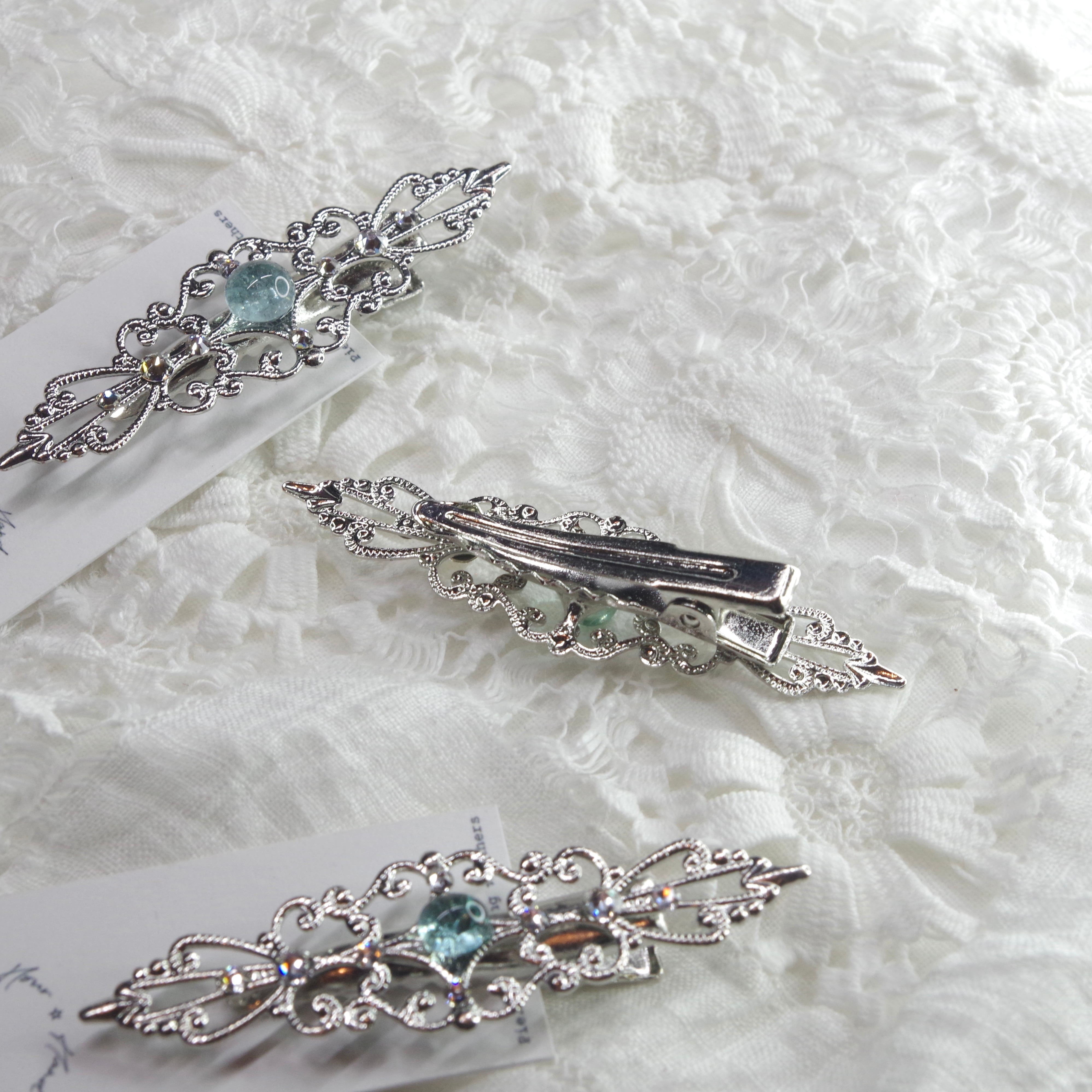 こちらは繊細なフィリグリーの中央にシーグラスが鎮座するヘアクリップです。