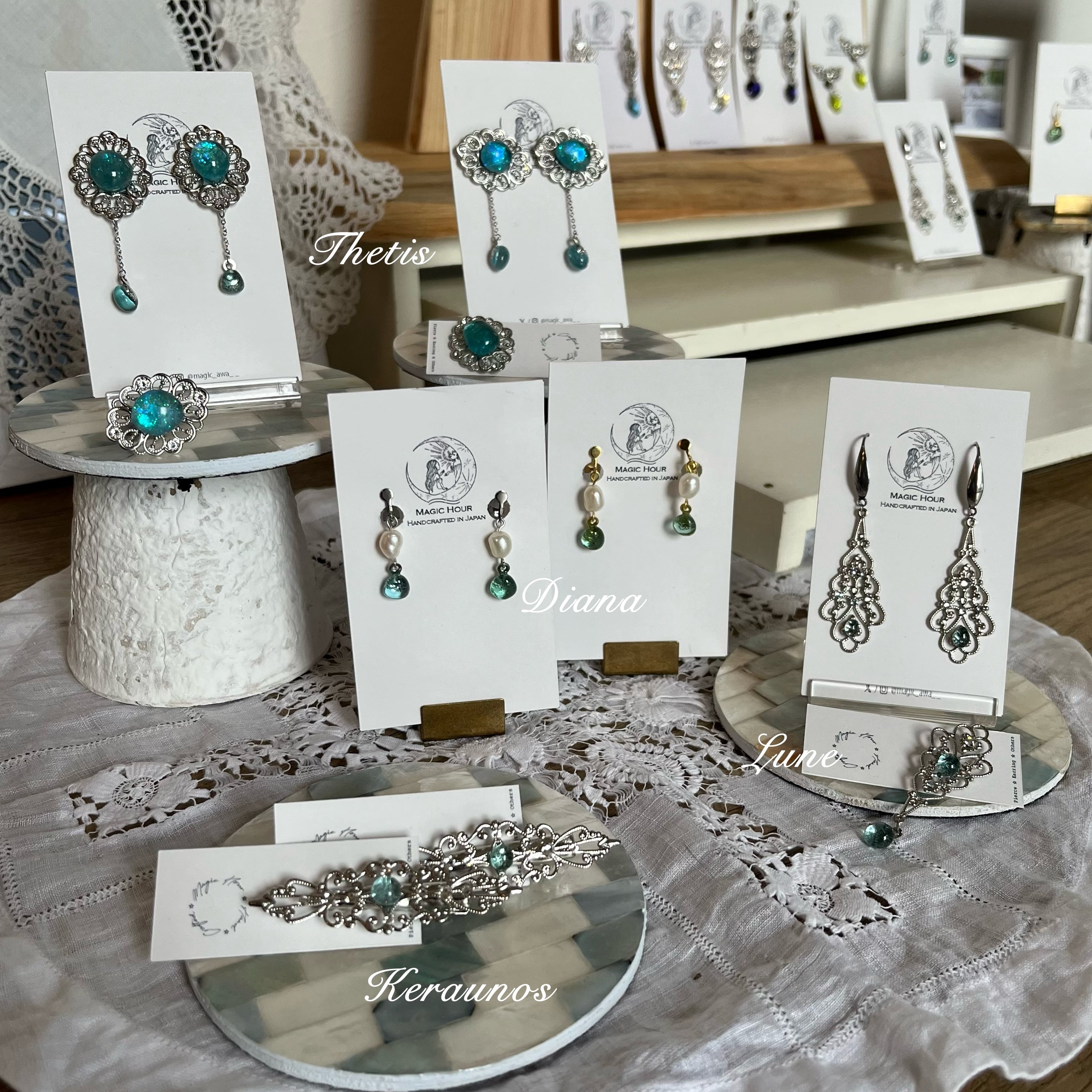 海を統べる - 海神や女神をモチーフにした繊細かつ華やかなコレクションです。全ての作品に「電気炉で焼いたシーグラス」をあしらいました。