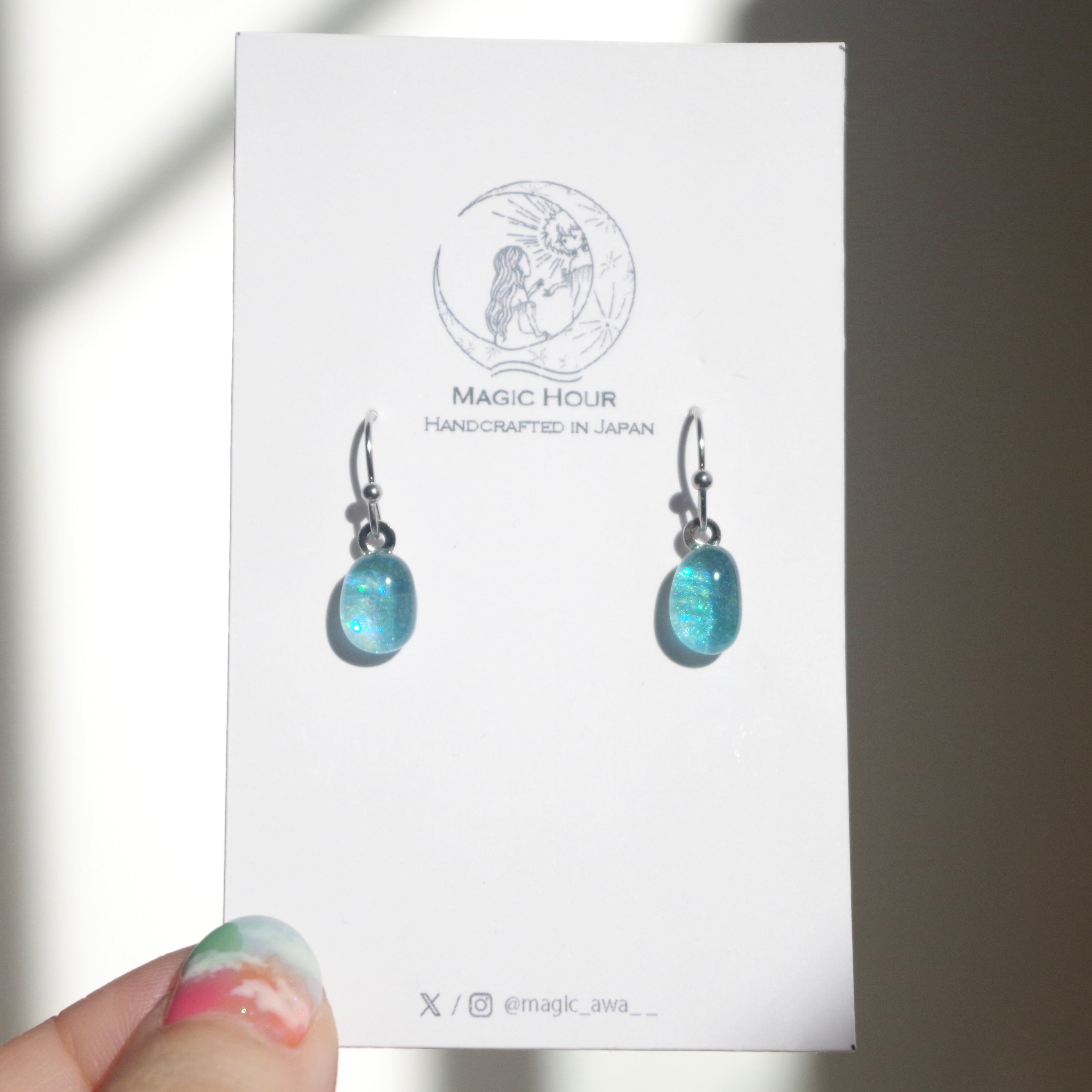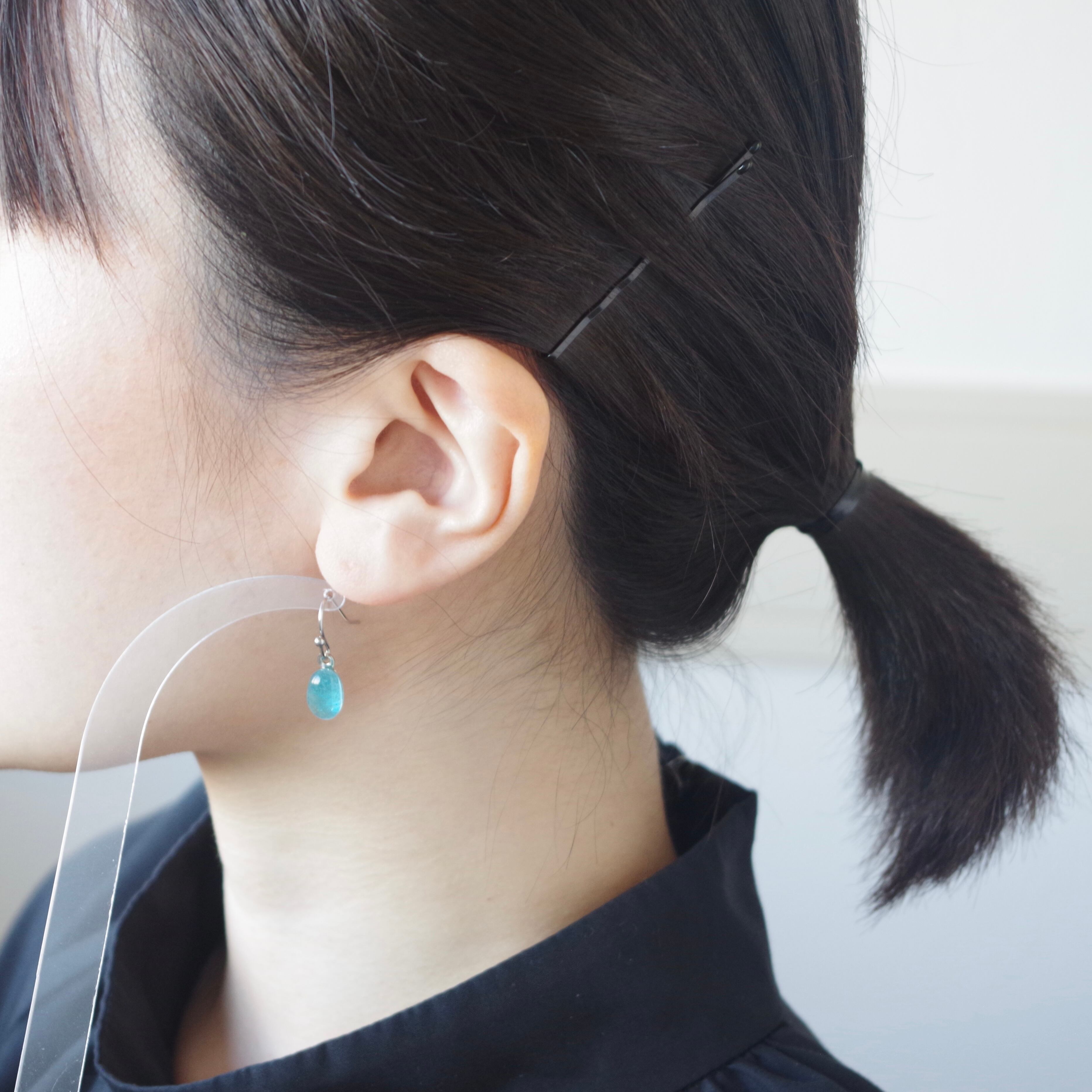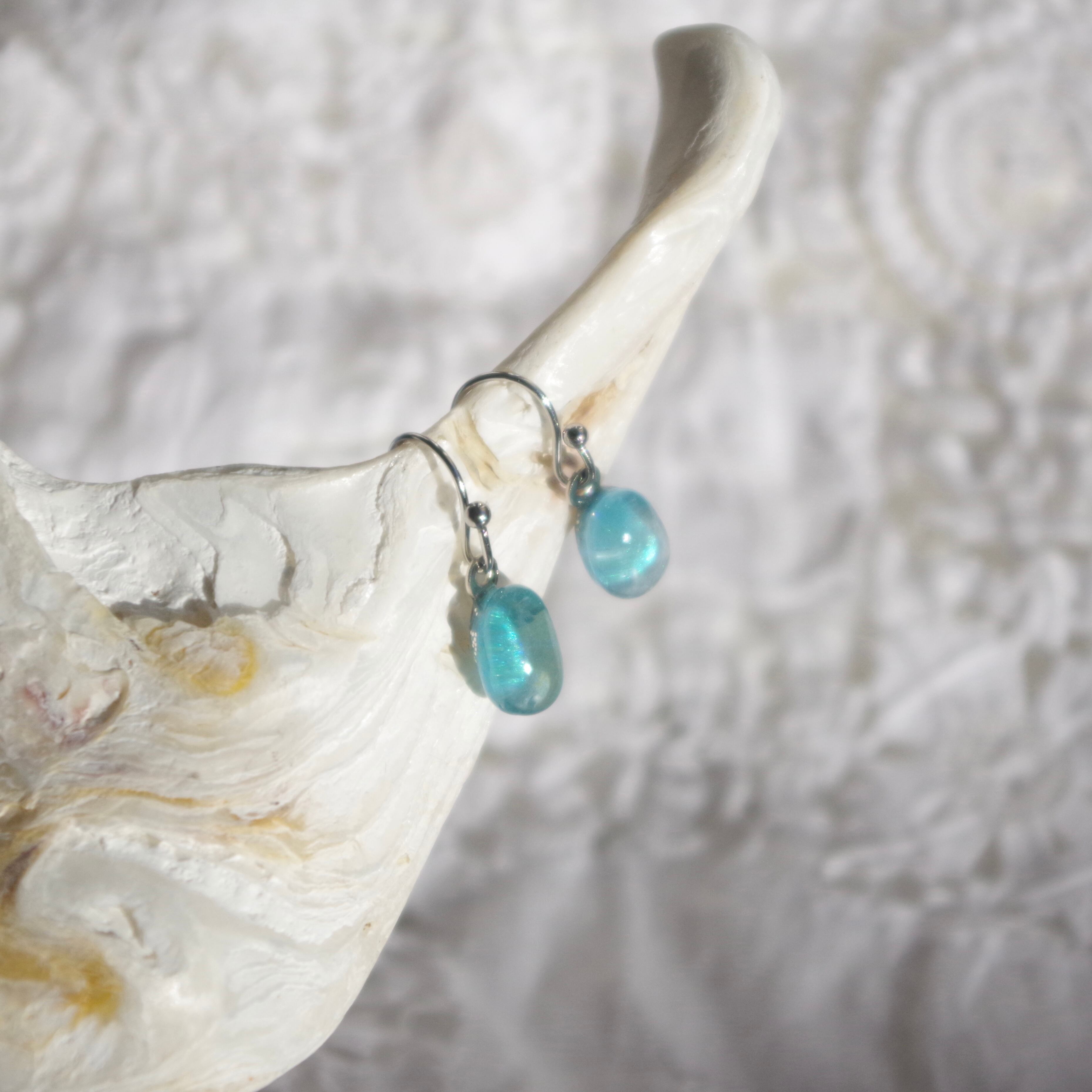 海辺で拾ったシーグラスを、水滴の様なうるツヤピアスにアップサイクルしました。