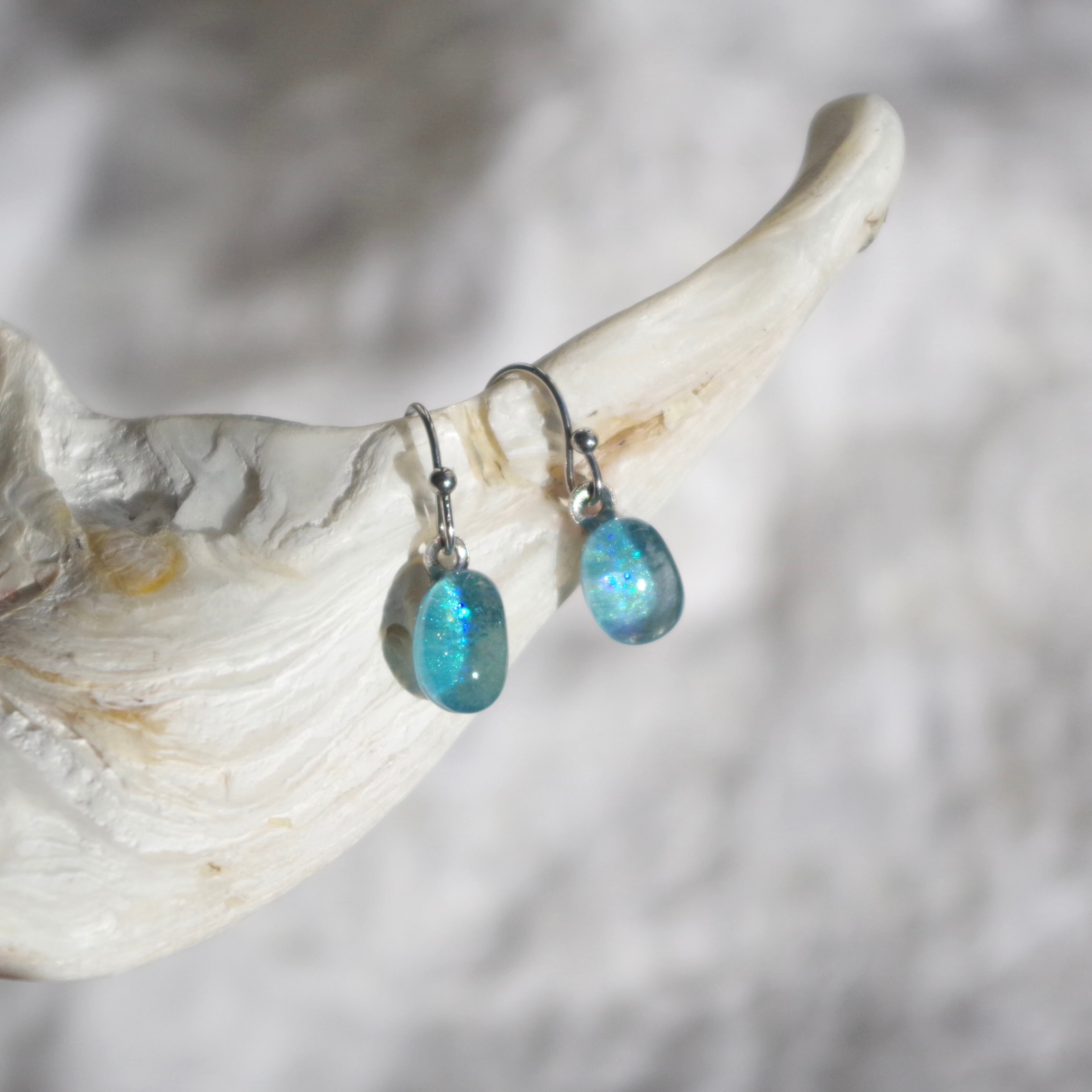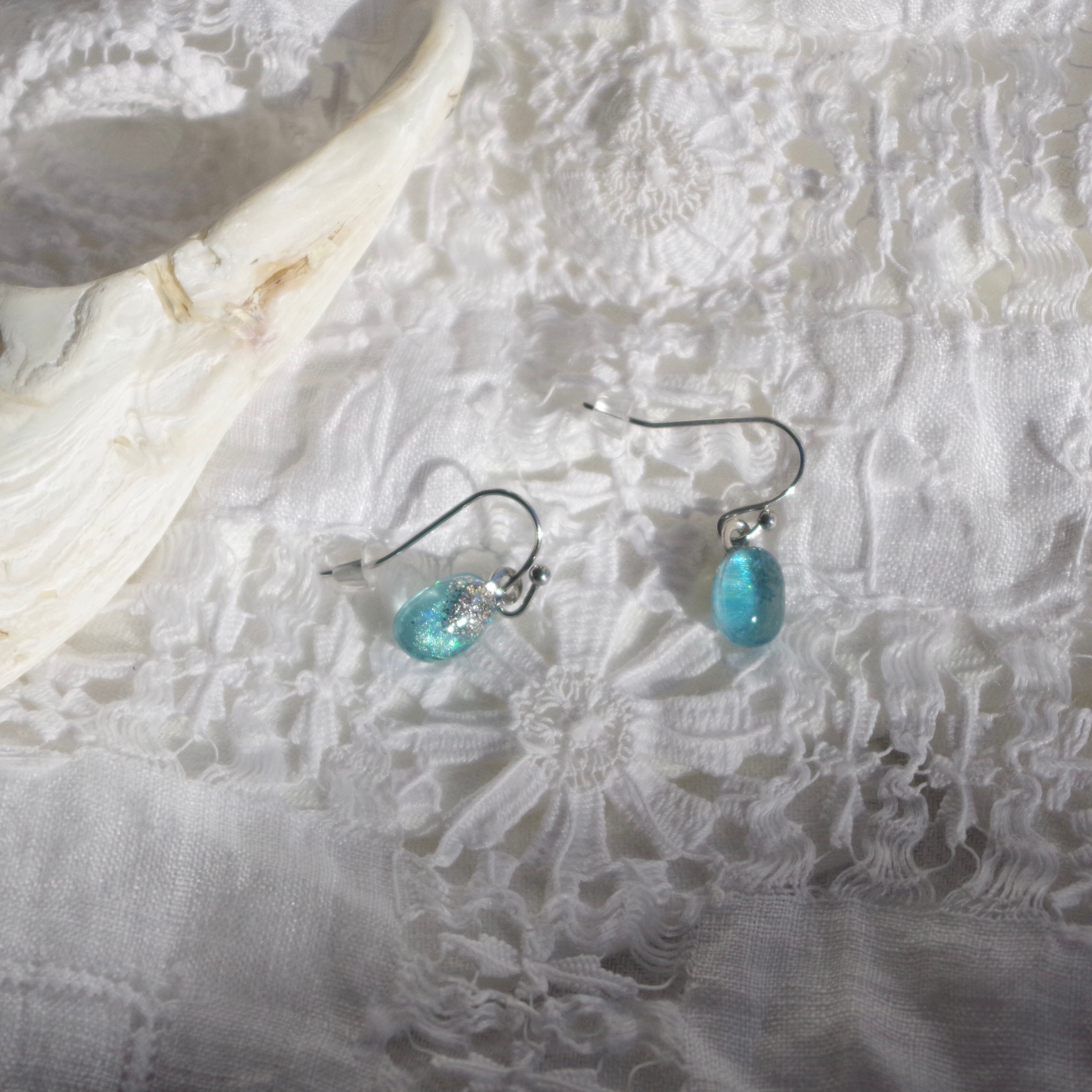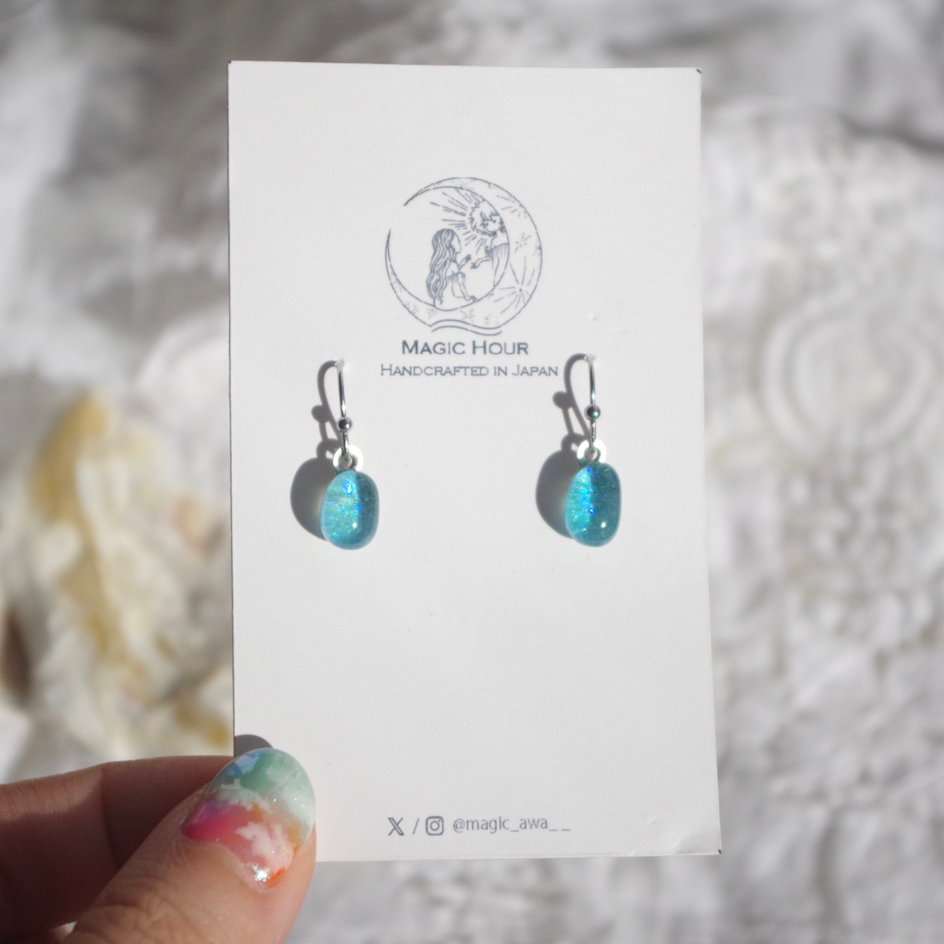 海辺で拾ったシーグラスを、水滴の様なうるツヤピアスにアップサイクルしました。