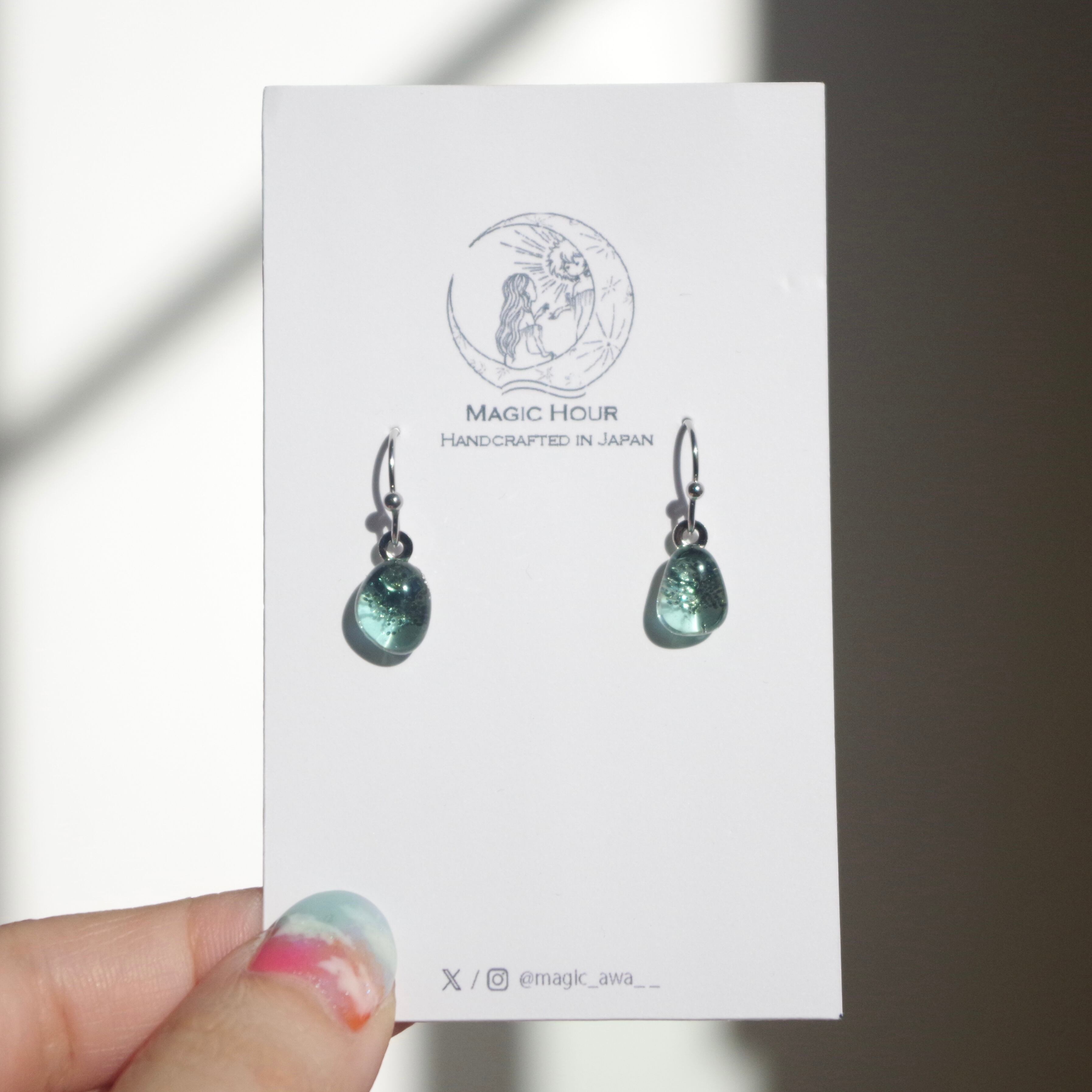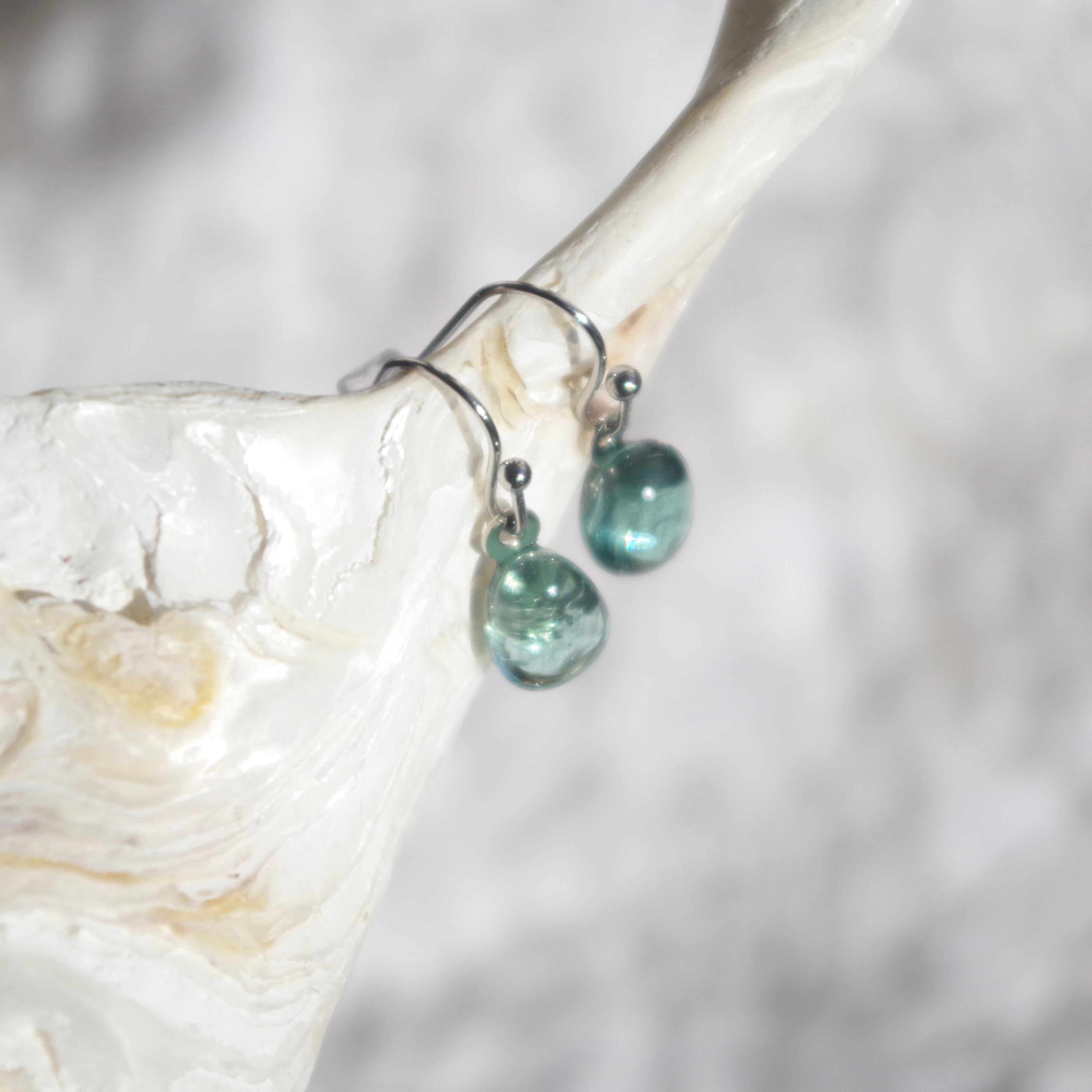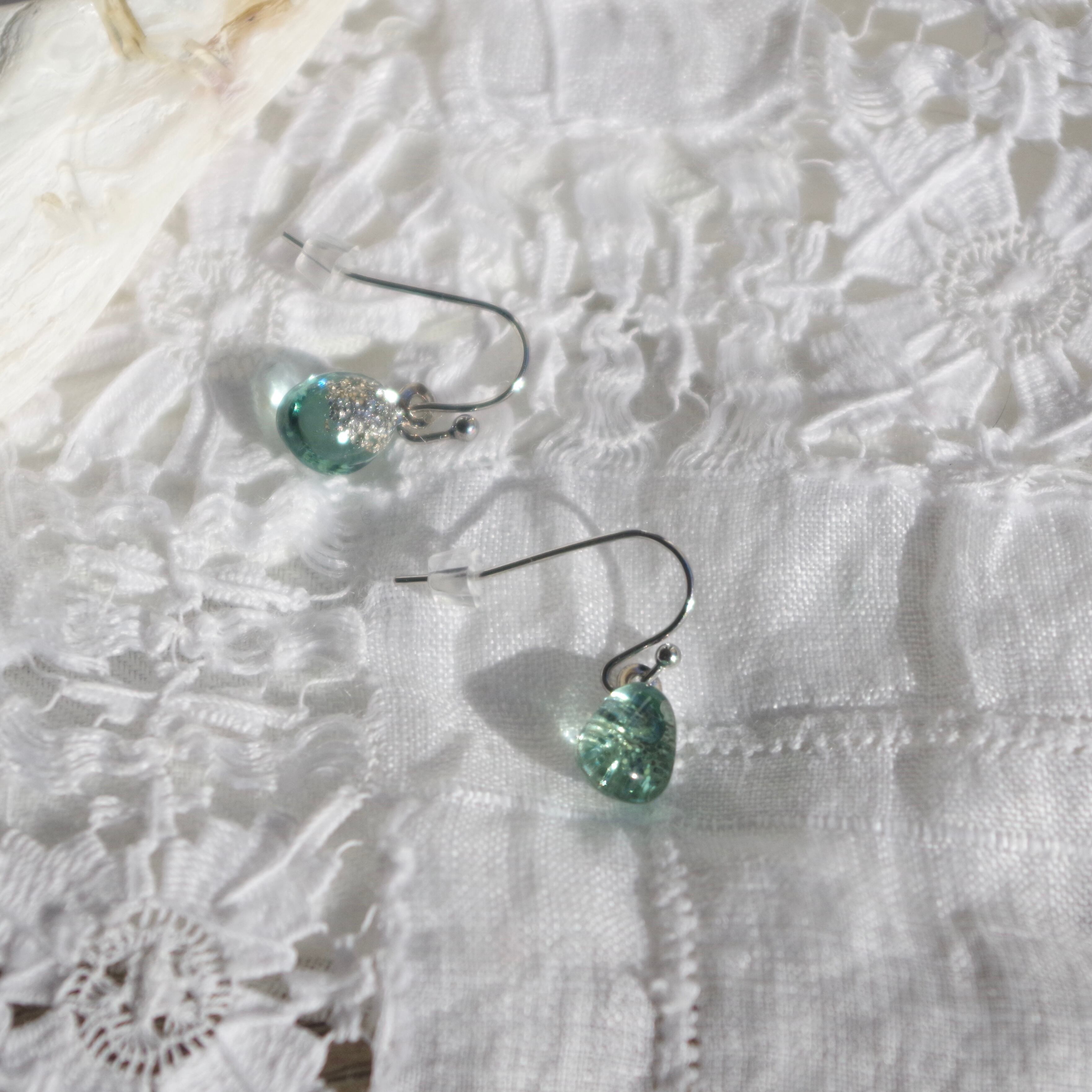 海辺で拾ったシーグラスを、水滴の様なうるツヤピアスにアップサイクルしました。