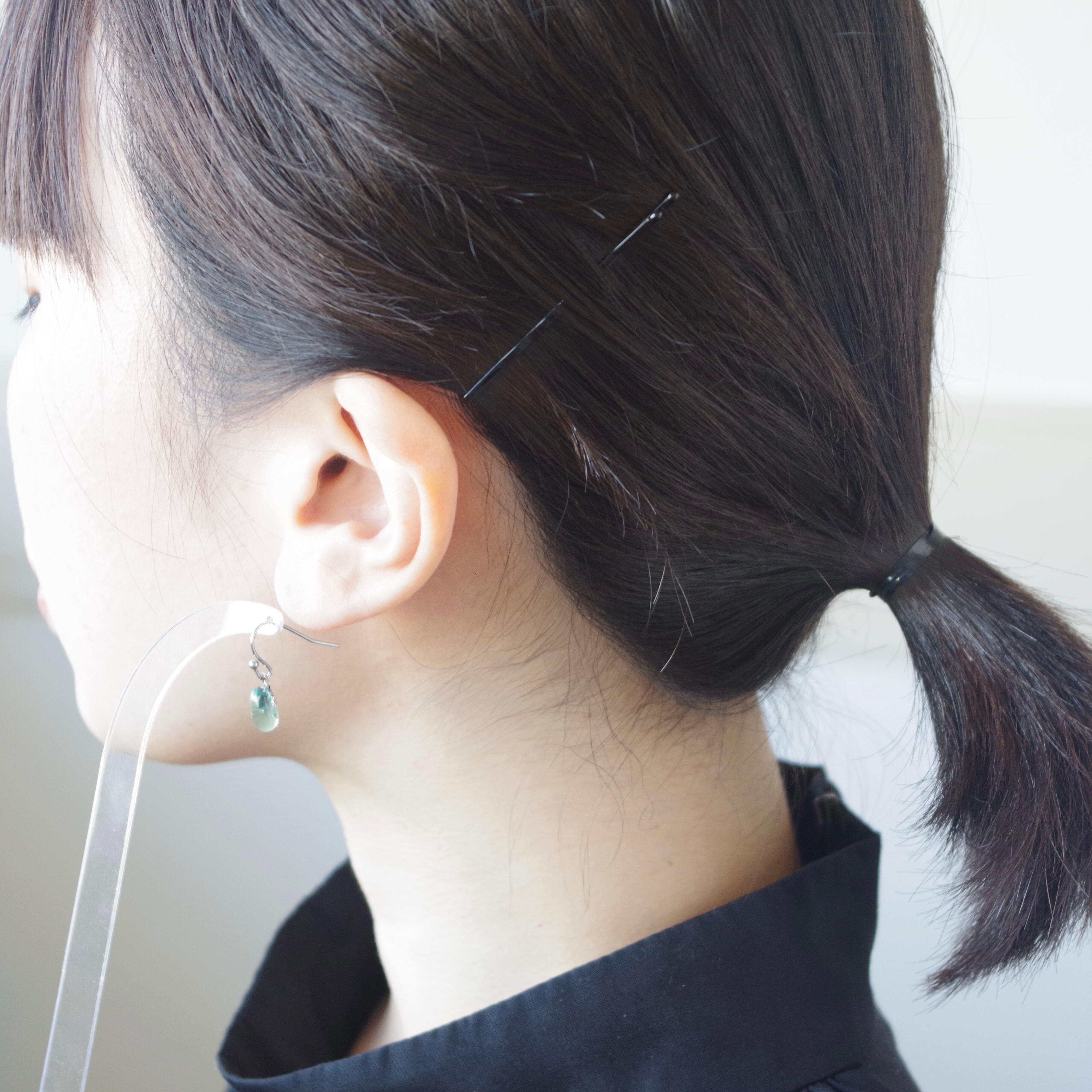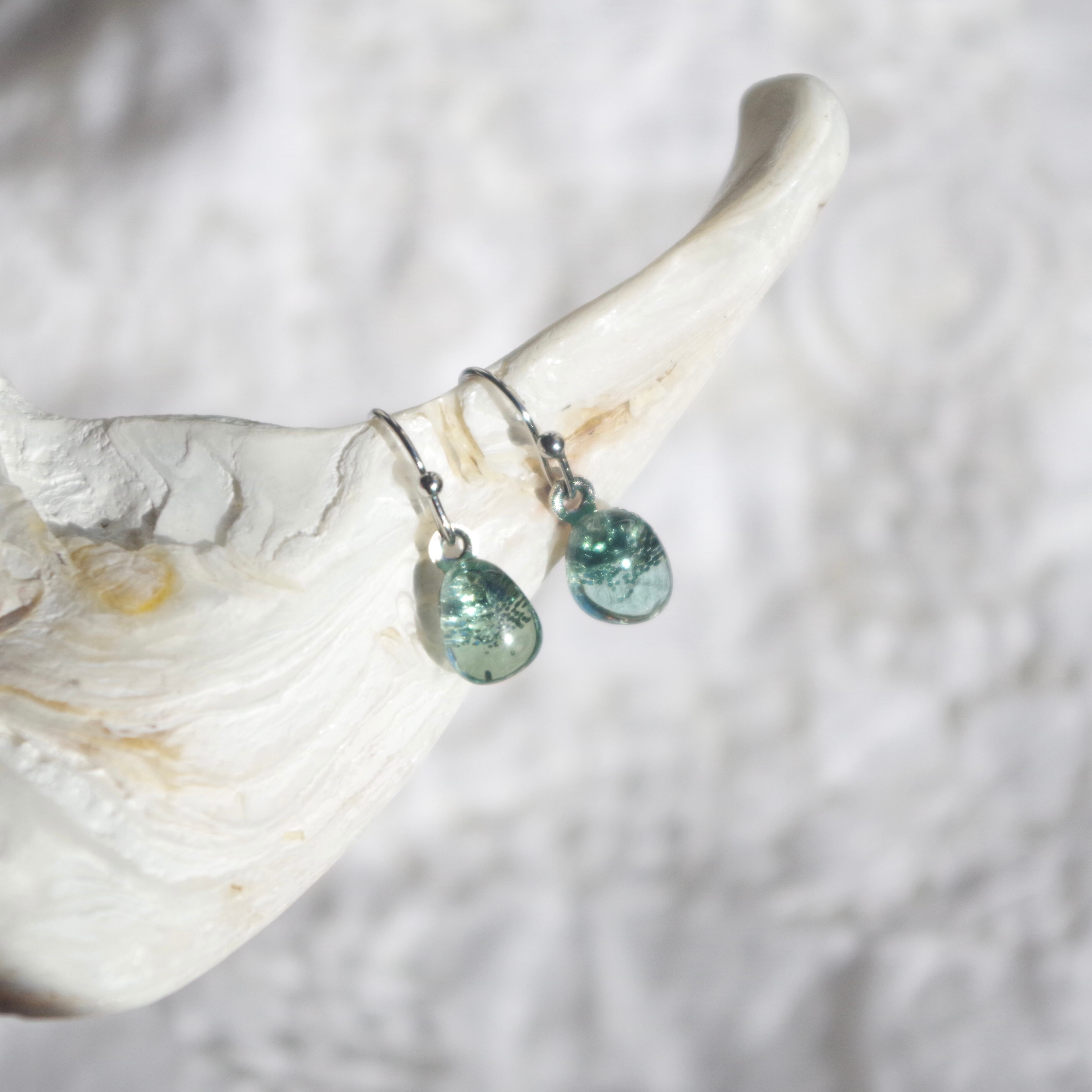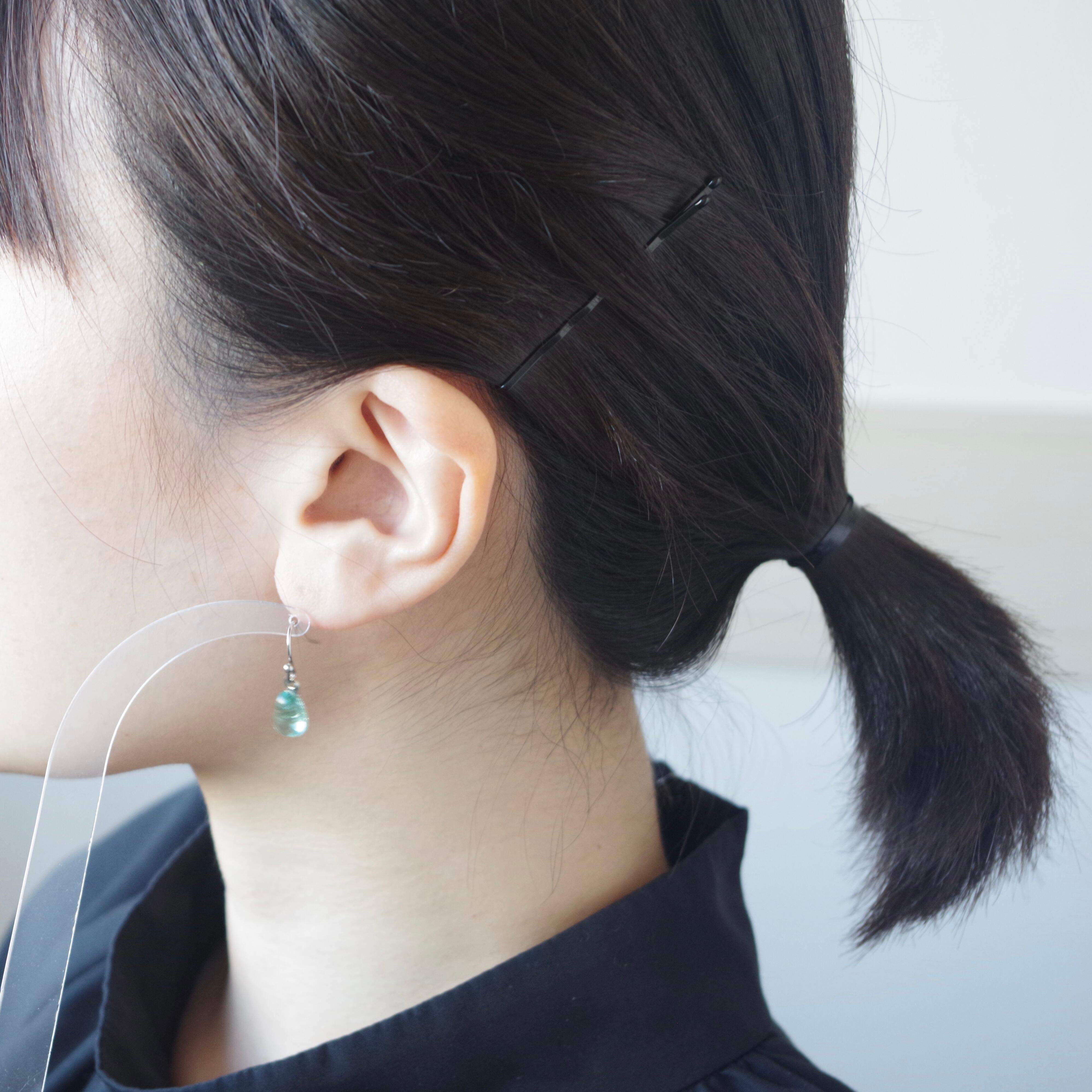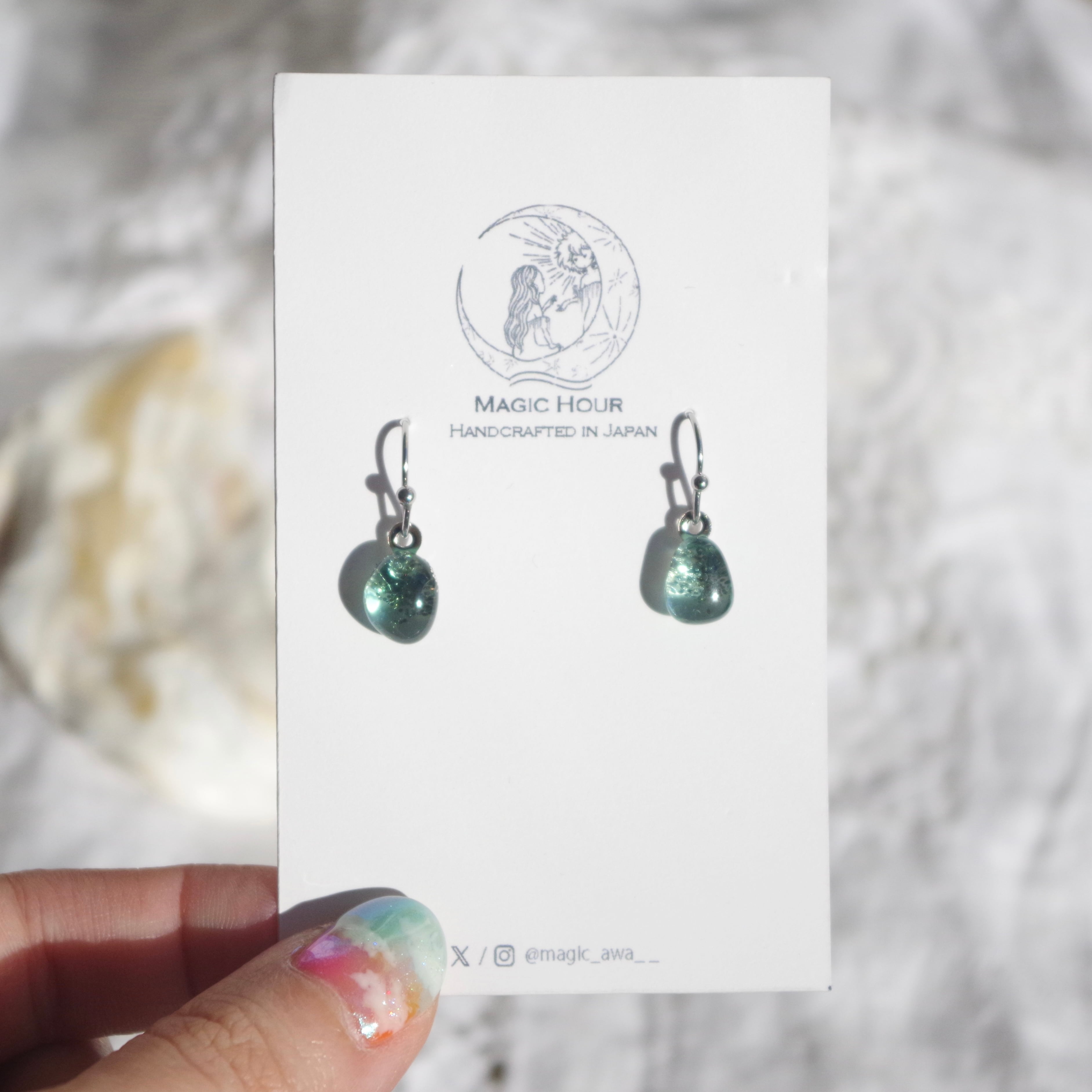 海辺で拾ったシーグラスを、水滴の様なうるツヤピアスにアップサイクルしました。
