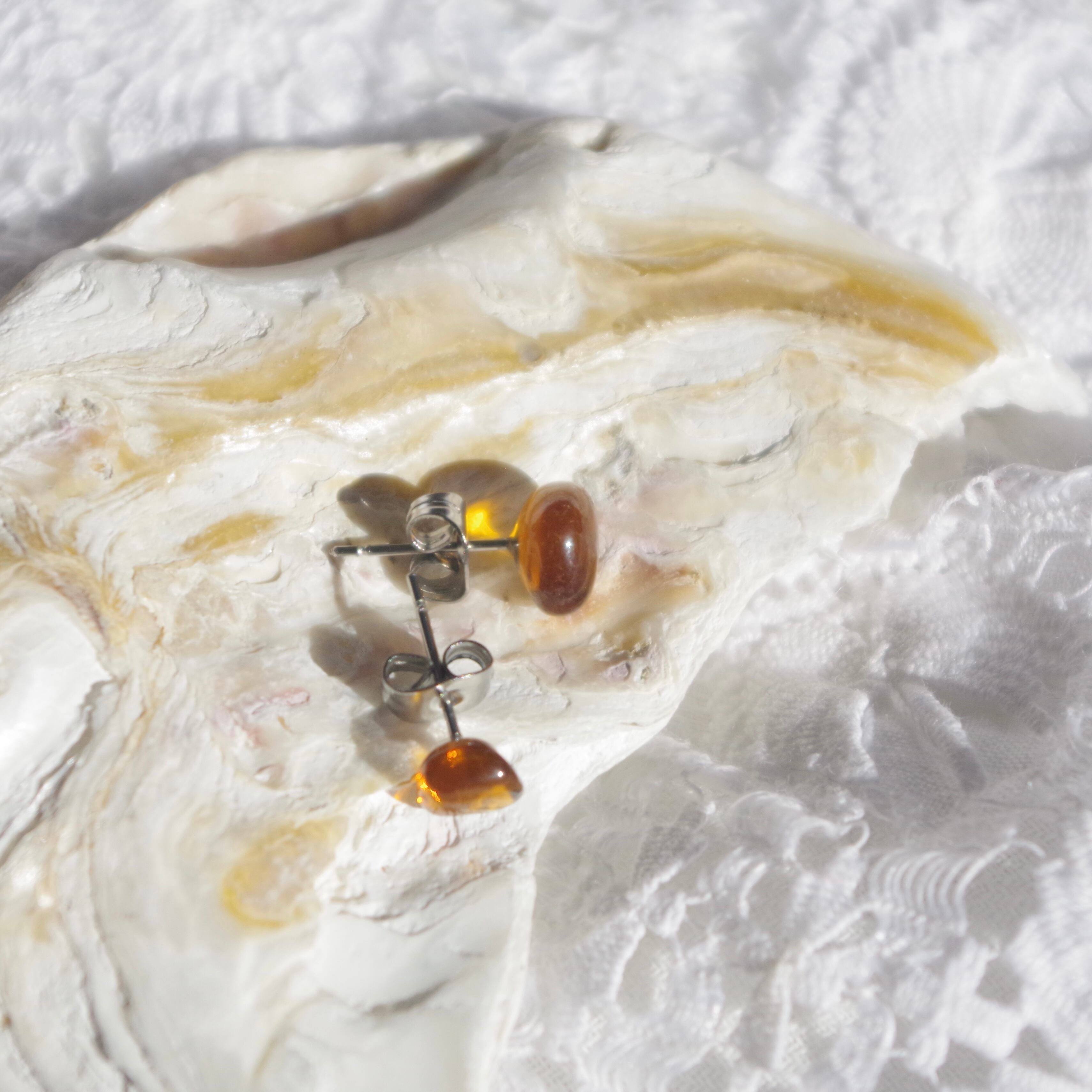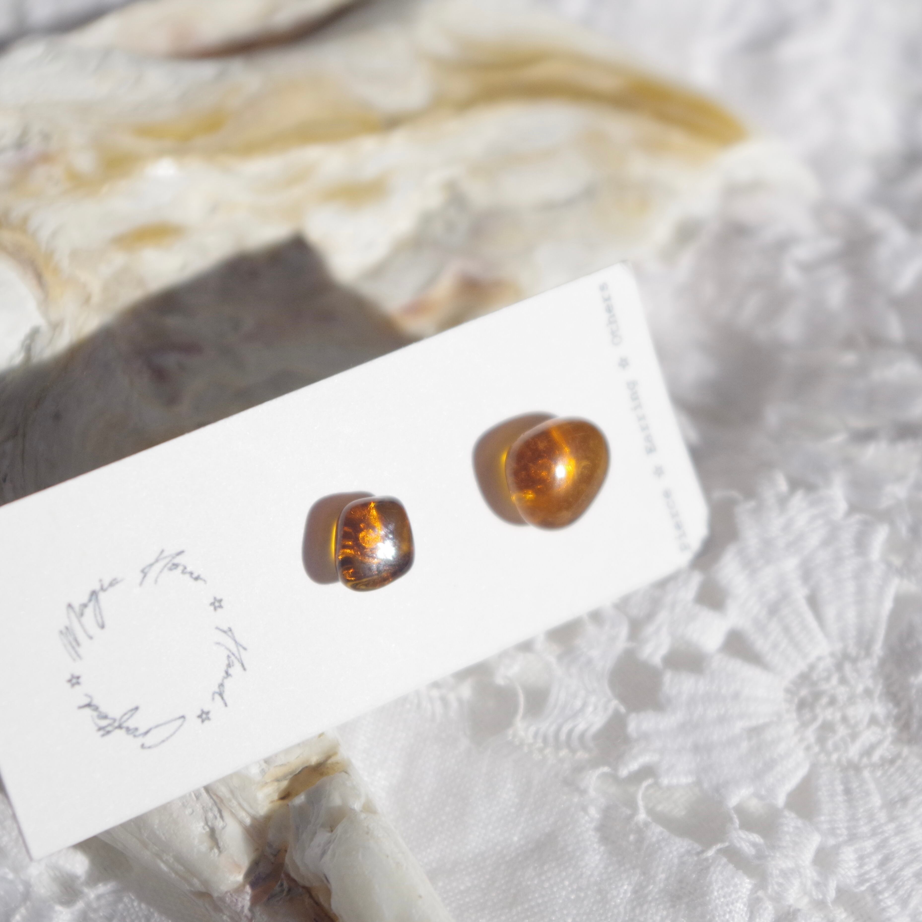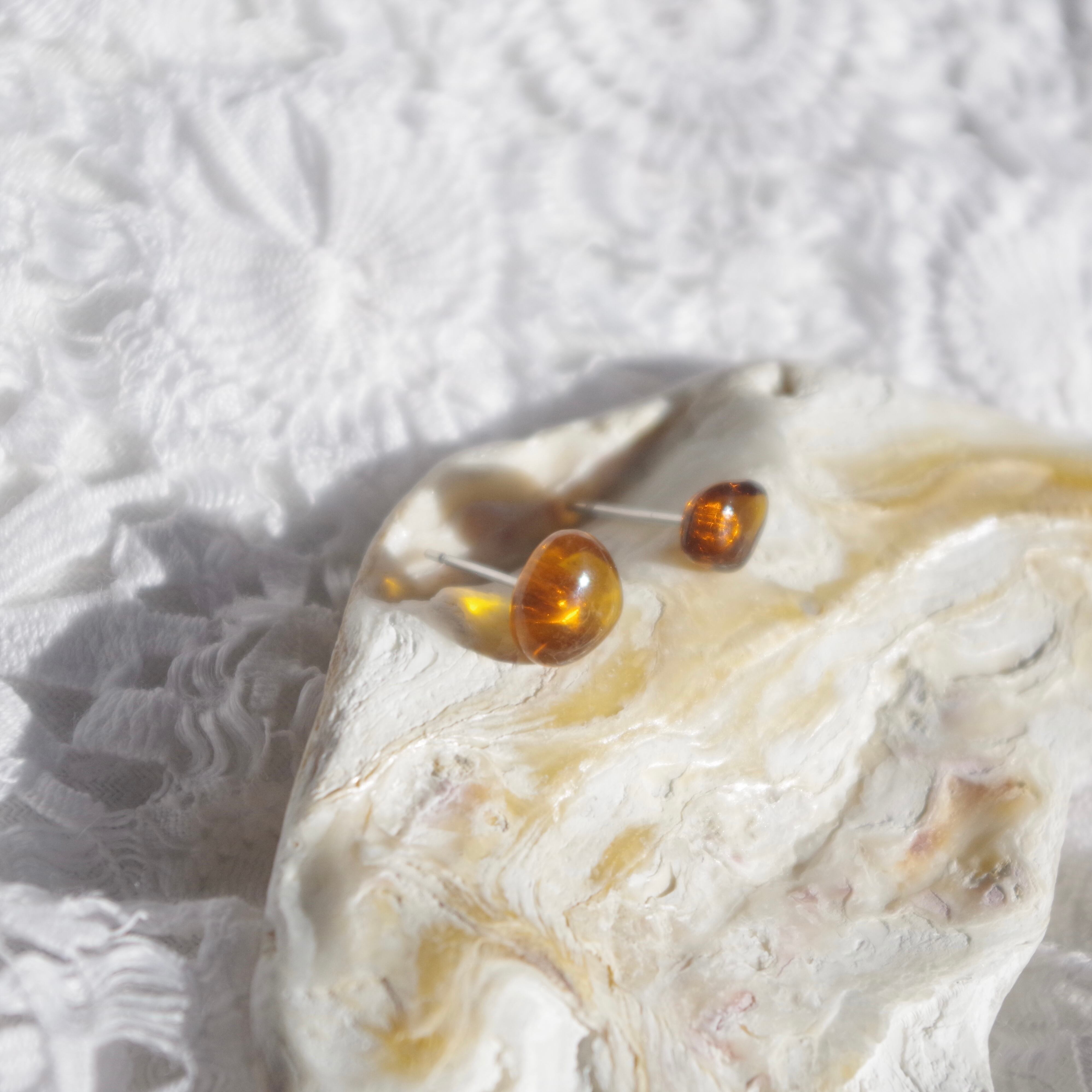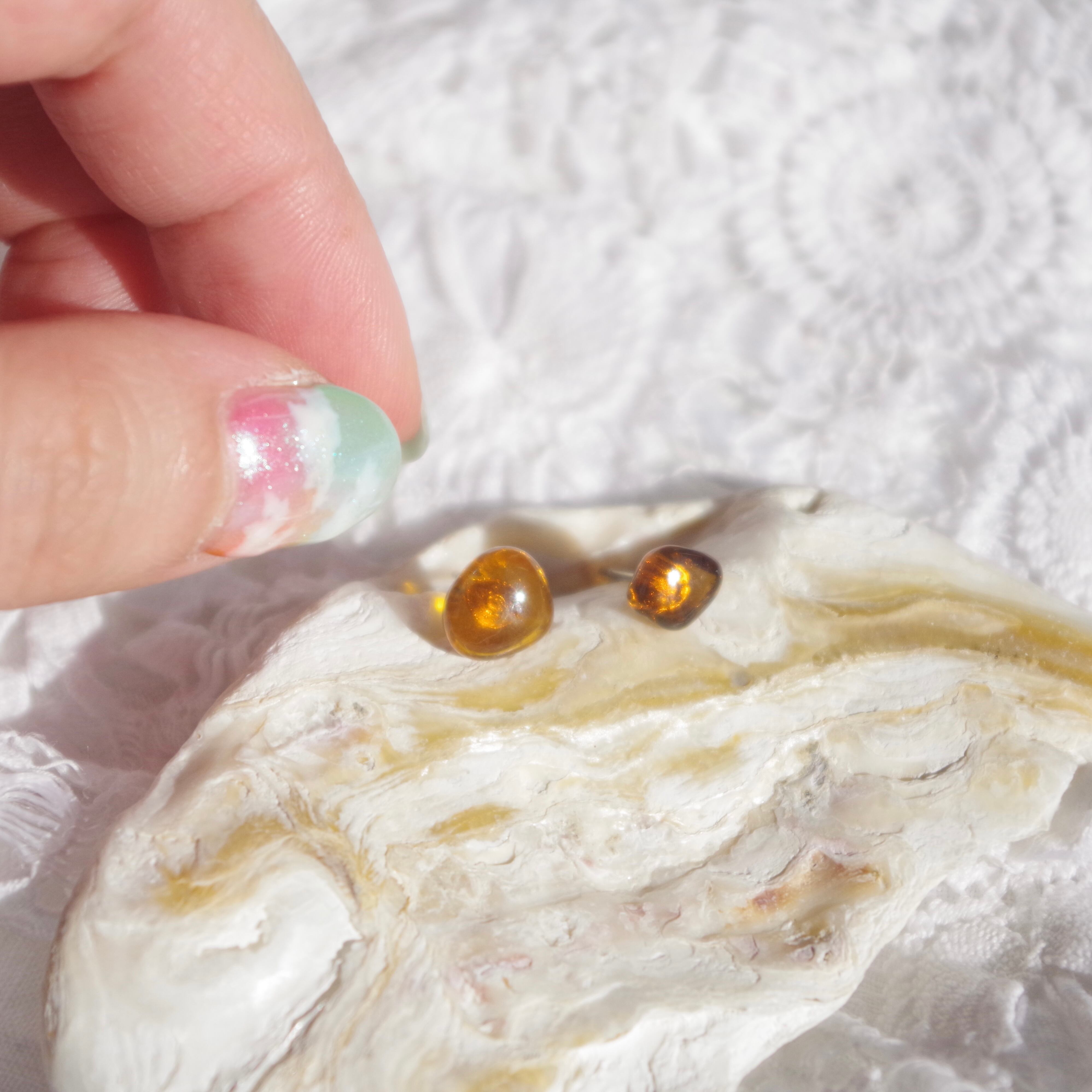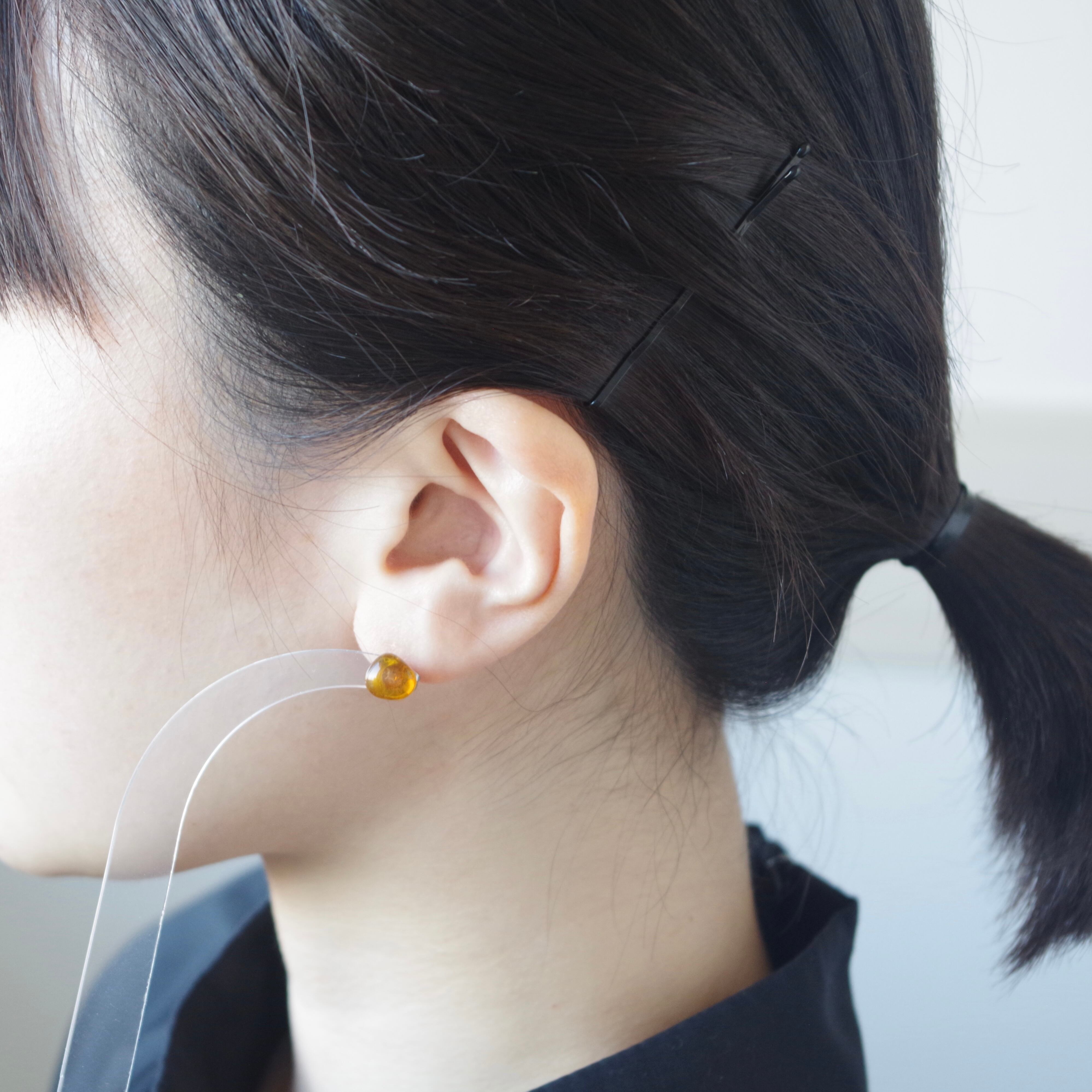 海辺で拾ったシーグラスを、水滴の様なうるツヤピアスにアップサイクルしました。