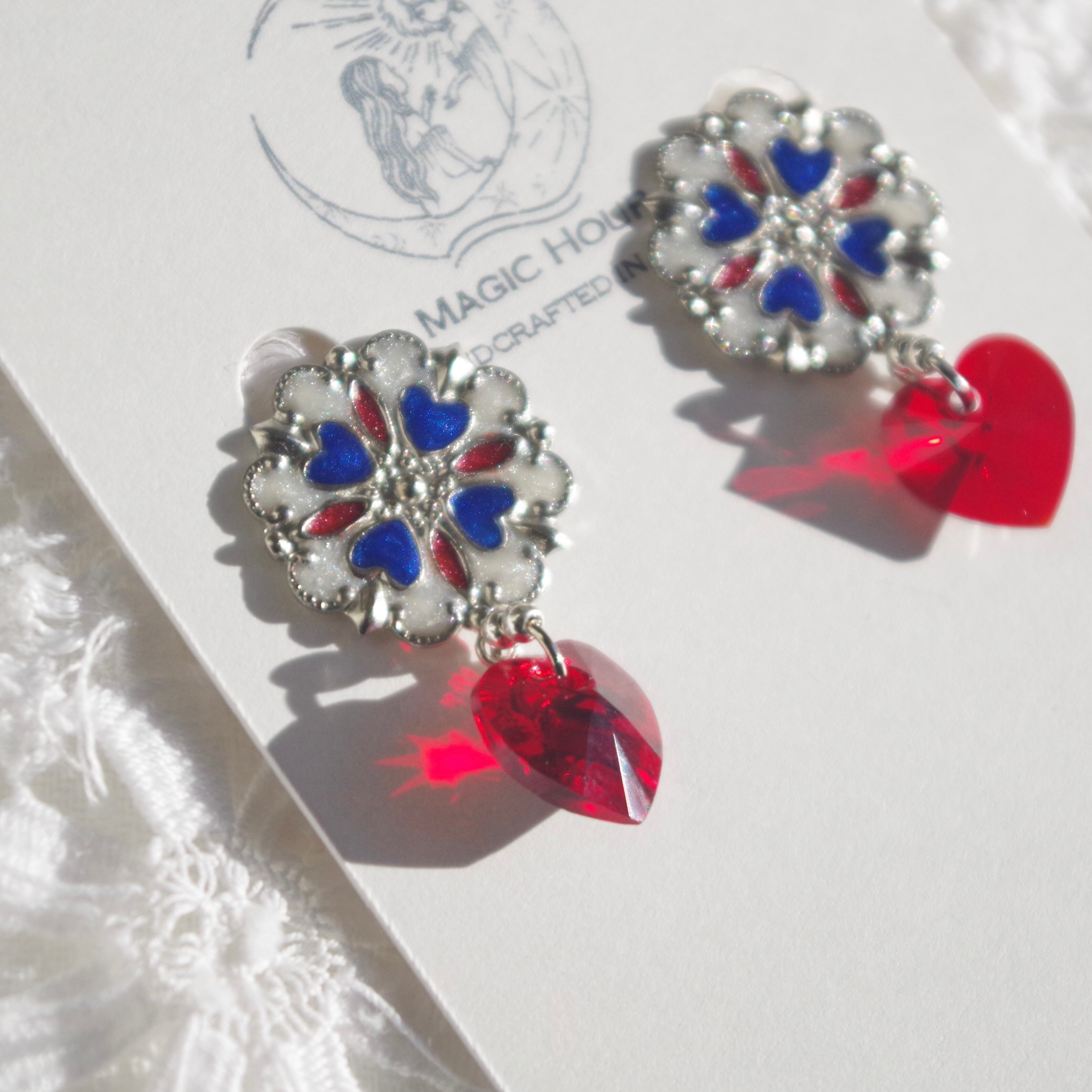 雲母という鉱物由来の着色料で鮮やかな色彩を生み出しています。ぷるぷる揺れるハートのクリスタルはステンドグラスのように光を透かし、顔周りを明るく彩ります。