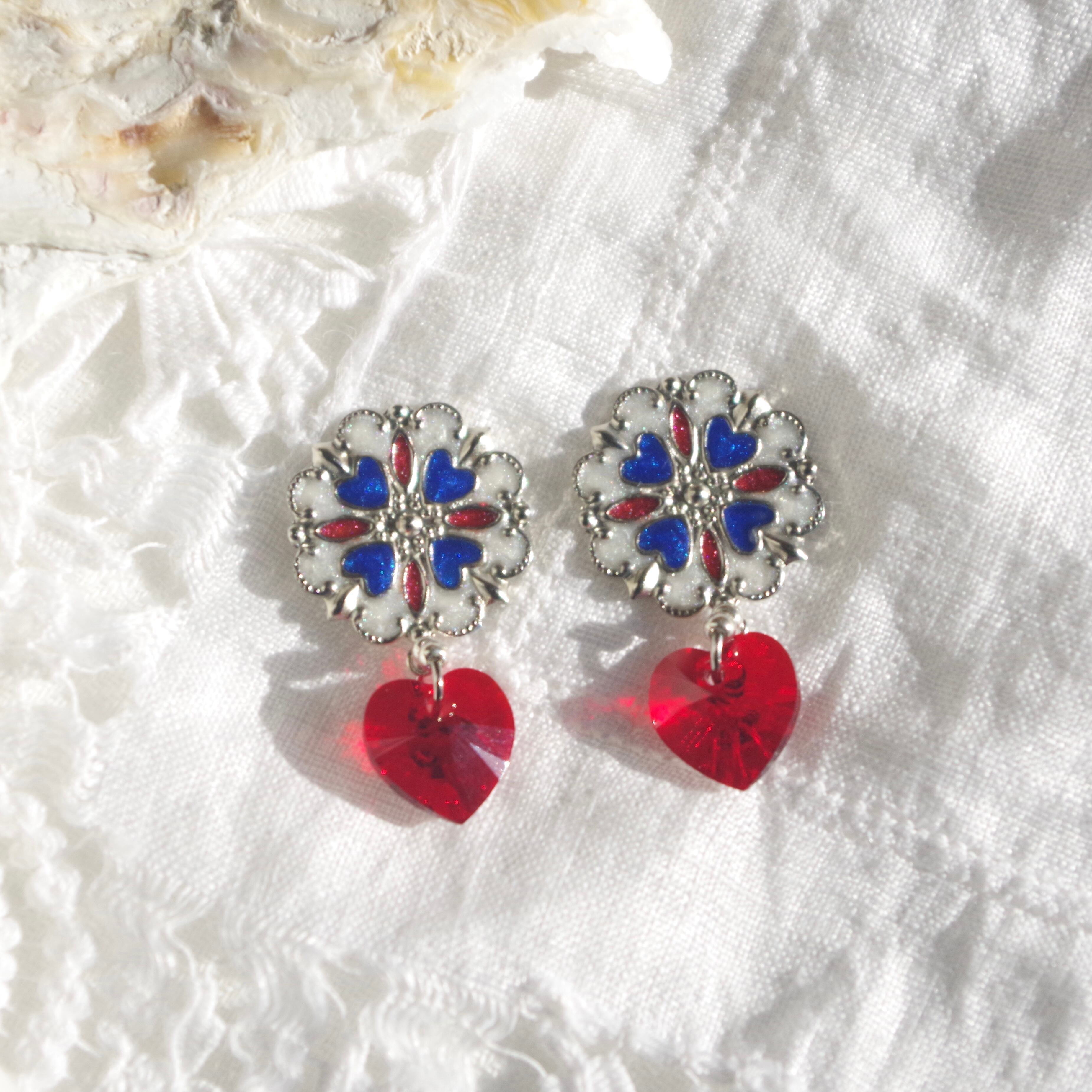 海と自然を愛するMagic Hourにぴったりのトリコロールでヴィンテージライクなピアスを作りました。青は自由、赤は博愛、白は平等を意味します。