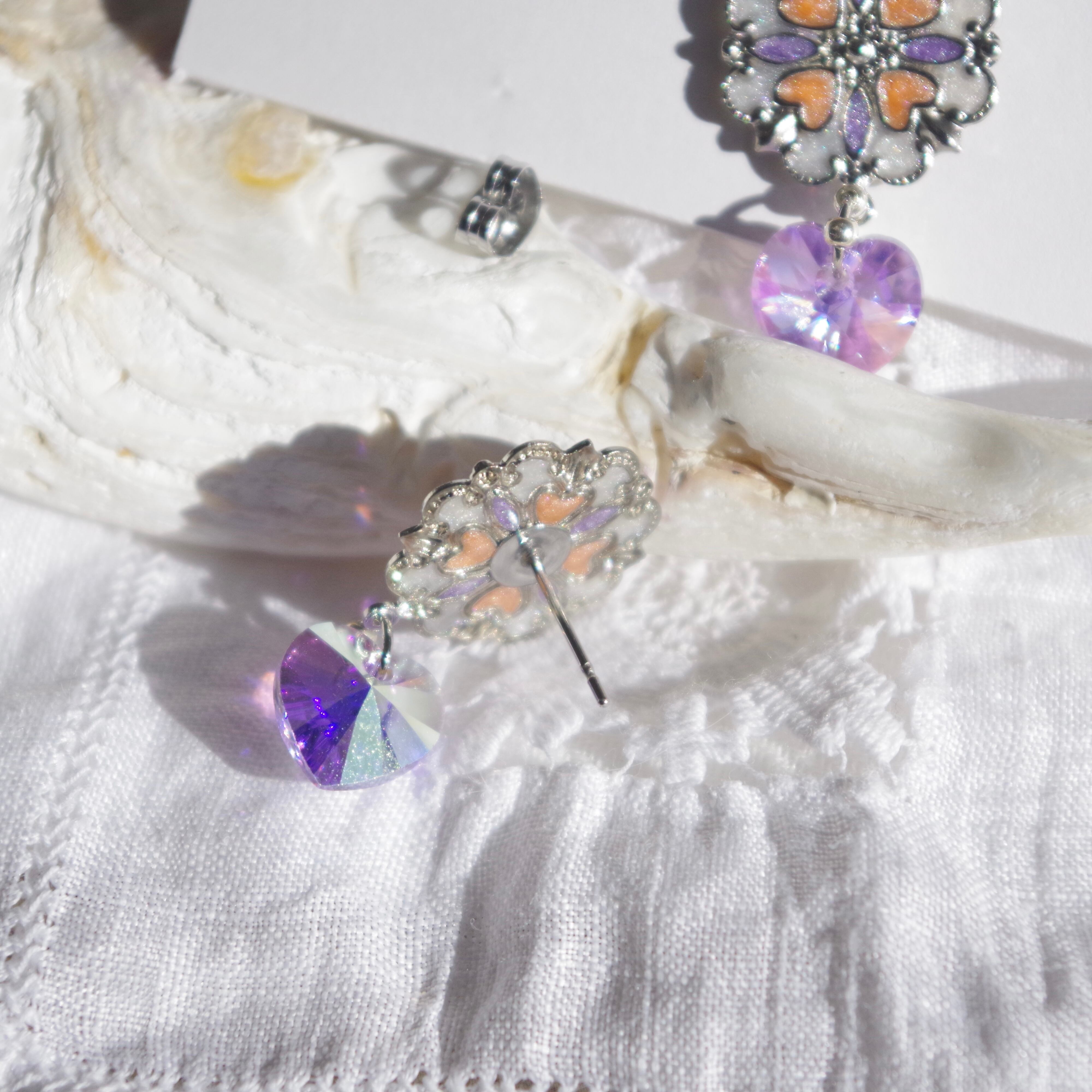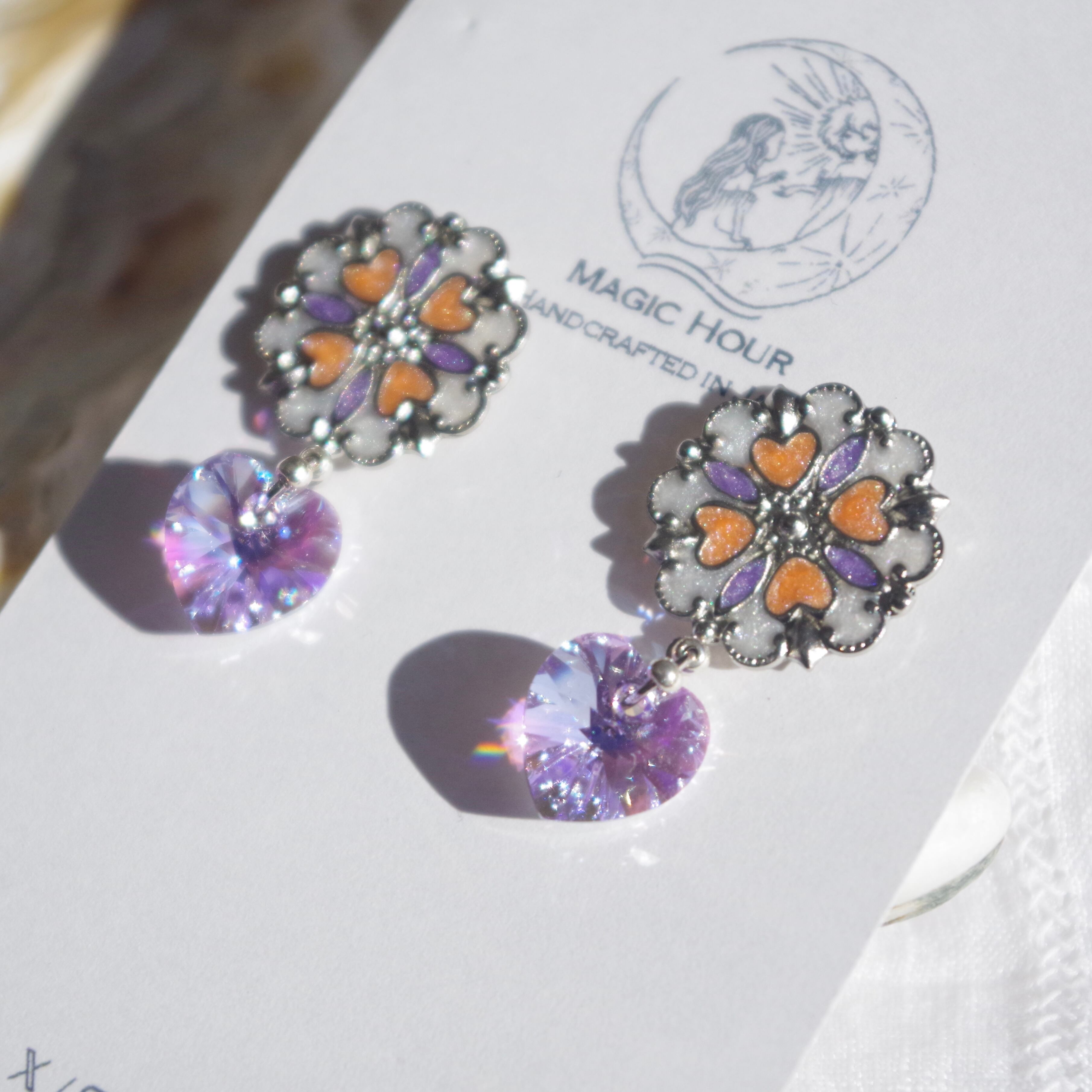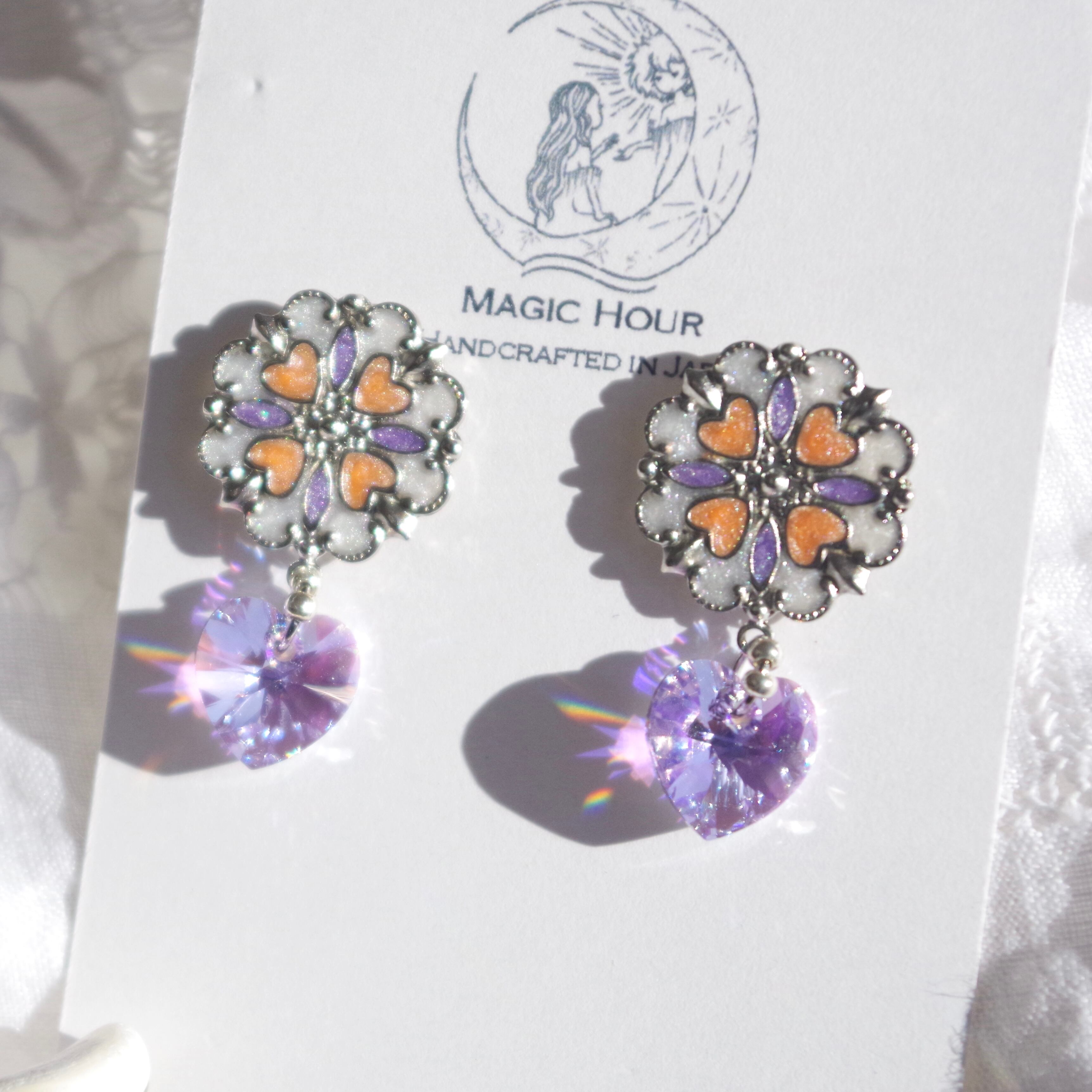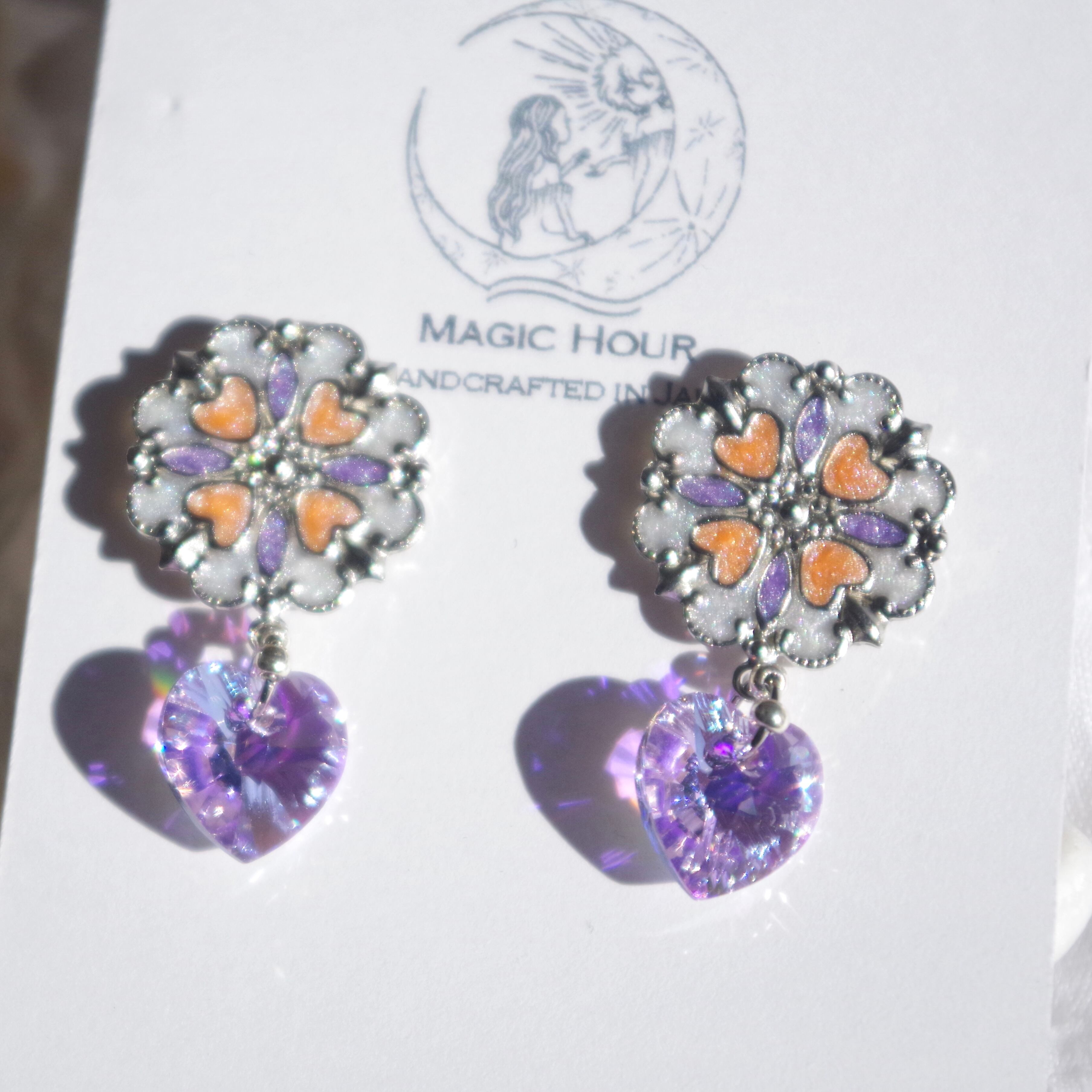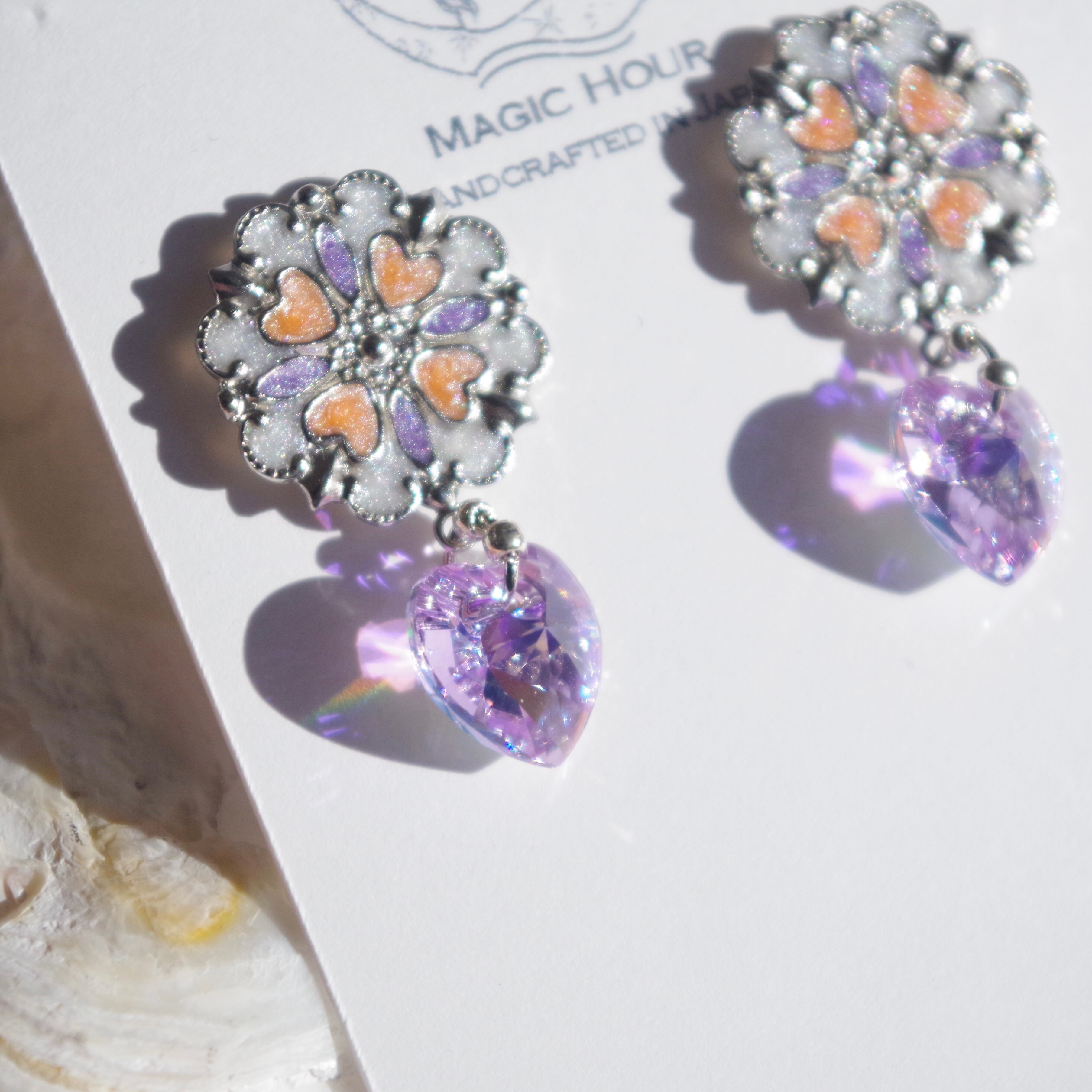 雲母という鉱物由来の着色料で鮮やかな色彩を生み出しています。ぷるぷる揺れるハートのクリスタルはミラーボールの様に光を反射し、顔周りを彩ります。