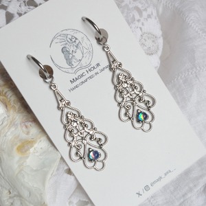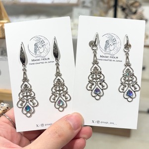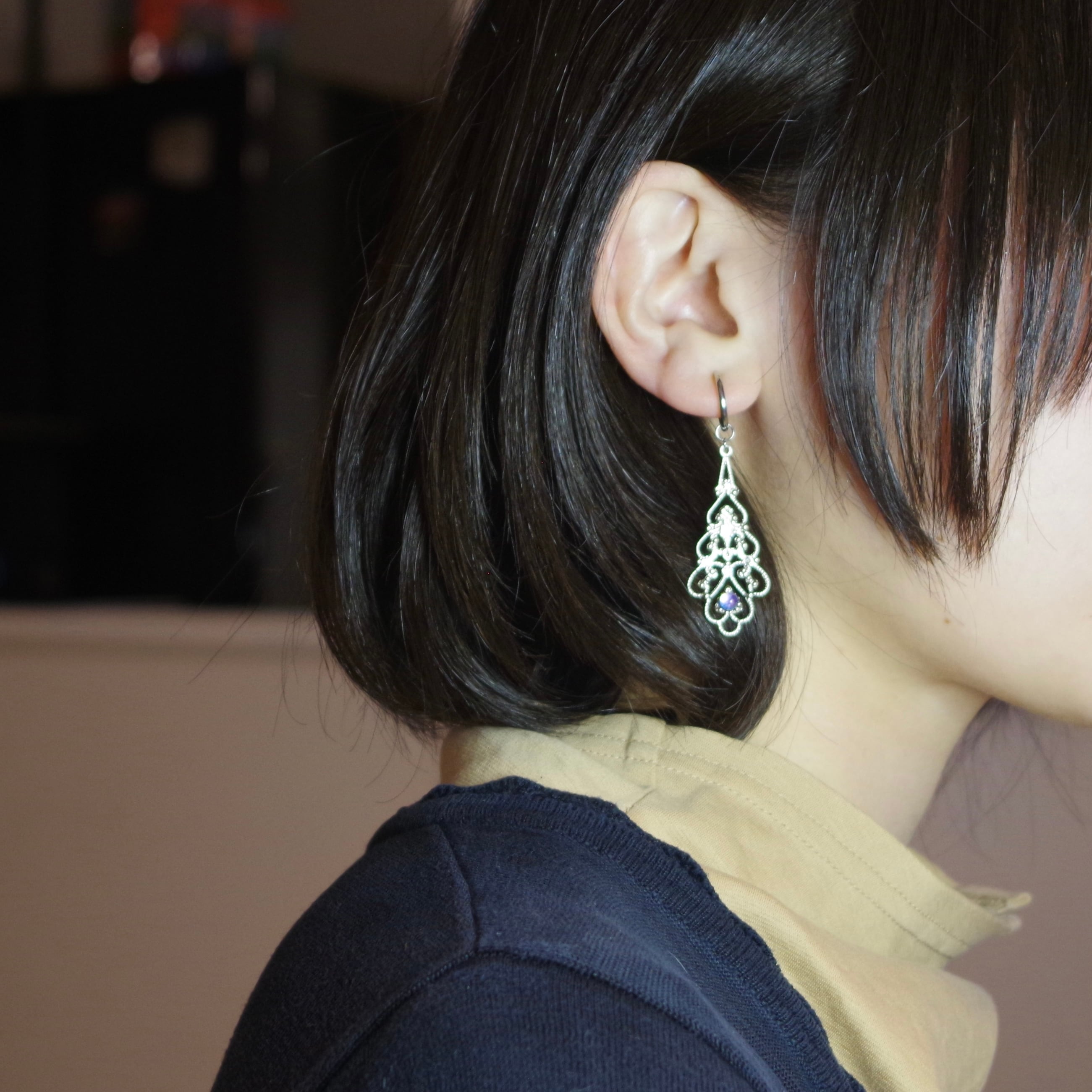 直接耳に触れる金具は錆びにくいサージカルステンレス(SUS316)です。K14、ニッケルフリーなど金属アレルギー対応金属をお探しの方にもおすすめします。ただし全ての方にアレルギー対応を保証するものではありません。※揺れるパーツは真鍮メッキです。