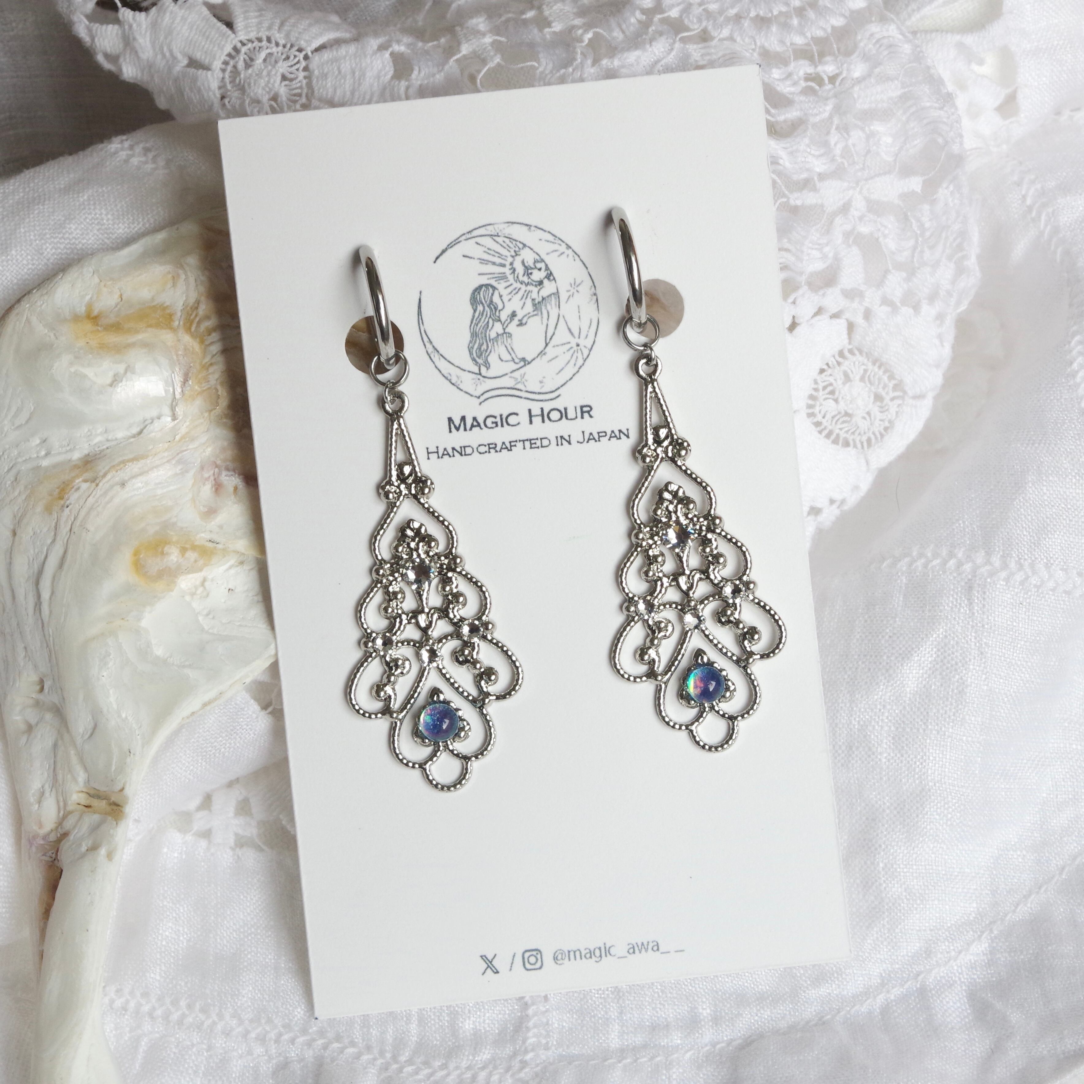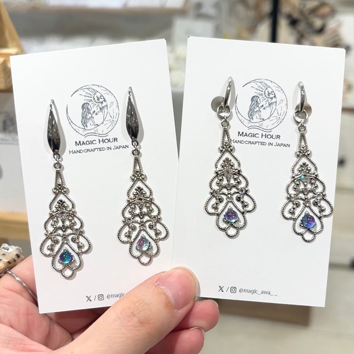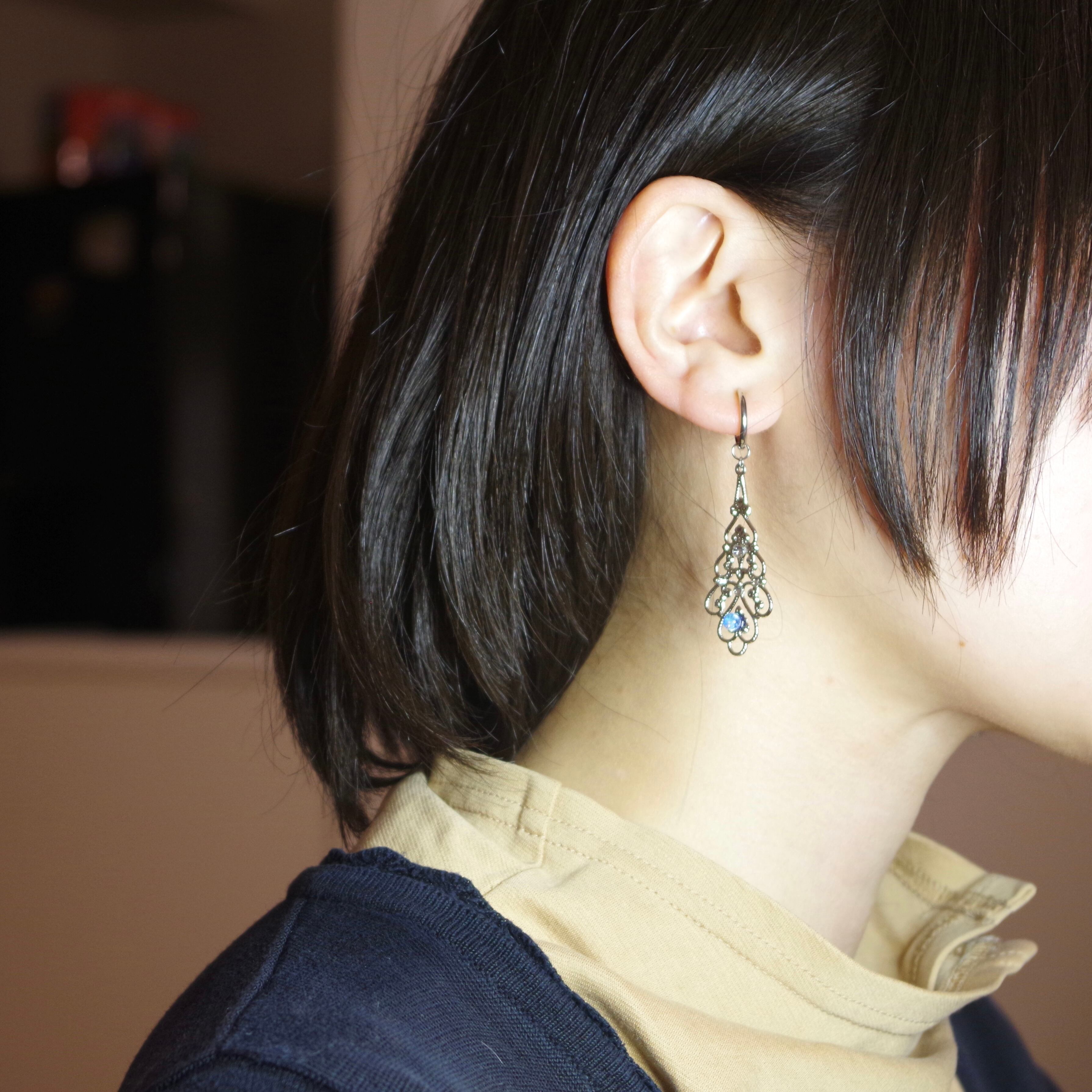 窯で焼いたシーグラスアイテムから、繊細なフィリグリーが美しい"Lune"シリーズが登場しました。スッと落ちる一筋の雫のように美しい耳飾り。
